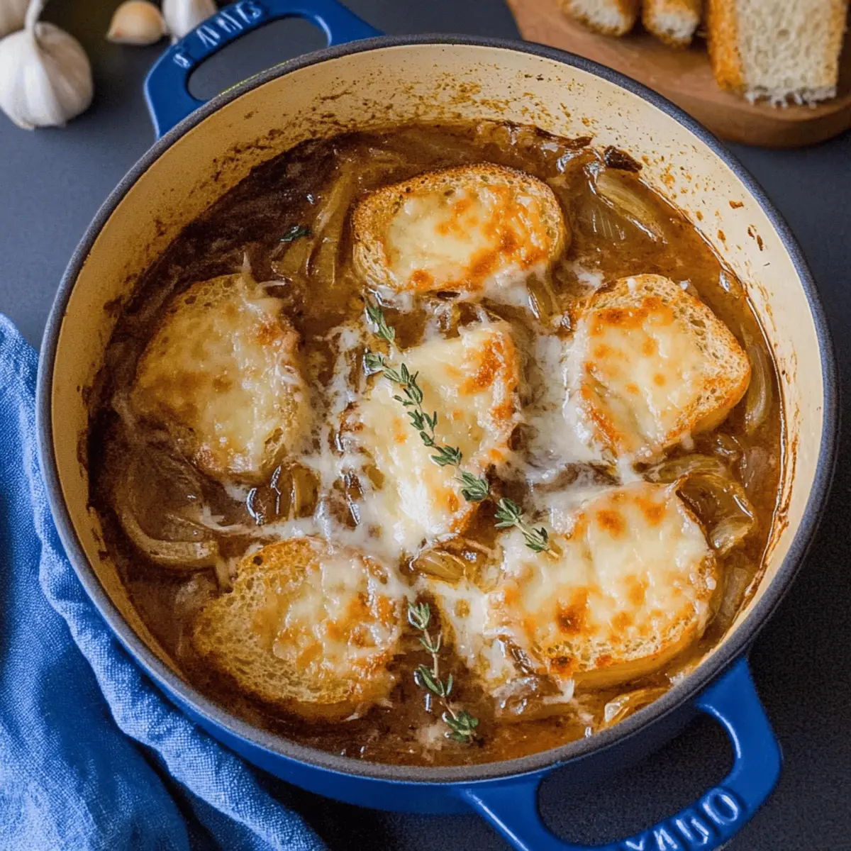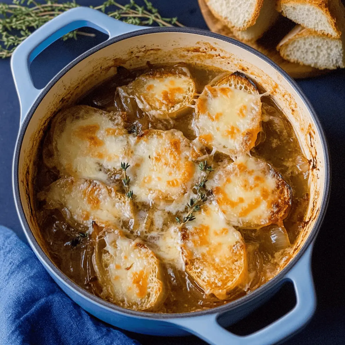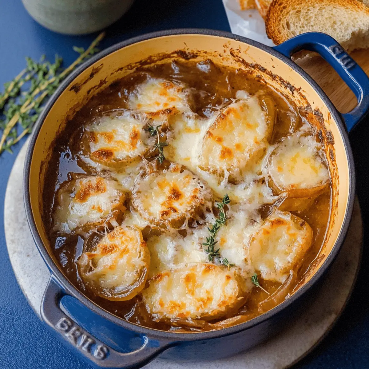 Jump to Recipe Print RecipeAs the chilly winds whisper through the trees, I can’t help but crave a bowl of warm, hearty comfort. Enter my beloved Dutch Oven French Onion Soup—a dish that wraps you in a cozy embrace with every spoonful. With its sweet, caramelized onions simmered to perfection and topped with crunchy, cheesy garlic croutons, this one-pot wonder elevates family dinners from ordinary to unforgettable. Not only is it a true crowd-pleaser, but it’s also deceptively simple to make, allowing you to savor the art of homemade food without the fuss. Whether you’re hosting a cozy gathering or simply indulging in self-care, this soup promises warmth and satisfaction. Ready to dive into a world of bubbling goodness? Let’s get cooking! Why is Dutch Oven French Onion Soup Irresistible? Comforting Warmth: As the ultimate comfort food, this soup envelops you with rich flavors that warm your heart and soul. One-Pot Wonder: Simplifying your cooking experience, it’s made in just one pot, minimizing cleanup and maximizing flavor. Crowd Pleaser: Perfect for family dinners or cozy gatherings, its deliciousness is universally loved—who can resist that cheesy topping? Endless Variations: Feel free to customize with sweet onions or different cheeses like Swiss or Provolone, ensuring it fits your taste. Vegetarian Friendly: Easily swap beef broth for vegetable broth to create a vegetarian version that retains all the comforting goodness. Perfectly paired with a side salad or even Potsticker Soup Mushrooms, this Dutch Oven French Onion Soup is a delightful addition to any meal. Dutch Oven French Onion Soup Ingredients For the Soup Yellow Onions – The base ingredient providing sweetness and depth of flavor. Note: Sweet onions can be used for a sweeter soup. Salted Butter – Adds richness and aids in caramelizing the onions. Substitution: Unsalted butter can be used; just adjust salt accordingly. Kosher Salt – Enhances flavor. Black Pepper – Adds mild heat. Red Wine Vinegar – Balances the sweetness of the onions. White Wine – Used for deglazing the pot, providing acidity and depth. Substitution: Extra beef broth can be used if avoiding wine. Beef Broth/Stock – Forms the soup’s base, rich in flavor. Substitution: Vegetable broth for a vegetarian version. Fresh Thyme – Adds herbal notes to the soup. Note: Can be replaced with dried thyme (1 teaspoon) if fresh is not available. For the Topping French Baguette – Base for the cheesy croutons, providing texture. Substitution: Any crusty bread can be used. Garlic Salt – Flavor booster for the croutons. Gruyere Cheese – Provides creamy, nutty flavor and melts beautifully on croutons. Substitution: Swiss or provolone cheese can also work. Now that you have all the essential ingredients for the ultimate Dutch Oven French Onion Soup, it’s time to awaken your culinary skills and embrace that cozy, comforting flavor! Step‑by‑Step Instructions for Dutch Oven French Onion Soup Step 1: Prepare Onions Begin by thinly slicing your yellow onions, using a sharp knife for ease. In a large Dutch oven, melt a generous amount of salted butter over medium heat. Add the sliced onions along with a pinch of kosher salt, black pepper, and a splash of red wine vinegar. Sauté the onions for about 5 minutes, until they soften and take on a translucent look. Step 2: Caramelize Continue cooking the onions for 40-50 minutes, stirring frequently to prevent sticking or burning. As the onions sauté, they will gradually deepen in color to a rich brown while developing a sweet aroma. You know they’re ready when they have a silky texture and a deep caramel hue, offering a robust foundation for your Dutch Oven French Onion Soup. Step 3: Toast Bread While your onions are caramelizing, slice a French baguette into thick pieces. Butter each slice generously and sprinkle garlic salt over the top. Preheat your broiler, and then place the bread slices on a baking sheet. Broil them for 2-3 minutes until they turn golden brown and crispy, keeping a close eye to avoid burning. Step 4: Deglaze Once your onions have reached that perfect caramelized state, carefully pour in a cup of white wine. Use a wooden spoon to scrape up any brown bits stuck to the bottom of the pot. These flavorful morsels will enhance the overall depth of your Dutch Oven French Onion Soup, so let the wine simmer for about 2-3 minutes to reduce slightly. Step 5: Simmer Soup Add in beef broth to the pot and toss in a bundle of fresh thyme. Stir to combine and bring the mixture to a rolling boil. Once boiling, reduce the heat and let it simmer for another 10 minutes. This step allows all flavors to meld together beautifully, resulting in a rich and hearty soup. Step 6: Broil with Cheese After simmering, remove the thyme bundle and ladle the soup into oven-safe bowls. Place the toasted croutons on top and generously sprinkle with Gruyere cheese. Place the bowls under the broiler for 2-3 minutes, or until the cheese bubbles and turns a golden brown, creating that irresistible cheesy topping. Step 7: Serve Once the cheese is perfectly melted and bubbly, carefully remove the bowls from the oven. Allow them to cool slightly before serving. Enjoy your warm, delectable Dutch Oven French Onion Soup hot, and don’t hesitate to add extra crunchy garlic croutons for dipping, making each bite a cozy delight. Make Ahead Options These Dutch Oven French Onion Soup preparations are ideal for busy weeknights and meal planning! You can caramelize the onions and prepare the soup base up to 24 hours in advance. Just follow the steps to sauté the onions until they’re beautifully caramelized, then let the soup cool completely before transferring it to an airtight container and refrigerating. To maintain quality, avoid adding the croutons and cheese ahead of time, as they can become soggy. When you’re ready to serve, reheat the soup on the stovetop, spoon it into oven-safe bowls, top with toasted crouto