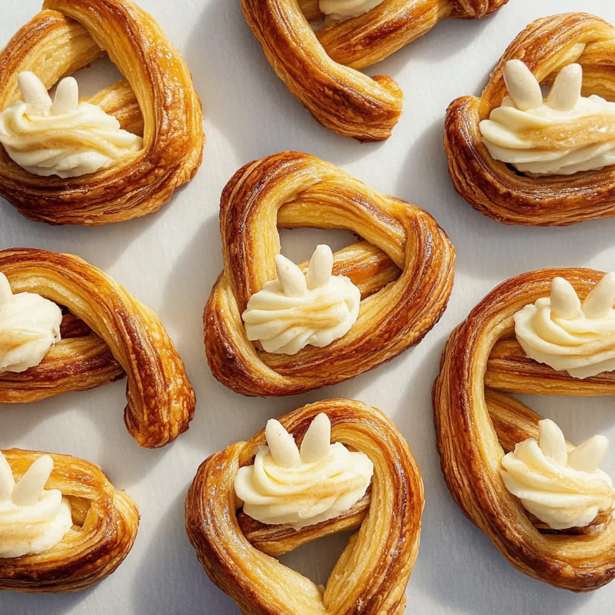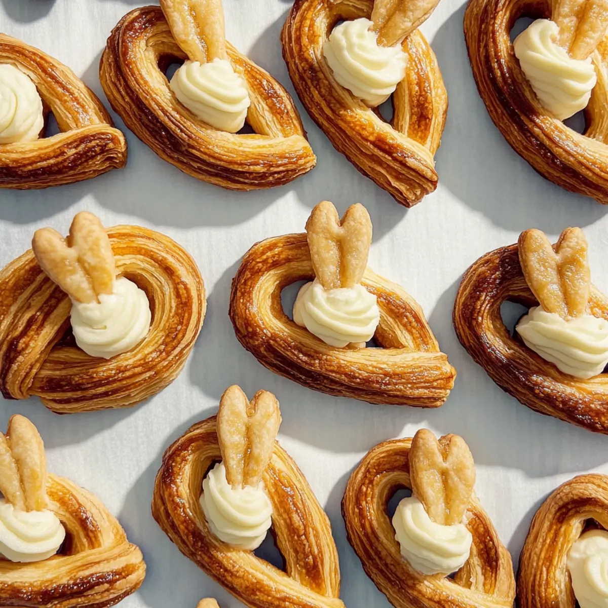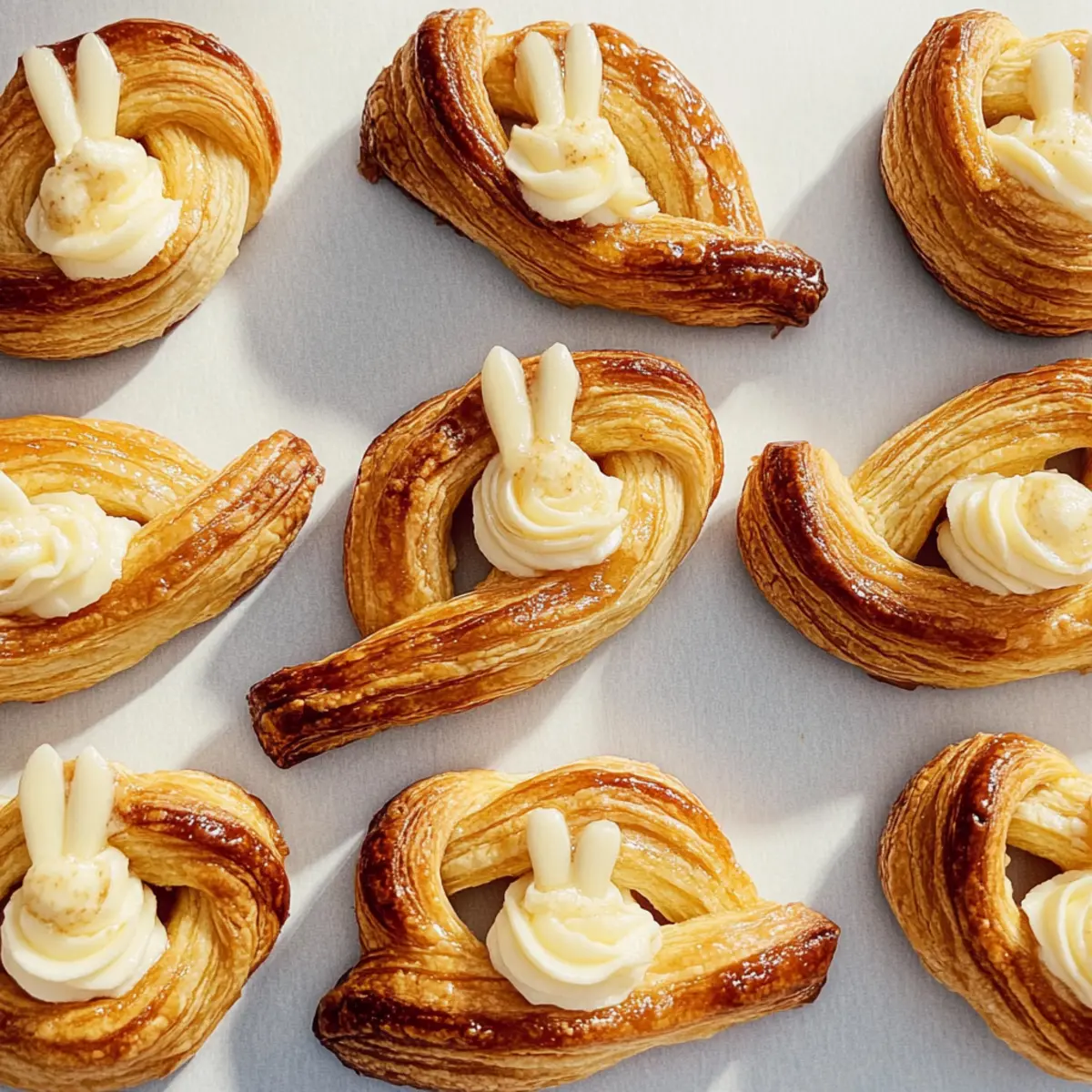 Jump to Recipe Print RecipeWith Easter just around the corner, I can’t help but get excited about bringing some playful whimsy to the dessert table. These Easter Bunny Twists, shaped into adorable bunnies, are made using easy-to-handle puff pastry and filled with a delightful cinnamon sugar goodness that’ll have everyone reaching for seconds. Not only do they add a festive touch to your holiday celebrations, but their quick prep also means you can whip them up in no time, even among the festivities. Topped with a creamy cream cheese frosting that mimics fluffy bunny tails, these pastries are sure to become a favorite. Are you ready to impress your loved ones with these charming and delicious treats this Easter? Why Will You Love Easter Bunny Twists? Delightful Presentation: These adorable bunny shapes are sure to impress your guests and bring a smile to everyone’s face. Easy to Make: Made with simple puff pastry, you’ll find that these twists come together quickly, freeing up your time for other festive preparations. Decadent Flavor: The sweet cinnamon sugar filling combined with the creamy frosting creates a treat that’s both rich and satisfying, appealing to all ages. Versatile Options: Feel free to experiment with fillings—chocolate or jam can add a fun twist to your creations! Perfect for Sharing: These pastries are ideal for gatherings, making them a crowd-pleaser at any holiday table. Get ready to share joy through delicious bites! Easter Bunny Twists Ingredients For the Pastry • All-purpose flour – Use this for dusting the work surface to prevent sticking. • Frozen puff pastry (17.3-oz. pkg.) – The main ingredient that gives these Easter Bunny Twists their delightful flakiness; remember to thaw before using. • Unsalted butter (3 Tbsp., melted) – Adds richness and flavor; can be substituted with margarine for a dairy-free version. • Granulated sugar (2 Tbsp.) – Acts as a sweetener to enhance the filling’s flavor. • Ground cinnamon (1 tsp.) – Provides a warm spice flavor that makes the filling irresistible. • Cold water (1 Tbsp.) – Helps bind the dough during rolling and shaping. For the Cream Cheese Frosting • Cream cheese (3 oz., room temperature) – This is the creamy base for the frosting, giving it a luscious texture. • Unsalted butter (2 Tbsp., room temperature) – Adds extra richness to the frosting. • Confectioners’ sugar (1 cup or 115 g) – Sweetens and thickens the frosting beautifully. • Pure vanilla extract (1 tsp.) – Enhances the flavor with a lovely aroma. • Kosher salt (Pinch) – Balances out the sweetness of the frosting for a perfect finish. These ingredients come together to create mouthwatering Easter Bunny Twists that will surely impress your guests as a charming addition to your holiday celebrations! Step‑by‑Step Instructions for Easter Bunny Twists Step 1: Preheat and Prepare Begin by preheating your oven to 375°F (190°C). While the oven warms, line a baking sheet with parchment paper for easy cleanup and to ensure the Easter Bunny Twists do not stick during baking. This preparation step is key to achieving perfectly golden pastries! Step 2: Roll Out the Pastry Lightly dust your work surface with all-purpose flour to prevent sticking. Unwrap the thawed puff pastry and roll it out into a rectangle, about 1/8 inch thick, using a rolling pin. Aim for a smooth, even surface that will help your Easter Bunny Twists rise beautifully while baking. Step 3: Apply Butter and Cinnamon Sugar Brush the melted unsalted butter generously over the rolled-out pastry, ensuring an even coating. In a small bowl, mix the granulated sugar and ground cinnamon, then sprinkle this delightful cinnamon sugar mixture evenly across the buttered pastry, captivating your senses with its aroma. Step 4: Cut and Shape the Pastry Use a sharp knife or pastry cutter to slice the pastry into 1-inch wide strips. Take each strip and twist it into a charming bunny shape, pinching the ends to secure the twists. These shapes will transform into your delightful Easter Bunny Twists as they bake, so be creative! Step 5: Bake the Bunny Twists Place the twisted bunny pastries onto the prepared baking sheet, spacing them about an inch apart to allow for puffing. Bake in your preheated oven for 15-20 minutes or until they turn golden brown and flaky, filling your kitchen with a tempting aroma as they rise. Step 6: Make the Cream Cheese Frosting While your Easter Bunny Twists are baking, prepare the cream cheese frosting. In a mixing bowl, combine room temperature cream cheese, softened butter, and confectioners’ sugar. Add pure vanilla extract and a pinch of kosher salt, whisking until smooth and creamy for that irresistible bunny tail touch. Step 7: Frost the Pastries Once the bunny twists have baked and cooled slightly on a wire rack, pipe or spread the cream cheese frosting generously on the ends of each twist, mimicking fluffy bunny tails. This final step not only adds a delicious finish but also enhances the festive look of your Easter Bunny Twists. What to Serve with Easter Bunny Twists The delightful Easter Bunny Twists can be the centerpiece of your festive table, but they shine even brighter when paired with a few complementary dishes. Fresh Fruit Salad: The brightness of seasonal fruits adds a refreshing contrast to the sweet pastries, creating a balance of flavors and textures. Creamy Yogurt Parfait: Layering creamy yogurt with granola and berries creates a light and nutritious complement, perfect for brunch gatherings. Chocolate Dipped Strawberries: These elegant bites of richness will enchant both children and adults, making your dessert table even more indulgent. Spring Salad: A crisp salad with mixed greens, radishes, and a light vinaigrette offers a wonderful contrast, enhancing the overall dining experience. Herbal Tea or Coffee: Serve with a pot of herbal tea or a rich coffee to enhance the comforting experience of enjoying these 