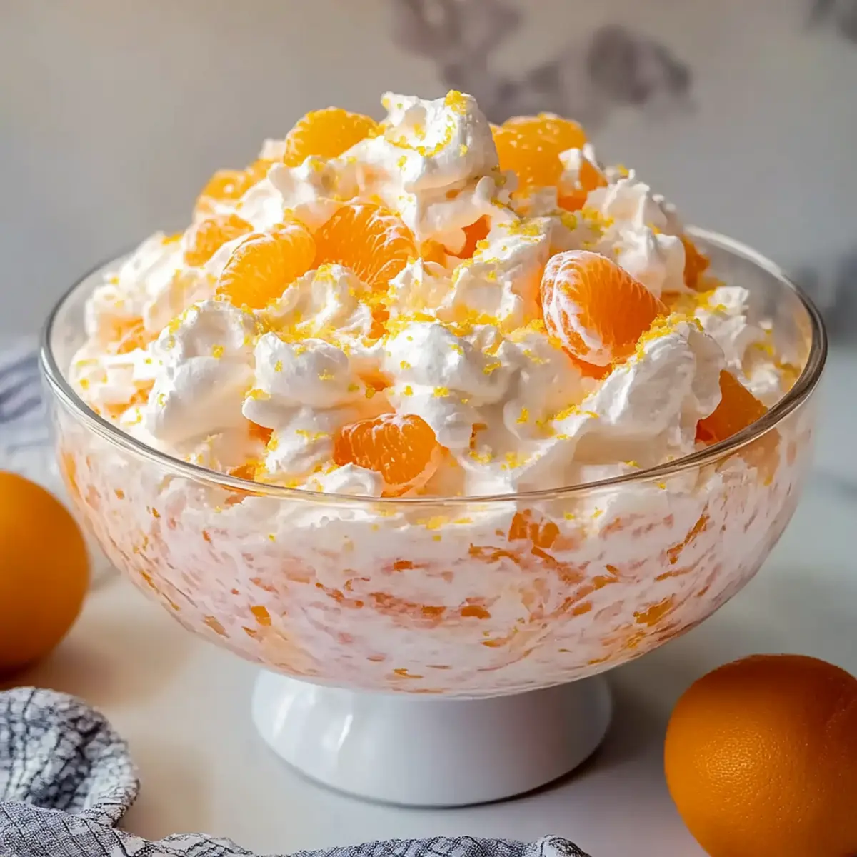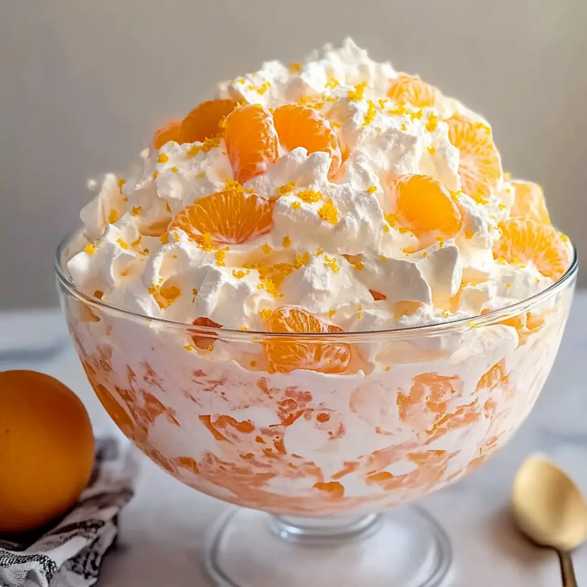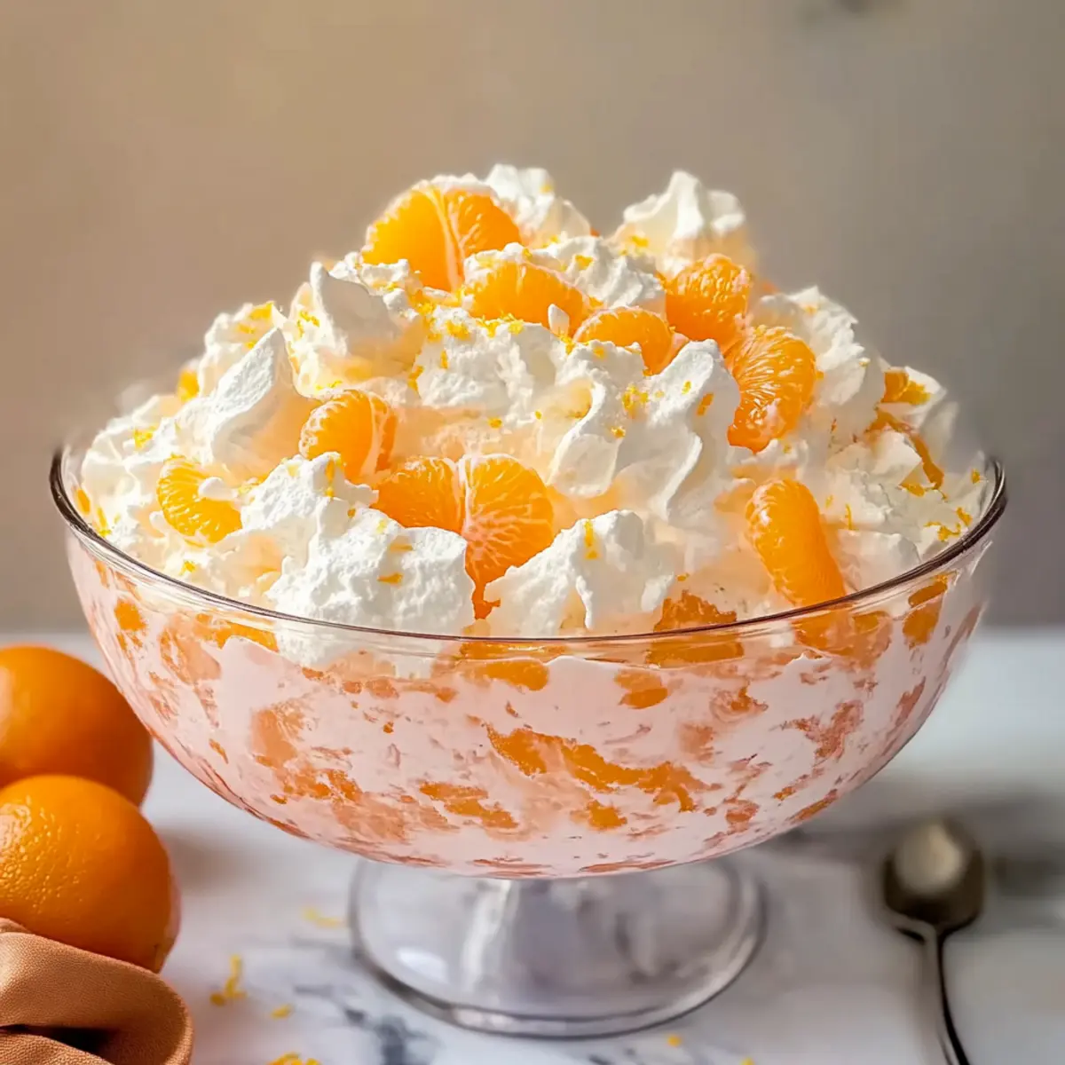 Jump to Recipe Print RecipeAs I stood in my kitchen, the vibrant hues of oranges and yellows caught my eye, reminding me of sunlit Easter gatherings. This Easy Easter Orange Jello Salad is the perfect complement to any festive table, bringing a refreshing twist that balances creamy cottage cheese with sweet, juicy fruit. With its simple, no-bake preparation, you can whip it up the night before, leaving you stress-free as you savor the holiday moments. The delightful contrast of textures—lush jello mingling with fluffy whipped topping—will surely leave your guests reaching for seconds. Plus, it’s an easy way to sneak in some fruit while keeping things light. Are you ready to elevate your Easter feast with this nostalgic favorite? Let’s dive into the recipe! Why is This Jello Salad a Must-Try? Simplicity and Convenience: This Easy Easter Orange Jello Salad is a no-bake wonder that takes minimal effort. Vibrant Flavor: The combination of sweet mandarin oranges and creamy cottage cheese creates a delightful contrast that dances on your palate. Perfect for Celebrations: Its bright colors and refreshing taste make it an ideal side dish for holiday gatherings or family meals. Make-Ahead Friendly: Prepare it the night before and chill to let the flavors meld, ensuring a stress-free serving on the big day. Crowd-Pleasing Appeal: This dish not only looks enticing but also satisfies both kids and adults alike, making it a must-have at any event. Don’t forget to check out other delicious recipes like our Cucumber Strawberry Salad for a fresh twist on side dishes! Easter Orange Jello Salad Ingredients • Here’s what you need for a delightful dish! For the Base Cottage Cheese – Provides a creamy base; small curd is preferred for a smoother texture. Orange Gelatin Mix – Adds flavor and vibrant color; using Jell-O brand ensures consistency. For the Fruity Burst Mandarin Oranges – Contributes sweetness and juicy texture; drain well to prevent excess liquid. Crushed Pineapple – Adds fruitiness; use with juice for enhanced flavor. For Texture Marshmallows – Introduces a delightful chewy texture within the salad. Whipped Topping – Creates a light, fluffy consistency; thaw fully before use for best results. For the Finishing Touch Orange Zest – Enhances flavor with a bright citrus note, making the salad even more refreshing. Now you’re all set to create this festive and creamy Easter Orange Jello Salad! Step‑by‑Step Instructions for Easy Easter Orange Jello Salad Step 1: Thaw the Whipped Topping Begin by placing the whipped topping in the refrigerator to fully thaw, which usually takes about 4 hours. Ensure it is smooth and creamy, free from lumps, as this consistency is essential for achieving the delightful texture of your Easy Easter Orange Jello Salad. Step 2: Drain the Fruits While the whipped topping is thawing, drain the mandarin oranges and crushed pineapple thoroughly in a colander. It’s important to remove any excess liquid to prevent a watery salad that won’t hold its shape. Let the fruit sit for a few minutes to ensure they are well-drained and ready for mixing. Step 3: Combine Cottage Cheese and Gelatin In a large mixing bowl, combine the small-curd cottage cheese with the orange gelatin powder. Stir vigorously using a spatula for about 2 minutes until evenly mixed, ensuring that the gelatin is fully dissolved and the mixture takes on a vibrant orange color. This creamy base will form the foundation of your Easy Easter Orange Jello Salad. Step 4: Fold in the Fruits Gently fold in the prepared mandarin oranges and crushed pineapple into the cottage cheese and gelatin mixture using a spatula. Aim for careful mixing—this should take about 1-2 minutes—so the fruit is evenly distributed throughout without breaking them apart. This step enhances the freshness and sweetness of the salad. Step 5: Add the Marshmallows Next, introduce the mini marshmallows to the mixture, gently folding them in for about 1 minute. The marshmallows should be evenly incorporated while maintaining their shape, adding a delightful chewy contrast to the creamy base of the Easy Easter Orange Jello Salad. Step 6: Incorporate the Whipped Topping Once the previous ingredients are well integrated, add the thawed whipped topping and gently fold it into the salad. Do this carefully for approximately 2 minutes, ensuring to keep the salad light and fluffy. Avoid vigorous stirring to preserve the airiness of the whipped topping, which creates that perfect creamy texture. Step 7: Mix in Orange Zest Sprinkle in the fresh orange zest, folding it into the mixture with a light hand. This should be a quick step, around 1 minute, adding a zesty brightness to your Easy Easter Orange Jello Salad. The zest enhances the overall flavor profile, making it even more refreshing. Step 8: Chill the Salad Transfer the salad mixture into a decorative serving bowl or individual cups, smoothing the top. Cover with plastic wrap and refrigerate for at least 1 hour, but a longer chill time of 2-3 hours is preferred. This allows the flavors to meld beautifully, creating a refreshing dish ready to impress your guests. Step 9: Serve and Enjoy To serve your delightful Easy Easter Orange Jello Salad, retrieve it from the refrigerator and optionally garnish with additional mandarin oranges or a dollop of whipped topping. This vibrant, chilled salad will be the perfect accompaniment to your holiday meal, inviting everyone to savor its creamy freshness! What to Serve with Easy Easter Orange Jello Salad This colorful, creamy treat is the perfect centerpiece for a festive meal, inviting joy and delight to your table. Honey Glazed Ham: The sweet and savory notes of honey-glazed ham pair beautifully with the refreshing jello salad, enhancing the holiday spirit. Roasted Vegetables: A medley of roasted carrots, asparagus, and Brussels sprouts adds a delightful crunch and earthy flavor, creating a well-rounded meal. Deviled Eggs: Clas