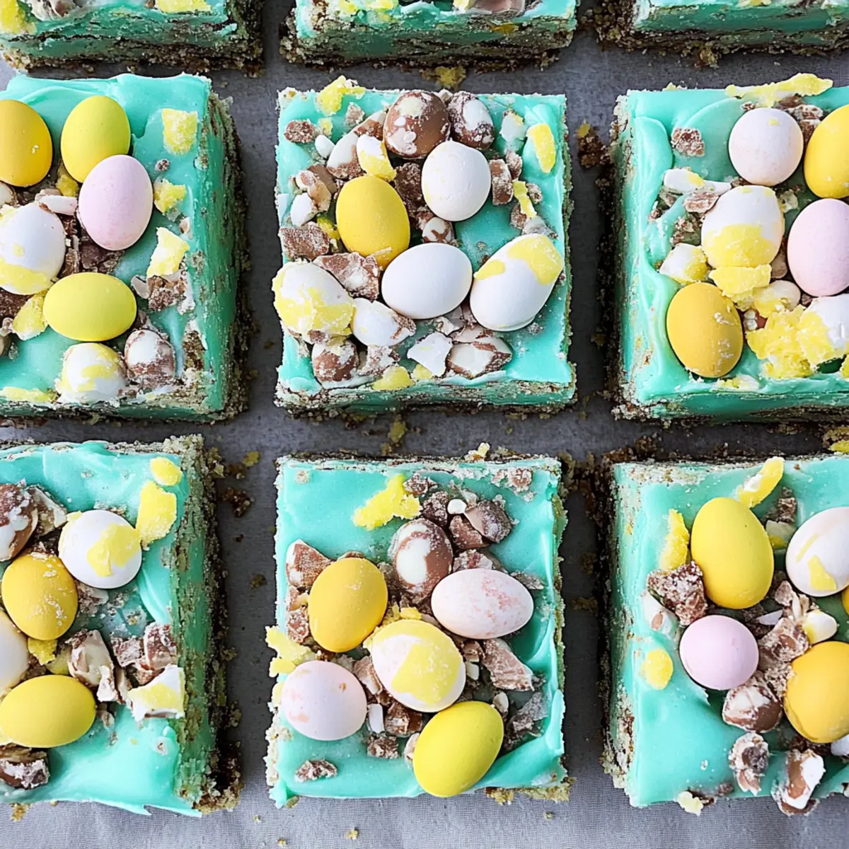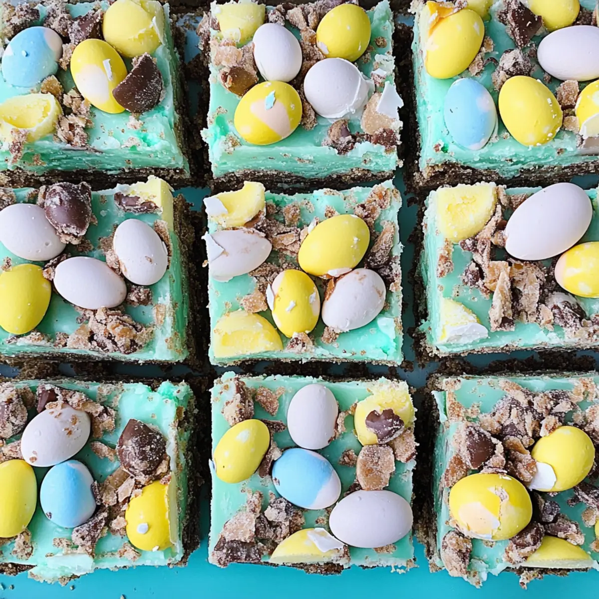 Jump to Recipe Print RecipeThe sweet scent of freshly baked cookies wafts through the air, promising a delightful treat just around the corner. As Easter approaches, there’s nothing quite like whipping up a batch of Frosted Easter Sugar Cookie Bars with Cadbury Mini Eggs to bring smiles to faces young and old. This easy preparation means you can craft a festive dessert without spending all day in the kitchen. The buttery, soft texture perfectly pairs with a creamy buttercream frosting, making these bars not just a treat but a joyful centerpiece for your celebrations. Plus, the addition of colorful Cadbury Mini Eggs on top adds a playful crunch that everyone will adore. Curious about how to make this simple yet impressive dessert? Let’s dive into the recipe! Why are Easter Sugar Cookie Bars a Must-Try? Simplicity: This recipe calls for basic ingredients and straightforward steps, making it perfect for both novice and seasoned bakers. Delightful Flavor: Combining the buttery sweetness of sugar cookies with smooth buttercream creates a decadent dessert everyone will love. Festive Presentation: The vibrant Cadbury Mini Eggs on top not only enhance the taste but also add a pop of color to your Easter table! Versatility: Feel free to experiment by swapping the candy toppings or tinting the frosting in various pastel shades to suit your celebration. Crowd-Pleaser: Cut into squares, these bars make for a shareable treat that’s sure to bring joy to family gatherings. Don’t forget to check out my other scrumptious recipes like the Gingerbread Oatmeal Cookies for more festive inspiration! Easter Sugar Cookie Bars Ingredients For the Cookie Base • Salted Butter – Provides richness and moisture; you can use unsalted butter and add a pinch of salt. • Brown Sugar – Adds sweetness and depth; feel free to substitute with light or dark brown sugar. • Granulated Sugar – Sweetens and helps with texture; no substitutions recommended for the best results. • Egg Yolk – Enhances richness; using one large whole egg can work, but yolk is preferred for a denser texture. • All-Purpose Flour – Forms the structure of the bars; gluten-free flour blends can be a great substitute for gluten-free options. • Baking Powder – Provides leavening for a fluffy texture; no substitutions are recommended for consistency. • Vanilla Extract – Adds aromatic flavor to the bar; you can swap it for almond extract for a nutty twist. For the Frosting • Powdered Sugar – Creates a smooth and sweet frosting; using freshly sifted sugar can improve texture. • Unsalted Butter – Brings creaminess to the frosting; ensure it’s at room temperature for easy mixing. • Heavy Cream – Aids in achieving a velvety consistency; substitute with milk if preferred, but the frosting may be less rich. • Food Coloring (optional) – For tinting the frosting; you can omit this if you prefer a classic look. For the Topping • Cadbury Mini Eggs – Provide both decoration and a delightful crunch; any candy-coated chocolate eggs can be used as substitutes. These Easter Sugar Cookie Bars are not just easy to make but also a joyful addition to your Easter celebrations! Step‑by‑Step Instructions for Frosted Easter Sugar Cookie Bars Step 1: Preheat and Prepare the Pan Begin by preheating your oven to 350°F (175°C). While it warms, line a 9×13-inch baking pan with parchment paper, allowing some overhang for easy removal later. This step will ensure your festive Easter Sugar Cookie Bars bake evenly and come out effortlessly, setting you up for sweet success! Step 2: Mix the Buttery Base In a large mixing bowl, combine ½ cup of salted butter with ¾ cup of brown sugar and ¼ cup of granulated sugar. Using a hand mixer or stand mixer, beat these together until smooth and creamy, about 2-3 minutes. You want a light color and fluffy texture that indicates the sugars are well incorporated for a perfect cookie base. Step 3: Add Egg Yolk and Vanilla Next, add in the egg yolk and 1 teaspoon of vanilla extract to your butter mixture. Mix on low speed until everything is fully combined, about 1-2 minutes. The mixture should appear glossy and smooth, adding richness that your Easter Sugar Cookie Bars will savor. Step 4: Incorporate the Dry Ingredients Gradually add 2 cups of all-purpose flour and 1 teaspoon of baking powder to the wet mixture. Mix on low speed until just combined. Avoid overmixing; the dough should be thick and slightly sticky, coming together nicely into a soft dough that will form the foundation of your bars. Step 5: Spread the Dough in the Pan Using a spatula, spread the thick cookie dough evenly in the prepared baking pan, pushing it to the corners to ensure uniformity. This is crucial for even baking, so make sure it’s well distributed. Smooth out the surface to create a beautiful base for your Frosted Easter Sugar Cookie Bars. Step 6: Bake to Perfection Bake the cookie base in your preheated oven for 20-25 minutes, or until it turns lightly golden around the edges. Insert a toothpick into the center; it should come out clean. Keep a close eye as it bakes, as you want soft, chewy bars with a slight bounce that will give you that perfect texture. Step 7: Cool Completely Once baked, remove the pan from the oven and place it on a wire rack to cool completely, about 30 minutes. This is an important step to prevent your frosting from melting and helps you achieve clean cuts for your festive Easter Sugar Cookie Bars later on. Step 8: Prepare the Buttercream Frosting In the meantime, you can prepare the creamy buttercream frosting. Using a stand mixer with a paddle attachment, beat together 1 cup of unsalted butter and 4 cups of powdered sugar until smooth and fluffy. This should take about 3-5 minutes, creating a light texture that complements your sugary bars beautifully. Step 9: Apply Food Coloring (Optional) If you want to add a fun touch to your frosting, mix in your desired food coloring until you a