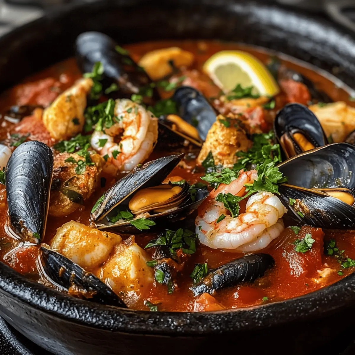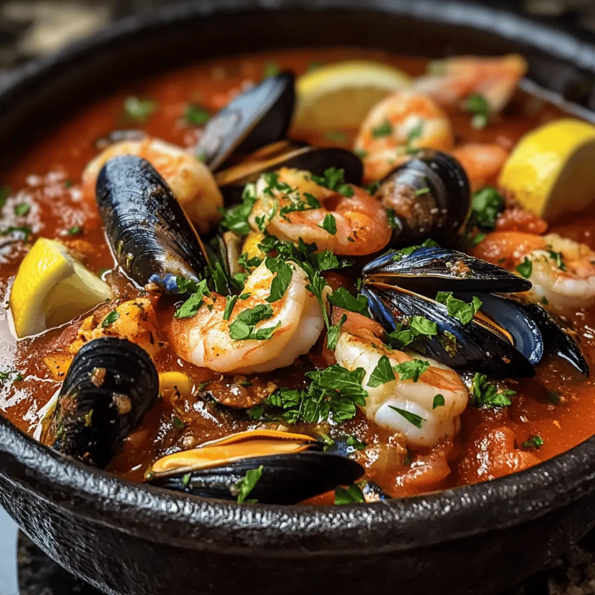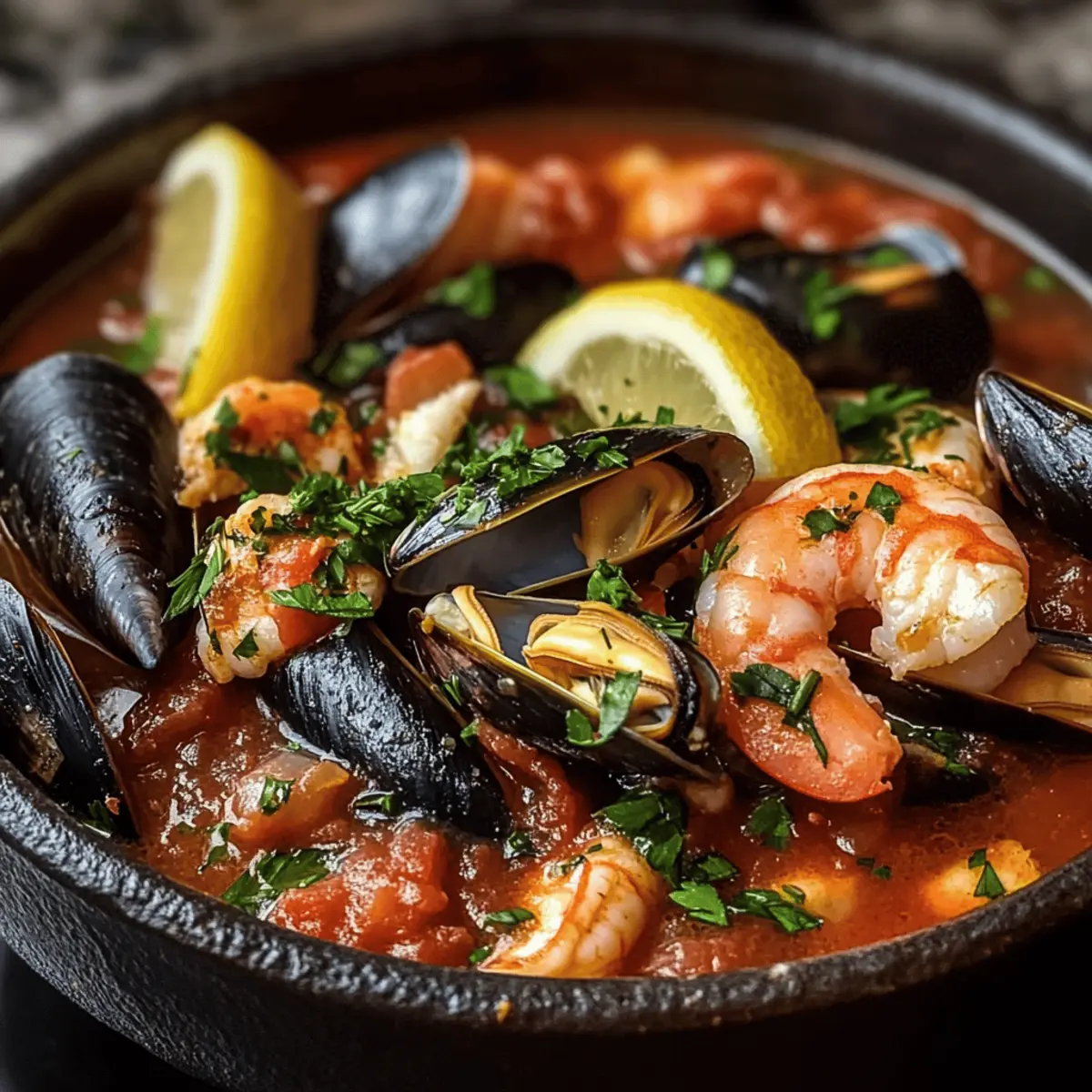 Jump to Recipe Print RecipeThe first whiff of briny, garlic-infused broth bubbling on the stove immediately transports me to the vibrant wharfs of San Francisco, where culinary traditions weave rich stories of the sea. If you’re in search of a dish that embodies comfort and elegance, look no further than my Easy Cioppino. This hearty Italian-American seafood stew is not only a beautiful centerpiece for dinner parties but is also a breeze to make—perfect for those evenings when you crave something special without the fuss. Combining mussels, clams, shrimp, fish, and scallops in a luscious tomato base, this stew showcases the joy of fresh ingredients and a few simple steps. Whether you’re gathering around the table with friends or enjoying a cozy night in, get ready to dive into a bowl of warmth and satisfaction. Curious about how to bring a taste of the coast to your kitchen? Let’s get started! Why is Easy Cioppino a Must-Try? Incredibly Simple: You don’t need to be a culinary expert to whip up this delightful dish. Fresh and Flavorful: A medley of seafood bursts with flavor in a rich tomato broth that evokes the seaside. Customizable: Add your favorite seafood like calamari or even swap spices to match your taste. Perfect for Gatherings: Impress your guests with a meal that looks gourmet but takes minimal effort—ideal for dinner parties! Quick Cook Time: Ready in under an hour, it’s a fantastic option for those busy weeknights or cozy weekends. Don’t forget to pair it with some crusty sourdough bread for the ultimate experience! Easy Cioppino Ingredients • Dive into the flavors of sea with these essential ingredients for Easy Cioppino! For the Stew Base Olive Oil – Provides richness and prevents sticking; avocado oil can be a fragrant alternative. Onion – Adds sweetness and depth to the base; shallots can be used for a milder flavor. Garlic – Essential for aroma; use fresh for the best flavor, with dried garlic as a backup. Red Pepper Flakes – Adds a dash of spice; adjust to your heat preference. Oregano & Thyme – Earthy herbs that elevate the stew; fresh herbs offer a burst of flavor. Dry White Wine – Deglazes the pot and adds acidity; use broth for a non-alcoholic twist. Crushed Tomatoes – Forms the hearty stew base; diced tomatoes work if you prefer a chunkier texture. Seafood or Fish Stock – Enhances the seafood flavors; homemade is fantastic, but store-bought suffices. Bay Leaf – Infuses the broth with depth; fresh offers a stronger taste than dried. Salt & Black Pepper – Essential for seasoning; always adjust to suit your palate. For the Seafood Medley Seafood Mix (Mussels, Clams, Shrimp, Fish, Scallops) – Stars of the dish, charmed with diverse textures; fresh is ideal, but frozen can work if thawed and dried. For Garnishing Fresh Parsley – Adds a burst of color and freshness; substitute with basil for a different herb vibe. Lemon Wedges – Brighten each bite with acidity; lime serves as a refreshing substitute. With these ingredients in your kitchen, you’re set to create a beloved Easy Cioppino that your friends and family will rave about! Step‑by‑Step Instructions for Easy Cioppino Step 1: Sauté the Aromatics In a large Dutch oven, heat 2 tablespoons of olive oil over medium heat. Add 1 chopped onion and sauté until soft and translucent, about 5 minutes. Stir in 4 minced garlic cloves, 1 teaspoon of red pepper flakes, 1 teaspoon of dried oregano, and 1 teaspoon of dried thyme. Cook for an additional minute until the mixture becomes fragrant, filling your kitchen with delicious aromas. Step 2: Deglaze the Pot Pour in 1 cup of dry white wine, scraping the bottom of the pot to release any browned bits. Allow it to simmer for about 2-3 minutes, until the wine has reduced slightly and the alcohol smell dissipates. This step infuses your Easy Cioppino with a lovely depth of flavor, in preparation for the following ingredients. Step 3: Build the Stew Base Stir in a 28-ounce can of crushed tomatoes and 2 cups of seafood or fish stock, mixing well. Add 1 bay leaf, and season with salt and pepper to taste. Raise the heat slightly and bring the mixture to a gentle simmer. Let it cook uncovered for 20 minutes, stirring occasionally until it thickens and the flavors meld beautifully. Step 4: Add the Shellfish Gently fold in 1 pound each of mussels and clams into the simmering stew. Cover the pot tightly and cook for about 5 minutes, until the shellfish have opened. This is a crucial moment for your Easy Cioppino; any moules or clams that remain closed after cooking should be discarded to ensure safety and quality. Step 5: Introduce the Seafood Medley After the shellfish are ready, stir in 1 pound of shrimp, 1 pound of fish fillets, and ½ pound of scallops. Cook uncovered for 3-4 minutes, or until the shrimp turn pink and the fish flakes easily with a fork. The aroma will entice you, signaling that your Easy Cioppino is nearing completion. Step 6: Final Touches and Serve Carefully remove the bay leaf from the stew. Ladle the Easy Cioppino into bowls, garnishing with freshly chopped parsley and serving with lemon wedges for a bright finish. The rich colors and inviting fragrance will make this dish the centerpiece of your dining table, ready to bring warmth and satisfaction to your guests. How to Store and Freeze Easy Cioppino Room Temperature: Allow Easy Cioppino to cool completely at room temperature for no more than 2 hours to ensure food safety. Fridge: Store in an airtight container for up to 2 days. Reheat gently on the stovetop over low heat, adding a splash of water or broth to restore moisture. Freezer: For long-term storage, freeze the broth separately from the seafood in airtight containers for up to 3 months. Thaw in the refrigerator overnight before reheating. Reheating: When ready to enjoy leftovers, gently reheat the broth and add freshly cooked seafood for the best flavor and texture in your Easy Cioppino. Easy Cioppino Variat
