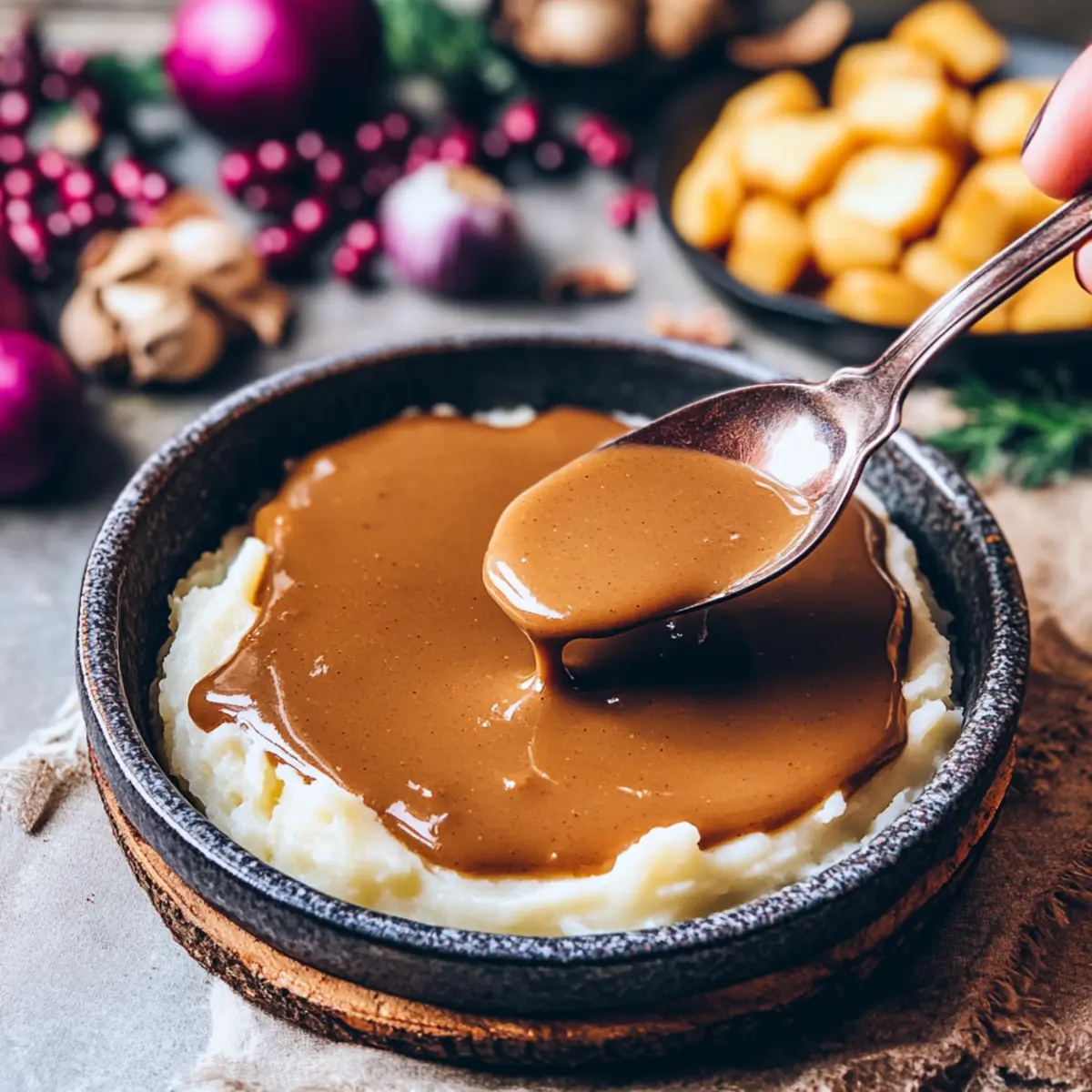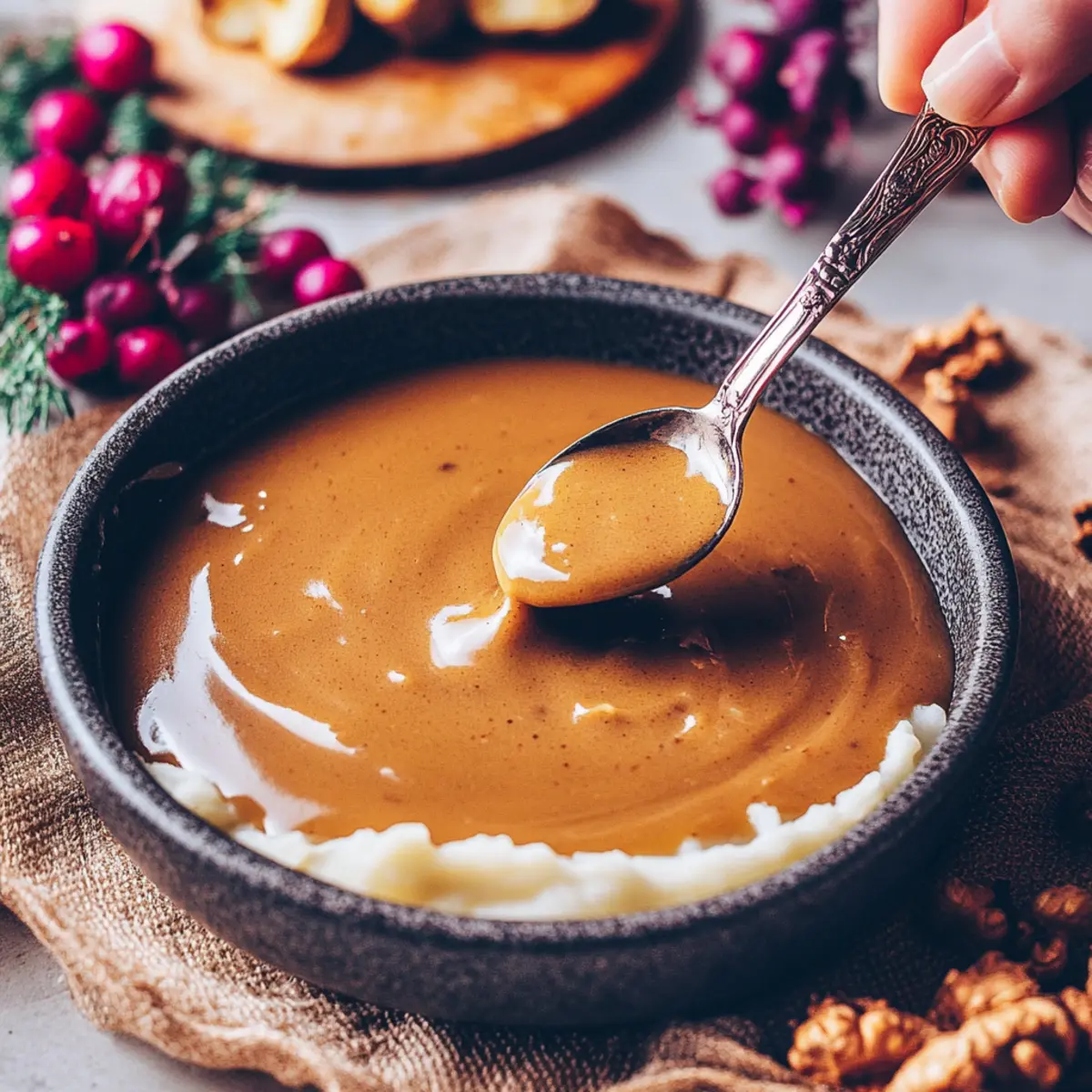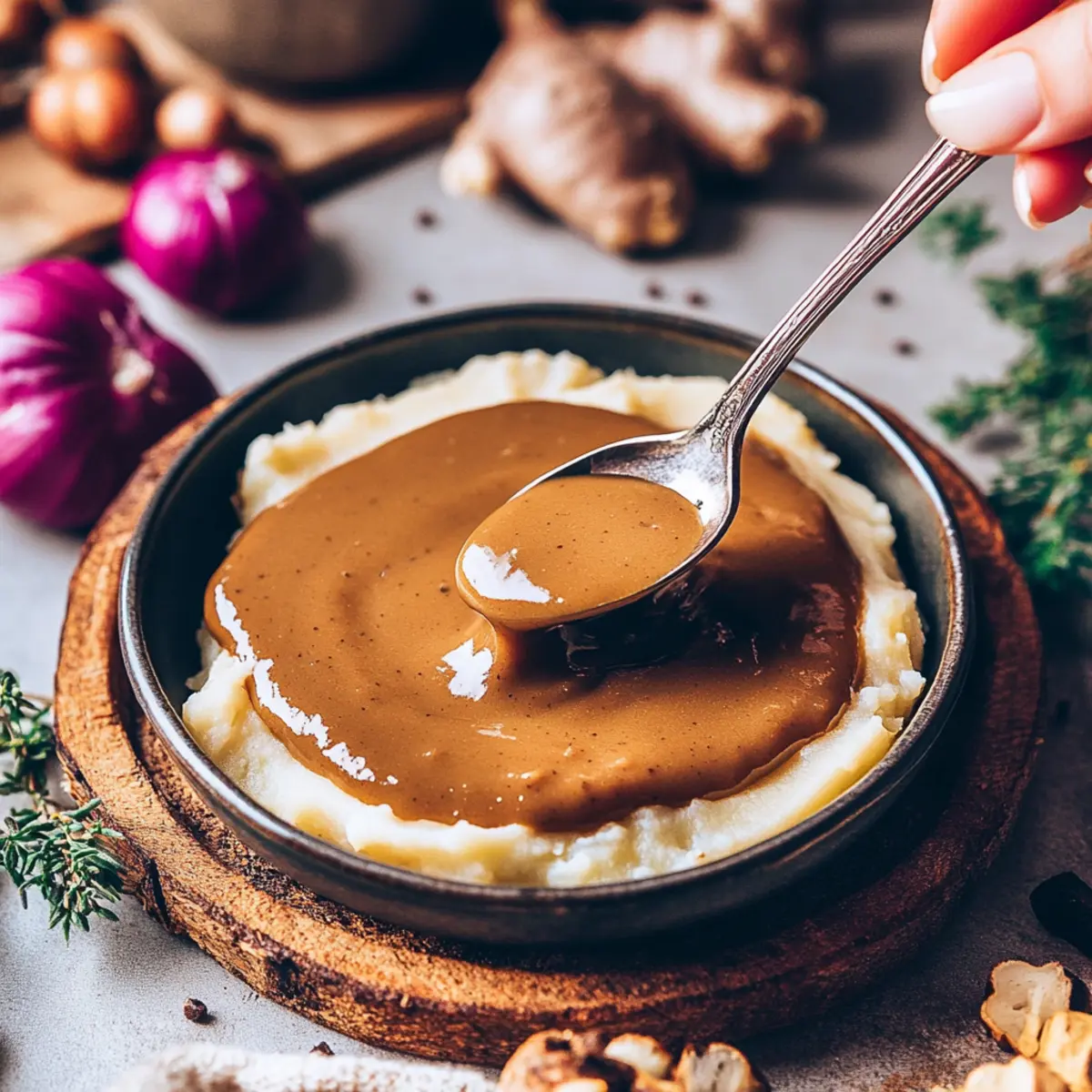 Jump to Recipe Print RecipeAs I stirred the bubbling pot, the rich aroma of sautéed onions and mushrooms wafted through my kitchen, instantly lifting my spirits. It’s incredible how simple ingredients can transform into something so satisfying, isn’t it? Today, I’m excited to share my recipe for Easy Vegan Gravy, a versatile sauce that elevates everything from roasted vegetables to fluffy mashed potatoes. Not only is this gravy quick to whip up—taking just a few steps—but it’s also made entirely with wholesome, plant-based components, making it a guilt-free addition to any meal. Whether you’re preparing for a holiday feast or just looking to enhance your weeknight dinners, you’ll find this savory sauce to be a true crowd-pleaser. Are you ready to add a touch of comfort to your table? Why is this gravy so special? Simplicity at its finest: This Easy Vegan Gravy requires minimal ingredients and effort while delivering maximum flavor. Rich, Comforting Flavor: The blend of sautéed onions, hearty mushrooms, and aromatic herbs creates an invitation to indulge. Versatile Pairing: This gravy complements a range of dishes—from cozy mashed potatoes to roasted veggies, making it a staple for every cook’s repertoire. Healthy & Wholesome: Made with plant-based components, this dish is dairy-free and gluten-free, catering to various dietary preferences without sacrificing taste. Quick Preparation: Whip this up in under 30 minutes, saving you time for what really matters—enjoying your meal with loved ones! Crowd-Pleasing Delight: Whether it’s a holiday celebration or a casual dinner, this gravy is guaranteed to win over any guest, just like my popular Coconut Shrimp or a bowl of warm Miso Soup. Easy Vegan Gravy Ingredients • Simple and satisfying essentials! Vegan Butter or Oil – Provides a rich base for sautéing; you can substitute with olive oil or coconut oil for a different flavor. Onion – Finely diced; adds aromatic sweetness—yellow or white onions work beautifully. Mushrooms (5.3 oz or 150 g) – Finely diced; contributes umami flavor and texture—try cremini or button mushrooms for variety. Carrot – Finely diced; adds slight sweetness and a pop of color. Garlic (1 clove, minced) – Infuses flavor and depth; fresh garlic is always best for that robust taste. Coconut Sugar or Brown Sugar (1 tbsp) – Balances the savory flavors; you can easily swap for brown sugar if you like. Flour (1 tbsp; all-purpose or gluten-free) – Acts as a thickening agent; choose gluten-free flour for dietary needs. Red Wine (¼ cup or 60 ml) – Enhances the gravy’s flavor complexity; use vegetable broth for a non-alcoholic option if desired. Red Wine Vinegar or Balsamic Vinegar (1 tbsp) – Provides the acidity needed to brighten up your gravy. Soy Sauce or Tamari (1 tbsp) – Adds a savory saltiness; opt for tamari if you’re seeking a gluten-free alternative. Vegetable Broth (1¼ cup or 300 ml) – Forms the base of your gravy; for a lighter taste, use low-sodium broth. Thyme (1 sprig) – Offers an herbal aroma and flavor that elevates your dish; dried thyme works too (½ tsp). Bay Leaf (1) – Infuses warmth and depth; just remember to remove it before serving! Yellow Mustard or Dijon (1 tsp) – Adds tanginess; Dijon gives a sharper flavor profile. Pepper (½ tsp or to taste) – Enhances the overall flavor; adjust according to your preference. Salt (Pinch or to taste) – Use as needed to balance and enhance flavors throughout your easy vegan gravy. Step‑by‑Step Instructions for Easy Vegan Gravy Step 1: Heat the Base In a large pan, melt 2 tablespoons of vegan butter or oil over medium-high heat. Allow it to shimmer for about 1 minute, indicating that it’s ready for cooking. This rich base will enhance the flavors of your Easy Vegan Gravy, creating a savory foundation for the other ingredients. Step 2: Sauté Vegetables Add 1 finely diced onion and 150 grams of finely diced mushrooms to the pan. Sauté them for about 3 minutes until the onions turn translucent and the mushrooms become slightly browned. This step releases their aromatic goodness, setting the stage for a flavorful gravy. Step 3: Incorporate Carrots and Garlic Stir in 1 finely diced carrot and 1 minced garlic clove, sautéing for an additional minute. You’ll notice the vibrant colors and enticing aromas filling your kitchen. This addition brings sweetness and depth to the Easy Vegan Gravy, enriching its overall flavor profile. Step 4: Add Sugar and Flour Lower the heat slightly and sprinkle in 1 tablespoon of coconut sugar and 1 tablespoon of flour. Mix thoroughly, cooking for about 1 minute until the mixture is well combined. This will create a roux that acts as a thickening agent for your gravy. Step 5: Pour in Liquids Gradually pour in 60 ml of red wine, 1 tablespoon of red wine vinegar, 1 tablespoon of soy sauce, and 300 ml of vegetable broth. Stir continuously for about 2 minutes to combine all the flavors, watching as the mixture becomes smooth and begins to thicken. Step 6: Season the Gravy Add 1 sprig of thyme, 1 bay leaf, 1 teaspoon of yellow mustard, and ½ teaspoon of pepper to the pot. Allow these flavors to meld together, simmering uncovered on low to medium heat for 10 to 15 minutes. Keep an eye on it, stirring occasionally until it reaches a thick, saucy consistency. Step 7: Blend for Smoothness Remove the bay leaf and transfer the gravy to a blender, or use an immersion blender directly in the pot. Blend until smooth, which should take around 1-2 minutes. This step ensures your Easy Vegan Gravy has a luxurious texture, perfect for drizzling over your favorite dishes. Step 8: Taste and Adjust Finally, return the gravy to the heat and taste for seasoning adjustments. Add a pinch of salt or any additional spices as desired, stirring well. Once the flavors are just right, your delicious Easy Vegan Gravy is ready to elevate any meal on your table. Expert Tips for Easy Vegan Gravy Choose F
