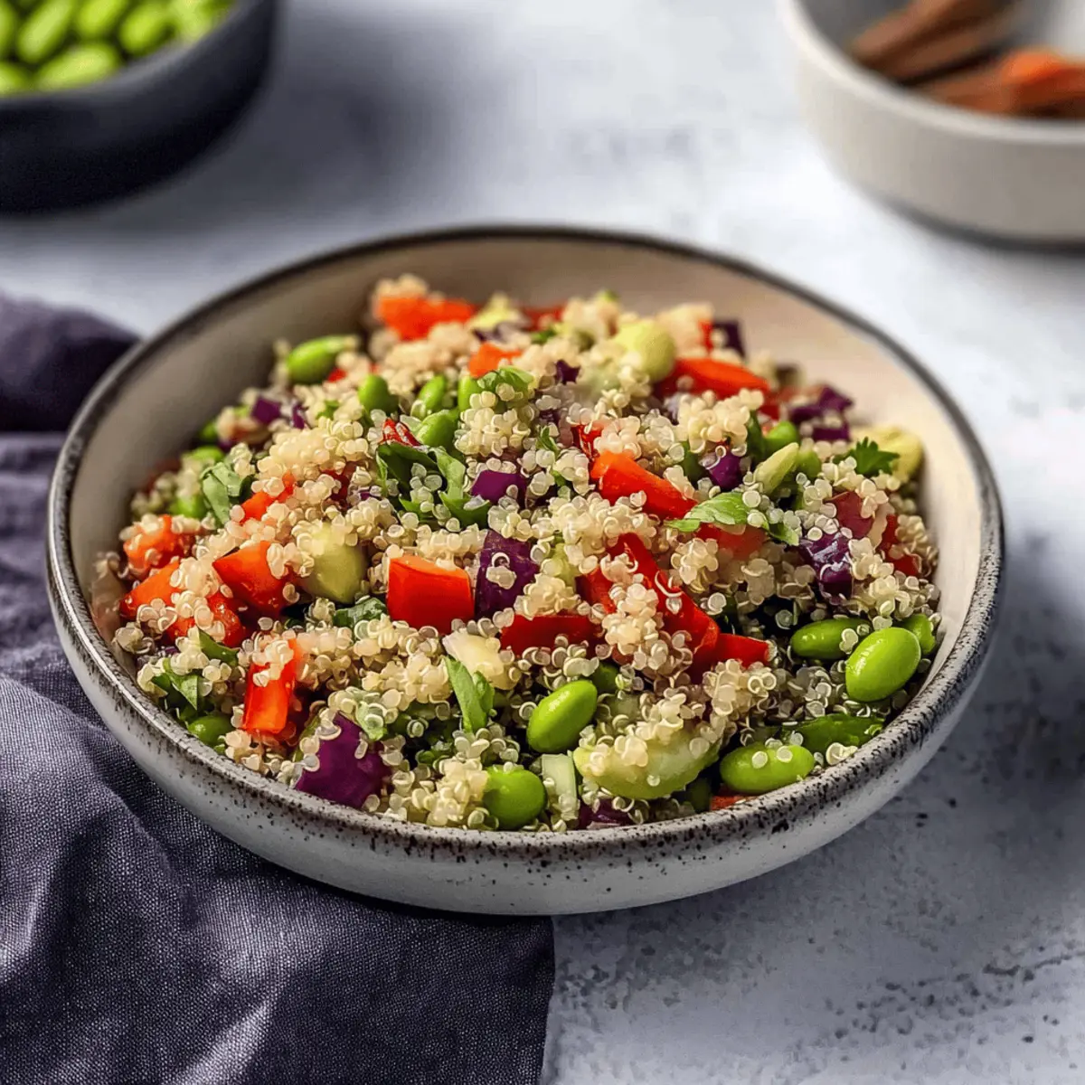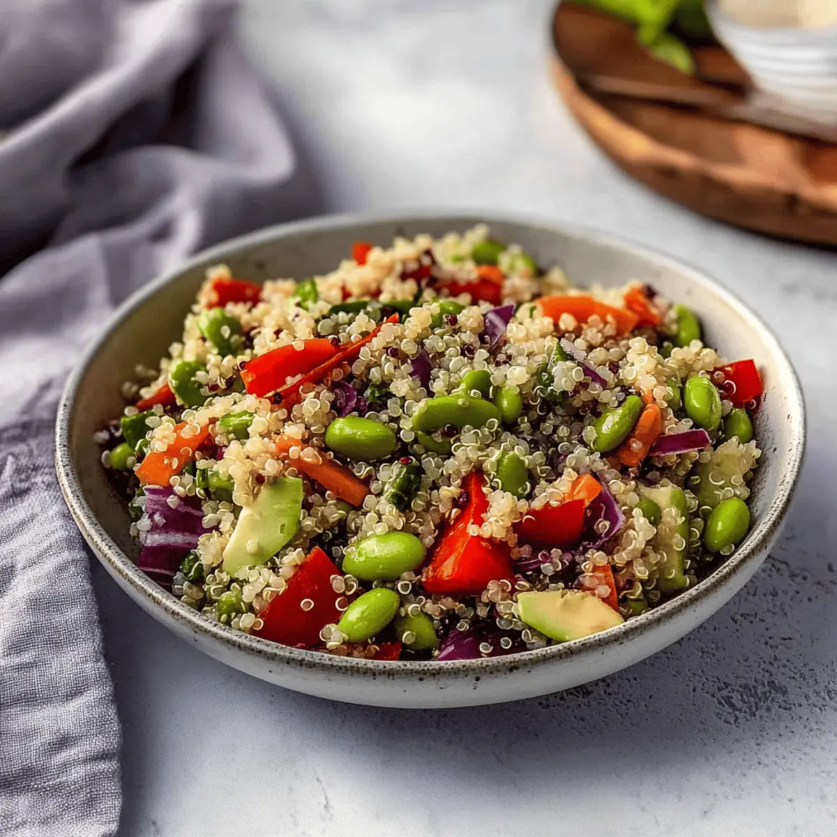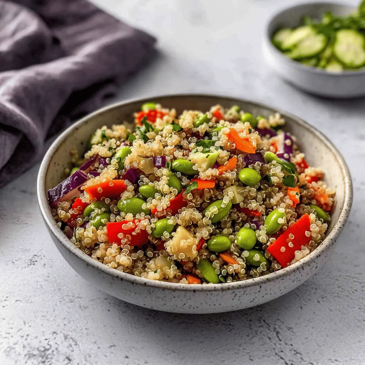 Jump to Recipe Print RecipeAs I stood in my kitchen, a rainbow of fresh vegetables caught my eye, and inspiration struck—today, I’m whipping up an Edamame Quinoa Salad with Sesame Ginger Dressing. This vibrant dish not only delights the senses but also offers a perfect balance of health and satisfaction. With its nutty quinoa and creamy edamame mingling beautifully with crunchy veggies, it’s a meal prep superstar that you can enjoy chilled or at room temperature. Imagine the ease of creating a nutritious, vegan-friendly dish that’s gluten-free and brimming with flavor, ready to nourish you through the week. Curiosity piqued? Let’s dive into how to create this delectable salad together! Why is This Edamame Quinoa Salad Perfect? Vibrant Flavors: This salad bursts with freshness thanks to the colorful mix of veggies and the zingy sesame ginger dressing. Meal Prep Magic: Prepare it in advance and enjoy a healthy lunch or dinner throughout the week—simply chill and serve! Nutritious Powerhouse: Packed with protein-rich edamame and fiber-dense quinoa, it’s a filling choice that keeps hunger at bay. Versatile Ingredients: Feel free to add seasonal veggies or swap them out as you please; try adding diced mango for a tropical twist! Quick and Easy: With minimal cooking involved, this salad is perfect for busy days when you crave something satisfying yet healthy. You can also enjoy it as a side with dishes like Healthy Sesame Chicken for a complete meal! Edamame Quinoa Salad Ingredients For the Salad Quinoa – Provides a hearty base and a nutty flavor; be sure to rinse it first to remove any bitterness. Vegetable Broth or Water – Used to cook the quinoa; broth enhances the overall flavor for your Edamame Quinoa Salad. Edamame – Adds protein and a creamy texture; use shelled edamame (fresh or frozen) for convenience. Red Bell Pepper – Contributes sweetness and crunch; feel free to substitute with any color of bell pepper. Red Cabbage – Adds vibrant color and crunch; massage with salt to soften it before mixing. Cucumber – Offers a refreshing crunch; zucchini can be a fun alternative if you’re looking for variety. Salt – Enhances the flavors; always adjust to suit your taste preferences. Toasted Sesame Seeds – Optional garnish that adds nuttiness and visual appeal to your salad. Green Onions – Provides a mild onion flavor that brightens the dish; substitute with regular onions if needed. For the Dressing Seasoned Rice Vinegar – Adds acidity and flavor; apple cider vinegar makes a suitable substitute. Reduced-Sodium Soy Sauce – Introducing umami depth; for a gluten-free version, opt for tamari. Fresh Ginger – Offers a spicy, aromatic note; always use fresh for better flavor, and freeze extra for easy grating. Sesame Oil – Adds richness and a unique flavor profile; a light olive oil can work in its place if desired. Embrace the vibrant flavors and nourishing ingredients of this Edamame Quinoa Salad with Sesame Ginger Dressing—a dish that will bring joy to your meal prep! Step‑by‑Step Instructions for Edamame Quinoa Salad with Sesame Ginger Dressing Step 1: Cook Quinoa In a medium pot, bring 1 cup of vegetable broth or water to a rolling boil over high heat. Once boiling, add ½ cup of rinsed quinoa, reduce the heat to low, cover, and simmer for about 15 minutes or until the liquid is absorbed and the quinoa is fluffy. Remove from heat and let it sit, covered, for another 5 minutes for optimal texture. Step 2: Prepare Dressing While the quinoa is cooking, grab a small bowl or jar to prepare the dressing. Combine 2 tablespoons of seasoned rice vinegar, 1 tablespoon of reduced-sodium soy sauce, 1 tablespoon of freshly grated ginger, and 1 tablespoon of sesame oil. Whisk or shake until thoroughly mixed, creating a harmonious blend of flavors that will elevate your Edamame Quinoa Salad. Step 3: Massage Cabbage In a large mixing bowl, add 2 cups of shredded red cabbage and sprinkle it with ¼ teaspoon of salt. Gently massage the cabbage with your hands for about 2-3 minutes until it becomes tender and slightly wilted. This process enhances the cabbage’s flavor and texture, making it a delightful addition to your salad. Step 4: Combine Ingredients Once the quinoa is cooked and slightly cooled, add it to the bowl with the massaged cabbage. Toss in 1 cup of shelled edamame, 1 diced red bell pepper, 1 cup of diced cucumber, and pour the prepared sesame ginger dressing over the top. Gently stir until all the ingredients are well combined, ensuring an even distribution of flavors throughout your Edamame Quinoa Salad. Step 5: Toss and Serve Finally, give the salad a good mix to ensure everything is coated in the dressing. For an added crunch and visual appeal, sprinkle 1 tablespoon of toasted sesame seeds and some sliced green onions on top. Serve the salad cold or at room temperature for a refreshing meal, perfect for your lunch or dinner! How to Store and Freeze Edamame Quinoa Salad Fridge: Store your Edamame Quinoa Salad in an airtight container for up to 5 days. This keeps the flavors fresh and vibrant, ready to enjoy whenever you need a quick meal. Room Temperature: It’s best to serve the salad cold or at room temperature. If left out at room temperature, aim to consume it within 2 hours to maintain freshness and taste. Reheating: Although it’s not recommended to reheat the salad, if you choose to warm it up slightly, do so gently in a pan over low heat—this helps preserve the texture and flavor of the fresh ingredients. Freezer: Avoid freezing the salad, as the crunchy vegetables lose their crispness, making it less enjoyable. Instead, make it fresh to savor its delightful textures! Expert Tips for Edamame Quinoa Salad Rinse Quinoa: Always rinse the quinoa before cooking to remove its natural bitterness, ensuring a nutty flavor in your Edamame Quinoa Salad. Perfectly Cooked Quinoa: For fluffy quinoa, let it sit covered for a few minutes after cooking. Th