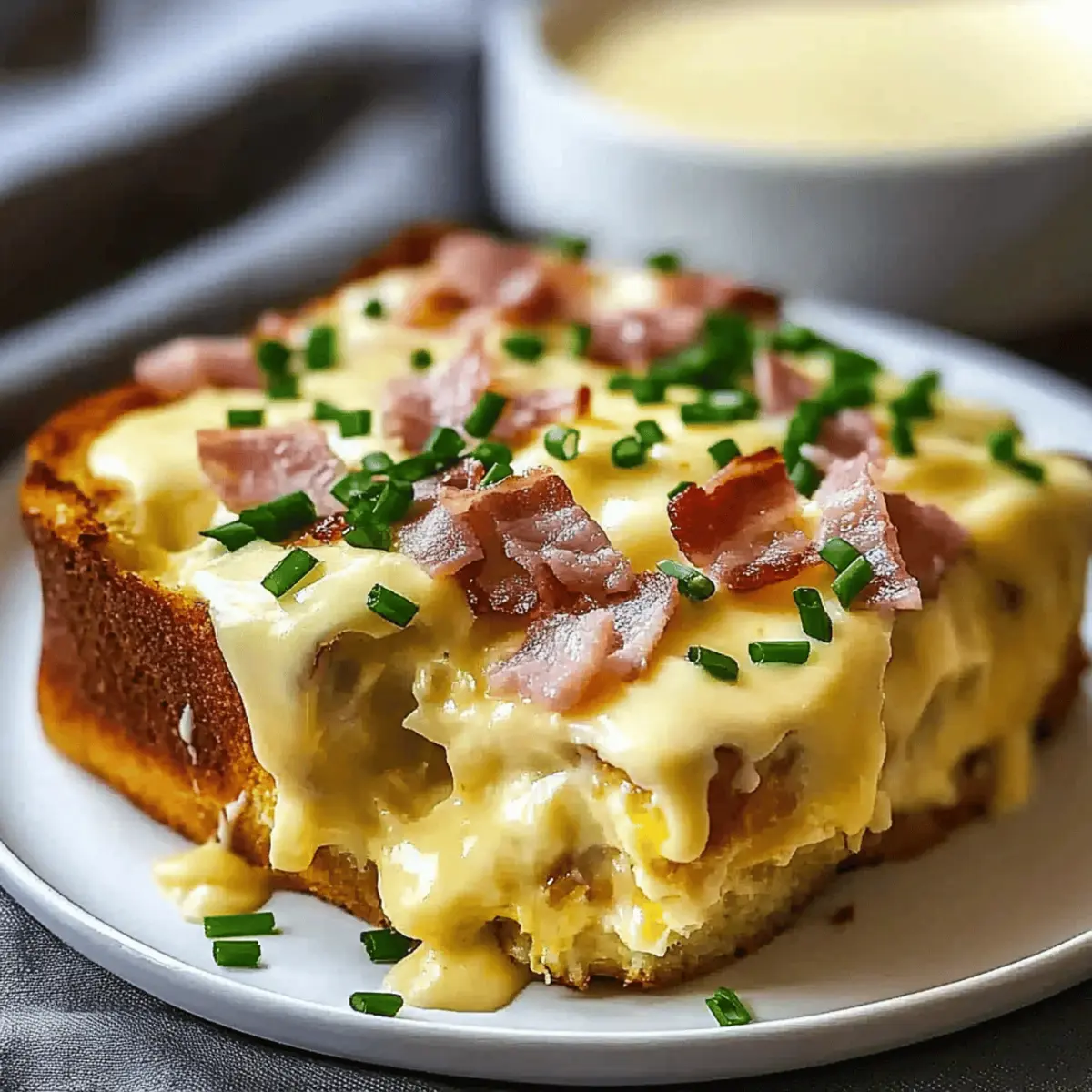 Jump to Recipe Print RecipeAs the aroma of toasty English muffins wafted through my kitchen, I knew I was onto something special. This Overnight Eggs Benedict Casserole takes the beloved brunch favorite and morphs it into a make-ahead masterpiece. Imagine savoring rich layers of savory Canadian bacon and fluffy eggs, all drizzled with velvety hollandaise sauce, without the morning rush. Not only is this dish a crowd-pleaser, perfect for lazy weekends or special gatherings, but it also eliminates the hassle of poaching eggs, allowing you to enjoy your time with family or friends. Prepared the night before, it’s the ideal stress-free solution to elevate your brunch game. Curious how to bring this easy yet impressive dish to your table? Let’s dive in! Why Make Eggs Benedict Casserole? Make-Ahead Convenience: This casserole allows for stress-free mornings, letting you prepare everything the night before. Crowd-Pleasing Brunch: Impress your family and friends with a dish that combines rich flavors and hearty textures, perfect for any gathering. Flavor Fusion: Enjoy the harmonious blend of savory Canadian bacon, creamy hollandaise, and fluffy eggs all in one satisfying bite. Versatile Ingredients: Easily swap out Canadian bacon for ham or sausage, or toss in some spinach for an extra nutritional boost! Check out Baked Tortellini Casserole for another great make-ahead option. Effortless Serving: With minimal prep time, you can savor every moment with your guests instead of being stuck in the kitchen. Gourmet Touch: Elevate your brunch experience with the luxurious texture of hollandaise sauce, making you feel like a restaurant chef at home! Eggs Benedict Casserole Ingredients For the Casserole Canadian Bacon – Provides a savory, rich flavor; feel free to substitute with ham or cooked sausage if desired. English Muffins – The base that absorbs the egg mixture; toasting enhances both flavor and texture. Eggs – The primary binding agent, contributing structure and richness to the dish. Whole Milk – Adds a creamy element to the egg mixture for that luscious mouthfeel. Onion Powder – Delivers depth of flavor, making each bite irresistible. Garlic Powder – Introduces savory notes that elevate the overall taste of the casserole. Paprika – Adds a hint of color and flavor, giving it that appetizing appearance. Fresh Chives – For garnish, offering a fresh and mild onion flavor as a finishing touch. For the Hollandaise Sauce Egg Yolks – Essential for richness in the hollandaise sauce, making it luxuriously creamy. Heavy Cream – Provides an extra layer of creaminess, ensuring the hollandaise is perfectly smooth. Lemon Juice – Adds balancing acidity to cut through the richness of the sauce. Dijon Mustard – Enhances the flavor profile of the hollandaise sauce, giving it a subtle kick. Cayenne Pepper – Offers a hint of heat; adjust to taste for your preferred spice level. Salt – Essential for seasoning, ensuring all the flavors pop. Melted Butter – Adds richness and flavor to the hollandaise, creating that classic velvety texture. Step‑by‑Step Instructions for Overnight Eggs Benedict Casserole Step 1: Prepare the Baking Dish Start by spraying a 9×13-inch baking pan with non-stick cooking spray. This will prevent the delicious layers of your Eggs Benedict Casserole from sticking as they bake. Make sure to cover the entire surface well for easy removal later on. Step 2: Layer the Ingredients Begin layering half of the diced Canadian bacon evenly in the prepared baking dish. Then, place the cut English muffins on top, followed by the remaining Canadian bacon. These layers create a hearty base, ensuring every bite of your casserole is packed with flavor and texture. Step 3: Whisk the Egg Mixture In a large mixing bowl, whisk together the eggs, whole milk, onion powder, garlic powder, paprika, and a pinch of salt until fully combined. The mixture should be smooth and homogenous, with a beautiful, airy texture that will soak into the layers of your casserole. Step 4: Pour the Egg Mixture Carefully pour the egg mixture over the layered ingredients in the baking dish. Ensure even coverage by gently pressing down on the muffins to allow them to absorb the flavor-rich liquid. This step is vital for achieving that custardy texture in the final Eggs Benedict Casserole. Step 5: Refrigerate Overnight Cover the dish with plastic wrap or a lid and refrigerate for at least 5 hours, or ideally overnight. This resting period allows the flavors to meld and the bread to soak up the egg mixture, ensuring a deliciously fluffy texture and depth of flavor when baked. Step 6: Bring to Room Temperature On the morning of baking, take the casserole out of the refrigerator and let it sit at room temperature for about 30 minutes. Allowing it to warm slightly will prevent a cold shock when it enters the oven, promoting even baking and ensuring a perfect Eggs Benedict Casserole. Step 7: Preheat and Bake While the casserole is resting, preheat your oven to 375°F (190°C). Once heated, cover the baking dish with foil and place it in the oven. Bake for 35 minutes, which will allow the mixture to set and cook through while keeping the top moist and tender. Step 8: Uncover and Finish Baking After 35 minutes, carefully remove the foil and continue baking for an additional 15 minutes or until the casserole is puffed up and golden brown on top. You’ll know it’s ready when the edges are bubbly and the center is set, resembling a classic brunch dish. Step 9: Make the Hollandaise Sauce While the casserole is baking, prepare your hollandaise sauce. In a blender, add egg yolks, heavy cream, lemon juice, Dijon mustard, cayenne pepper, and salt. Blend until smooth, and slowly drizzle in melted butter while the blender is running to create a creamy, emulsified sauce. Step 10: Serve and Garnish Once the casserole is baked, slice it into portions and serve warm. Drizzle each serving generously with the creamy hollan