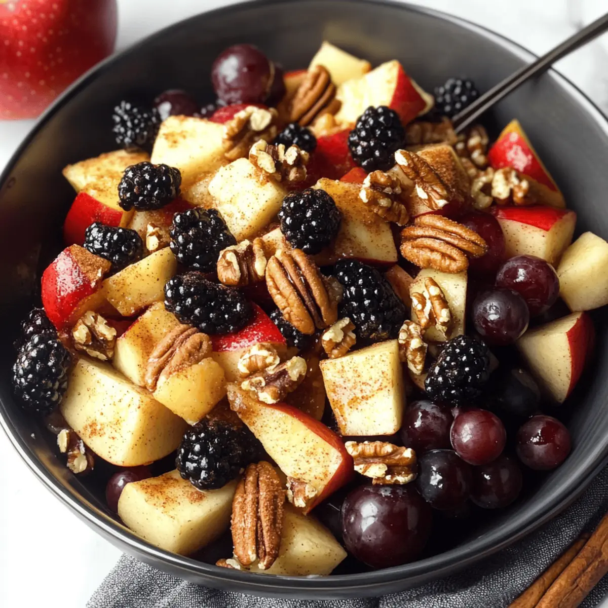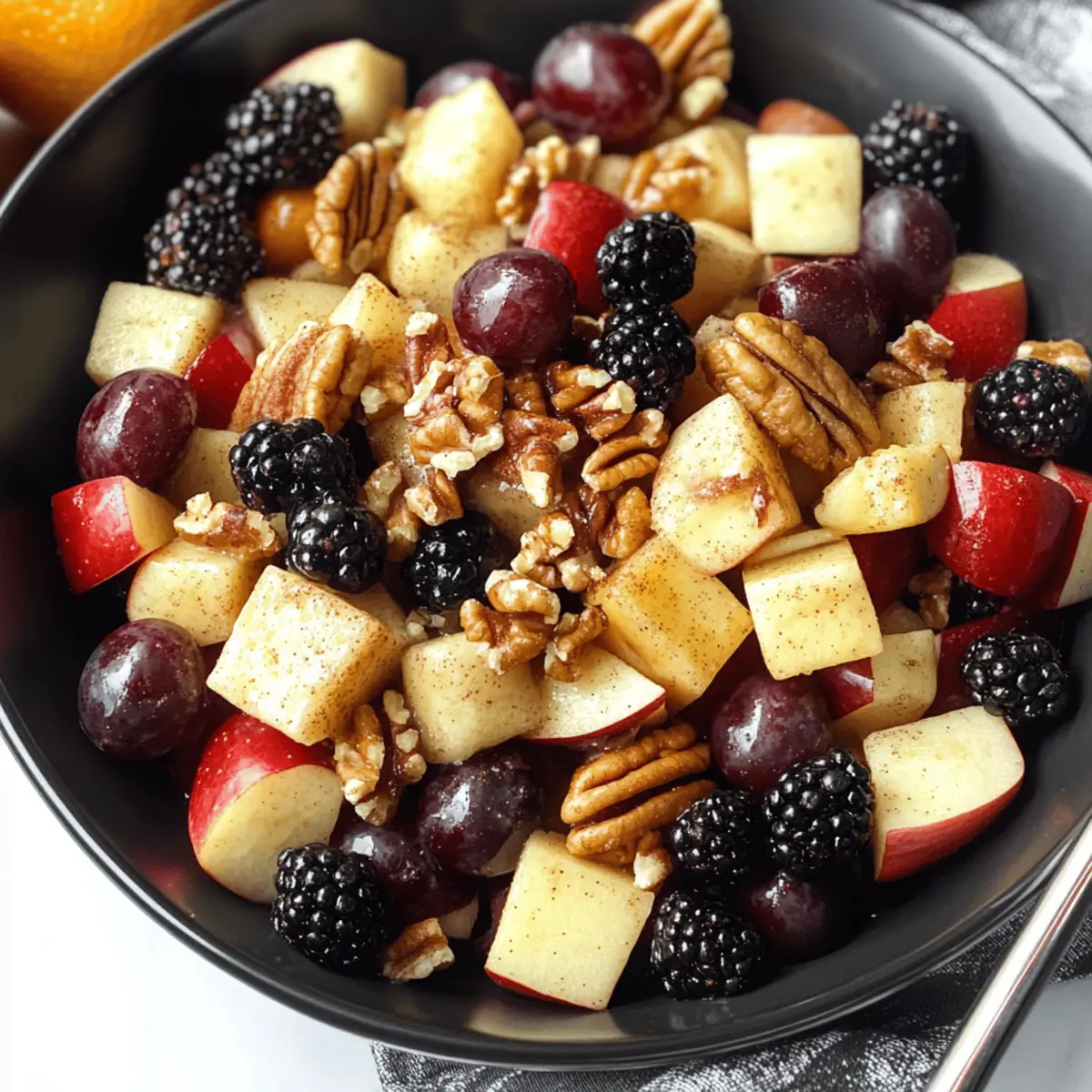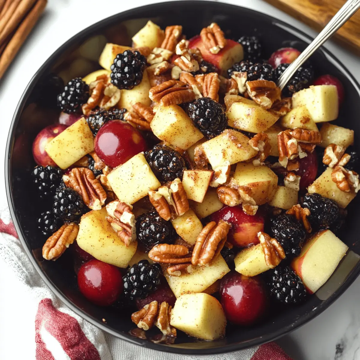 Jump to Recipe Print RecipeAs the leaves change and the air turns crisp, I find myself craving the vibrant colors and flavors of autumn. Enter the Cinnamon Orange Fall Fruit Salad, a delightful symphony of fresh apples, juicy blackberries, and crunchy pecans, all embraced by a warm, cozy dressing that sings of fall. This recipe isn’t just quick to prepare; it also serves as a refreshing side dish for holiday gatherings or cozy brunches—perfect for showcasing seasonal fruit at its best. Each bite brings a burst of sweetness and a satisfying crunch, making it a healthy addition to your fall table. Are you ready to discover how easy it is to whip up this festive creation? Why is Fall Fruit Salad a Must-Try? Vibrant Colors: This salad draws you in with bold hues of fresh fruit that reflect the beauty of autumn. Nutritious Choice: Packed with fiber-rich fruits, each serving offers a healthy boost that’s perfect for those looking to stay fit while enjoying delicious flavors. Quick Prep: Not only is it simple to make, but you can whip it up in under 10 minutes, giving you more time to enjoy your company. Versatile Options: Feel free to experiment with substitutions; try different fruit combinations or dressings to suit your taste! You can even incorporate other delicious salads like Cucumber Strawberry Salad for a colorful spread. Crowd Favorite: Whether at holiday gatherings or brunches, this dish is sure to be a showstopper that resonates with everyone’s palate. Fall Fruit Salad Ingredients For the Dressing Orange – Freshly zested and juiced for a bright flavor; substitute with ¼ cup prepared orange juice for convenience. Maple Syrup – Adds a layer of natural sweetness; honey can be used as a substitute if desired. Ground Cinnamon – Infuses warmth and coziness to the dressing; no direct substitutes recommended. For the Salad Red Seedless Grapes – Juicy and sweet, perfect for refreshing bites; green grapes or other seasonal fruits are great alternatives. Blackberries – Offer a delightful tartness and beautiful color; feel free to swap in blueberries or raspberries. Chopped Pecans – Provide a pleasant crunch and nuttiness; toast them for extra flavor or use walnuts as a substitute. Sweet Apples (Honeycrisp, Fuji, Gala) – Contribute crisp texture and sweetness, and any sweet apple variety will do beautifully. This wholesome Fall Fruit Salad combines all the elements for a perfect autumn dish! Step‑by‑Step Instructions for Fall Fruit Salad Step 1: Prepare the Dressing Begin by zesting and juicing the fresh orange into a large mixing bowl. You should have about ¼ cup of orange juice. Whisk in 2 tablespoons of maple syrup and 1 teaspoon of ground cinnamon, mixing until smooth. The dressing should have a lovely cohesive consistency, with the aromatic spices wafting up as you blend them with the tangy orange juice. Step 2: Add the Grapes and Blackberries Next, add the red seedless grapes and fresh blackberries to the bowl with the dressing. Use about 1 cup of each fruit, ensuring they are rinsed and patted dry. Gently fold the fruits into the dressing with a spatula to coat them evenly, allowing the vibrant colors of the fruits to meld with the warm spices. Step 3: Incorporate the Pecans Chop approximately ½ cup of pecans and add them to the fruit mixture. As you fold them in, the crunchiness of the pecans provides a delightful contrast to the juicy fruits. If you’d like an extra layer of flavor, consider toasting the pecans in a dry skillet over medium heat for about 5 minutes before adding them. Step 4: Add the Apples Now, take 2–3 sweet apples, like Honeycrisp or Fuji, and cube them into bite-sized pieces. Add these apples to the bowl right before serving to prevent browning. Fold the apple cubes into the mixture gently, ensuring all the fruits are coated in the lovely dressing without bruising them. Step 5: Toss and Serve Gently toss everything together in the bowl until all the fruits are well coated with the cinnamon orange dressing. It’s essential to do this lightly to preserve the integrity of the fruit. Once combined, serve the Fall Fruit Salad immediately for the freshest taste, or cover and refrigerate for up to an hour before serving to allow the flavors to meld. How to Store and Freeze Fall Fruit Salad Fridge: Keep your Fall Fruit Salad in an airtight container in the fridge for up to 3 days. For optimal freshness, consume it within the first day after preparation. Reheating: This salad is best served cold and should not be reheated. If stored properly, it will retain its delightful crunch and vibrant flavors. Preventing Browning: To minimize browning of the apples, always add them last and ensure they are coated in the dressing immediately after cutting. Freezer: Freezing is not recommended, as the texture of the fruits will change upon thawing, compromising the quality of your salad. Fall Fruit Salad Variations & Substitutions Customize your Fall Fruit Salad to create your own delightful version that captures the essence of autumn! Seasonal Fruits: Experiment with kiwi, pears, or pomegranate seeds for a refreshing twist. Each addition brings a new flavor profile and texture, making your salad even more exciting. Dairy-Free Delight: Swap in a coconut yogurt or dairy-free yogurt for a creamy finish that complements the fruity flavors beautifully. The addition of dairy-free options opens the door for all guests to enjoy! Granola Crunch: For added texture, sprinkle some granola on top just before serving. This will add a satisfying crunch that contrasts perfectly with the soft fruits and gives it an appealing layered look. Spice It Up: If you enjoy a little heat, add a pinch of cayenne pepper or a splash of ginger to the dressing. This unexpected twist will warm the flavor without overwhelming it, making your salad stand out. Honey Lemon Dressing: Consider using a honey lemon dressing instead of the cinnamon orange blend. Just whisk together fresh lemon j