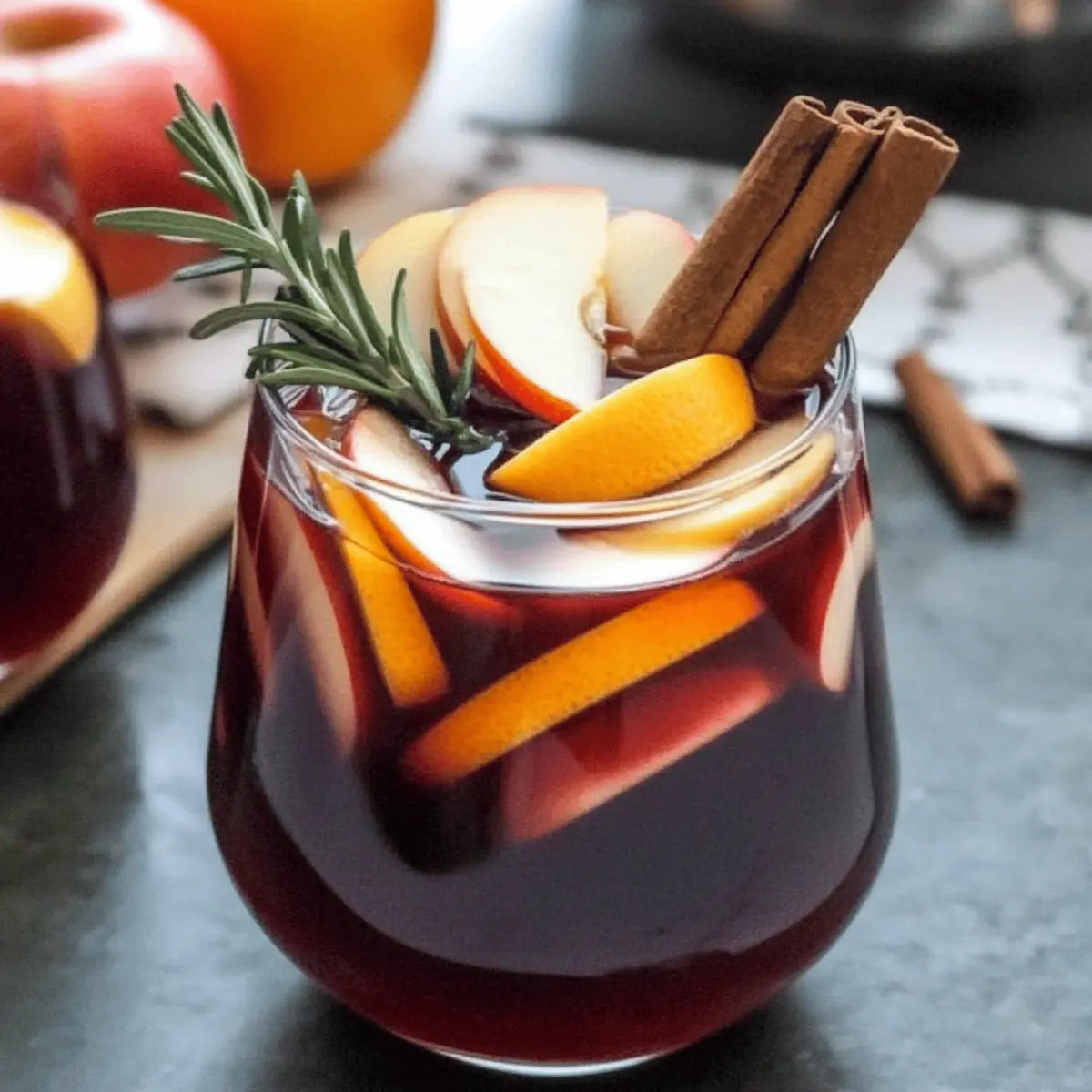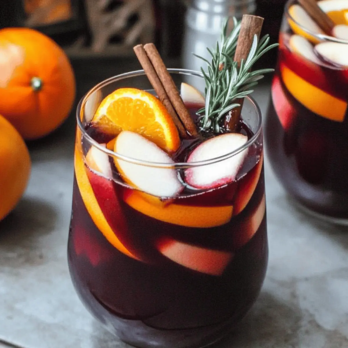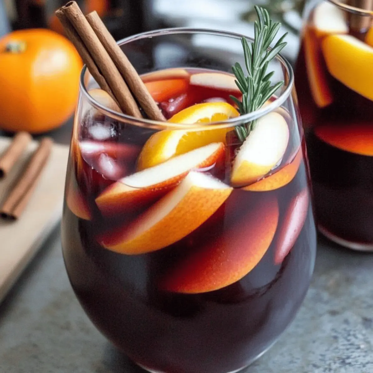 Jump to Recipe Print RecipeAs autumn leaves begin to dance with the crisp breeze, I crave warm gatherings filled with hearty laughter and shared memories. That’s where my Easy Fall Sangria with Apple Cider and Bourbon comes in. This delightful concoction marries the deep flavor of red wine with the sweetness of apple cider and a whisper of bourbon, effortlessly capturing the spirit of the season. Whether you serve it chilled for a refreshing twist or warm it as a cozy mulled drink, this sangria is sure to be a hit at your Halloween and Thanksgiving celebrations. Not only is it simple to prepare, but it also invites creativity with every pour! Who says you can’t have a little fun while sipping on a seasonal favorite? What unique twist will you add to make it your own? Why Choose This Fall Sangria? Festive and Flavorful: This Fall Sangria bursts with the warm essence of autumn, combining rich red wine with the sweet allure of apple cider and a splash of bourbon. Versatile Enjoyment: Whether served iced for a refreshing treat or hot for those chilly evenings, it adapts to your gathering’s needs. Easy Preparation: With just a few ingredients and simple steps, impress your guests without fuss. Crowd-Pleaser: Perfect for Halloween and Thanksgiving, it brings friends and family together, making each sip a shared celebration. Customizable Creativity: Feel free to experiment with fruit and spice—consider adding a hint of maple syrup or seasonal fruits to tailor each batch to your taste! Fall Sangria Ingredients Delve into the vibrant flavors of this festive drink with these delightful ingredients! For the Sangria Red Wine – Choose a dry variety to balance the sweetness of the other ingredients. Bourbon – Provides a smooth kick that enhances the richness of your Fall Sangria. Apple Cider – A must for autumn flavor! Replace with non-alcoholic apple juice for a mocktail. Apple – Thinly sliced for color and crunch; any variety will do! Orange – Freshly sliced to add a bright citrus note; always opt for juicier, fresh oranges. Cinnamon Sticks – Infusing warmth and spice that evokes the cozy essence of the season. Fresh Ginger – Adds a lovely warmth; skip it if you’re looking for a milder flavor. Fresh Rosemary – Use this fragrant herb as a garnish to elevate the drink’s presentation; optional but lovely! Step‑by‑Step Instructions for Easy Fall Sangria with Apple Cider and Bourbon Step 1: Combine Ingredients In a large glass jar or carafe, pour in a bottle of dry red wine, followed by a measuring cup of bourbon and a generous cup of apple cider. Add thinly sliced apples and oranges, ensuring the fruit is evenly distributed. Toss in a few cinnamon sticks and a couple of slices of fresh ginger for that warm spice. The mixture should be vibrant and aromatic, enticing you for the next steps. Step 2: Refrigerate to Marinate Once all the ingredients are combined, cover the jar tightly with plastic wrap or a lid. Refrigerate for at least 4 hours—ideally overnight—to allow the flavors to mingle beautifully. The sangria should take on a deep, rich color from the wine and fruits, and the scents of cinnamon and ginger will fill your kitchen as it chills. Step 3: Prepare for Serving After marinating, it’s time to prepare your glasses. Fill each glass with ice cubes, creating a refreshing base for your Easy Fall Sangria. Pour the chilled sangria over the ice, allowing the fruit slices to cascade into the glass, adding color and charm to your presentation. The drink should look inviting and cheerful, beckoning your guests to indulge. Step 4: Add a Fizzy Twist (Optional) If you prefer a sparkling finish, top each glass with a splash of seltzer before serving. This step adds delightful effervescence to the Easy Fall Sangria. Stir gently to combine, giving it a bubbly and festive touch that enhances the drink’s autumn character. The garnishes of fresh fruit and herbs will float elegantly on top. Step 5: Garnish and Serve For a polished look, reserve a few slices of apple and orange, along with extra cinnamon sticks, to garnish the glasses. If you have fresh rosemary, add a sprig to each glass for an aromatic flourish. Serve your Easy Fall Sangria immediately while it’s chilled and refreshing, or warm your prepared mix if opting for a cozy version, taking care to heat without the fruit to avoid mushiness. Expert Tips for Fall Sangria Choose the Right Wine: A dry red wine works best for your Fall Sangria, preventing it from becoming overly sweet. Avoid wines labeled as “sweet” or “fruity.” Infuse Overnight: For the best flavor, always let your sangria sit in the fridge overnight. This gives the ingredients time to meld and enhances the overall taste. Don’t Heat the Fruit: When serving warm, heat the sangria gently without the fruit to prevent it from becoming mushy. Add the fresh fruit just before serving. Adjust Sweetness: If your sangria lacks sweetness, drizzle in some maple syrup or honey to taste. This allows you to customize the flavor while maintaining that autumn vibe. Garnish Creatively: Use seasonal fruits like pears or pomegranates in your sangria; they add a lovely visual and flavor twist that echoes the fall theme. Make Ahead Options These Easy Fall Sangria drinks are perfect for busy home cooks looking to save time during the festive season! You can prepare the sangria mixture—combining the red wine, bourbon, apple cider, sliced apples, oranges, cinnamon sticks, and ginger—up to 3 days in advance. Simply cover the container tightly and refrigerate to maintain the flavors while preventing oxidation. This allows the sangria to develop a richer taste as it marinates. Just before serving, pour the sangria over ice, optionally add seltzer for a bubbly finish, and garnish with fresh fruit or rosemary. With these make-ahead options, you’ll ensure your gatherings flow smoothly, leaving you more time to enjoy with friends and family! Variations & Substitution