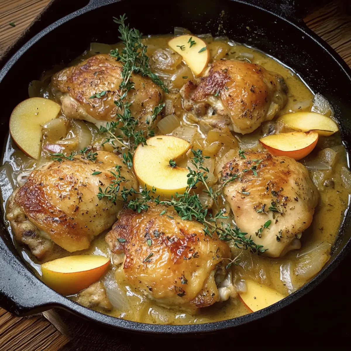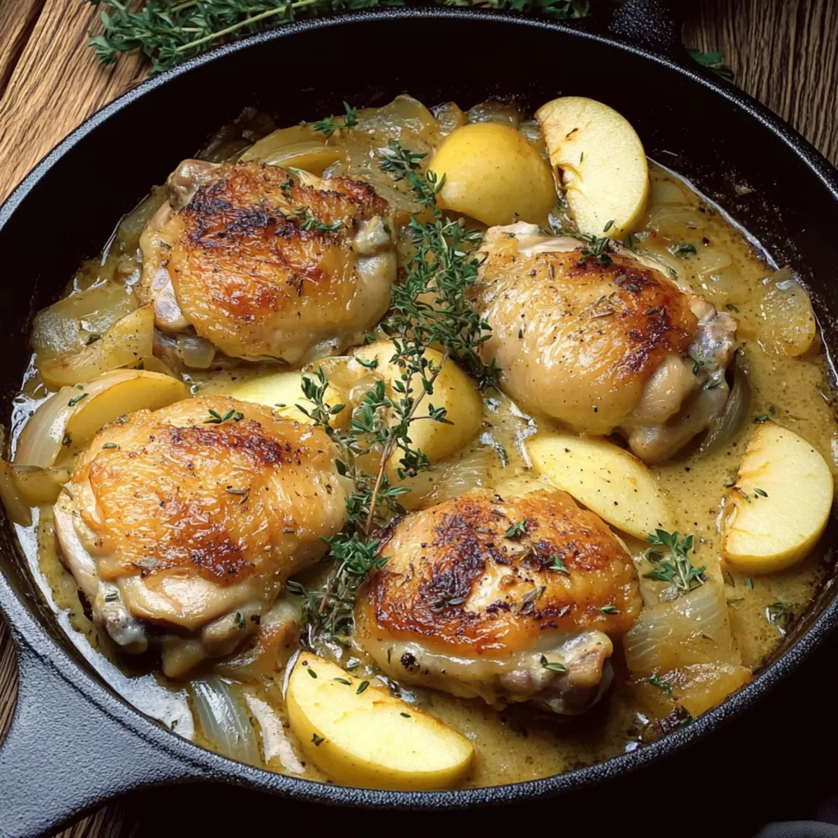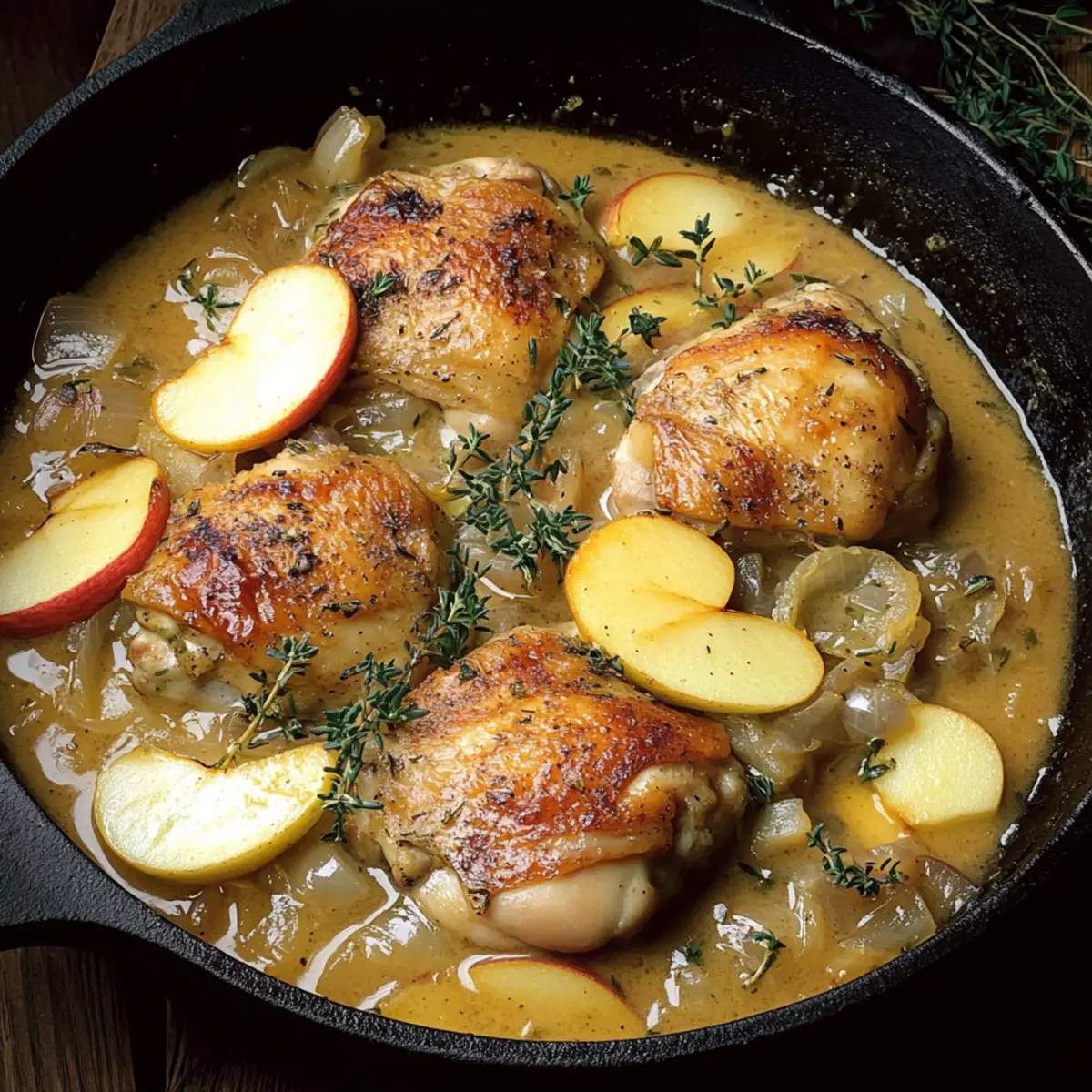 Jump to Recipe Print RecipeAs the aroma of sizzling chicken envelops my kitchen, I can’t help but feel transported to a quaint bistro in the heart of France. This recipe for French Apple Cider Chicken, also known as Chicken Normandy, is my go-to comfort food that elegantly marries savory flavors with the natural sweetness of apples. With its creamy sauce and tender chicken thighs, this dish is not only delightful to prepare but also a hit at the dinner table, making it perfect for busy weeknights or cozy gatherings. Plus, it can easily be adapted to fit gluten-free diets, ensuring everyone can enjoy a taste of France. Ready to dive into this culinary adventure? Let’s create a meal that warms both the heart and soul! Why is French Apple Cider Chicken special? Comforting Flavors: Every bite brings together savory chicken and sweet apples, offering a cozy fusion that’s hard to resist. Simple Preparation: With just a few steps and common ingredients like Cheesy Garlic Chicken, you can impress your family with minimal effort. Creamy Texture: The sauce is luscious and velvety, adding a rich element that beautifully complements the tender chicken and crispy skin. Versatile Adaptations: Whether you’re aiming for gluten-free options, like using a gluten-free broth, or considering add-ins such as carrots from your pantry, this dish is adaptable. Crowd-Pleasing Appeal: Perfect for gatherings or weeknight dinners, this recipe guarantees smiles around the table, making it a must-try! French Apple Cider Chicken Ingredients • To create this comforting masterpiece, gather the freshest ingredients for an unforgettable meal. For the Chicken Chicken Thighs – Juicy and flavorful, they stay tender throughout the cooking process. Olive Oil or Butter – Essential for frying, adding rich flavor; choose based on your palate. For the Aromatics Onion – Provides depth to the dish; if you’re short on time, shallots or green onions work well. Garlic – Adds a fragrant punch; fresh is best for a more vibrant taste. For the Sauce Apple – Use a crisp variety like Granny Smith to balance the sweetness; avoid mushy apples for texture. Apple Cider – Choose dry French apple cider for authentic flavor; apple juice with a splash of white wine can be a quick substitute. Chicken Broth – A gluten-free option can enhance your sauce and keep it savory. Dijon Mustard – Introduces a tangy element that complements the sweetness of the apples. Heavy Cream – Rich and creamy, it transforms the sauce into something luxurious; try half-and-half or plant-based cream for lighter variations. Enjoy crafting your own French Apple Cider Chicken; the combination of flavors will surely transport you and your loved ones to a cozy French bistro! Step‑by‑Step Instructions for French Apple Cider Chicken Step 1: Prep Chicken Start by seasoning the chicken thighs generously with salt and pepper on both sides, ensuring each piece is coated evenly. This enhances the flavor and helps form a savory crust when cooked. Set the seasoned chicken aside for about 10 minutes to let the flavors mingle while you prepare the pan. Step 2: Sear Chicken In a large skillet, heat 2 tablespoons of olive oil or butter over medium-high heat until shimmering. Carefully place the chicken thighs skin-side down into the hot skillet, cooking for 5-7 minutes until the skin is beautifully golden and crispy. Flip the thighs and cook for an additional 3-4 minutes. Once done, remove the chicken from the skillet and set aside on a plate. Step 3: Cook Aromatics In the same skillet, add the sliced onions and cook for about 5 minutes, stirring occasionally, until they start to caramelize and become translucent. Then, add 2 minced garlic cloves and sauté for an additional 30 seconds, allowing the fragrant aroma to fill the kitchen. This step sets the flavor foundation for your French Apple Cider Chicken. Step 4: Add Apples & Herbs Introduce thinly sliced apple pieces to the skillet along with fresh thyme and rosemary, if using. Cook everything together for 2-3 minutes until the apples soften slightly, infusing sweetness into the dish and enhancing the fragrant combination of flavors. Stir gently to combine the ingredients while keeping an eye on the heat. Step 5: Simmer Pour in 1 cup of apple cider and 1 cup of chicken broth, making sure to scrape the bottom of the skillet to release any flavorful bits. Bring the mixture to a gentle simmer, allowing the flavors to meld together. This will take about 2-3 minutes as the sauce begins to bubble slightly and reduce in volume. Step 6: Combine Chicken and Sauce Return the seared chicken thighs to the skillet, placing them skin-side up in the simmering sauce. Cover the skillet and reduce the heat to low, letting everything cook together for 25-30 minutes. This slow simmer allows the chicken to cook thoroughly and absorb the wonderful flavors of the apple cider sauce. Step 7: Finish Sauce Once the chicken is cooked through, remove the thighs and set them aside on a plate. Stir in 2 tablespoons of Dijon mustard and 1 cup of heavy cream into the sauce, mixing well to create a luscious, creamy texture. Let the sauce thicken slightly over low heat, adjusting seasoning as needed before briefly returning the chicken to warm it up. Step 8: Serve Garnish the dish with fresh thyme and parsley for a vibrant touch. Serve your delectable French Apple Cider Chicken warm alongside crusty bread, creamy mashed potatoes, or sautéed greens, allowing the rich sauce to create an unforgettable dining experience that’s sure to impress! What to Serve with French Apple Cider Chicken Transform your dinner table into a delightful feast that truly resonates with flavors and textures. Creamy Mashed Potatoes: The velvety texture of mashed potatoes perfectly absorbs the rich apple cider sauce, creating a comforting harmony in every bite. Sautéed Greens: Lightly sautéed spinach or kale adds a fresh, vibrant touch and a crunchy contrast that