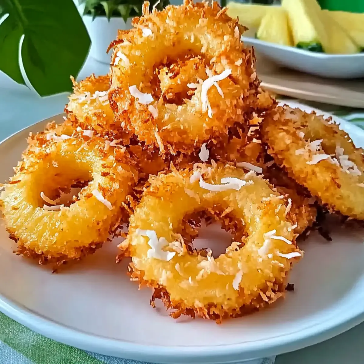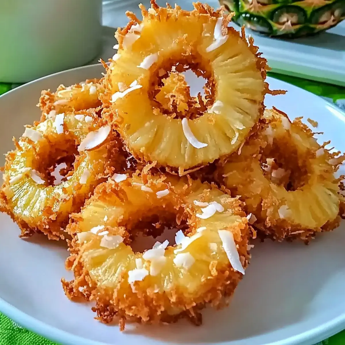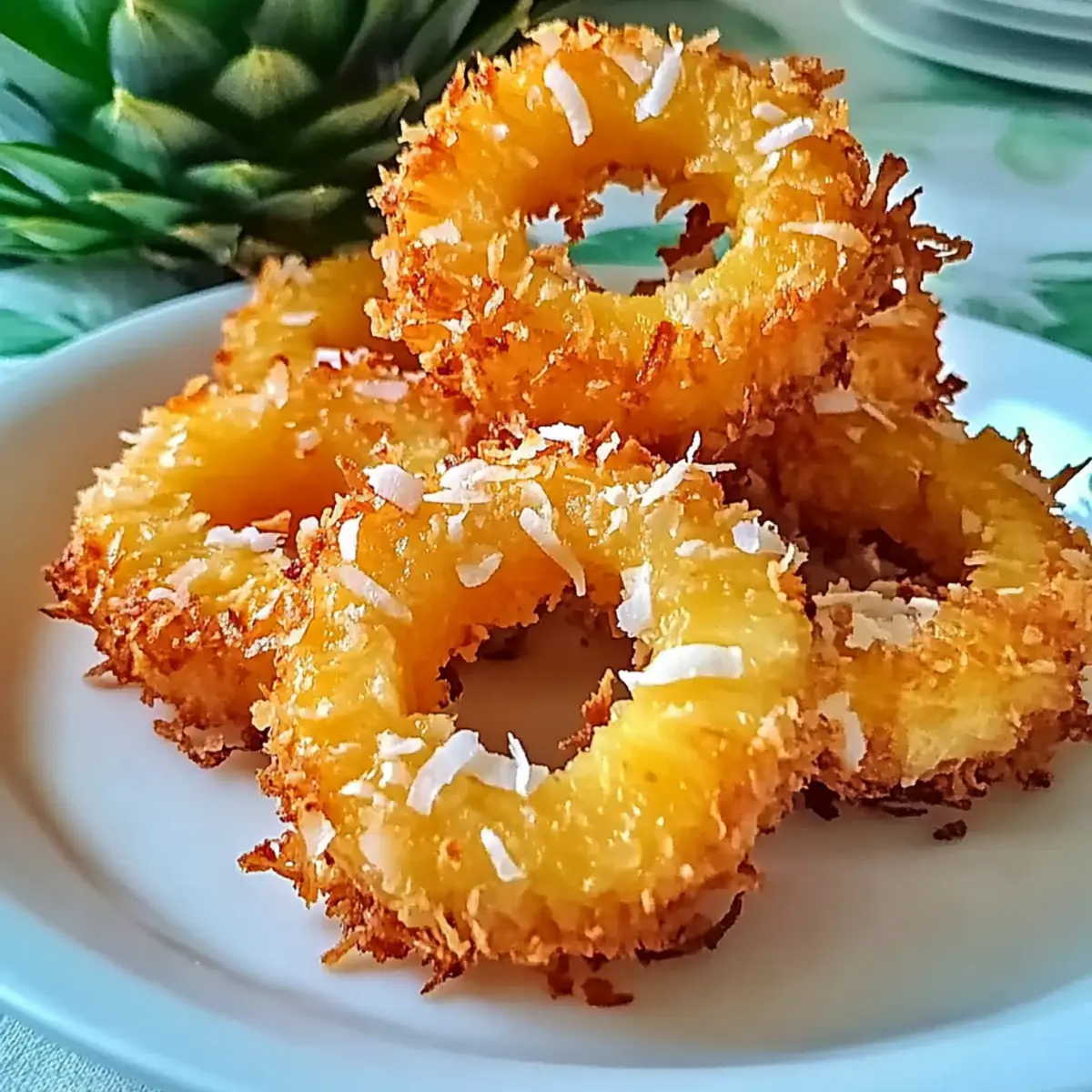 Jump to Recipe Print RecipeAs I sat on the sun-kissed balcony of a beachside shack, the sweet aroma of tropical delights wafted through the air, teasing my tastebuds. That’s when I discovered the joy of Rum-Soaked Fried Pineapple with Coconut Crust—a dessert so enchanting, it whisked me away to the Caribbean with every bite. This easy dessert effortlessly transforms fresh pineapple rings into golden, crispy treasures, enveloped in a delightful coconut coating. Not only is it a crowd-pleaser at any gathering, but it’s also a fantastic way to satisfy your sweet tooth without reaching for those fast-food temptations. Pair it with a luscious rum-infused dipping sauce, and you have a tropical escape right on your plate. Ready to dive into this heavenly treat? Let’s turn your kitchen into a tropical paradise! Why Are Fried Pineapple Rings So Irresistible? Crispy Texture: The contrast of the golden, crispy exterior with the juicy pineapple inside creates a mouthwatering experience. Tropical Flavors: Featuring rich tropical notes from rum and coconut, this dessert is like a mini-vacation for your taste buds. Easy to Make: With just a few simple steps, you can whip up these delightful treats without complicated techniques—perfect for home chefs of all skill levels. Crowd-Pleaser: Serve them at parties, and watch your guests indulge—they’ll be begging for the recipe! For a delightful pairing, consider a refreshing tropical fruit salad or a refreshing iced coconut rum cocktail. Versatile Options: Customize with warm spices or garnish with fresh mint for a personal twist, ensuring that each bite is uniquely yours! Fried Pineapple Rings Ingredients • Get ready to create a tropical delight with these essential ingredients! For the Pineapple Pineapple Rings – Fresh pineapple gives sweetness and a juicy texture; it’s best for this recipe. Dark Rum & Coconut Rum – Adds rich, tropical flavor to the pineapple; substitute with vanilla extract for a non-alcoholic alternative. For the Coating All-Purpose Flour – Forms the base coating for the pineapple; use gluten-free flour for a gluten-free version. Sweetened Coconut Flakes – Adds a crunchy coconut goodness; opt for unsweetened coconut if you prefer less sweetness. Large Eggs – Binds the flour and coating together; flax eggs (1 tbsp flaxseed meal + 2.5 tbsp water) work for a vegan option. For the Batter Coconut Milk – Enhances creaminess in the batter; regular milk is a suitable substitute if not dairy-free. For Frying Vegetable Oil – Essential for frying the rings; coconut oil can be used for added flavor. For the Dipping Sauce Cream Cheese – Forms the creamy base of the sauce; dairy-free cream cheese can replace it for a vegan version. Powdered Sugar – Sweetens the sauce; swap in agave syrup for a vegan alternative. Dive into the world of deliciously fried pineapple rings and let the tropical flavors transport you! Step‑by‑Step Instructions for Rum-Soaked Fried Pineapple with Coconut Crust Step 1: Soak the Pineapple Start by placing fresh pineapple rings in a large bowl, then cover them generously with dark and coconut rums. Let them soak for at least 1 hour, allowing the luscious flavors to infuse into the fruit. After soaking, carefully drain the pineapple and pat the rings dry with paper towels to ensure the coating sticks well. Step 2: Prepare Coating Stations Next, set up three separate bowls to create an efficient coating station. Fill the first bowl with all-purpose flour, the second with the whisked eggs mixed with coconut milk, and the third with sweetened coconut flakes. This assembly line will make it easy to coat each pineapple ring evenly and efficiently. Step 3: Coat the Pineapple Rings Begin the coating process by dipping each soaked pineapple ring first into the flour, making sure to cover it completely. Then, lift the ring and immerse it in the egg mixture for a thorough coat before finally rolling it in the coconut flakes. Ensure each ring is well covered, resulting in a delightful coconut crust for your fried pineapple rings. Step 4: Fry the Rings In a deep pot, heat vegetable oil to 350°F (175°C) to achieve that perfect frying temperature. Once the oil is ready, carefully place the coated pineapple rings into the pot in batches. Fry them for about 1 minute on each side until they are golden brown and crispy. Use a slotted spoon to transfer the rings to paper towels, letting them drain excess oil. Step 5: Make Dipping Sauce For the creamy dipping sauce, mix softened cream cheese and powdered sugar in a medium bowl until smooth and well combined. Gradually stir in the reserved rum from soaking the pineapple until the sauce reaches your desired consistency, ensuring a luscious contrast to the crispy pineapple rings that will elevate your tropical dessert experience. Fried Pineapple Rings Variations Feel free to explore these delightful variations and make this tropical treat your very own! Spiced Up: Add a pinch of cinnamon or nutmeg to the flour for a warm, aromatic twist that complements the pineapple beautifully. Nutty Crunch: Mix in chopped almonds or pecans with the coconut flakes for an extra layer of crunch and nutty flavor. Low-Carb Delight: Substitute all-purpose flour with almond flour for a healthier, low-carb option that still delivers on flavor. Vegan Version: Replace eggs with flax eggs and use dairy-free cream cheese for a vegan-friendly delight that everyone will love! Boozy Twist: Replace some of the rum in the soaking mixture with coconut cream for a creamier, richer tropical experience. Sweet & Zesty: Drizzle a lime or lemon glaze over the fried rings for a refreshing tang that balances the sweet flavors perfectly. Fruit Medley: Serve the fried pineapple rings with a variety of other fried fruits, like bananas or mango, to create a vibrant tropical platter. Sauce Variations: Swap the cream cheese dipping sauce for a coconut yogurt dip that stays true to the tropical theme with a