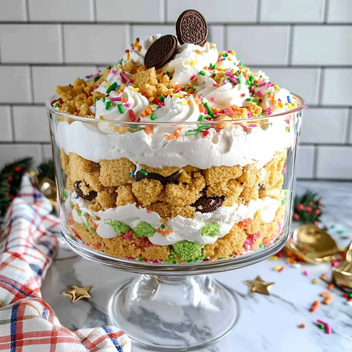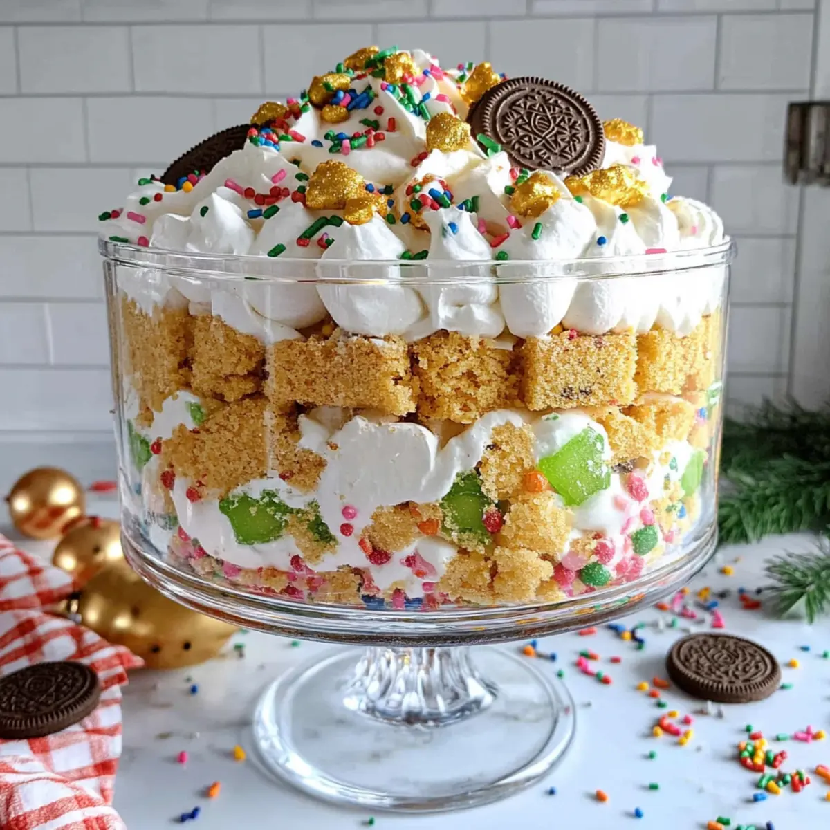 Christmas lights twinkling in the background and the scent of holiday treats wafting through the house capture the essence of the season. As I prepared for our annual festive gathering, I knew I had to bring something fun and vibrant for everyone to enjoy. Enter the Funfetti Golden Oreo Trifle—a layered spectacle that marries homemade vanilla funfetti cake, light whipped cream, and the crunch of crushed Golden Oreos. This no-bake dessert is not just a feast for the eyes but also quick to prepare, making it the perfect crowd-pleaser. With its festive colors and delightful flavors, this trifle will effortlessly elevate your celebrations. How can you resist digging into such a joyful creation?