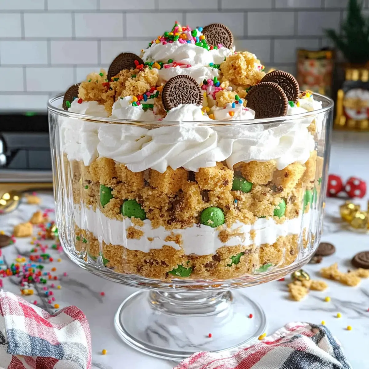 Finish your trifle by topping it with remaining sprinkles and a few whole Golden Oreos for a festive touch. Cover the trifle with plastic wrap and refrigerate for at least 2 hours, allowing the flavors to meld and the whipped cream to firm up, ensuring it’s ready to impress your guests!