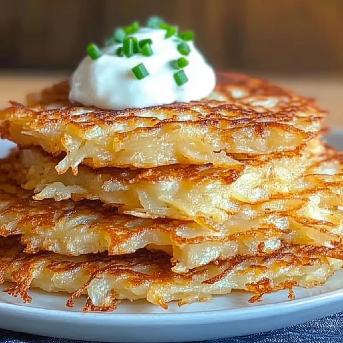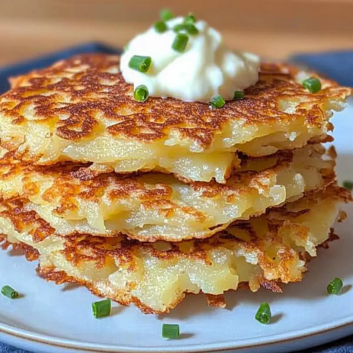 Jump to Recipe Print RecipeAs the golden rays of late afternoon sun filter through my kitchen window, the savory aroma of sizzling potato pancakes makes my heart flutter. These German Potato Pancakes, or Reibekuchen, are a vibrant homage to comfort food that never fails to brighten my day. With a crispy exterior that gives way to a tender and fluffy center, they are incredibly easy to make—perfect for those evenings when you’re craving something warm and hearty. Whether you enjoy them sweetened with a dollop of apple sauce or indulged with a tangy garlic sauce, these delightful pancakes are sure to satisfy any appetite. Plus, they’re versatile enough to accommodate a variety of tastes! Are you ready to discover how to whip up these delicious German treasures in your own kitchen? Why are German Potato Pancakes so beloved? Simplicity, these crispy delights come together with minimal fuss, using common ingredients you probably have on hand. Versatile options allow you to enjoy them sweet or savory, catering to any craving. Crowd-pleaser appeal ensures they make a fantastic addition to family dinners or potlucks. Comforting warmth infused in each pancake is perfect for chilly nights, and those fluffy interiors will surely warm your heart. You might also enjoy pairing them with Kielbasa Potato Soup or Sausage Sweet Potatoes for a complete cozy meal! German Potato Pancake Ingredients Discover the essential ingredients for making delicious German Potato Pancakes! For the Batter Potatoes – Use starchy potatoes for the ideal crispy exterior and fluffy center. Onion – Adds moisture and flavor; finely chop if grating is challenging. Salt – Enhances the overall taste; adjust to your preference. Pepper – Optional for a hint of spice in savory versions. Flour – Binds the pancake mixture together; potato starch can be used for gluten-free options. Egg – Serves as a binder for structure; replace with potato starch for a vegan alternative. For Frying Oil for Frying – Essential for achieving that perfect golden-brown crisp; use a neutral oil or traditional lard for authentic flavor. Now that you have your ingredient list ready, let’s get cooking and bring the comforting taste of German Potato Pancakes to your table! Step‑by‑Step Instructions for German Potato Pancakes Step 1: Prepare the Vegetables Start by washing, peeling, and grating about 4 medium-sized starchy potatoes and 1 medium onion into a large mixing bowl. Make sure to squeeze out any excess moisture from the grated mixture to prevent sogginess. This step is crucial for achieving the desired crispy texture in your German Potato Pancakes. Step 2: Create the Batter In the same bowl, combine the grated potatoes and onion with 1 teaspoon of salt, a dash of pepper if desired, 1/4 cup of flour, and 1 beaten egg. Mix everything together until a cohesive batter forms. The egg will bind the ingredients, ensuring your pancakes hold their shape while cooking, so take your time to blend well. Step 3: Heat the Oil Now, heat about 1/4 inch of oil in a large skillet over medium-high heat. You can test the temperature by dropping a small spoonful of batter into the oil; it should sizzle immediately. Once the oil is hot enough, prepare for frying your German Potato Pancakes—this is key to achieving that golden-brown exterior! Step 4: Fry the Pancakes Carefully drop 2 tablespoons of the batter into the skillet for each pancake, spacing them about 2 inches apart. Cook for approximately 3-4 minutes on one side, or until they turn a beautiful golden brown. Flip them gently using a spatula, and let them cook for another 3-4 minutes until both sides are crispy and golden brown. Step 5: Drain and Keep Warm Once cooked, remove the pancakes from the skillet and place them on a plate lined with paper towels to drain excess oil. If needed, keep them warm in a preheated oven at 200°F (93°C). This will ensure that your German Potato Pancakes stay nice and toasty while you finish frying the rest of the batter. Step 6: Serve and Enjoy Serve your crispy German Potato Pancakes immediately, pairing them with your favorite toppings. Options like apple sauce for a sweet touch or sour cream and chives for a savory experience complement these delightful pancakes perfectly. Enjoy the warm, comforting flavors of this classic dish with family and friends! German Potato Pancakes Variations & Substitutions Feel free to get creative with your German Potato Pancakes by trying out these fun twists and swaps to suit your taste! Herb-Infused: Mix in fresh herbs like chives or dill for a fragrant touch. Herbs will uplift the pancake flavor and resonate with fresh ingredients! Veggie Boost: Substitute shredded vegetables like zucchini or carrot to add a colorful twist. This not only enhances nutrition but also offers a delightful texture that surprises the palate. Leftover Mash: Use leftover mashed potatoes instead of raw; they’ll create a softer, fluffier pancake. This is perfect for transforming yesterday’s dinner into today’s scrumptious treat! Cheesy Delight: Incorporate shredded cheese into the batter for a rich, cheesy flavor. Imagine the gooey goodness melting in each crispy bite, taking your pancakes to another savory level. Spicy Kick: Add chopped jalapeños or crushed red pepper flakes for a spicy version. This is perfect for those who crave a little heat and an exciting infusion of flavor! Gluten-Free: Replace regular flour with potato starch for a gluten-free option. This ensures you won’t miss out on that crispy crunch while accommodating dietary needs. Sweet Twist: For a dessert-style pancake, mix in a bit of cinnamon and sugar. These are especially delightful when served with fresh fruit or a drizzle of honey! Plant-Based: Omit the egg and replace it with an additional tablespoon of potato starch for a vegan version that still holds together beautifully. You won’t even miss the egg! No matter how you choose to customize these German Potato