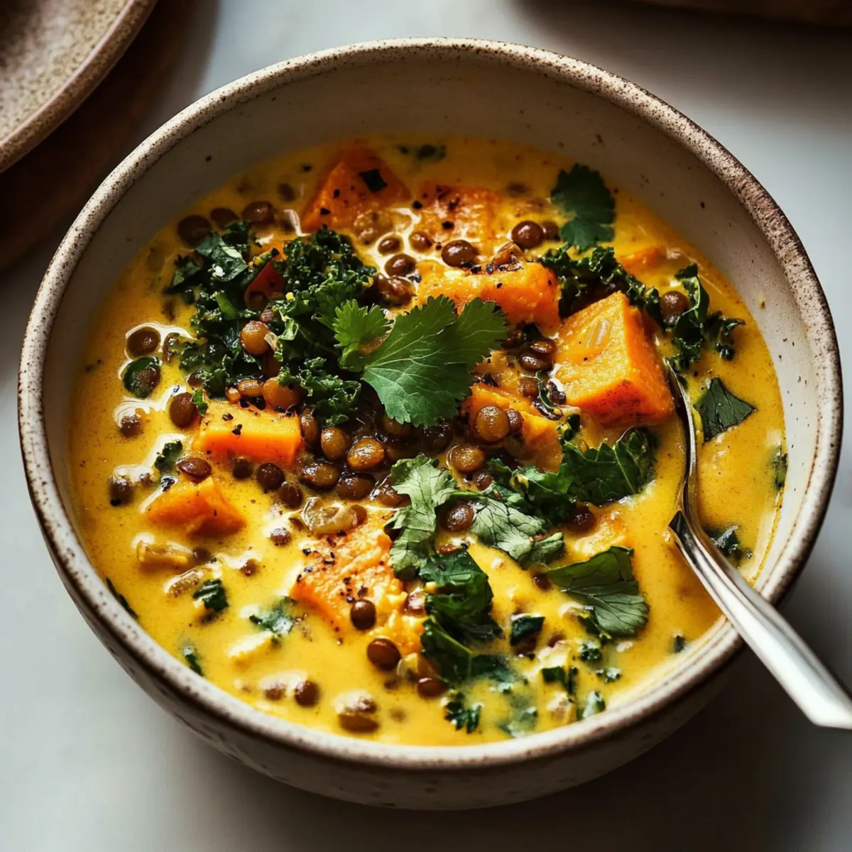 Ginger Sweet Potato Coconut Milk Stew with Lentils & Kale