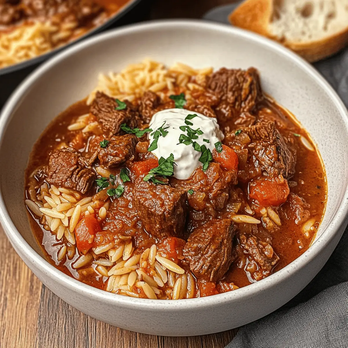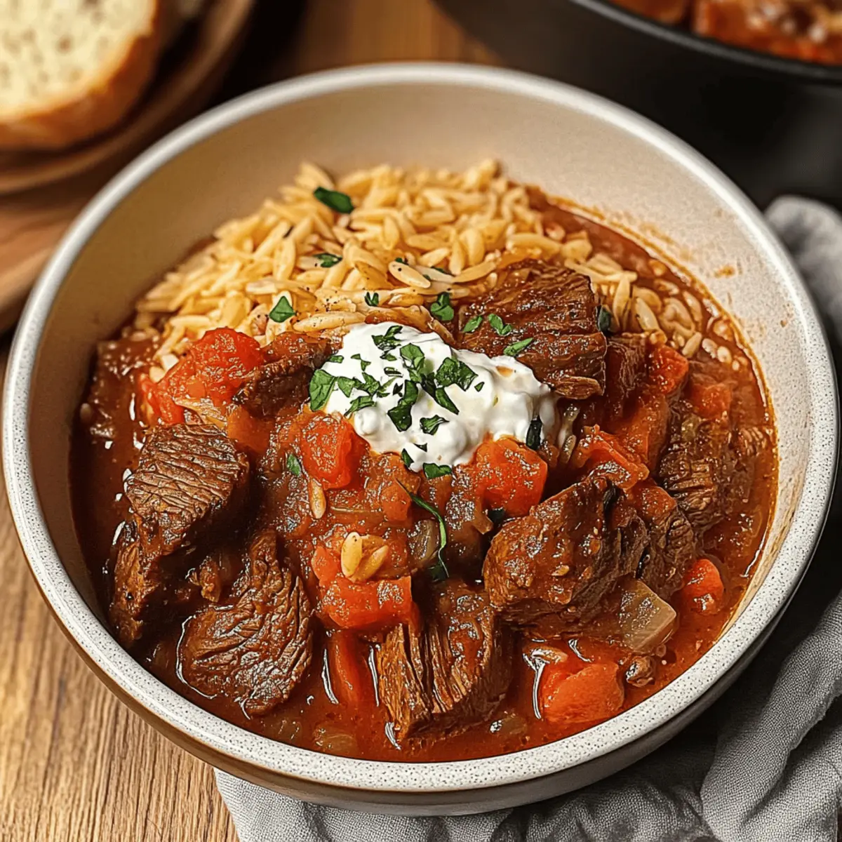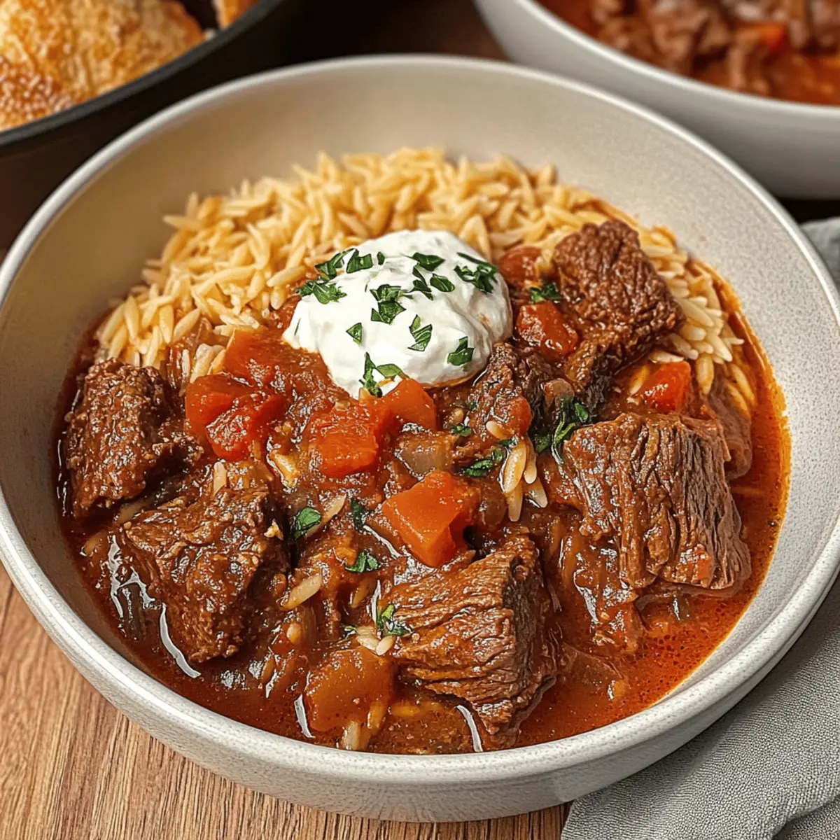 Jump to Recipe Print RecipeThere’s something magical about the way a simmering pot of Giouvetsi Greek Beef Stew can transform a chilly evening into a cozy family gathering. As I watched the tender beef slowly braise in a rich tomato sauce, the aroma filled the kitchen, creating an irresistible invitation for everyone to come together. This hearty stew merges savory beef with delightful orzo pasta, making it a perfect comfort food that satisfies even the most discerning palates. It’s not just easy to prepare; it also brings warm, nourishing flavors that wrap around you like a soft blanket. Whether you’re entertaining loved ones or simply treating yourself, Giouvetsi offers a culinary hug that makes any meal feel special. Are you ready to dive into this Mediterranean treasure? Why is Giouvetsi Greek Beef Stew a Must-Try? Comforting and warming, Giouvetsi Greek Beef Stew embodies everything we love about home-cooked meals. Hearty flavors meld together in this rich dish, making it the ultimate comfort food. Versatile enough for family gatherings or cozy nights at home, you can customize it with seasonal vegetables or different proteins. Time-saving yet satisfying, this stew simmers slowly to develop rich flavors without requiring constant attention. Serve it alongside crusty bread and a fresh salad for a complete meal that everyone will remember. If you enjoy delicious, hearty meals, don’t miss out on this Giouvetsi wonder! Giouvetsi Greek Beef Stew Ingredients • Perfect for your next family gathering or chilly night, this heartwarming stew blends flavors beautifully. For the Stew Beef Chuck Roast – Main protein, providing a tender texture after slow cooking; brisket works as a great substitute. Canned Whole Peeled Tomatoes – Adds acidity and sweetness, forming the base flavor; fresh tomatoes can be used, though canned are more convenient. Yellow Onion – Enhances the overall flavor profile; consider using sweet onions for a milder bite. Garlic – Adds depth and savoriness; roasted garlic can substitute for a sweeter touch. Dry Red Wine – Elevates acidity and richness, enhancing flavor complexity; non-alcoholic varieties can be used for a similar zest. Extra Virgin Olive Oil – Richness enhancer for a smoother stew; vegetable oil is a suitable replacement if needed. Dried Oregano – Essential for that distinct Mediterranean flavor; fresh oregano can substitute, using more for a potent taste. Bay Leaf – Infuses subtle flavors during cooking; be sure to remove it before serving for a milder experience. Salt and Pepper – Crucial for balancing flavors; adjust based on personal preference for optimal taste. Beef Broth – Adds savory depth to the stew; vegetable broth is a lighter alternative that still delivers flavor. For the Orzo Orzo Pasta – The heart of this stew, adding chewiness and richness; rice can be used as a gluten-free substitute. Embrace the warm and inviting essence of Giouvetsi Greek Beef Stew with these ingredients, and let the comforting aromas fill your kitchen! Step‑by‑Step Instructions for Giouvetsi Greek Beef Stew Step 1: Sear the Beef Heat a large pot over medium-high heat and add a generous drizzle of extra virgin olive oil. Once the oil shimmers, add chunks of beef chuck roast and sear them until they are golden brown on all sides, about 8-10 minutes. This step enhances the flavor of your Giouvetsi Greek Beef Stew, so ensure each piece is nicely browned. Step 2: Sauté Aromatics Remove the browned beef and set it aside. In the same pot, add chopped yellow onion and minced garlic, sautéing them for about 3-4 minutes until the onions turn translucent and fragrant. This aromatic base adds depth and richness to your stew, making every bite flavorful. Step 3: Incorporate Tomatoes and Wine Pour in a can of whole peeled tomatoes and a cup of dry red wine. Stir well while scraping the browned bits from the bottom of the pot to create a robust flavor. Cook this mixture for about 5 minutes, allowing it to reduce slightly and let the vibrant aromas of your Giouvetsi Greek Beef Stew fill the kitchen. Step 4: Add Broth and Seasonings Return the seared beef to the pot, then pour in beef broth to cover the mixture. Add dried oregano, and a bay leaf for added flavor. Bring the stew to a gentle simmer, then reduce the heat to low and cover. Let it simmer for about 90 minutes, stirring occasionally, until the beef is tender and flavorful. Step 5: Stir in the Orzo During the last 10 minutes of cooking, stir in the orzo pasta, ensuring it is well-mixed into the stew. Continue to simmer, allowing the orzo to cook until al dente and absorb some of the rich flavors of the Giouvetsi Greek Beef Stew. This final touch transforms the dish into a comforting, hearty meal. Step 6: Adjust Seasoning and Serve Once the orzo is cooked, taste your Giouvetsi Greek Beef Stew and adjust the seasoning with salt and pepper as needed. Serve hot in bowls, garnished with fresh herbs if desired, along with crusty bread to soak up that delicious sauce. This stew is sure to warm your heart and home. Make Ahead Options Giouvetsi Greek Beef Stew is perfect for meal prep, saving you valuable time during busy weeknights! You can fully prepare the stew up to 3 days in advance; simply refrigerate it in an airtight container. To maintain optimal flavor, allow it to cool completely before sealing. When you’re ready to enjoy, gently reheat the Giouvetsi on the stove, adding a splash of beef broth to prevent it from drying out. Alternatively, you can prep the beef and sautéed aromatics ahead of time, storing them in the refrigerator for up to 24 hours. Just combine them with tomatoes, broth, and orzo when you’re ready to cook, ensuring a delicious meal awaits with minimal effort. How to Store and Freeze Giouvetsi Greek Beef Stew Fridge: Store leftovers in an airtight container for up to 3 days. This Giouvetsi Greek Beef Stew flavors deepen after a day in the fridge, making it even more deli