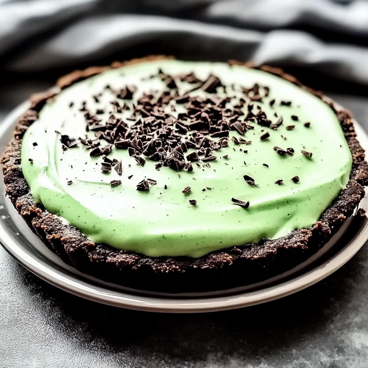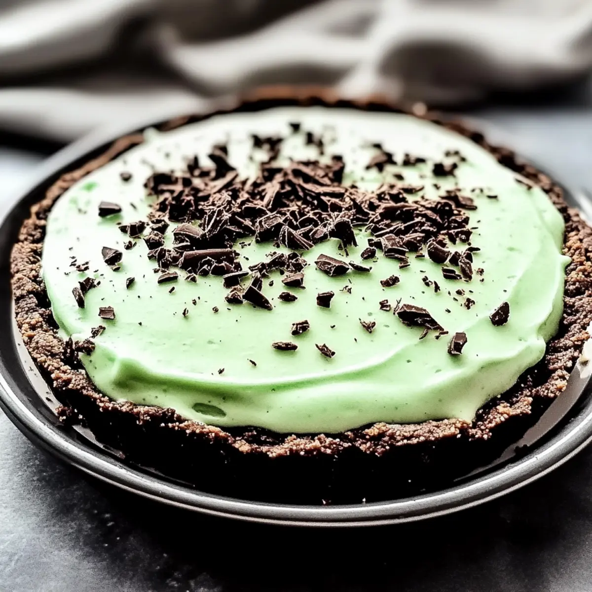 Jump to Recipe Print RecipeThe first time I indulged in Grasshopper Pie, I was blown away by the whimsical combination of flavors that came together in such a delightful dessert. This no-bake treat features a luscious mint mousse filling nestled in a rich chocolate cookie crust, making it an instant favorite for anyone who loves a good dessert! Not only is this recipe a breeze to whip up—ideal for those moments when you crave something sweet—but it also accommodates a range of dietary needs, with easy-to-find substitutions for a dairy-free version. Perfect for gatherings or simply satisfying a sweet tooth, this pie brings joy in every slice. Are you ready to discover the magic of making your very own Grasshopper Pie? Why is Grasshopper Pie a Must-Try? Irresistible Flavors: The classic combination of mint and chocolate in this pie will transport you to dessert paradise with every bite. No-Bake Convenience: This recipe is perfect for busy cooks—it requires no oven and minimal effort, allowing you to create a stunning dessert effortlessly. Kid-Friendly Delight: Your little ones will love the fun flavors and bright colors; it’s a fantastic way to introduce them to homemade treats! Dietary Flexibility: Easily adapt to dairy-free or halal needs with simple swaps, making it a versatile choice for any gathering. Enjoy your slice with a drizzling of chocolate sauce or a sprig of fresh mint for that extra touch. Whether it’s a summer BBQ or a cozy family night, this Grasshopper Pie is sure to be a hit! Grasshopper Pie Ingredients • Get ready to make the perfect Grasshopper Pie with these simple ingredients! For the Chocolate Cookie Crust Chocolate Cookies – Choose store-bought for convenience or make your own for a custom flavor. Butter – Melted butter helps bind the crust together, adding richness. For the Mint Mousse Filling Cream Cheese – This is essential for creaminess; make sure it’s softened to mix easily. Heavy Cream – Whip this cold for a light texture that effortlessly lifts the mousse. Peppermint Extract – Provides the signature mint flavor; feel free to substitute with mint or spearmint extract if needed. Green Food Coloring – Adds a fun visual element; it’s optional if you prefer a natural look. Now that you have all the ingredients ready, let’s get started on creating this delightful Grasshopper Pie! Step‑by‑Step Instructions for Grasshopper Pie Step 1: Make the Chocolate Cookie Crust Begin by crushing chocolate cookies in a food processor or placing them in a zip-top bag and using a rolling pin, until you achieve fine crumbs. Combine the crumbs with melted butter in a mixing bowl, stirring until fully coated. Press this mixture firmly into the bottom and up the sides of a 9-inch pie dish to form a sturdy crust. Set aside while you prepare the filling. Step 2: Prepare the Mint Mousse Filling In a large mixing bowl, beat the softened cream cheese with an electric mixer on medium speed until creamy and smooth, approximately 2 minutes. Gradually add sugar and peppermint extract, continuing to mix until fully incorporated. The blend should be fluffy and free of lumps, creating a delightful base for your Grasshopper Pie’s filling. Step 3: Whip the Heavy Cream In a separate chilled bowl, pour the (very cold) heavy cream and whip at high speed until stiff peaks form, which should take about 3 to 5 minutes. Ensure the cream is cold for optimal texture and easier whipping. This whipped cream will contribute to the light and airy texture of the mint mousse filling, so keep it close at hand for the next step. Step 4: Combine the Two Mixtures Gently fold the whipped cream into the cream cheese mixture using a spatula, taking care to maintain airiness. This process should be done slowly to avoid deflating the whipped cream. If desired, add a few drops of green food coloring during this step to achieve a lovely minty hue. Continue folding until the mixture is well combined and smooth, showcasing the perfect minty mousse consistency. Step 5: Fill the Crust with Mint Mousse Carefully pour the mint mousse filling into the prepared chocolate cookie crust, using a spatula to spread it evenly, ensuring a smooth top. Tap the pie dish gently on the counter to eliminate any air bubbles that may have formed. This step will help create a flawless presentation for your Grasshopper Pie, inviting everyone to indulge in its refreshing flavors. Step 6: Chill the Pie Cover the pie with plastic wrap or aluminum foil and place it in the refrigerator for at least 4 hours, or until set. For a firmer texture, you can also freeze the pie for 2 hours. This chilling time is crucial as it allows the filling to firm up, resulting in a delightful sliceable consistency that’s perfect for serving. Step 7: Serve and Garnish Once set, remove the Grasshopper Pie from the refrigerator and slice it into wedges. For an extra touch, top each slice with a dollop of whipped cream and a sprinkle of shaved chocolate or fresh mint leaves. Serve chilled, and watch as your guests delight in this beautiful, no-bake dessert that perfectly balances rich chocolate and refreshing mint flavors! Make Ahead Options These Grasshopper Pie treats are perfect for meal prep, allowing you to satisfy your sweet tooth ahead of time! You can prepare the chocolate cookie crust up to 24 hours before assembling the pie; simply store it in an airtight container at room temperature to keep it fresh. The mint mousse filling can be made up to 3 days in advance and stored in the refrigerator in a sealed container. To maintain the fluffiness of the mousse, avoid folding in the whipped cream too early; instead, prepare it fresh when you’re ready to assemble. When ready to enjoy, simply pour the filling into the prepped crust, chill for at least 4 hours (or 2 hours if frozen), and you’ll have a delightful dessert with minimal effort! Expert Tips for Grasshopper Pie Softened Cream Cheese: Ensure the cream cheese is at room temp