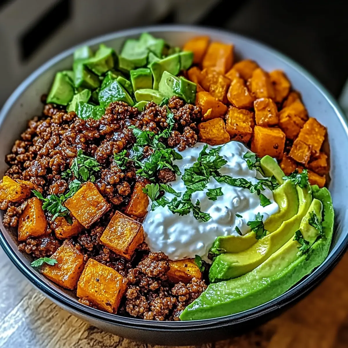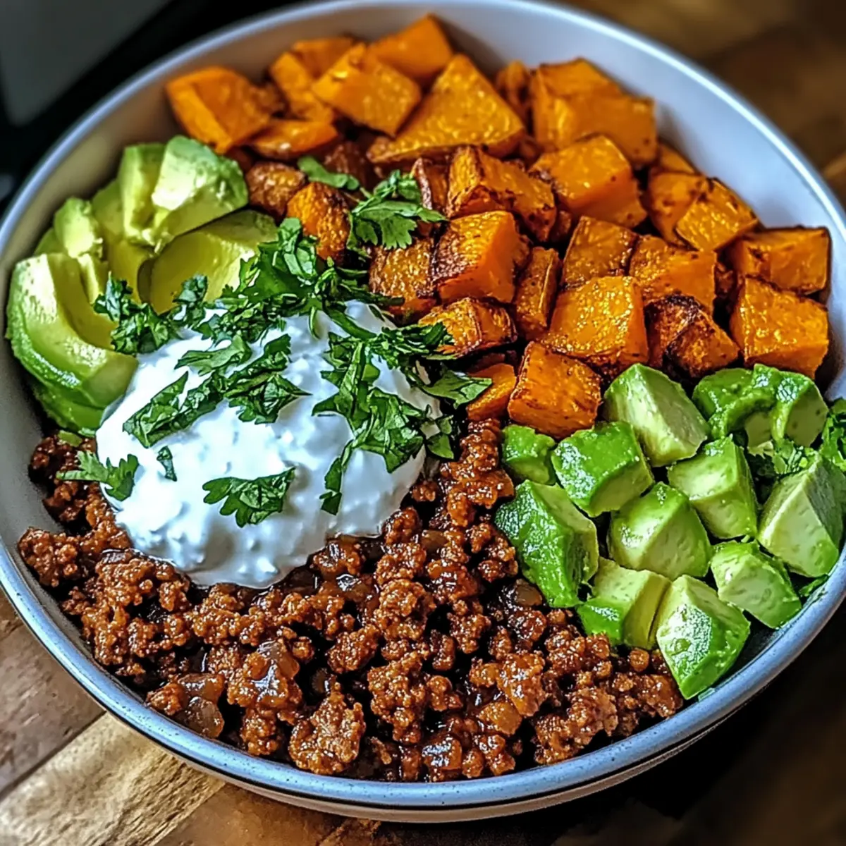 A comforting and nutritious Ground Beef Hot Honey Bowl combining flavorful beef, sweet potatoes, and customizable toppings.