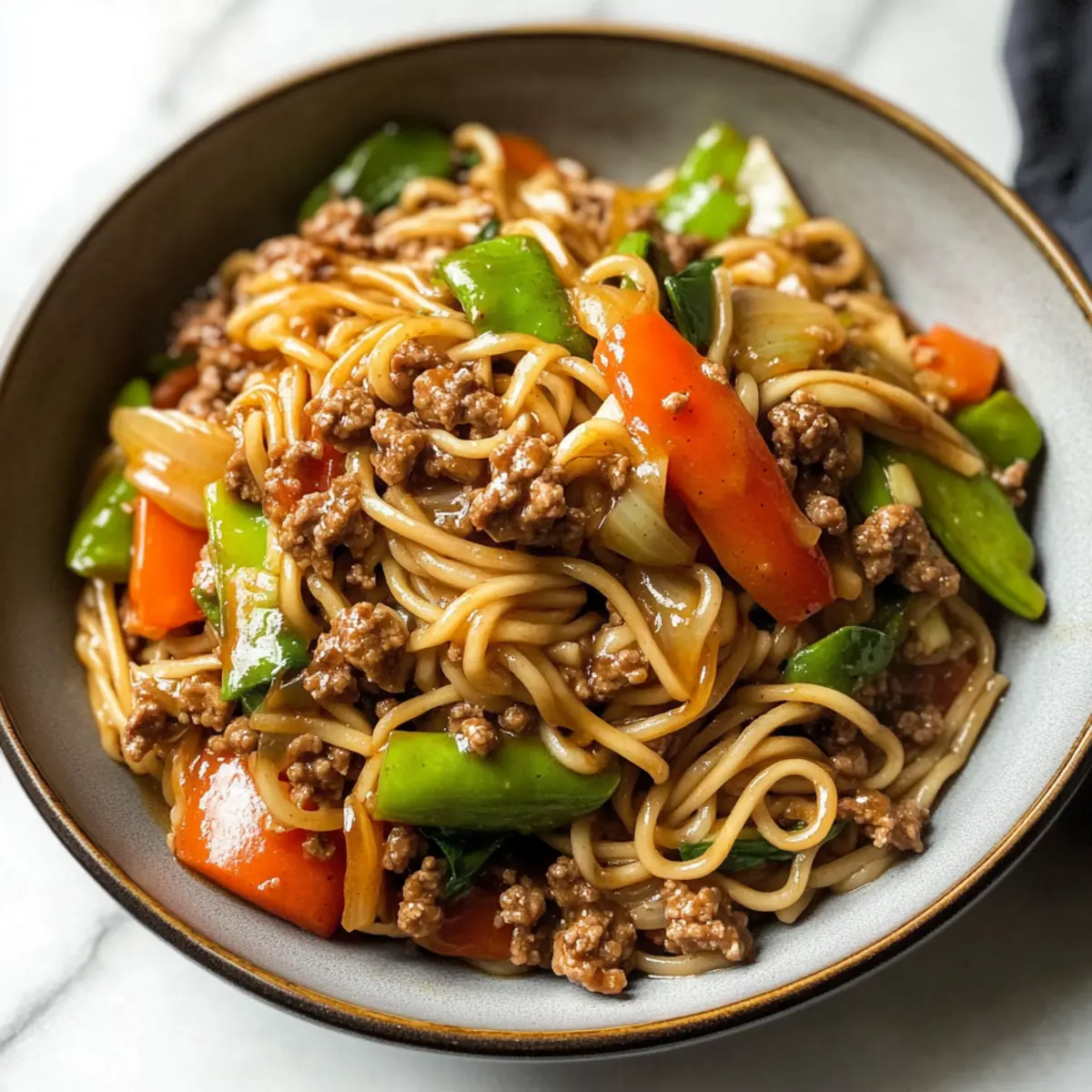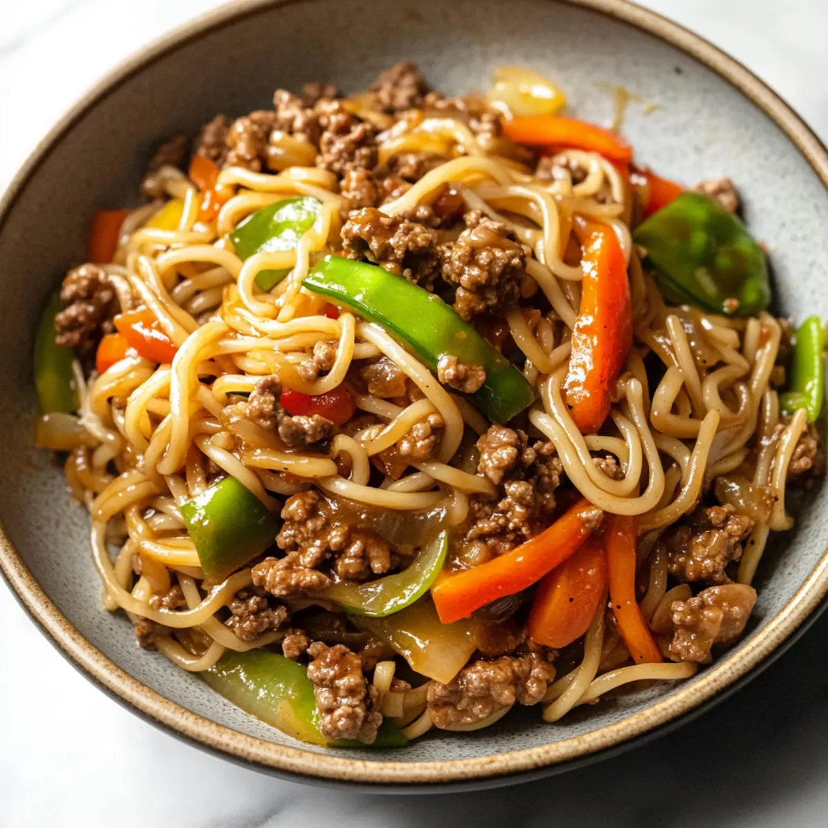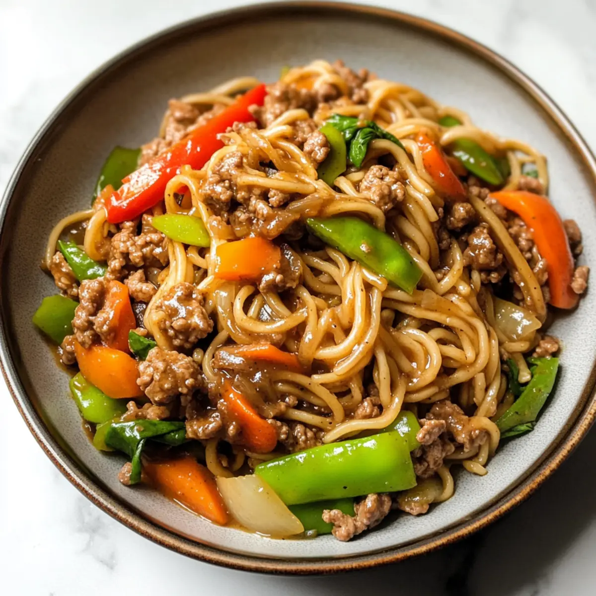 Jump to Recipe Print RecipeAs I stirred the sizzling vegetables in my skillet, the mouthwatering aroma wafted through my kitchen, instantly transporting me to my favorite Chinese takeout spot. This recipe for Ground Beef Lo Mein has become my go-to for when I crave a comforting, savory-sweet dish made from simple pantry staples. In just 30 minutes, you can whip up a delightful meal that combines tender-crisp veggies and juicy ground beef, making it not only quick and easy but also hearty and satisfying. Whether you’re feeding your family or enjoying a cozy night in, this lo mein stands ready to rescue you from the fast food routine. What’s your favorite ingredient to toss into a stir-fry? What makes ground beef lo mein special? Quick and Easy: This dish comes together in just 30 minutes, perfect for busy weeknights when you crave a comforting meal without a long cooking time. Savory-Sweet Flavor: The addictive sauce harmonizes pantry staples, delivering that beloved Chinese takeout taste right in your kitchen. Vegetable-Packed: Loaded with vibrant veggies, this lo mein doesn’t just satisfy your cravings; it packs a nutritious punch, making it a smart choice for family dinners. Versatile Ingredients: Feel free to play around with proteins and veggies—whether it’s swapping ground beef for ground turkey or adding extra seasonal favorites like bok choy or carrots, the options are endless. Crowd-Pleasing Comfort Food: Ideal for meals with family or friends, this recipe is sure to impress everyone with its rich flavors and delightful textures. For more comforting ground beef recipes, check out the amazing Ground Beef Lettuce or delicious Nachos With Ground Beef. Ground Beef Lo Mein Ingredients For the Noodles • Lo Mein Noodles – Serves as the foundation of the dish; can be swapped with spaghetti, linguine, or ramen noodles if needed. For the Beef and Vegetables • Lean Ground Beef – Provides richness and a satisfying texture; ground turkey or chicken can offer a lighter option. • Olive Oil – Used for sautéing; feel free to substitute with canola or vegetable oil. • Onion – Adds sweetness and depth to the dish; shallots or green onions work well as alternatives. • Red Bell Pepper – Brings sweetness and vibrant color; green or yellow bell peppers can be used for something different. • Mushrooms (Cremini) – Contributes umami flavors; white mushrooms may be substituted or omitted. • Snow Peas or Sugar Snap Peas – Offers crunch and freshness; broccoli can also work as a substitute. • Salt & Pepper – Essential for seasoning; adjust to grab the perfect flavor balance. • Chopped Scallions (Optional) – Adds a fresh touch and vibrant color for garnish; omit if unavailable. For the Savory Sauce • Beef Broth or Water – Forms the sauce’s liquid base; vegetable broth ensures a vegetarian-friendly option. • Hoisin Sauce – Infuses sweetness and richness; use tamari for a gluten-free alternative. • Low Sodium Soy Sauce – Provides umami flavor; coconut aminos is a great substitute for a soy-free version. • Sriracha Sauce – Adds a delightful kick; reduce or omit for a milder flavor profile. • Apple Cider Vinegar or Rice Vinegar – Brings balance with acidity; both can be interchanged effortlessly. • Brown Sugar – Sweetens the sauce to perfection; feel free to swap with honey or maple syrup. • Cornstarch – Helps thicken the sauce; arrowroot powder offers a gluten-free substitute. • Fresh Ginger – Adds fragrant warmth to the dish; ground ginger can be an alternative in a pinch. • Garlic – Provides aromatic depth; garlic powder works as an alternative if fresh garlic isn’t available. With these Ground Beef Lo Mein ingredients, you’re not just creating a meal; you’re crafting comfort in a bowl! Step‑by‑Step Instructions for Ground Beef Lo Mein Step 1: Prepare Ingredients Start by chopping all your vegetables into bite-sized pieces—thinly slice the onion, bell pepper, and mushrooms while trimming the ends off the snow peas. Measure out the sauce ingredients like hoisin, soy sauce, and garlic to have everything ready. This step is key for making your Ground Beef Lo Mein quickly, as stir-frying happens fast! Step 2: Cook Noodles Bring a large pot of salted water to a boil over high heat. Once boiling, add your lo mein noodles and cook according to package instructions, usually around 4-5 minutes, until al dente. When done, drain the noodles and set aside, ensuring you keep them warm while preparing the rest of the dish. Step 3: Brown the Beef In a large skillet or wok, heat a drizzle of oil over medium-high heat. Add the lean ground beef and sauté for about 8-10 minutes, breaking it apart with a spatula until nicely browned and fully cooked. Drain any excess fat from the pan to keep your Ground Beef Lo Mein light and tasty. Step 4: Sauté Onions Add a tablespoon of olive oil to the same skillet and toss in the chopped onion. Sauté for 1-2 minutes until the onions become translucent and fragrant, creating a wonderful aromatic base for your dish. This will enhance the flavors of your Ground Beef Lo Mein, making it truly comforting. Step 5: Add Remaining Veggies Stir in the red bell pepper, mushrooms, and snow peas into the skillet with the onions. Sauté everything together for about 3-4 minutes until the vegetables are tender-crisp and vibrant in color. The harmonious blend of textures and colors sets the stage for your delicious Ground Beef Lo Mein. Step 6: Combine Beef and Sauce Return the browned ground beef back to the skillet, stirring everything together. Pour in the prepared sauce mixture, allowing it to coat all the ingredients evenly. Let it simmer for about 30 seconds, so the flavors meld beautifully, enhancing your Ground Beef Lo Mein’s richness. Step 7: Toss in Noodles Remove the skillet from heat and carefully add the cooked lo mein noodles into the mixture. Toss everything together well, ensuring that each no