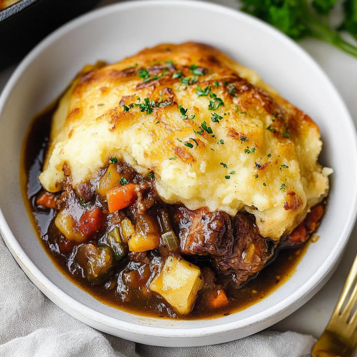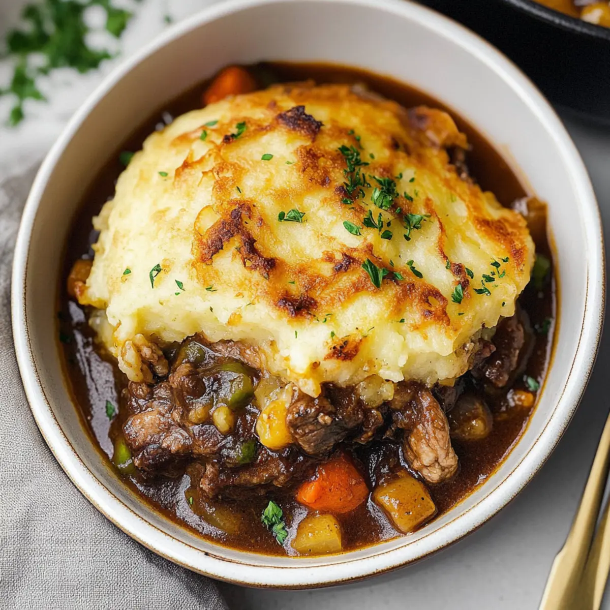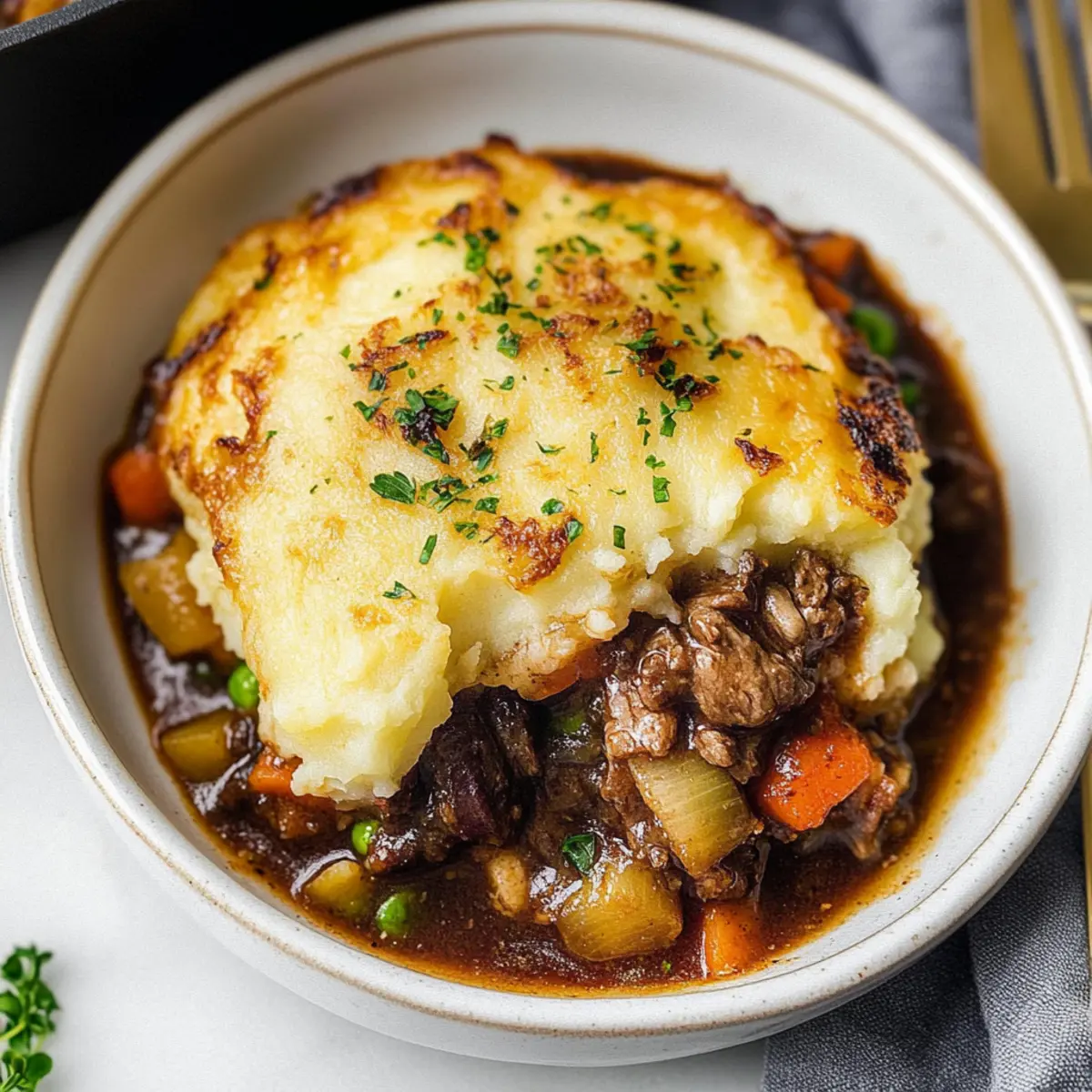 Jump to Recipe Print RecipeAs I stood in my kitchen, the unmistakable aroma of searing beef mingled with hints of savory herbs, transporting me to a cozy Irish pub on a rainy day. This Guinness Beef Cottage Pie is my go-to comfort food, perfect for revitalizing those chilly evenings or adding festivity to your St. Patrick’s Day celebrations. With tender, seared beef and colorful sautéed vegetables enveloped in a rich Guinness gravy, each bite cradles a delightful contrast of creamy Dubliner cheese-infused mashed potatoes atop a hearty filling. Not only is this dish a crowd-pleaser, but it also offers the comfort of home-cooked goodness, with a vegetarian option to cater to all tastes. What’s your favorite twist on a comforting classic? Let’s dive into this delicious recipe! Why is this Guinness Beef Cottage Pie special? Comforting Warmth: This dish envelops you in cozy vibes, perfect for family gatherings or solo indulgence on a chilly night. Savor Every Bite: The rich flavors of seared beef and the robust Guinness gravy will have you savoring every mouthful. Flexibility for All: Looking for a vegetarian option? Simply swap the beef for your favorite hearty vegetables and keep the flavor intact! Effortlessly Elegant: Impress your guests with minimal effort—this dish looks stunning when served, yet is simple enough for any home cook. Perfect Pairing: Enjoy it with a crusty slice of Irish brown bread or alongside a fresh salad, making each meal a complete experience! Guinness Beef Cottage Pie Ingredients For the Beef Filling • Olive Oil – Adds moisture and allows for searing the beef; substitute with vegetable oil if needed. • Bottom Round Roast – Provides tender and flavorful meat; can be substituted with chuck roast or stew meat. • Steak Seasoning – Enhances the flavor of the beef; substitute with a mix of salt, pepper, and garlic powder. • Vegetables – Adds sweetness and color: • Carrots – Can be substituted with parsnips or sweet potatoes. • Yellow Onion – For aromatic sweetness; white or red onion can be used interchangeably. • Celery – Contributes flavor and texture; optional to replace with fennel for added depth. • Garlic – Provides a robust flavor; fresh garlic is preferred, but garlic powder is an alternative. • Tomato Paste – Adds a rich depth of flavor; can substitute with tomato sauce, adjusting quantity. • Fresh Thyme – Offers herbal notes; dried thyme can be used, just reduce the quantity. • Fresh Rosemary – Enhances the savory profile; dried rosemary can serve as a substitute, but use less. • Beef Stock – For added moisture and flavor in the gravy; vegetable stock can be used for a lighter alternative. • Tapioca Flour – Thickens the gravy; cornstarch or flour can be used as alternatives. • Guinness – Provides the distinct beer flavor; non-alcoholic beer or beef broth can substitute. • Frozen Peas – Adds color and sweetness; fresh peas or other green vegetables can be used. • Black Pepper – For seasoning; use freshly ground for the best flavor. For the Mashed Potato Topping • Butter – Adds richness to the potato mixture; use margarine or a dairy-free substitute. • Dubliner Cheese – A sharp, flavorful cheese that melts well; cheddar or Gruyere are good alternatives. • Chives/Parsley – For garnish; other fresh herbs can be used for a personalized flavor. Feel free to explore variations of this Guinness Beef Cottage Pie and bring family and friends together for a comforting meal! Step‑by‑Step Instructions for Guinness Beef Cottage Pie Step 1: Preheat the Oven Begin by preheating your oven to 350°F (180°C). This step ensures that your Guinness Beef Cottage Pie bakes evenly, resulting in a gorgeous golden topping. While the oven is heating, gather your ingredients and equipment so you’re ready to cook. Step 2: Sear the Beef In a deep skillet, heat a splash of olive oil over medium-high heat. Once hot, add the seasoned bottom round roast in batches, searing each side for 3–4 minutes until browned. This develops a flavorful crust that will enrich your pie’s filling. Remove the beef and set it aside on a plate. Step 3: Sauté the Vegetables Using the same skillet, add a bit more olive oil if necessary, then toss in the diced carrots, yellow onion, celery, and minced garlic. Sauté these fragrant vegetables over medium heat for about 5–7 minutes, until they soften and the onion becomes translucent. This mixture will enhance the flavor of your Guinness Beef Cottage Pie. Step 4: Incorporate Seasoning Stir in the tomato paste, fresh thyme, and rosemary to the sautéed vegetables. Cook everything together for about 2 minutes, letting the herbs release their aromatic oils and enrich the dish’s flavor profile. The vibrant colors and scents indicate that you’re on the right track! Step 5: Make the Gravy Mix the beef stock with tapioca flour in a bowl until smooth, then pour this mixture into the skillet along with the seared beef. Next, pour in the Guinness, stirring to combine all the ingredients thoroughly. Allow the mixture to simmer for a couple of minutes, which will deepen the flavors of your hearty filling. Step 6: Braise in the Oven Cover the skillet with a lid or foil and transfer it to the preheated oven. Let it braise for 1 hour, stirring halfway through. This process will make the beef wonderfully tender while allowing the flavors to meld beautifully in your Guinness Beef Cottage Pie. Step 7: Prepare the Mashed Potatoes While the beef filling is braising, prepare your mashed potatoes. Boil peeled potatoes until fork-tender, then drain and return them to the pot. Mash the potatoes with butter, warm milk, and a good pinch of Dubliner cheese until creamy and smooth, creating a luscious topping for your pie. Step 8: Final Assembly Once the beef mixture is tender and flavorful, remove it from the oven and fold in the frozen peas, adjusting the seasoning with salt and black pepper. S