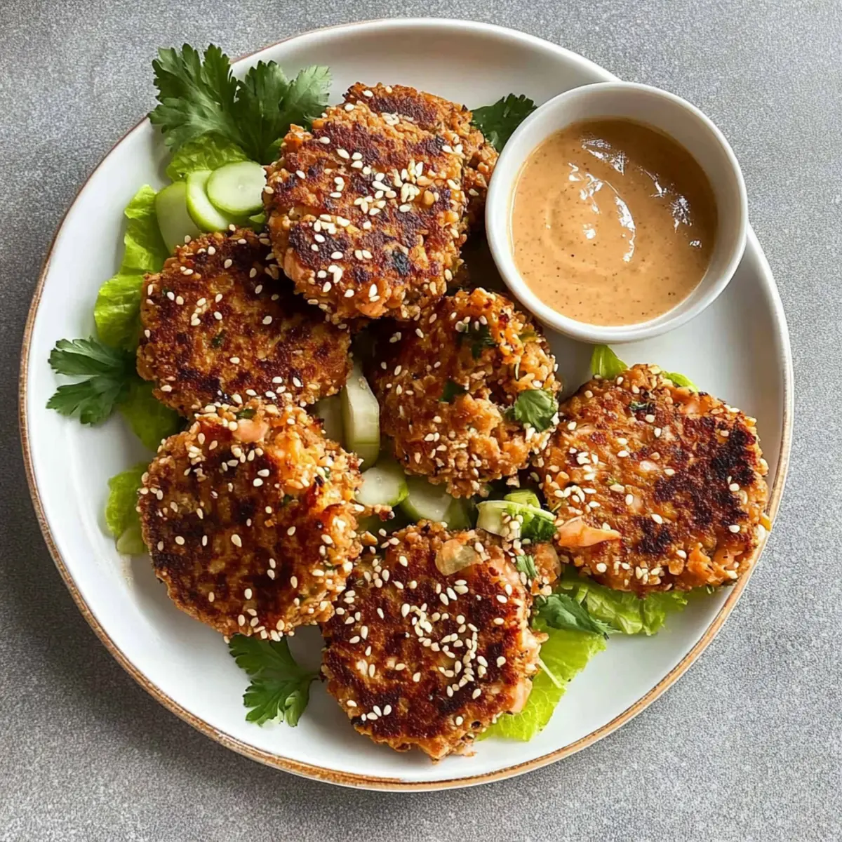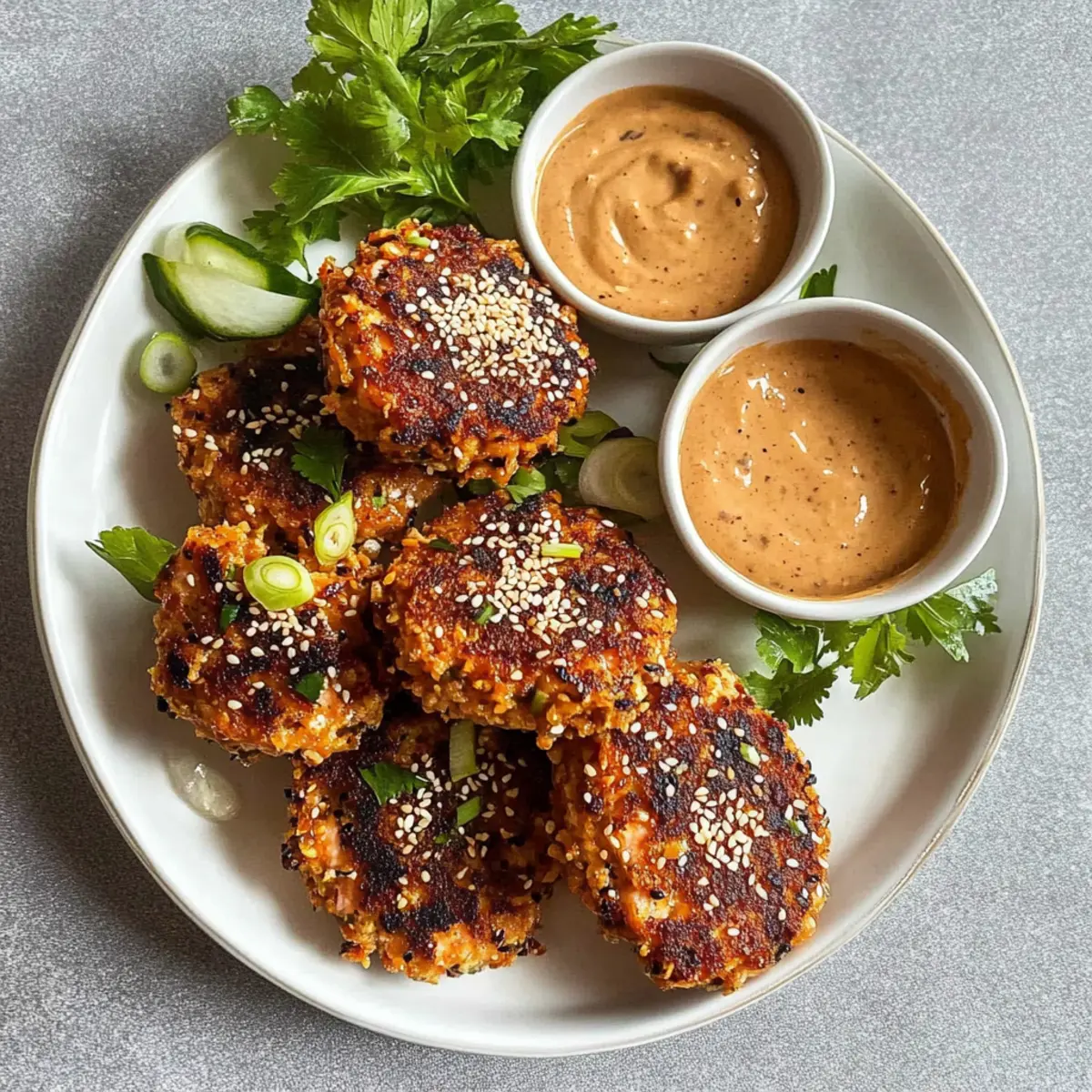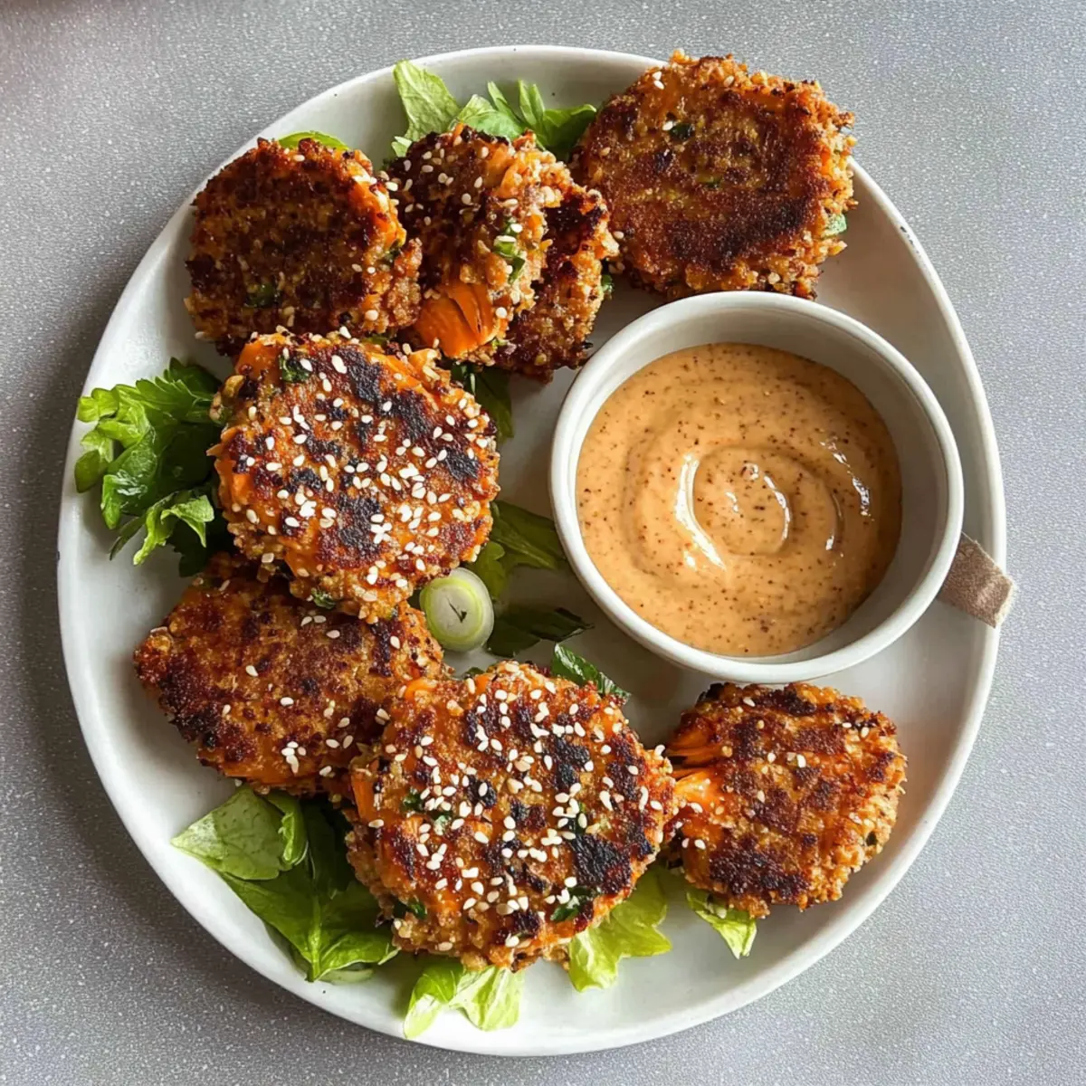 Jump to Recipe Print RecipeAs I stood in my kitchen the other evening, the enticing aroma of spices wafted through the air, pulling me away from the chaos of the day. It was time to make my favorite Harissa Sesame Salmon Patties—a dish that effortlessly elevates a simple weeknight dinner into a delightful culinary experience. These protein-rich patties, perfectly crispy on the outside and tender inside, come together in a flash, making them ideal for meal prep or a quick supper when the clock is ticking. The bold, spicy kick from the harissa combined with a creamy chipotle tahini transforms each bite into a burst of flavor that’s simply irresistible. Ready to dive into a dish that promises deliciousness and excitement? Let’s cook! Why are these patties a must-try? Flavor Explosion: Each bite of these Harissa Sesame Salmon Patties is a delightful mix of spices and textures, combining crispy sesame with rich salmon. Quick and Easy: With just a few simple steps, you’ll have dinner ready in no time—perfect for busy weeknights! Meal Prep Hero: These patties store well and can easily be reheated, making them a fantastic option for your weekly meal prep. Customizable: Feel free to tweak the spices or swap the salmon for another fish or even vegetables. Crowd Pleaser: Serve them as an appetizer or main dish—you’ll impress your guests every time! Don’t forget to pair them with a zesty chipotle tahini for that extra kick; it’s like a match made in heaven! Harissa Sesame Salmon Patties Ingredients Dive into the world of flavor with these savory ingredients! For the Patties • Skinless Salmon – A protein-rich base; fresh is best, but canned works in a pinch. • Harissa – This adds a spicy depth; substitute with sriracha for a milder option. • Egg, whisked – Acts as a binder; try a chia or flaxseed egg for vegans. • Lemon juice – Brightens the flavors; opt for fresh juice for the best taste. • Dijon mustard – Introduces tanginess; any mustard variety will do. • Panko crumbs – For that irresistible crunch; swap for regular breadcrumbs if needed. • Yellow onion – Enhances moisture and flavor; green onions or shallots also work. • Parsley, chopped – Adds a hint of freshness; cilantro is another great option. • Scallions, chopped – Provides a mild onion flavor; chives are a suitable replacement. • Garlic powder – Enriches the flavor; fresh minced garlic offers a bolder taste. • Salt & black pepper – Essential seasonings; adjust according to preference. • Smoked paprika – Gives a smoky flavor; use regular paprika as an alternative. • Olive oil – For sautéing; neutral oils can be used as a substitute. • Panko & sesame seed coating – Creates a crispy layer; add more sesame seeds for nutty flavor. For the Chipotle Tahini • Tahini – Elevates the sauce; can mix with hot sauce or yogurt for variation. • Chipotle pepper – Contributes smokiness and heat; adjust based on spice tolerance. • Garlic – Adds fragrant depth; enhance with roasted garlic for richness. • Water – Thin out the sauce until it reaches your desired consistency. • Salt – Season to taste; a touch brings all the flavors together. Get ready to whip up these Harissa Sesame Salmon Patties for a delightful dinner experience! Step‑by‑Step Instructions for Harissa Sesame Salmon Patties Step 1: Prep the Salmon Begin by finely chopping the skinless salmon using a sharp knife or pulse in a food processor for about 10 seconds, ensuring some texture remains. It should resemble minced meat, not a paste. Transfer the minced salmon to a mixing bowl while you gather the other ingredients. Step 2: Sauté the Onions Dice the yellow onion and heat a tablespoon of olive oil in a skillet over medium heat. Add the diced onion and sauté for about 3-4 minutes, stirring frequently, until the onions are soft and translucent. This step will add a rich flavor to your Harissa Sesame Salmon Patties. Step 3: Mix the Ingredients In the bowl with the minced salmon, combine the sautéed onions, harissa, whisked egg, lemon juice, Dijon mustard, panko crumbs, chopped parsley, scallions, garlic powder, salt, black pepper, and smoked paprika. Mix all these ingredients thoroughly for about 2-3 minutes until evenly combined, creating a flavorful base for the patties. Step 4: Form the Patties With your hands, take small portions of the mixture and shape them into palm-sized patties; you should yield about 6-8 patties. Place the formed patties on a parchment-lined plate, ensuring there’s space between them to avoid sticking. This step prepares them for the coating and cooking process. Step 5: Coat the Patties In a shallow bowl, combine additional panko crumbs with sesame seeds for a crunchy outer layer. Dip each salmon patty into this mixture, pressing lightly to ensure they are evenly coated. This coating will add a delightful crunch to your Harissa Sesame Salmon Patties when cooked. Step 6: Cook the Patties Heat a couple of tablespoons of olive oil in your skillet over medium-low heat, ensuring the oil is hot but not smoking. Fry the coated patties for about 2-3 minutes on each side, flipping carefully once golden brown. You’ll know they’re ready when they develop a crispy exterior and a tantalizing aroma fills your kitchen. Step 7: Prepare the Chipotle Tahini While the patties are cooking, combine tahini, a chipotle pepper, lemon juice, garlic, and a splash of water in a blender. Blend for about 30 seconds until the mixture is smooth and creamy. Adjust the consistency by adding more water as needed, and season with salt to taste; this sauce will perfectly complement the patties. Step 8: Serve and Enjoy Once the patties are crispy and golden, remove them from the skillet and place them on a serving platter. Pair the Harissa Sesame Salmon Patties with your creamy chipotle tahini and any additional sides like fresh salads or buns to create a complete meal that’s sure to impress your 