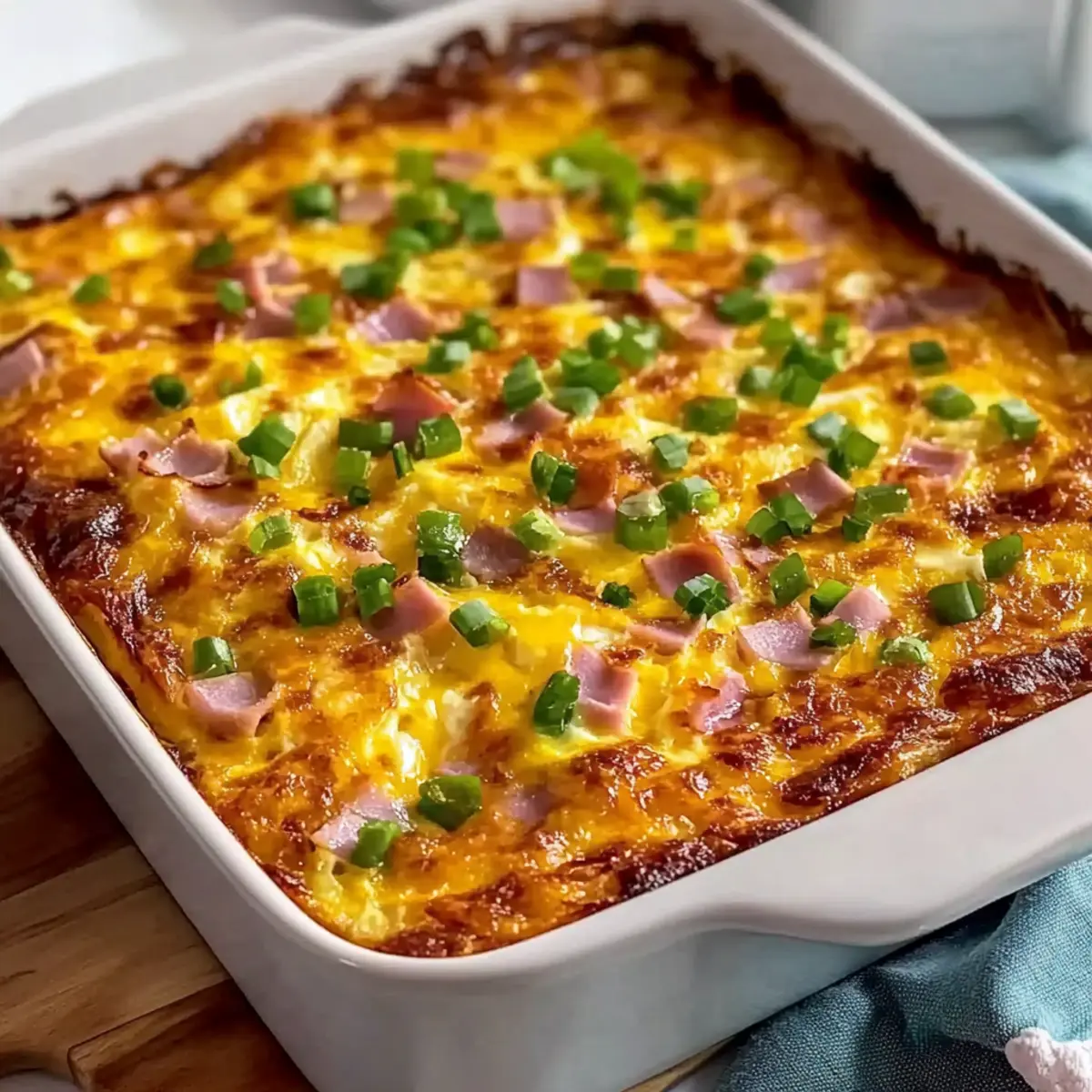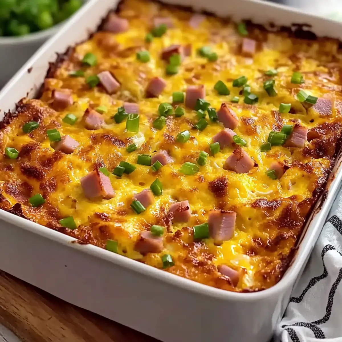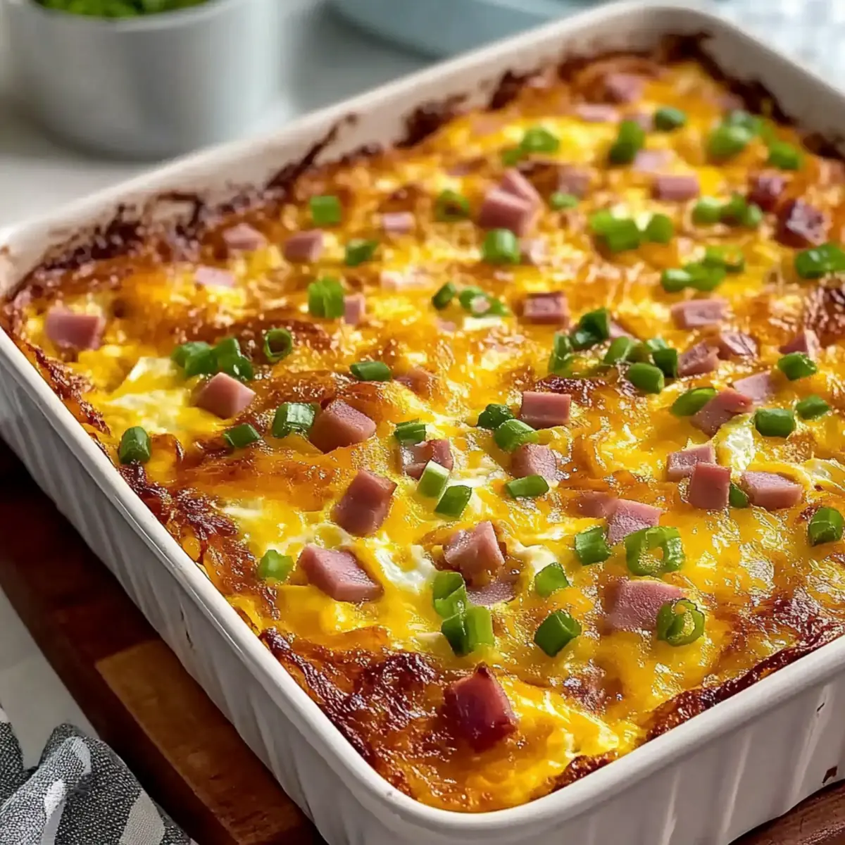 Jump to Recipe Print RecipeAs I stood in my kitchen, a gentle aroma of melting cheese wafted through the air, instantly transporting me to a cozy brunch with family and friends. This Easy Hash Brown Egg Casserole is a delightful blend of crispy hash browns, creamy cheeses, and fluffy eggs baked to golden perfection. Not only is it a true crowd-pleaser, but it’s also make-ahead friendly, allowing you to prepare the dish and bake it effortlessly when it’s time to serve. Whether you’re feeding a hungry family or hosting a weekend gathering, this casserole offers comfort and convenience all in one. Curious about how you can customize it to suit your taste? Let’s dive in! Why is this casserole a crowd favorite? Effortless Preparation: This Hash Brown Egg Casserole is not just delicious but incredibly easy to make. With minimal prep time and straightforward steps, even beginners can whip it up! Versatile Options: Feel free to customize the ingredients. Swap ham for crispy bacon or add veggies for a refreshing twist. You can make it your own! Make-Ahead Marvel: Perfect for busy mornings, this dish can be prepared ahead of time. Just bake it fresh when you’re ready to serve! Hearty and Satisfying: Packed with flavors and textures, this casserole offers a satisfying meal that combines richness with lightness. Great for brunch or dinner! Family-Friendly Appeal: Everyone in your household will love it—it’s a comfort food classic that brings smiles to the table. Pair it with fresh fruit or a light salad for a complete meal! For more casserole inspiration, be sure to check out our savory Cheese Dog Casserole and Vegetable Casserole Cozy! Hash Brown Egg Casserole Ingredients • To create this delicious Hash Brown Egg Casserole, gather the following essentials: For the Base Frozen Hash Brown Patties – A crispy base layer that provides texture and holds the casserole together. (Substitution: Use frozen shredded hash browns, adjusting quantity to cover the dish.) For the Cheesy Filling Shredded Sharp Cheddar Cheese – Adds a rich and tangy flavor, perfect for cheese lovers. Shredded Monterey Jack Cheese – Brings creaminess and a mild taste to balance the sharpness of the cheddar. For the Protein Diced Cooked Ham – Introduces protein and savory depth to the dish. (Option to substitute with crispy bacon or sausage for extra flavor.) For Garnish Chopped Scallions – Freshness and a mild onion flavor that brightens the casserole’s taste. For the Custard Large Eggs – The key binding ingredient that creates a luscious custard-like filling. Whole Milk – Contributes creamy richness to elevate the overall texture. For Seasoning Salt – Essential for enhancing overall flavors and bringing everything together. Ground Dry Mustard – Adds a subtle depth of flavor that balances the richness of the cheese and eggs. (Optional but highly recommended.) Garlic Powder – Offers an additional layer of savory goodness to the dish. Feel free to switch things up and make this casserole uniquely yours! Step‑by‑Step Instructions for Hash Brown Egg Casserole Step 1: Preheat and Prepare Preheat your oven to 350°F (175°C) and grab a 9×13 inch baking dish. Generously grease the bottom and sides with butter or non-stick spray to prevent sticking. This will ensure your Hash Brown Egg Casserole comes out easily, leaving you with a perfectly golden crust and soft filling. Step 2: Layer the Hash Browns Take your frozen hash brown patties and arrange them in a single layer at the bottom of the prepared baking dish. Press the patties down gently to create a solid base that will hold all the delicious ingredients together. Make sure the base covers the dish evenly for consistent texture throughout the casserole. Step 3: Add the Cheesy Goodness Sprinkle the shredded sharp cheddar cheese and Monterey Jack cheese evenly over the hash brown layer. Next, add the diced cooked ham and chopped scallions. This delicious combination not only adds flavor but also contributes to the tantalizingly gooey texture of the Hash Brown Egg Casserole after baking. Step 4: Whisk the Egg Mixture In a large mixing bowl, crack the large eggs and whisk them together with the whole milk, salt, ground dry mustard, and garlic powder until the mixture is smooth and well combined. This custard-like filling provides the perfect binding for the casserole, ensuring that every bite is rich and savory. Step 5: Pour the Egg Mixture Slowly and evenly pour the prepared egg mixture over the layered ingredients in the baking dish. It’s important to distribute the liquid gently to maintain the beautiful layers you’ve created. This will ensure that the crispy hash brown base contrasts perfectly with the fluffy filling below. Step 6: Bake Covered Cover the casserole tightly with aluminum foil and place it in the preheated oven. Bake for 25 minutes until the mixture is just set. The cover allows the casserole to steam slightly, creating a wonderfully moist interior while the hash browns crisp up beautifully at the edges. Step 7: Bake Uncovered After the initial baking time, carefully remove the foil and return the casserole to the oven. Bake for an additional 20 minutes or until the top is golden brown and slightly puffed. This final touch gives the Hash Brown Egg Casserole a delightful crispy finish that complements the soft egg filling perfectly. Step 8: Rest Before Serving Once baked to perfection, take the casserole out of the oven and let it sit for 5-10 minutes before slicing. This resting period allows the dish to firm up slightly, making it easier to cut into portions. When ready, serve warm and enjoy this comforting dish packed with flavor! Make Ahead Options These Hash Brown Egg Casserole preparations are ideal for busy home cooks looking to save time! You can assemble the entire casserole up to 24 hours in advance. Simply follow the steps to layer the hash browns, cheeses, ham, and egg mixture in the baking dish, cover tightly with 