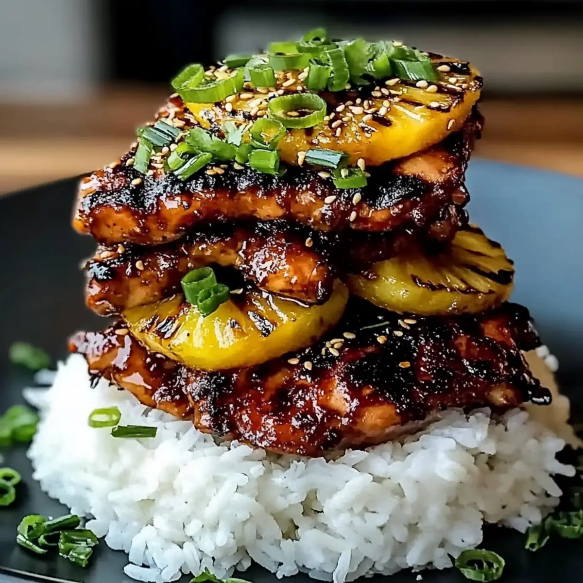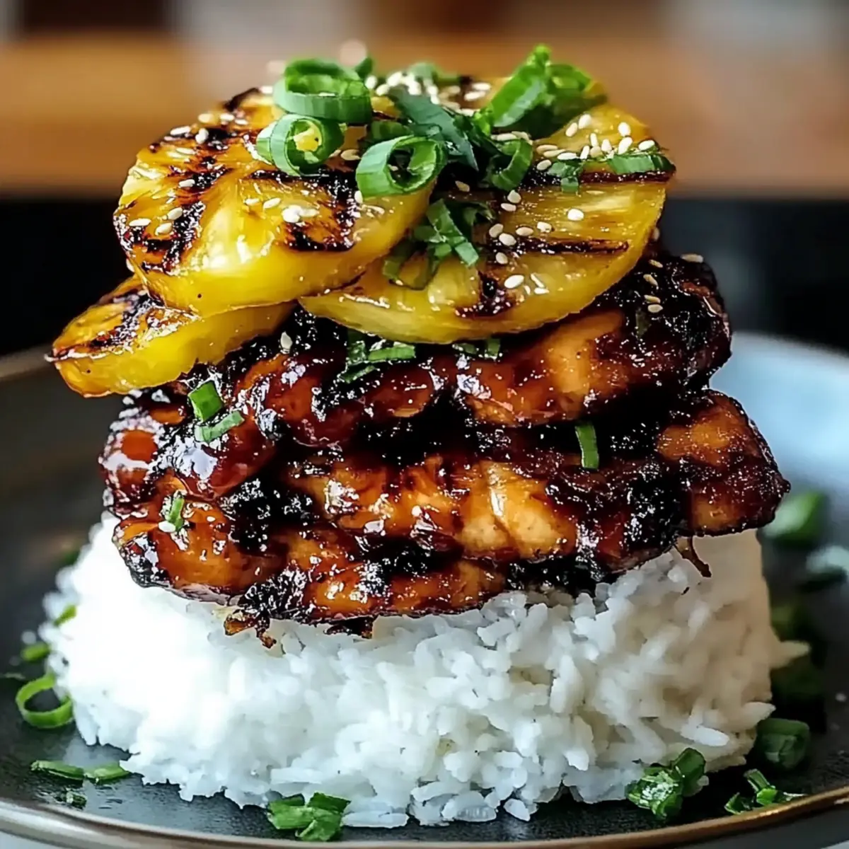6. Assemble the Stack: Serve the grilled chicken over rice, topped with grilled pineapple, drizzled with glaze, and garnished with green onions and sesame seeds.