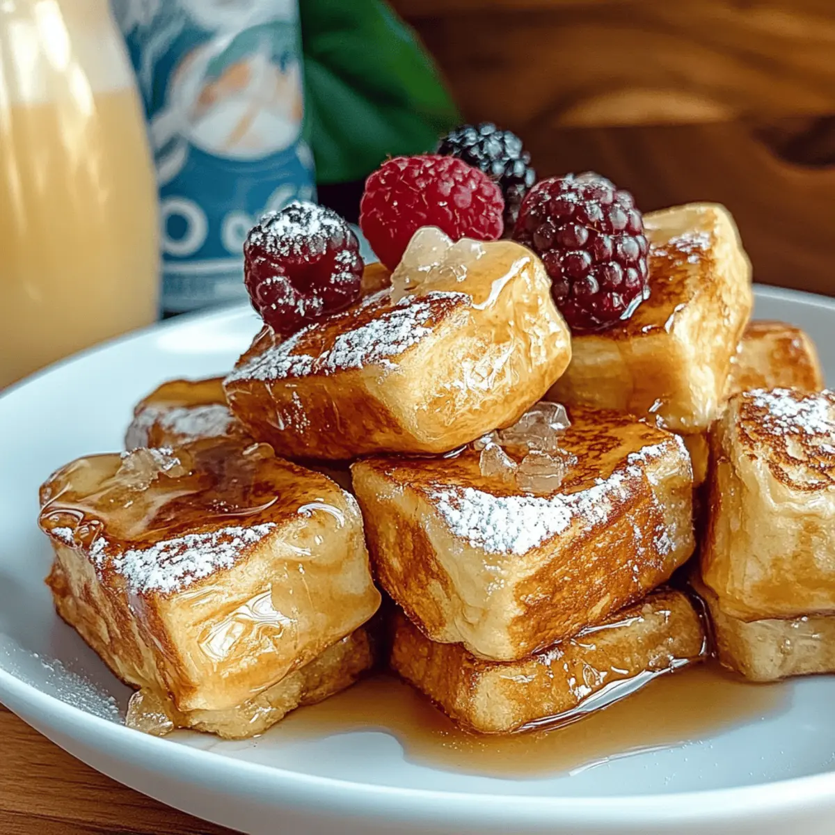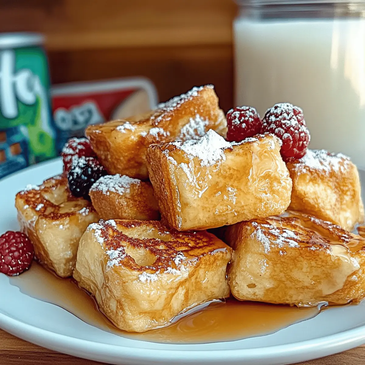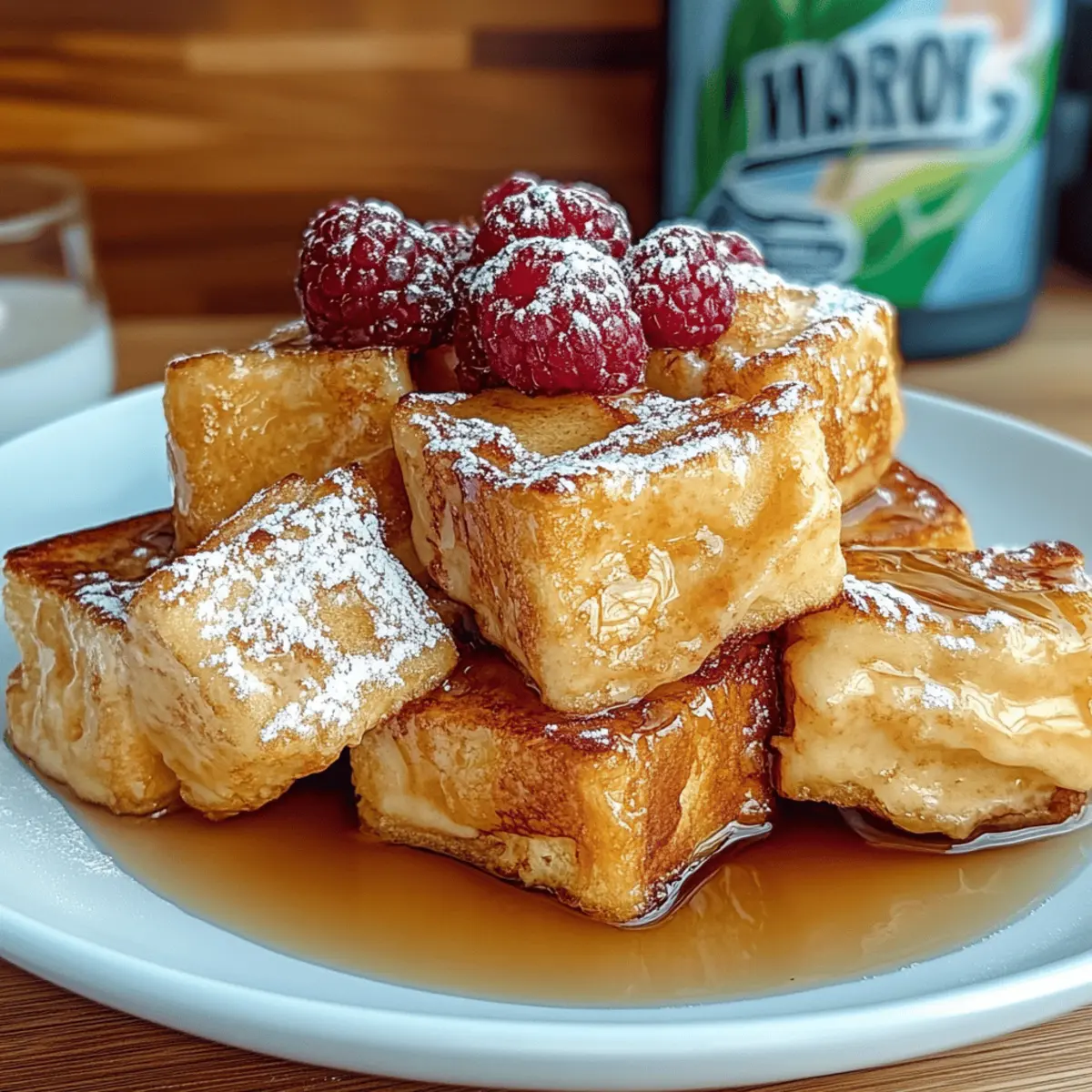 Jump to Recipe Print RecipeAs the sun rises and the aroma of sweet cinnamon fills the kitchen, there’s nothing quite like making a batch of Hawaiian Roll French Toast Bites. These little treasures transform a classic breakfast into something extraordinary, featuring soft and pillowy rolls coated in cinnamon-sugar bliss. Not only are they a breeze to whip up for those lazy weekend mornings, but they also make an unforgettable centerpiece for holiday brunches. Enjoying these bites is like having a warm embrace on a plate—comforting and satisfying without being overwhelming. Plus, they provide a fun twist on your regular French toast routine that everyone will adore! Curious about how to bring this delicious dish to life? Let’s dive in! Why is Hawaiian Roll French Toast a Must-Try? Irresistibly Sweet: Featuring soft, pillowy Hawaiian rolls, this recipe takes a classic breakfast to a whole new level of indulgence. Quick and Easy: With just a few simple ingredients and straightforward steps, you’ll have a delicious breakfast ready in minutes, perfect for busy mornings. Perfect for Any Occasion: Whether for a cozy weekend brunch or a festive holiday gathering, these bites will impress your family and friends. Customization Galore: Dress them up with your favorite toppings like fresh berries or whipped cream, making each batch uniquely yours! Crowd-Pleasing Flavor: The delightful mix of cinnamon-sugar and buttery goodness ensures that everyone, from kids to adults, will be coming back for seconds. For another delightful brunch option, consider trying out my Strawberry Shortcake Roll for a sweet twist! Hawaiian Roll French Toast Ingredients For the Custard • Large Eggs – Essential for binding and creating a rich custard base. • Half and Half (or Whole Milk) – Adds creaminess; feel free to use non-dairy milk for a lighter option. • Vanilla Extract – A flavor enhancer; opt for pure vanilla for the best taste. • Ground Cinnamon – Infuses warmth and sweetness into each bite. • Brown Sugar – Provides a sweet flavor with hints of molasses; substitute with white sugar for a milder taste. • Pinch of Salt – Balances the sweetness and enhances flavor. For the Rolls • King’s Hawaiian Rolls – The star of the dish, offering a unique, sweet flavor that elevates this French toast. For Cooking • Butter – Used for cooking, adds richness, and keeps the rolls from sticking to the pan. For Serving • Powdered Sugar – A delicious dusting for a sweet finish. • Fresh Fruit – Adds color and freshness; customize with your favorites. • Maple Syrup – Drizzle for added sweetness; a classic pairing for French toast. Bring the joy of Hawaiian Roll French Toast into your home, and watch as everyone rushes to the table for a taste of this sweet delight! Step‑by‑Step Instructions for Hawaiian Roll French Toast Step 1: Prepare the Custard In a large mixing bowl, whisk together 4 large eggs and 1 cup of half and half until the mixture is smooth and well-combined. Add 1 teaspoon of vanilla extract, 1 teaspoon of ground cinnamon, 2 tablespoons of brown sugar, and a pinch of salt, mixing thoroughly. This custard will give your Hawaiian Roll French Toast its rich flavor and creamy texture, so ensure it’s all blended nicely. Step 2: Soak the Rolls Take your King’s Hawaiian Rolls and carefully poke a few holes in the bottom of each roll to allow the custard to soak in. Dip the rolls into the custard mixture for about 30 seconds, ensuring they are coated but not overly soggy. It’s essential to let the excess custard drip off before moving on to the next step, as you want them moist, but not falling apart. Step 3: Cook the Rolls In a non-stick skillet, melt 2 tablespoons of butter over medium-low heat. Once the butter is fully melted and slightly bubbling, place the soaked rolls into the skillet. Allow them to cook for 30 to 60 seconds on each side, or until they turn a beautiful golden brown and have a crispy exterior. Remember to turn them gently to prevent them from breaking apart. Step 4: Serve & Enjoy Once your Hawaiian Roll French Toast is cooked to perfection, transfer them to a serving platter. Dust generously with powdered sugar and finish off with fresh berries and a drizzle of maple syrup, if desired. The contrast of the warm, fluffy interior and the sweet toppings will make each bite a delightful experience. How to Store and Freeze Hawaiian Roll French Toast Fridge: Keep the cooked Hawaiian Roll French Toast in an airtight container in the refrigerator for up to 3 days, ensuring freshness and flavor. Freezer: For longer storage, freeze the French toast bites in a single layer on a baking sheet before transferring them to a freezer-safe bag or container. They can be stored for up to 2 months. Reheating: When ready to enjoy, reheat in the oven at 350°F (175°C) for about 10-15 minutes or in an air fryer for a few minutes until warmed through and crispy again. Storage Tip: If making the custard ahead of time, store it in the refrigerator for up to 2 days before soaking and cooking the rolls. Hawaiian Roll French Toast Variations Feel free to put your own twist on these delightful bites, and let your creativity shine in the kitchen! Dairy-Free: Substitute half and half with almond or oat milk for a lighter, dairy-free version that maintains creaminess. This swap allows everyone to enjoy the flavors without compromising their dietary needs. Seasonal Spice: Swap out the ground cinnamon for nutmeg or pumpkin spice for a cozy, seasonal flavor. This seasonal twist adds a rich aroma that will fill your kitchen with warmth. Indulgent Toppings: Top with whipped cream, chocolate sauce, or caramel for an indulgent dessert-style breakfast. If you’re feeling adventurous, why not set up a topping bar for a fun brunch experience? Fruity Delight: Add sliced bananas or mixed berries directly into the custard for added sweetness and texture in every bite. These fresh fruits complem