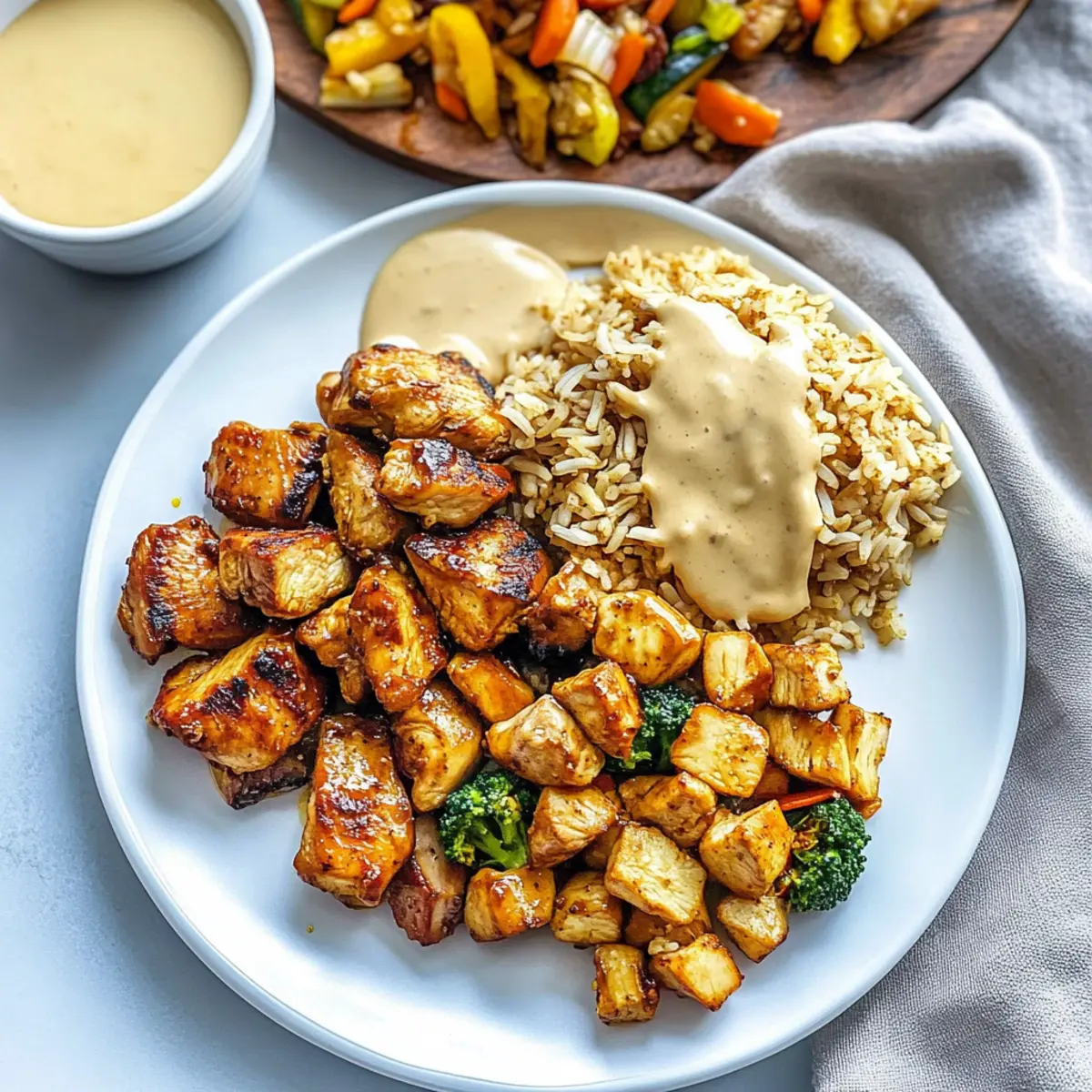 Jump to Recipe Print RecipeAs I stood by the stove, the sizzle of chicken meeting a hot skillet echoed memories of lively restaurant experiences. If you’re craving a comforting yet healthy option that brings the magic of dining out right to your kitchen, look no further than this Perfect Hibachi Chicken. With each tender, marinated bite, it’s like a warm hug of flavor without the weight of excess calories. This meal is not just high in protein but also perfect for meal prep, making it an effortless choice for those bustling weeknights. So, are you ready to elevate your dinner game and impress your loved ones with this delightful Benihana copycat? Let’s dive into this culinary adventure! Why Is This Hibachi Chicken So Special? Deliciously Familiar: This recipe captures the essence of your favorite restaurant experience, bringing a fun hibachi grill atmosphere right to your kitchen. Healthy Twist: Lower in calories yet packed with protein, this dish allows you to satisfy cravings without guilt, great for meal prep! Flavor Explosion: Marinated in savory sauces, this chicken bursts with umami richness—everyone will be asking for seconds! Quick & Easy: From marinating to plating, you’ll have a restaurant-quality meal ready in under 30 minutes, perfect for busy nights. Versatile Ingredients: Feel free to swap in seasonal veggies or use Chicken Green Bean for a different taste vibe! Enjoy the vibrant flavors while knowing you’re treating your body right! Hibachi Chicken Ingredients • For the Chicken Chicken breasts – Provides the base protein; opt for diced chicken thighs for extra juiciness. Sesame oil – Adds rich flavor; substitute with olive oil if you’re in a pinch. Soy sauce – Imparts umami and saltiness; consider tamari for a gluten-free alternative. Hoisin sauce – Enhances sweetness; you can replace with a touch of honey if necessary. Garlic, minced – Adds aromatic depth; fresh garlic is best for maximum flavor. Fresh minced ginger – Brings a spicy warmth; ground ginger can work in a hurry. • For the Mustard Sauce Light mayo – Forms the creamy base; Greek yogurt is a healthier substitute if preferred. Rice vinegar – Adds a tangy acidity; apple cider vinegar can serve in its stead. Dijon mustard – Provides depth and brightness; yellow mustard can be used if that’s what you have. • For the Vegetables and Rice Olive oil – For sautéing; any neutral cooking oil will do the job. Carrot, zucchini, yellow onion, mushrooms – A vibrant mix of vegetables for crunch; swap in seasonal favorites as desired. Cooked white rice – Perfect for soaking up marvelous flavors; brown rice or cauliflower rice are excellent, healthier options. Egg – Adds protein and texture to the fried rice; simply omit for a vegan version. Green onions – Offers a fresh garnish; chives can stand in if needed. This Hibachi Chicken is a delightful mix of flavors that feels indulgent without the calorie burden. Enjoy creating this healthy, comforting, and delicious dish right in your kitchen! Step‑by‑Step Instructions for Perfect Hibachi Chicken Step 1: Marinate Chicken In a mixing bowl, combine diced chicken breasts with sesame oil, soy sauce, hoisin sauce, minced garlic, and fresh ginger. Stir well to ensure the chicken is evenly coated. Let this mixture marinate for at least 15 minutes at room temperature, allowing flavors to meld. You’ll know it’s ready when the chicken starts to soak up the savory aroma. Step 2: Cook Chicken Heat a large skillet over medium-high heat for about 2 minutes until hot. Add the marinated chicken to the skillet in a single layer, stirring occasionally. Cook for approximately 10 minutes, or until the chicken is golden brown and fully cooked through, with an internal temperature reading of 165°F (75°C). Remove the chicken from the skillet and set aside on a plate. Step 3: Cook Vegetables In the same skillet, pour in a splash of olive oil and heat it over medium-high heat. Add the sliced onions, carrots, mushrooms, and zucchini, seasoning with a pinch of salt, pepper, and a splash of soy sauce. Sauté the vegetables for about 5 minutes until they are tender-crisp and vibrant in color, stirring often to achieve even cooking. Step 4: Prepare Fried Rice Push the sautéed vegetables to the side of the skillet and melt butter in the open space. Add minced garlic and sauté for about 30 seconds until fragrant. Then, stir in the cooked white rice and a splash of soy sauce. Create a well in the center, crack in an egg, and scramble it for 2-3 minutes until just set. Finally, mix in the green onions to add freshness. Step 5: Assemble & Serve To serve your Perfect Hibachi Chicken, create a hearty plate by layering fluffy fried rice, sautéed vegetables, and the juicy chicken. You can drizzle some of the mustard sauce for a delightful kick or serve it on the side for dipping. Enjoy the vibrant flavors reminiscent of a cherished restaurant experience right at home! Make Ahead Options These Hibachi Chicken preparations are perfect for busy cooks looking to save time! You can marinate the chicken up to 24 hours in advance, allowing the flavors to deeply infuse. Simply combine the chicken with sesame oil, soy sauce, hoisin sauce, minced garlic, and ginger, then refrigerate it until you’re ready to cook. Additionally, the mixed vegetables can be chopped ahead of time and stored in an airtight container for up to 3 days. When it’s time to serve, just cook the marinated chicken and sauté the prepped vegetables before assembling the fried rice. This way, you’ll enjoy a delicious, restaurant-quality meal with minimal effort and just as much flavor! Expert Tips for Hibachi Chicken Marination Time: Allow the chicken to marinate for at least 15 minutes, but up to an hour for maximum flavor absorption. Avoid Dry Chicken: Use a meat thermometer to ensure the chicken reaches 165°F (75°C) without overcooking, keeping it tender and juicy. Vegetable Crunch: To ma
