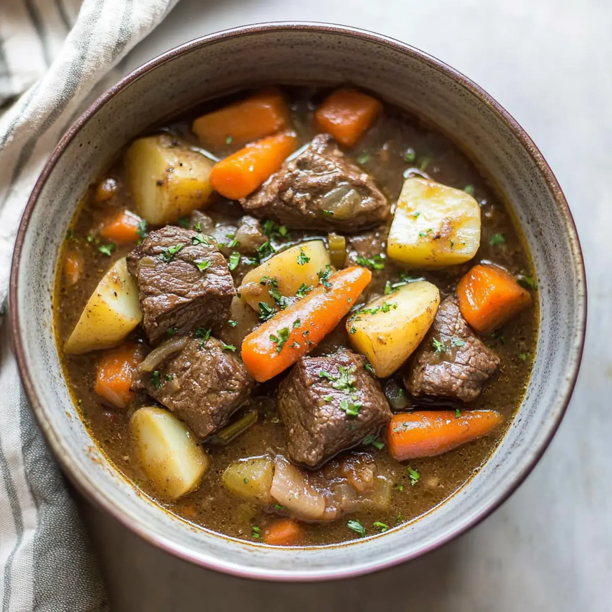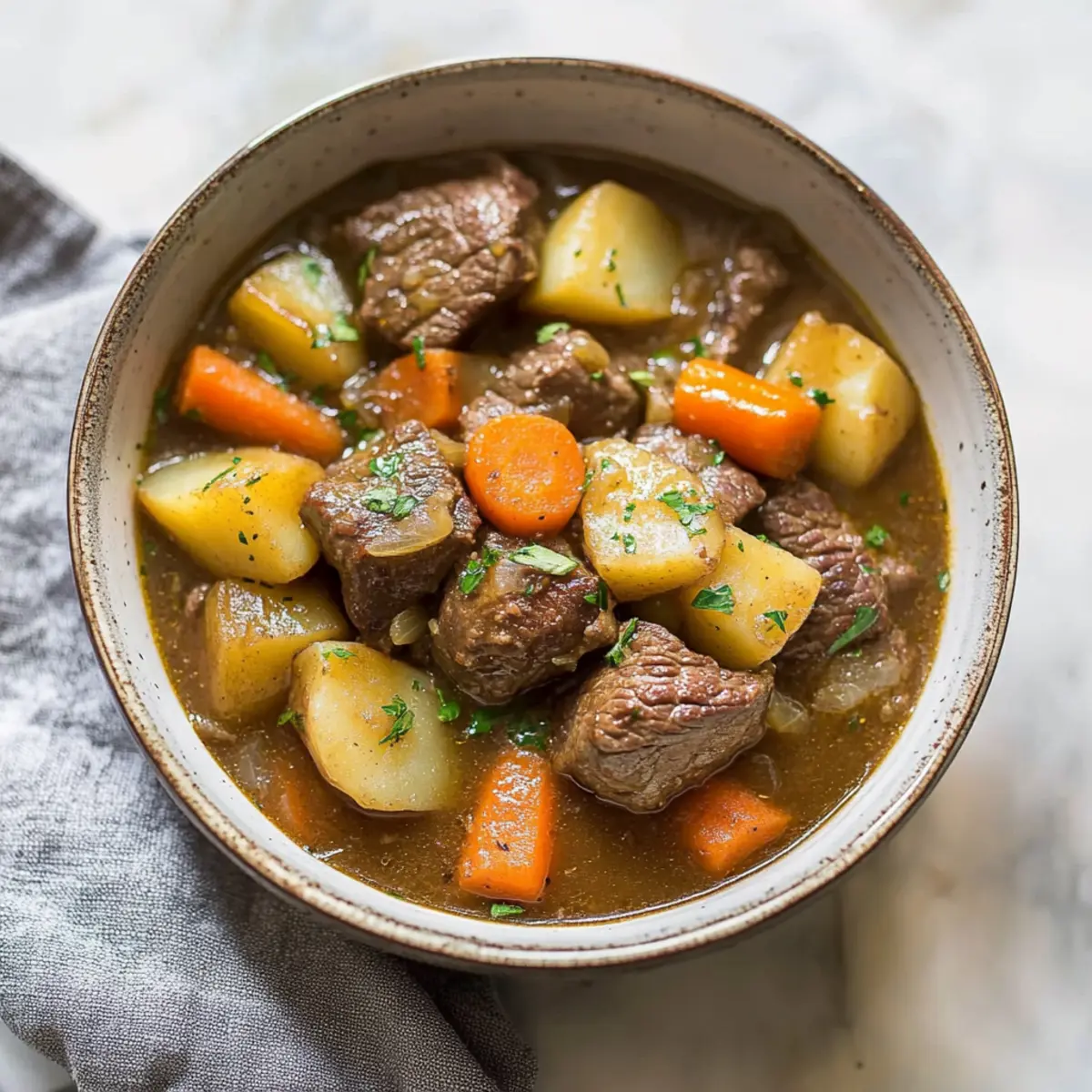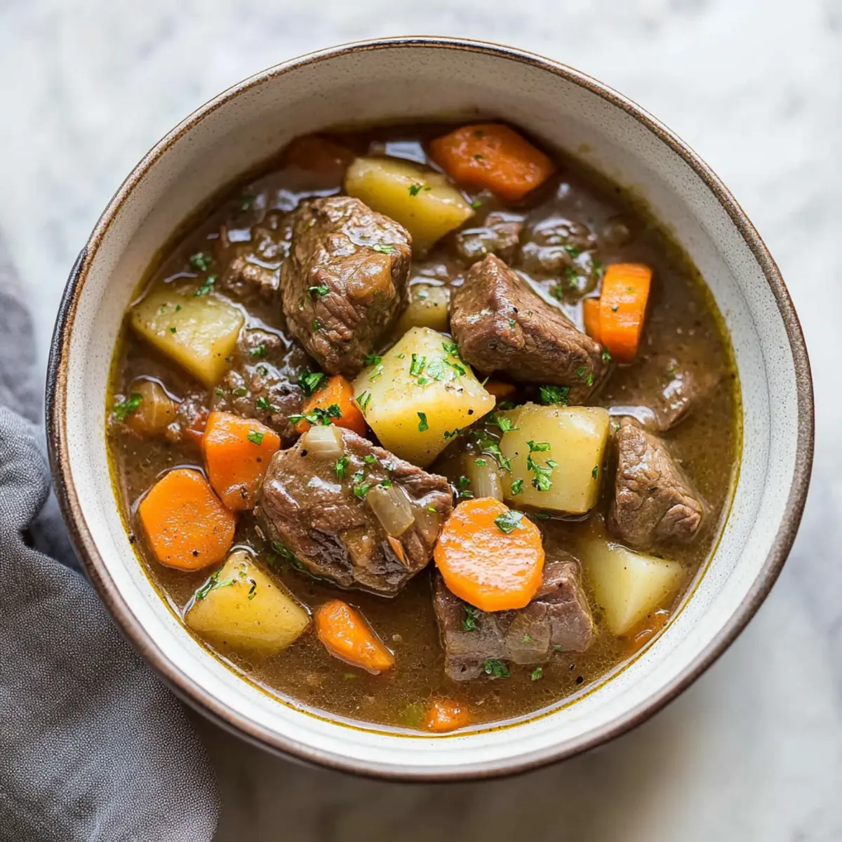 Jump to Recipe Print RecipeAs I locked my Instant Pot and felt that familiar excitement flutter inside, I knew I was about to dive into a bowl of Quick & Hearty Instant Pot Irish Beef Stew with Guinness. There’s something undeniably heartwarming about this dish, especially with its rich flavor and tender beef that seems to melt away with every spoonful. The magic lies in how this recipe transforms simple ingredients into a comforting masterpiece, capturing the slow-cooked taste of traditional Irish stew in just over an hour. Perfect for chilly nights or festive gatherings, it’s both a crowd-pleaser and a time-saver, making dinner a breeze. Curious to see how this cozy classic can fill your kitchen with warmth and deliciousness? Let’s get cooking! Why Is This Irish Stew Unforgettable? Heartwarming Comfort: This Instant Pot Irish stew brings the warmth of home-cooked meals to your table, perfect for chilly evenings. Quick Cooking: In just over an hour, you can enjoy the robust flavors as if it simmered for hours, thanks to the Instant Pot. Unique Flavor: The blend of Guinness with tender beef and fresh vegetables creates an enchanting aroma that will make your kitchen feel like a cozy Irish pub. Versatile Ingredients: Feel free to swap in lamb or add seasonal veggies like peas or corn for a personalized touch. Perfect for Sharing: Whether it’s a family dinner or a special occasion, this stew is sure to impress, leaving everyone asking for seconds. Ready to tackle more hearty meals? Check out my Crock Pot BBQ Ribs for another delicious crowd-pleaser! Instant Pot Irish Stew Ingredients For the Stew • Beef Stewing Cubes – The heart of your stew, tender and juicy; lamb can be substituted for a traditional flavor. • Flour – Dredges the beef for browning, adding depth; swap with gluten-free flour if needed. • Salt & Pepper – Essential enhancers; feel free to adjust quantities according to taste. • Olive Oil – For searing the beef, contributing flavor and moisture; canola oil is a great alternative. • Onion – Adds complexity and sweetness when sautéed; shallots work well for a milder taste. • Yukon Gold Potatoes – Provide a creamy texture and heartiness; Russet potatoes create a fluffier stew. • Carrots – Bring sweetness and color to the dish; use any type of carrots you have on hand. • Celery – Adds aromatic depth; consider substituting with fennel for a unique twist. • Guinness Beer – Infuses the stew with a rich flavor; any stout beer will work, or use beef broth for a non-alcoholic option. • Worcestershire Sauce – Offers umami and complexity; soy sauce is a suitable substitute. • Garlic Powder – Enhances the stew’s flavor; fresh garlic can be used in place of powder (1 clove = 1/8 tsp powder). Embrace the heartwarming delight of this Instant Pot Irish Stew as it mingles flavors and fills your home with the scent of comfort. Ready to put on your apron and bring this cozy dish to life? Let’s move to the cooking steps ahead! Step‑by‑Step Instructions for Quick & Hearty Instant Pot Irish Beef Stew with Guinness Step 1: Season and Prepare the Beef Begin by generously seasoning your beef stewing cubes with salt and pepper, enhancing the flavor beautifully. Dredge the seasoned beef in flour, ensuring an even coating that will help in browning. This step not only adds taste but also thickens the stew as it cooks. Step 2: Sear the Beef Set your Instant Pot to “sauté” mode and heat two tablespoons of olive oil until shimmering, about 1-2 minutes. Add half of the floured beef cubes in a single layer and brown them for approximately 5 minutes, turning to sear all sides until they’re golden brown. Remove the beef and repeat with the remaining cubes, taking care not to crowd the pot. Step 3: Sauté the Onions With the beef set aside, add the chopped onions to the pot. Sauté for about 2-3 minutes, stirring occasionally until they become translucent and slightly softened. This step builds a flavorful base for your stew, inviting the comforting aroma of sautéed onions to fill your kitchen. Step 4: Deglaze the Pot Pour in the Guinness beer and Worcestershire sauce, scraping the bottom of the pot to release any browned bits—this deglazing process adds depth to your Instant Pot Irish stew. The liquid should bubble gently as the alcohol cooks off, leaving behind a rich, robust flavor. Stir in garlic powder for a final touch of seasoning. Step 5: Combine All Ingredients Return the browned beef to the pot, adding in the chopped Yukon Gold potatoes, sliced carrots, and diced celery. Make sure all the ingredients are evenly distributed and coated with the delicious sauce. This step is crucial as it will allow each element to meld beautifully during cooking. Step 6: Pressure Cook the Stew Close the Instant Pot lid securely, turning the valve to the “sealing” position to trap in steam. Set the pot to cook on high pressure for 35 minutes. While it cooks, the flavors will develop, creating a comforting and hearty experience you won’t forget. Step 7: Release the Pressure Once cooking is complete, you can choose to perform a quick or natural pressure release. If time allows, a natural release lets the flavors settle for about 15 minutes before you open the valve to release any remaining pressure. Be cautious of the steam as you open it. Step 8: Adjust Seasoning and Serve Open the lid and stir the stew gently, adjusting salt and pepper to taste if needed. The beef should be tender, surrounded by luscious veggies in a rich sauce. Serve the Quick & Hearty Instant Pot Irish Beef Stew warm, accompanied by fresh crusty bread or over creamy mashed potatoes for a truly comforting meal. Expert Tips for Instant Pot Irish Stew Searing Matters: Ensure you sear the beef properly; this step locks in moisture and flavor, preventing a bland stew. Don’t Rush the Rest: After cooking, allow the stew to rest for at least 15 minutes. This lets flavors meld beautifu
