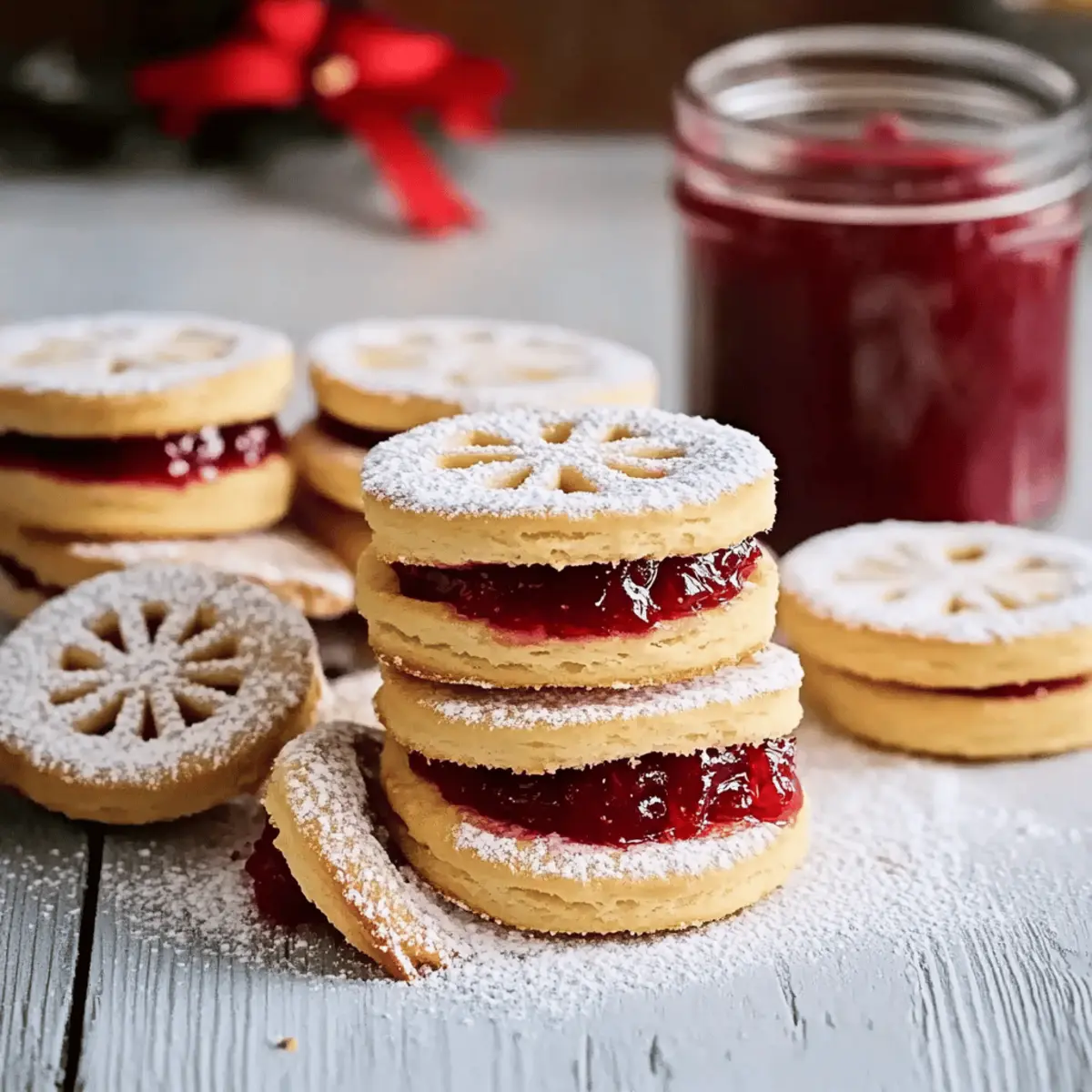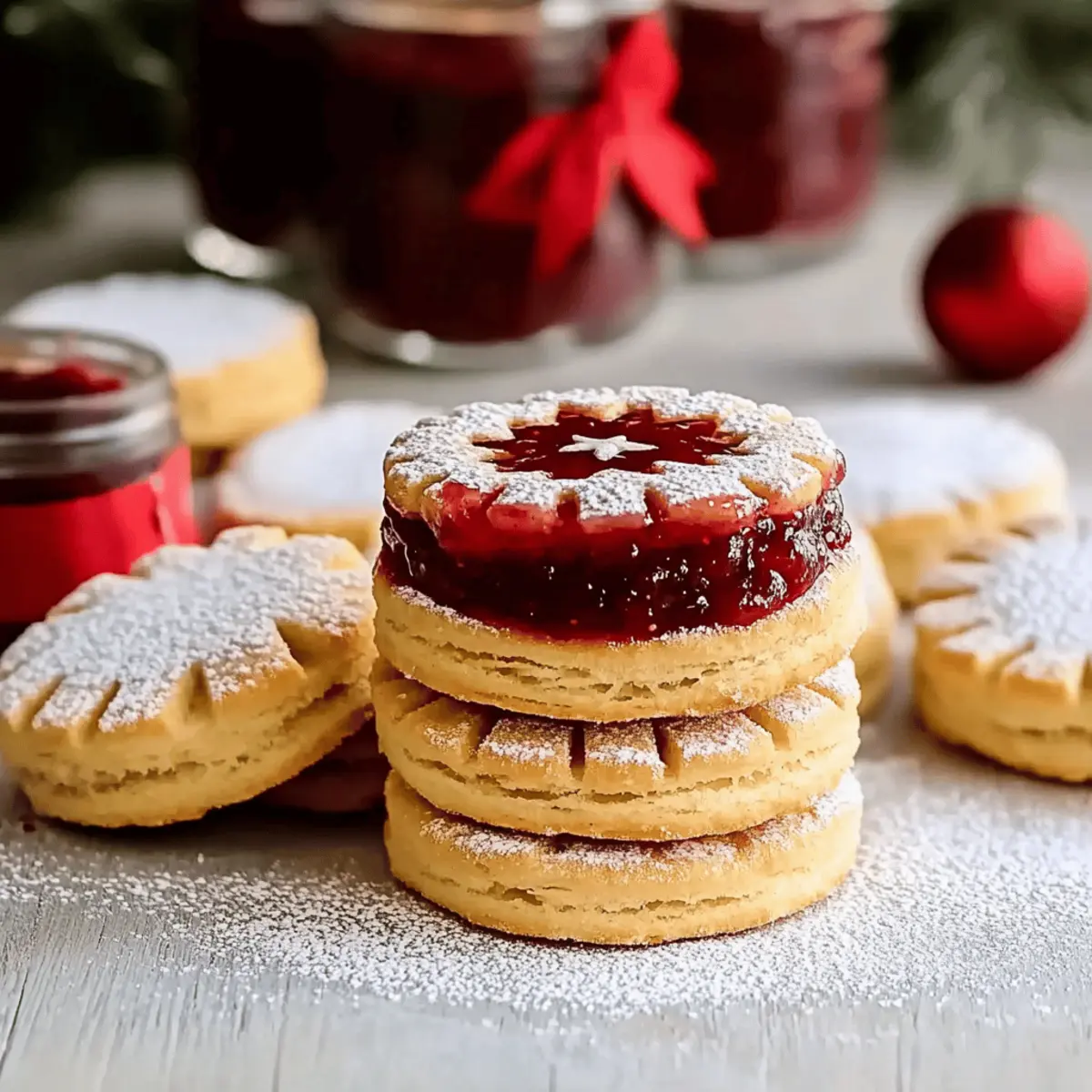 Jump to Recipe Print RecipeAs I watched my kitchen transform into a festive wonderland, the scent of freshly baked cookies wafted through the air, igniting memories of joyous holiday celebrations. These Festive Jam Christmas Biscuits are not just another treat; they embody the warmth and cheer of the season, inviting everyone to gather and indulge. What I love about these jam-filled delights is how effortlessly simple they are to whip up—perfect for both seasoned bakers and those seeking a little culinary adventure. With their buttery softness and vibrant jam centers, they’re a crowd-pleaser that requires no special tools, making them an ideal choice for any holiday gathering. Whether you’re looking to impress at a cookie exchange or simply want to share some homemade goodness with loved ones, these biscuits have you covered. Are you ready to create some merry memories in your kitchen? Why Are These Jam Christmas Biscuits Special? Simplicity at Its Best: These Festive Jam Christmas Biscuits are incredibly easy to make, requiring only basic baking skills and common ingredients. Bursting with Flavor: The bright and fruity jam fillings contrast beautifully with the buttery biscuit, creating an irresistible bite that’s perfect for the holiday season. Perfect for Sharing: Ideal for cookie exchanges and gifting, these biscuits bring joy to any festive gathering. Make-Ahead Magic: Prepare the dough in advance and refrigerate for a stress-free baking experience on busy holiday days—merry memories are just a bake away! Customize Your Experience: Experiment with different jam flavors for a unique twist each time—whether it’s classic strawberry or adventurous cherry, there’s no limit to your creativity! Enjoy these biscuits with your favorite hot beverages for a cozy holiday treat! Jam Christmas Biscuits Ingredients For the Biscuit Dough Butter – Provides richness and flavor; use unsalted for better control over salt levels. Confectioners’ Sugar – Adds sweetness and fine texture to the dough; can substitute with granulated sugar, though texture may vary. Vanilla Bean Paste – Adds aromatic depth; can be replaced with vanilla extract if needed. All-Purpose Flour – The essential structure for the biscuits; no substitutions are suggested for the best results. Rice Flour (or Corn Starch) – Creates a tender, melt-in-your-mouth texture; optional for allergy concerns, but can be adjusted with more all-purpose flour. For the Jam Filling Jam (Strawberry or Apricot) – Provides sweetness and color to the biscuit center; feel free to try different flavors like raspberry or cherry for your Jam Christmas Biscuits! Step‑by‑Step Instructions for Festive Jam Christmas Biscuits Step 1: Prepare Dough In a large mixing bowl, beat together 1 cup of softened unsalted butter, 1 cup of confectioners’ sugar, and 1 teaspoon of vanilla bean paste until the mixture is light and fluffy, about 3–5 minutes. Use a hand mixer or stand mixer for ease. The mixture should be creamy and pale in color, signaling it’s ready for the next step. Step 2: Combine Ingredients Gently fold in 2 cups of all-purpose flour and 1/4 cup of rice flour (or corn starch) into the creamed mixture. Continue mixing until a soft dough forms, ensuring there are no dry pockets. You want the dough to be smooth and cohesive, which should take about 2–3 minutes of mixing. Step 3: Chill Dough Divide the dough into two equal portions and shape each into a disc about 1 inch thick. Wrap each disc tightly in plastic wrap and refrigerate for 25 minutes. Chilling the dough is crucial as it helps prevent spreading during baking, resulting in perfectly shaped Festive Jam Christmas Biscuits. Step 4: Preheat Oven While the dough chills, preheat your oven to 160°C (320°F). Prepare two baking trays by lining them with parchment paper, ensuring an easy clean-up after baking. The oven should be fully preheated to help achieve a consistent baking temperature for your biscuits. Step 5: Roll & Cut After chilling, roll out one disc of dough between two sheets of baking paper to about 4 mm thick. Use a fluted round cutter to cut out biscuit shapes, and from half of these, use a smaller star or round cutter to create cut-outs in the center. This will allow the jam to peek through and add visual appeal to your Jam Christmas Biscuits. Step 6: Bake Transfer the cut-out biscuits to the prepared baking trays, spacing them about 2.5 cm apart. Bake in the preheated oven for approximately 15 minutes, or until the biscuits feel firm to the touch and have a very light golden color. Once done, take them out and let them cool on a wire rack for about 10 minutes. Step 7: Assemble Once the biscuits are cool, take the full biscuits and place them upright on a serving platter. Spoon about half a teaspoon of your favorite jam, like strawberry or apricot, into the center of each biscuit. Sandwich them with the cut-out biscuits, dusting the tops with a light shower of icing sugar to finish off your beautiful Festive Jam Christmas Biscuits. How to Store and Freeze Jam Christmas Biscuits Airtight Container: Store your Jam Christmas Biscuits in an airtight container at room temperature for up to 1 week to keep them fresh and maintain their delightful texture. Freezing: For longer storage, these biscuits can be frozen for up to 3 months. Simply place them in a freezer-safe container or zipper bag, separating layers with parchment paper. Reheating: When ready to enjoy, thaw at room temperature, or reheat in the oven at a low temperature (160°C/320°F) for a few minutes to regain their softness. Enjoy the warmth! Dough Storage: You can make the biscuit dough ahead of time and refrigerate it for up to 2 days, making it convenient for quick baking during the busy holiday season. What to Serve with Festive Jam Christmas Biscuits These charming biscuits are not just a treat on their own; they beautifully complement a range of festive delights, creating a warm and invi