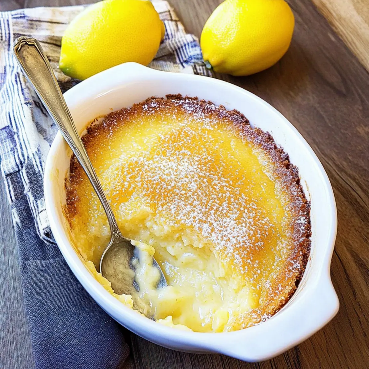 Jump to Recipe Print RecipeAs I stood in my kitchen, the scent of zesty lemons wafting through the air, I felt an instant wave of comfort and joy; there’s something undeniably magical about baking a dessert that promises both warmth and nostalgia. Jamie Oliver’s Self Saucing Lemon Pudding encapsulates that feeling perfectly. This British dessert is a delightful blend of a light sponge and a gooey, sweet-tart lemon sauce waiting just below the surface. What I love most about this recipe is its effortless preparation and ability to make any meal feel special. In just a short time, you can create a comforting treat that feels like a warm hug on a plate. Are you ready to transform your dessert experience with this citrus wonder? Let’s dive in! Why is This Lemon Pudding Irresistible? Comforting and Nostalgic: This pudding reminds us of childhood treats, delivering the warmth of home-baked love. Effortless Preparation: With simple steps and common ingredients, it’s a breeze to make, even for beginner bakers. Gooey Goodness: The luscious lemon sauce beneath a light sponge creates a delightful taste and texture experience. Versatile Delight: Serve it plain, or elevate with a scoop of vanilla ice cream or whipped cream for a decadent twist. Quick Baking Time: Ready in just 45 minutes, you can satisfy your sweet tooth without the wait! Embrace this classic British dessert and create moments of joy with every spoonful. Don’t forget to check out our Serving Suggestions for some scrumptious ideas! Jamie Oliver Self Saucing Lemon Pudding Ingredients For the Batter Butter (55 g / 1/4 cup) – Adds richness and moisture to the pudding; use unsalted butter for better control over salt levels. Sugar (115 g / 1/2 cup) – Sweetens the pudding and helps achieve a fluffy texture; can substitute with coconut sugar for a lower glycemic index. Lemon (1 whole; zest & about 3 tablespoons juice) – Provides a fresh, zesty flavor; use fresh lemons for zest and juice to avoid artificial flavors. Eggs (2 large free-range) – These provide structure and leavening; free-range eggs enhance flavor and texture. Self-Raising Flour (55 g / 1/2 cup) – Contributes to the sponge’s light texture; all-purpose flour can be used with added baking powder (1½ tsp per cup). Milk (285 ml / 1 1/4 cups) – Combines with other ingredients to form the batter; whole milk lends more creaminess, and alternatives like almond milk can be used for a dairy-free option. Step‑by‑Step Instructions for Jamie Oliver Self Saucing Lemon Pudding Step 1: Preheat Your Oven Begin by preheating your oven to 200ºC (400ºF) or gas mark 6. While the oven is heating, take a 1.5-liter ovenproof dish and generously grease it with unsalted butter to prevent sticking. This will prepare the vessel for your delightful Jamie Oliver Self Saucing Lemon Pudding, ensuring an easy release after baking. Step 2: Cream Butter and Sugar In a mixing bowl, place the 55 g of unsalted butter and 115 g of sugar. Using an electric mixer, beat these together until the mixture is pale and fluffy, which should take about 3-5 minutes. Add the grated zest of your lemon to this creamy mixture, infusing it with a fresh, zesty aroma that gets you excited for the baking ahead. Step 3: Incorporate Yolks and Flour Carefully separate the two large eggs, placing the whites in a clean bowl for later. Add the yolks to your butter-sugar mixture one at a time, blending well after each addition. Next, sift 55 g of self-raising flour into the mixture gradually while mixing until the batter becomes smooth. This step will help ensure a light texture in your pudding. Step 4: Add Milk and Juice Stir in 285 ml of milk and about 3 tablespoons of freshly squeezed lemon juice to the batter, mixing well until combined. The batter should now be runny and pourable. This mixture’s velvety consistency is crucial for achieving that self-saucing magic in your Jamie Oliver Self Saucing Lemon Pudding. Step 5: Beat Egg Whites Now, return to the egg whites you set aside. Using a clean whisk or electric mixer, beat them until they form stiff peaks, which may take 3-4 minutes. This step is key—gently fold the whipped egg whites into the lemon mixture using a spatula to keep your batter airy and fluffy, ensuring a wondrous contrast with the luscious sauce. Step 6: Prepare for Baking Pour the airy lemon batter into the greased ovenproof dish, smoothing the top with a spatula. To create a gentle baking environment, place the dish in a roasting tin. Add boiling water to the tin until it reaches about one-third of the way up the dish. This water bath is essential for even cooking and results in a beautifully textured dessert. Step 7: Bake Slide the roasting tin into the preheated oven and bake the pudding for 45 minutes. Look for a lovely golden top with a slight wobble in the center to indicate it’s done. This method will yield a crispy sponge atop a sweet, gooey lemon sauce, perfectly embodying the essence of Jamie Oliver Self Saucing Lemon Pudding. Step 8: Serve Once baked, remove the pudding from the oven and let it sit for a couple of minutes. Serve warm, and consider pairing it with a dollop of whipped cream or a scoop of vanilla ice cream to enhance its comforting flavors. Get ready to indulge in the delightful taste of this classic British dessert! How to Store and Freeze Jamie Oliver Self Saucing Lemon Pudding Room Temperature: Consume fresh if possible; the pudding can be left out for a few hours but is best enjoyed warm for the ultimate experience. Fridge: Store leftovers in an airtight container for up to 3 days. Note that the lemon sauce may absorb slightly into the sponge over time; simply reheat before serving. Freezer: Wrap tightly in plastic wrap or foil and freeze for up to 1 month. When ready to enjoy, thaw overnight in the fridge and reheat gently in the oven or microwave. Reheating: For best results, warm the pudding in a preheated oven at 150ºC (300ºF) for about 10-15 minute