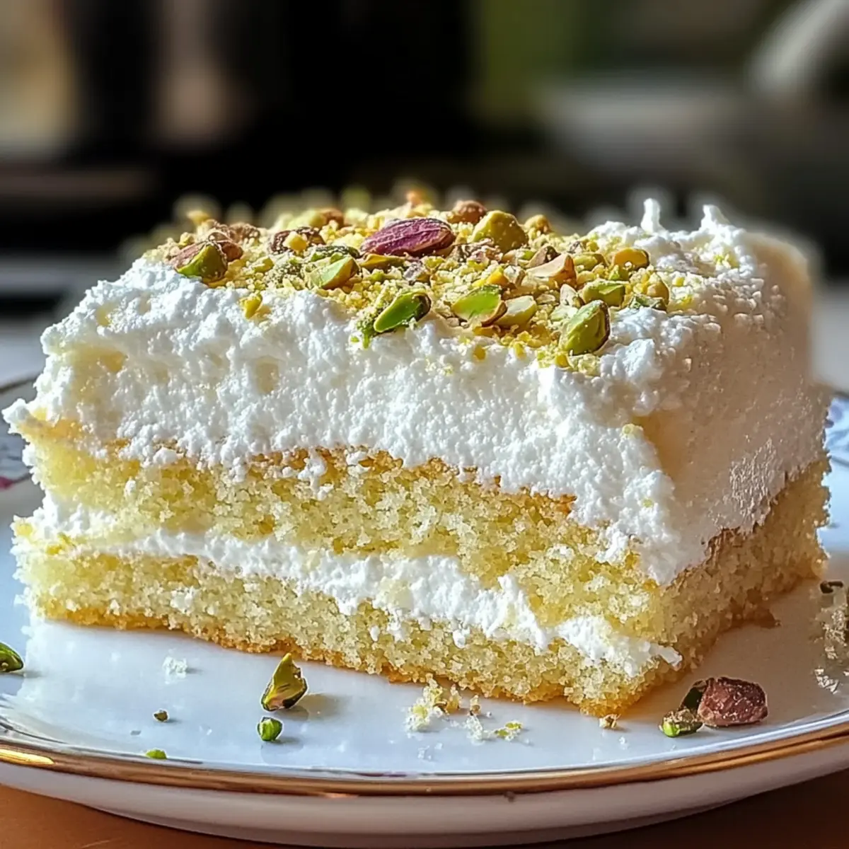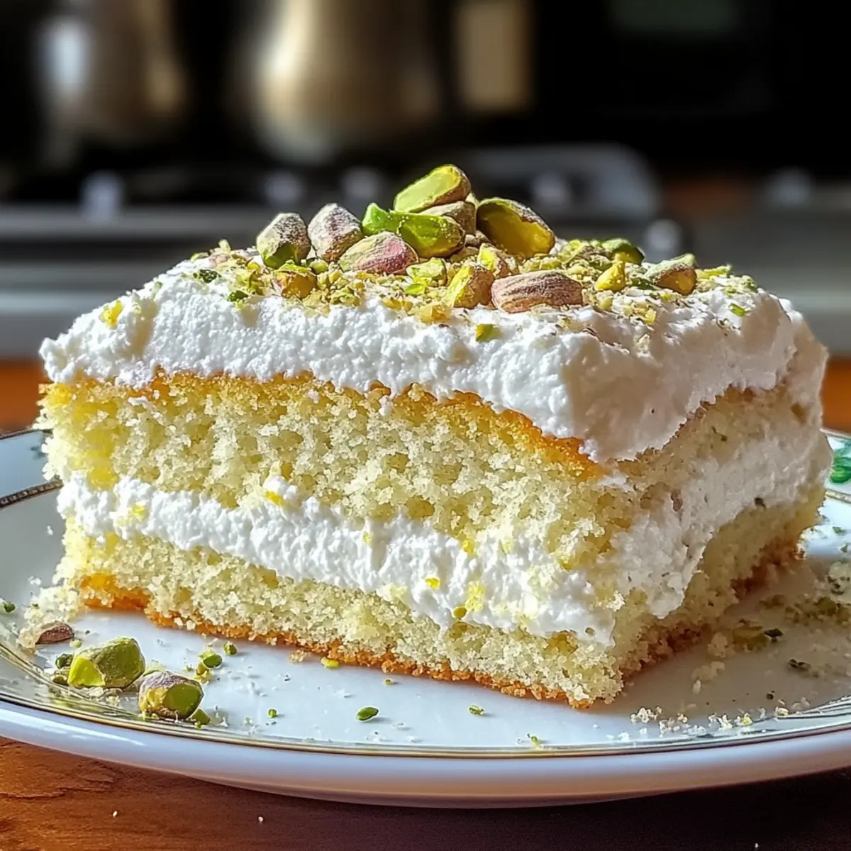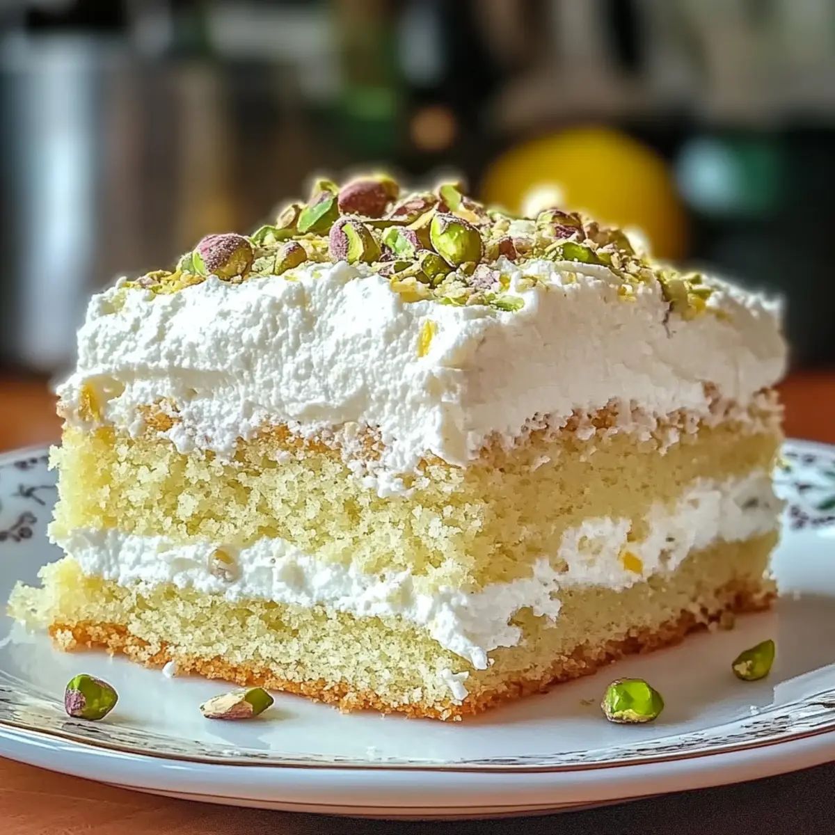 Jump to Recipe Print RecipeStepping into my kitchen one sunny afternoon, the scent of bright lemons whisked me away to sun-drenched Italian coastlines. As I mixed together my latest creation, the Lemon Pistachio Ricotta Cloud Cake, I felt a mix of excitement and curiosity. This dessert is not just a treat; it’s a harmonious blend of tangy lemons, creamy ricotta, and crunchy pistachios, ready to transport you to a delightful brunch or an elegant tea party. Plus, it’s surprisingly easy to prepare, making it the perfect showstopper for both seasoned bakers and those looking to impress without stress. Imagine serving this beautifully airy cake to guests, its vibrant flavors sparking joy with each slice. Ready to elevate your dessert game? Let’s dive into making this cloud-like masterpiece! Why is this cake a must-try? Light and Airy: This Lemon Pistachio Ricotta Cloud Cake is a delightful blend of textures, making it a unique dessert experience. Bright Flavors: The zesty lemon pairs perfectly with creamy ricotta, resulting in a refreshing treat. Easy to Make: With simple steps, even novice bakers can impress their guests without breaking a sweat. Versatile Options: Tailor it to your taste; swap pistachios for almonds or add chocolate chips for a different flair! Stunning Presentation: Its elegant look makes it an eye-catching centerpiece for brunch tables. Serve this at your next gathering, and watch it disappear! Lemon Pistachio Ricotta Cloud Cake Ingredients For the Cake Ricotta Cheese – Provides creaminess and moisture; cottage cheese can work as a lighter option. Granulated Sugar – Adds sweetness; consider using a sugar substitute for a low-calorie version. Eggs – Acts as a binder and contributes richness; no substitutions recommended for structure. All-Purpose Flour – Gives structure to the cake; for a gluten-free option, try a 1:1 gluten-free flour blend. Unsalted Butter – Contributes richness and moisture; coconut oil can be a good dairy-free substitute. Lemon Zest & Juice – Introduces bright tanginess; you can switch with other citrus like orange or lime. Vanilla Extract – Enhances overall flavor; no substitutes are suggested for the best taste. Baking Powder & Salt – Provide leavening and enhance flavor; freshness is key for optimal rise. Chopped Pistachios – Adds delightful crunch and a unique flavor; can be replaced with chopped almonds or walnuts. For Dusting Powdered Sugar – Optional for a beautiful finishing touch on your Lemon Pistachio Ricotta Cloud Cake. Step‑by‑Step Instructions for Lemon Pistachio Ricotta Cloud Cake Step 1: Preheat the Oven Begin by preheating your oven to 350°F (175°C). While the oven warms up, prepare a 9-inch round cake pan by greasing it with unsalted butter. For extra measures, line the base with parchment paper to ensure easy removal of the cake after baking. Step 2: Cream the Ricotta In a large mixing bowl, combine the ricotta cheese and granulated sugar. Using an electric mixer, beat the mixture on medium speed until it becomes smooth and fluffy, roughly 2-3 minutes. This step is crucial as it introduces air into the batter, contributing to the light texture of your Lemon Pistachio Ricotta Cloud Cake. Step 3: Incorporate the Eggs Next, add the eggs one at a time into the ricotta mixture, mixing well after each addition. This process should take another 2-3 minutes as you want the eggs fully integrated, resulting in a rich and smooth cake batter. The eggs will act as a binder, enhancing the cake’s structure. Step 4: Add Flavor Elements Now, stir in the melted unsalted butter, lemon zest, lemon juice, and vanilla extract until completely combined. The vibrant lemon juice and zest will infuse your batter with refreshing tanginess, setting the perfect foundation for the Lemon Pistachio Ricotta Cloud Cake’s flavor profile. Step 5: Combine Dry Ingredients In a separate bowl, whisk together the all-purpose flour, baking powder, and salt. This ensures even distribution of the leavening agents. Gradually add the dry mixture to the wet ingredients, stirring gently until just combined. Be careful not to overmix, as this can lead to a denser cake. Step 6: Fold in the Pistachios With the batter complete, gently fold in the chopped pistachios using a spatula. This adds a delightful crunch to your cake while maintaining its light texture. Aim for even distribution without overmixing to keep the cake airy and fluffy. Step 7: Prepare for Baking Carefully pour the batter into the prepared cake pan, smoothing the top with a spatula for an even surface. This will help your Lemon Pistachio Ricotta Cloud Cake rise evenly during baking, ensuring a lovely golden-brown crust on top. Step 8: Bake the Cake Place the cake in the preheated oven and bake for 30-35 minutes, or until the top is golden brown and a toothpick inserted into the center comes out clean. Keep an eye on it toward the end to avoid overbaking, which can compromise its airy texture. Step 9: Cool and Serve Once baked, allow the Lemon Pistachio Ricotta Cloud Cake to cool in the pan for about 10 minutes. After cooling, carefully transfer it to a wire rack to cool completely. Dust the top with powdered sugar and garnish with extra pistachios for an elegant presentation before serving. Expert Tips for Lemon Pistachio Ricotta Cloud Cake Drain the Ricotta: Ensure you properly drain the ricotta to avoid excess moisture, which can make your cake dense instead of light and fluffy. Don’t Overmix: Be gentle when combining the flour mixture with the wet ingredients. Overmixing can lead to a dense Lemon Pistachio Ricotta Cloud Cake, so mix just until combined. Check Baking Powder Freshness: Use fresh baking powder for the best rise. Old baking powder can hinder the cake’s light texture, resulting in disappointing results. Cool Gradually: Allow the cake to cool in the pan before transferring it to a wire rack. This helps set the structure without cracking the cake. Garnish Thoughtfu