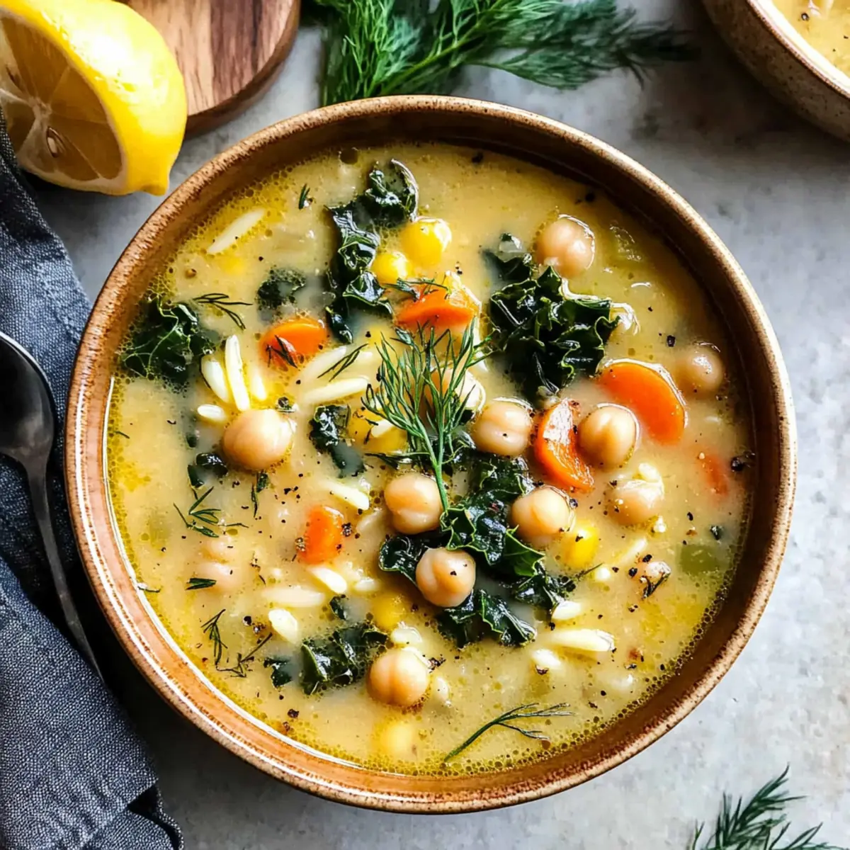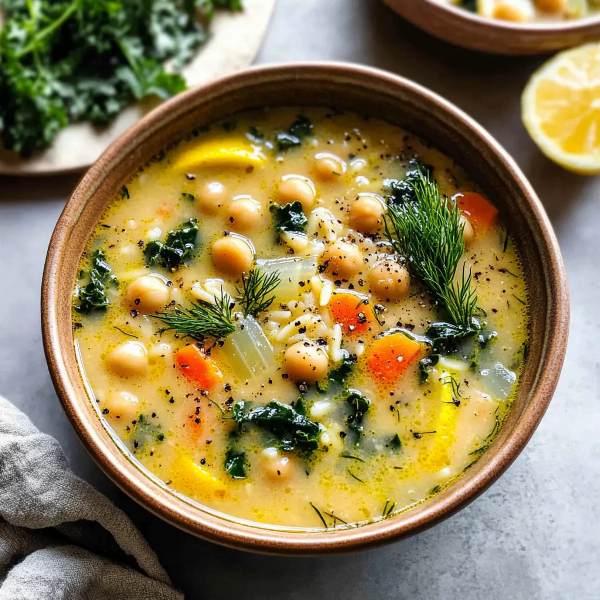 Jump to Recipe Print RecipeAs I ladled the steaming Lemony Greek Chickpea Soup into bowls, a waft of zesty lemon and fragrant dill filled my kitchen, instantly uplifting my spirits. Inspired by the traditional Avgolemono, this cozy vegetarian dish blends fresh vegetables, hearty orzo, and protein-rich chickpeas into a soothing broth that comes together in just over 30 minutes. It’s the perfect solution on a busy weeknight or whenever you crave a light yet nourishing meal. Not only is this soup packed with wholesome ingredients, but it also delivers a wonderful depth of flavor that satisfies. Are you ready to whip up a bowl of this Mediterranean delight for yourself? Why is this soup a must-try? Convenience: This Lemony Greek Chickpea Soup can be on your table in just over 30 minutes, making it ideal for busy weeknights. Vibrant Flavors: The zesty lemon and aromatic dill brighten up the hearty broth, offering a delightful taste experience. Nutrient-Rich: Packed with protein from chickpeas and vitamins from greens, this soup is a nourishing option that doesn’t skimp on health. Versatility: Feel free to adapt the ingredients—try adding spinach or swapping orzo for quinoa for a gluten-free twist. You can even serve it alongside a refreshing Greek Yogurt Raspberry muffin for a complete meal! Crowd-Pleaser: Whether it’s a family dinner or a lunch gathering, this comforting soup is sure to impress everyone at your table. Lemony Greek Chickpea Soup Ingredients Get ready to create a delightful and nourishing bowl that’s easy to make! For the Base Extra-Virgin Olive Oil – Provides healthy fat and flavor; substitute with avocado oil for a slightly different taste. Yellow or Sweet Onion – Adds aromatic sweetness to the base of the soup; no substitution needed. Carrots – Contributes sweetness and texture; swap with parsnips for a unique twist. Celery – Adds crunch and depth; fennel can work in a pinch if needed. Lemon Peel & Juice – Provides that essential lemony flavor; fresh lemons make all the difference! Garlic – Enhances flavor with its aromatic essence; use garlic powder in a pinch. For the Soup Vegetable Broth – Serves as the soup’s base; opt for low-sodium versions for a healthier choice. Canned Chickpeas – Offers protein and creaminess; feel free to replace with white beans for a change. Dry Orzo Pasta – Adds heartiness to the soup; consider quinoa or gluten-free pasta for gluten sensitivity. Kosher Salt & Black Pepper – Essential for seasoning; adjust according to your taste preferences. Dried Oregano – Adds a lovely earthy Mediterranean flavor; Italian seasoning works if you don’t have oregano. For Richness Whole Eggs & Egg Yolks – Provide richness and a creamy texture; for vegan options, use blended silken tofu instead. For Nutrients Kale – Adds color and vital nutrients to the dish; spinach or Swiss chard are great alternatives. Fresh Dill – Elevates the flavor profile; substitute with parsley or thyme if needed. This Lemony Greek Chickpea Soup is brimming with wholesome goodness, and it’s perfect for any time you want a bright, nourishing meal! Step‑by‑Step Instructions for Lemony Greek Chickpea Soup Step 1: Sauté the Vegetables In a large stockpot, heat 2 tablespoons of extra-virgin olive oil over medium heat. Add 1 chopped yellow onion, 2 diced carrots, and 2 stalks of chopped celery along with the peel of 1 lemon. Cook for 8–10 minutes, stirring occasionally, until the vegetables are softened and the onion is translucent. Step 2: Add Garlic Once the vegetables are softened, stir in 3 minced garlic cloves and cook for an additional minute, allowing the garlic to release its aromatic fragrance. Keep stirring until the garlic becomes golden but not browned, as this will enhance the flavor for your Lemony Greek Chickpea Soup. Step 3: Pour in the Broth Pour in 6 cups of vegetable broth and increase the heat to bring the mixture to a vigorous boil. You’ll know it’s ready when large bubbles rise to the surface, creating a lively cooking environment perfect for infusing bold flavors into the broth. Step 4: Add Chickpeas and Orzo Once boiling, add 1 can of drained and rinsed chickpeas, 1 cup of dry orzo pasta, and season with kosher salt and black pepper to taste, along with 1 teaspoon of dried oregano. Reduce the heat to a simmer and cook for about 10 minutes, or until the orzo is al dente and tender. Step 5: Set Aside Some Broth After the orzo is cooked, carefully remove 3/4 cup of the hot broth from the pot and set it aside in a small bowl. This will be used to temper the eggs, so keep it warm while you prepare the egg mixture. Step 6: Whisk the Egg Mixture In a separate bowl, whisk together 2 whole eggs and 2 egg yolks with the juice of 1 lemon. Gradually temper the eggs by slowly streaming in the reserved hot broth while whisking continuously. This technique ensures a creamy texture without scrambling the eggs, which is crucial for your soup. Step 7: Incorporate Egg Mixture With the heat on low, pour the tempered egg mixture back into the soup. Stir gently with a wooden spoon, allowing the rich, lemony broth to envelop the chickpeas, orzo, and vegetables, creating a beautifully creamy consistency in your Lemony Greek Chickpea Soup. Step 8: Add Greens Toss in 2 cups of chopped kale and let it cook on low for about 5 minutes. Stir occasionally until the kale is wilted and tender, infusing the soup with nutrients and a pop of color that complements the dish beautifully. Step 9: Final Touches Before serving, remove the lemon peels and stir in 1/4 cup of chopped fresh dill. Give the soup a taste and adjust the seasonings with more salt, pepper, or lemon juice as needed to achieve the perfect balance of flavors. Your Lemony Greek Chickpea Soup is now ready to delight! Lemony Greek Chickpea Soup Variations Feel free to get creative with this Lemony Greek Chickpea Soup to make it your own delightful creation! Protein Swaps: Replace chickpeas