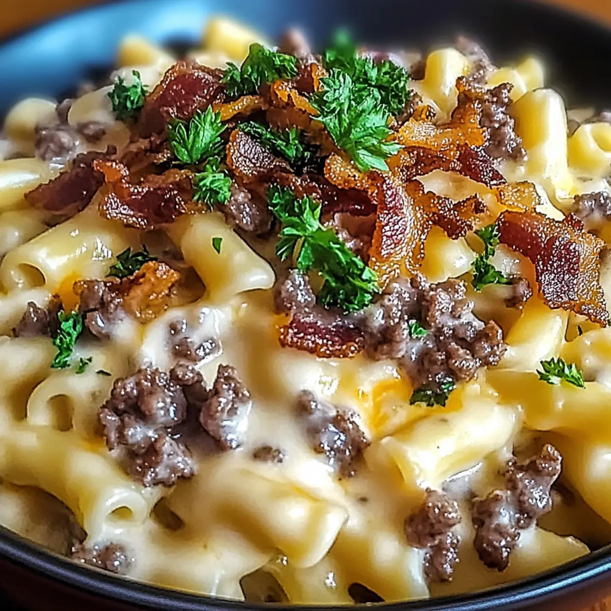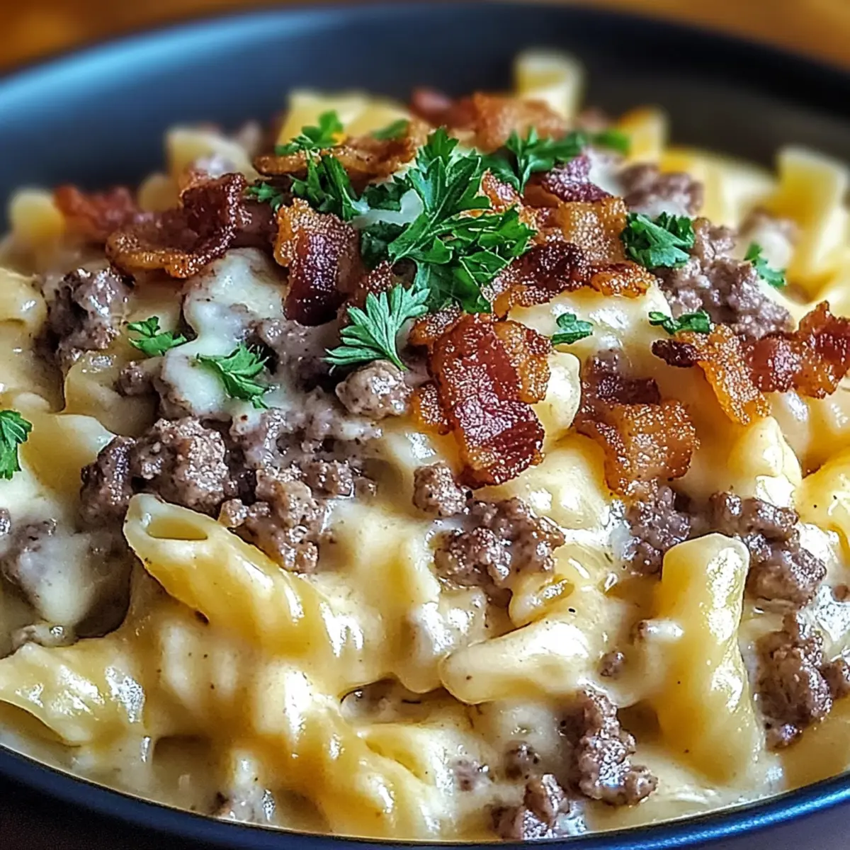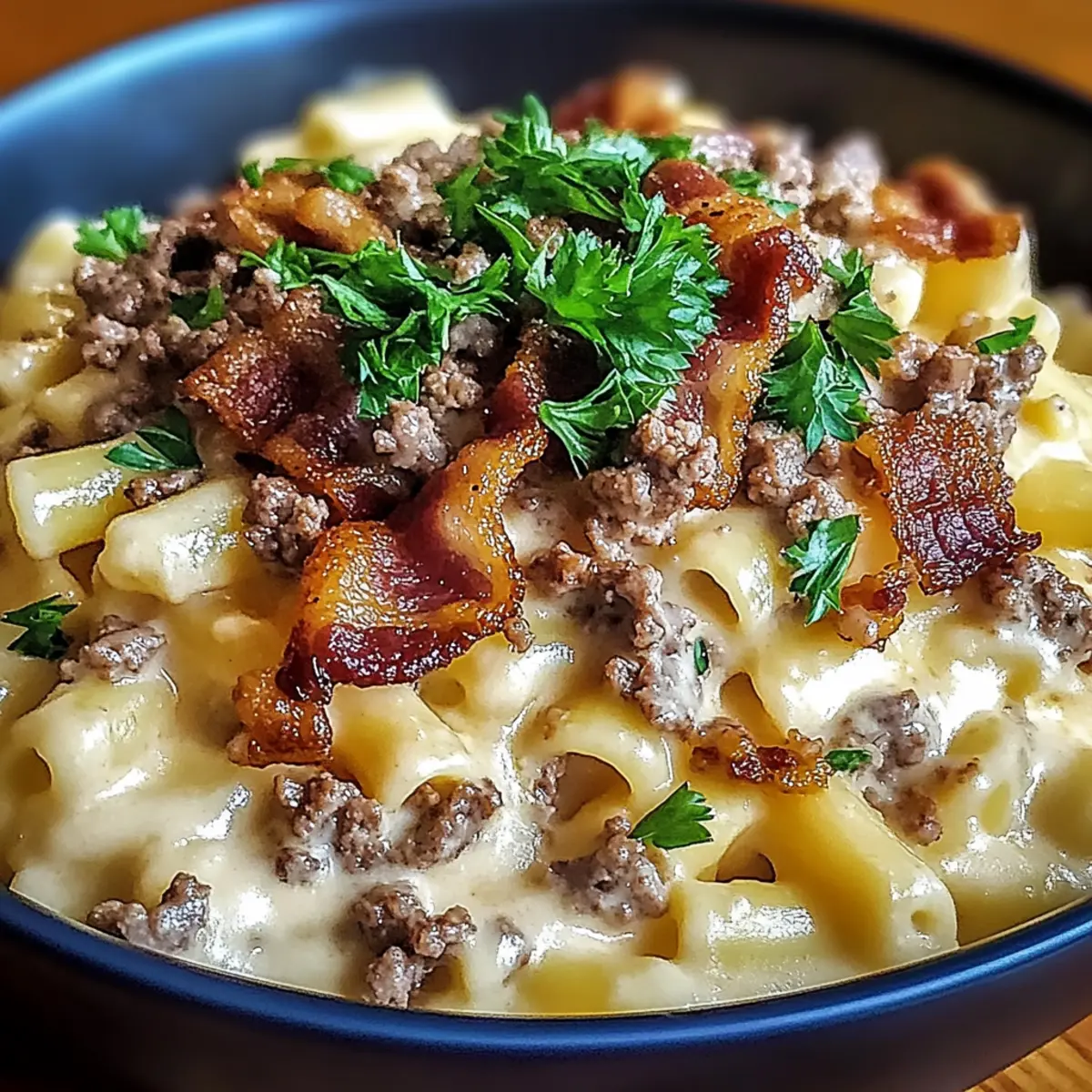 Jump to Recipe Print RecipeAs I grabbed my apron and stepped into the kitchen, the thought of creamy Loaded Bacon Cheeseburger Alfredo Pasta kept dancing in my mind. This delightful dish perfectly combines the classic comfort of a cheeseburger with the lusciousness of pasta—making it ideal for any busy weeknight. Not only can this satisfying recipe be whipped up in under 30 minutes, but it also allows for countless customizations to cater to every palate. Whether you prefer turkey bacon, whole wheat pasta, or an extra sprinkle of cheese, this dish can easily fit your dietary needs while still delivering on that home-cooked goodness. Isn’t it amazing how a simple meal can be so comforting and versatile? Ready to embark on this culinary adventure together? Let’s dive into the recipe! Why Is This Pasta Recipe Irresistible? Satisfying Comfort: Combining the heartiness of cheeseburgers with creamy pasta, this dish is pure comfort in a bowl. Quick to Prepare: With a cooking time of under 30 minutes, it’s perfect for busy weeknights when you crave something delicious. Customizable Options: Whether you opt for turkey bacon or a gluten-free pasta, the flexibility of this recipe means everyone can enjoy it. Flavor Explosion: Rich with cheese and smoky bacon, each bite brings a burst of flavor that keeps you coming back for more. Crowd-Pleaser: This dish is sure to impress family or guests, making it a fantastic choice for gatherings. If you love comforting meals, don’t forget to try the Tomato Zucchini Pasta for another twist on comfort food! Loaded Bacon Cheeseburger Alfredo Pasta Ingredients For the Pasta • Pasta – Choose a sturdy shape like rotini or bow ties for better sauce adhesion. For the Meat • Bacon – Adds that crispy, smoky touch; consider turkey bacon for a healthier alternative. • Ground Beef – The heart of this dish; use lean ground beef to keep it rich yet light. For the Sauce • Onion – Brings sweetness and depth; try shallots for a milder flavor. • Garlic – Fresh garlic enhances aroma and taste; ensure it’s finely minced for a well-rounded flavor. • Heavy Cream – Creates a luscious, creamy sauce; half-and-half is a lighter option. • Beef Broth – Infuses savory notes; swap for vegetable broth for a vegetarian twist. • Worcestershire Sauce – Introduces umami flavors; tamari serves as a gluten-free alternative. • Cheddar Cheese – Offers sharp creaminess; experiment with smoked gouda for a unique twist. • Parmesan Cheese – Adds depth and saltiness; Grana Padano can be a lovely substitute. • Salt and Pepper – Essential for balancing flavors; always adjust to your taste preference. For the Garnish • Fresh Parsley – Adds vibrant color and freshness; basil or chives work wonders too. • Jalapeños (Optional) – For those who like a kick of heat; can be swapped with red pepper flakes if desired. This Loaded Bacon Cheeseburger Alfredo Pasta dish is sure to satisfy your cravings with its rich flavors and creamy texture, making it a go-to comfort food. Step‑by‑Step Instructions for Loaded Bacon Cheeseburger Alfredo Pasta Step 1: Boil the Pasta In a large pot, bring salted water to a rolling boil. Add your favorite pasta, such as rotini or bow ties, and cook until al dente, approximately 10-12 minutes; it should be tender but still firm to the bite. Once cooked, drain the pasta and return it to the pot, keeping it warm and ready for the Loaded Bacon Cheeseburger Alfredo Pasta sauce. Step 2: Cook the Bacon In a skillet over medium heat, add chopped bacon and cook until it’s crispy and golden brown, about 6-8 minutes. Make sure to stir occasionally for even cooking. Once crispy, carefully drain the bacon on paper towels to absorb excess grease, leaving the flavorful drippings in the skillet for added richness in your dish. Step 3: Sauté the Beef Increase the skillet heat to medium-high and add the ground beef to the remaining drippings. Season it with salt and pepper, breaking it apart with a spatula. Cook until browned and fully cooked, about 5-7 minutes, ensuring there are no pink spots. Once done, remove the cooked beef from the skillet and set it aside along with the bacon. Step 4: Sauté Aromatics In the same skillet, lower the heat back to medium and add diced onion and minced garlic. Sauté them until the onion becomes translucent and fragrant, about 3-4 minutes, scraping up any brown bits from the bottom to enhance the flavor. This step is crucial for building the delicious base of the Loaded Bacon Cheeseburger Alfredo Pasta sauce. Step 5: Create the Sauce Reduce the heat to a gentle simmer and pour in the heavy cream, beef broth, and Worcestershire sauce. Stir the mixture well and allow it to simmer for about 5 minutes until slightly thickened, ensuring the flavors meld beautifully. The creamy, savory sauce will be the perfect backdrop for our pasta dish. Step 6: Add Cheeses Continue stirring and whisk in the cheddar and Parmesan cheeses until fully melted and the sauce is creamy and smooth. If the sauce appears too thick, you can adjust the consistency by adding a splash of beef broth or cream. Taste your sauce and adjust the seasoning with salt and pepper as needed before adding the pasta. Step 7: Combine Everything Now, toss the cooked pasta, browned beef, and crispy bacon into the creamy Alfredo sauce. Gently mix everything until the pasta is well-coated in that rich sauce. Let it warm through for about 2-3 minutes so all the ingredients meld together beautifully, resulting in a delightful Loaded Bacon Cheeseburger Alfredo Pasta. Step 8: Serve and Garnish Once everything is heated through, serve the Loaded Bacon Cheeseburger Alfredo Pasta hot. For a finishing touch, garnish with freshly chopped parsley and, if desired, sliced jalapeños for those who crave a bit of heat. Enjoy this comforting dish right away for the best experience! What to Serve with Loaded Bacon Cheeseburger Alfredo Pasta Elevate your meal experie