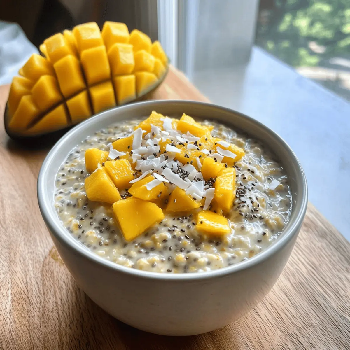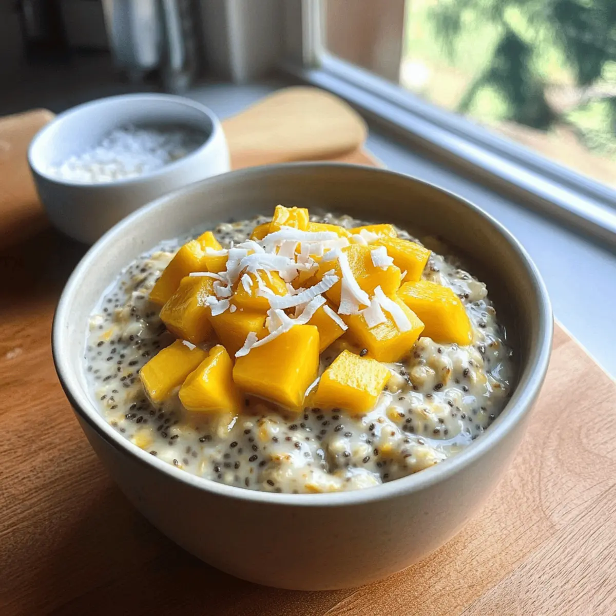 Jump to Recipe Print RecipeAs I sank into the cozy morning routine, I couldn’t help but overhear my friend raving about her latest obsession—Mango Overnight Oats! Intrigued, I decided to whip up my own batch, and let me tell you, it transformed my breakfast game completely. Creamy, refreshing, and packed with nutrients, these oats offer a delightful tropical twist that makes busy mornings feel special. Perfect for meal prep, Mango Overnight Oats are not only quick to assemble but also a healthy way to fuel your day, with fiber and protein working hard to keep you satisfied. So, if you’re tired of the same old breakfast, why not indulge in a taste of sunshine? Ready to dive into the recipe and add some excitement to your mornings? Why are Mango Overnight Oats a Must-Try? Convenience: This recipe is perfect for your busy mornings! Simply prepare the night before, and you’ll have a nutritious breakfast ready to go. Tropical Flavor: Bursting with sweet mango, these oats offer a refreshing escape from traditional flavors, making every bite feel like a treat. Healthy Benefits: Packed with fiber and omega-3s from chia seeds, they provide essential nutrients to kickstart your day. Customizable: While the mango version is delightful, feel free to mix it up! Try adding berries or even experimenting with different spices for a unique twist, just like in my Mango Cookies Delightful recipe! Meal Prep Champion: Enjoy them for breakfast, a mid-day snack, or even dessert—these oats fit seamlessly into any part of your day! Mango Overnight Oats Ingredients For the Base • Rolled Oats – The hearty foundation providing fiber and texture. • Chia Seeds – These little powerhouses thicken your oats and are high in omega-3 fatty acids. For the Liquid • Unsweetened Vanilla Almond Milk – Creamy and lightly sweet; can swap for any non-dairy milk or regular milk. For the Sweetness • Maple Syrup – Adds a touch of natural sweetness; agave or honey are great alternatives. • Sea Salt – Just a pinch enhances all the flavors beautifully. For the Flavor Boost • Mango – Pureed for that fresh tropical taste; feel free to substitute with fruits like bananas or berries. • Vanilla Yogurt – Adds creaminess and probiotics; choose dairy or non-dairy as you prefer. • Cinnamon – Optional spice for warmth; a lovely addition for those who enjoy a little kick! For the Toppings • Shredded Coconut – For a chewy texture and extra tropical flair; omit for a lighter option. • Additional Mango – Top it off in the morning for that fresh burst of flavor! These Mango Overnight Oats are not just a meal—they’re a delicious way to brighten up your morning routine! Step‑by‑Step Instructions for Mango Overnight Oats Step 1: Assemble the Dry Ingredients In a medium bowl or jar, combine rolled oats, chia seeds, shredded coconut, cinnamon, and a pinch of sea salt. Stir them together until well mixed, ensuring an even distribution of flavors. This step sets a flavorful base for your Mango Overnight Oats, preparing the foundation for the creamy, tropical blend that will come next. Step 2: Add the Yogurt Now, add a dollop of vanilla yogurt to the center of the dry mixture in each jar. This yogurt not only adds creaminess but also a delightful tang that enhances the overall flavor. Gently fold it into the dry ingredients, ensuring that it begins to integrate without fully blending just yet. Step 3: Blend the Liquid Ingredients In a blender, pour in the unsweetened vanilla almond milk, then add the ripe mango chunks and maple syrup. Blend on high until the mixture is completely smooth and creamy, roughly 30-60 seconds. You’re looking for a vibrant, luscious puree that infuses your Mango Overnight Oats with sweetness and tropical flair. Step 4: Combine Everything Together Pour the blended mango mixture into the jars over the layered ingredients, ensuring to scrape down the sides of the blender to catch every bit of flavor. Use a spoon to stir everything together until all ingredients are thoroughly combined. You’ll notice the oats and chia seeds begin to absorb the liquid, which will thicken overnight. Step 5: Refrigerate Overnight Cover each jar tightly with a lid or plastic wrap, then place them in the refrigerator. Let the mixture chill for at least 4 hours, preferably overnight. This allows the flavors to meld and the oats to soften, transforming your mixture into a thick, creamy delight for a refreshing breakfast. Step 6: Serve with Fresh Toppings In the morning, remove your Mango Overnight Oats from the refrigerator. Top with additional mango slices, a sprinkle of shredded coconut, and a drizzle of your favorite nut butter for added texture and flavor. Enjoy your nutritious breakfast as a quick meal or a delightful snack to fuel your day! How to Store and Freeze Mango Overnight Oats Fridge: Keep your Mango Overnight Oats in airtight containers for up to 4 days. It’s the perfect meal prep solution for busy mornings! Freezer: For longer storage, freeze the jars without toppings for up to 3 months. Thaw in the fridge overnight before serving. Reheating: Enjoy your oats chilled, but if you prefer them warm, simply microwave for 30-60 seconds. Stir well before eating to ensure even warmth. Topping Storage: Store toppings like shredded coconut or extra mango separately to keep them fresh, adding them just before serving for the best texture. Make Ahead Options Mango Overnight Oats are a meal prep dream, perfect for busy mornings! You can prepare the entire recipe up to 3 days in advance, allowing the flavors to deepen and meld together beautifully. Simply follow the recipe instructions through Step 5, covering and refrigerating the jars overnight. To maintain the delicious quality, make sure to use airtight containers to prevent drying out. When you’re ready to enjoy your Mango Overnight Oats, just give them a good stir, and top with additional mango and shredded coconut for an extra burst of 