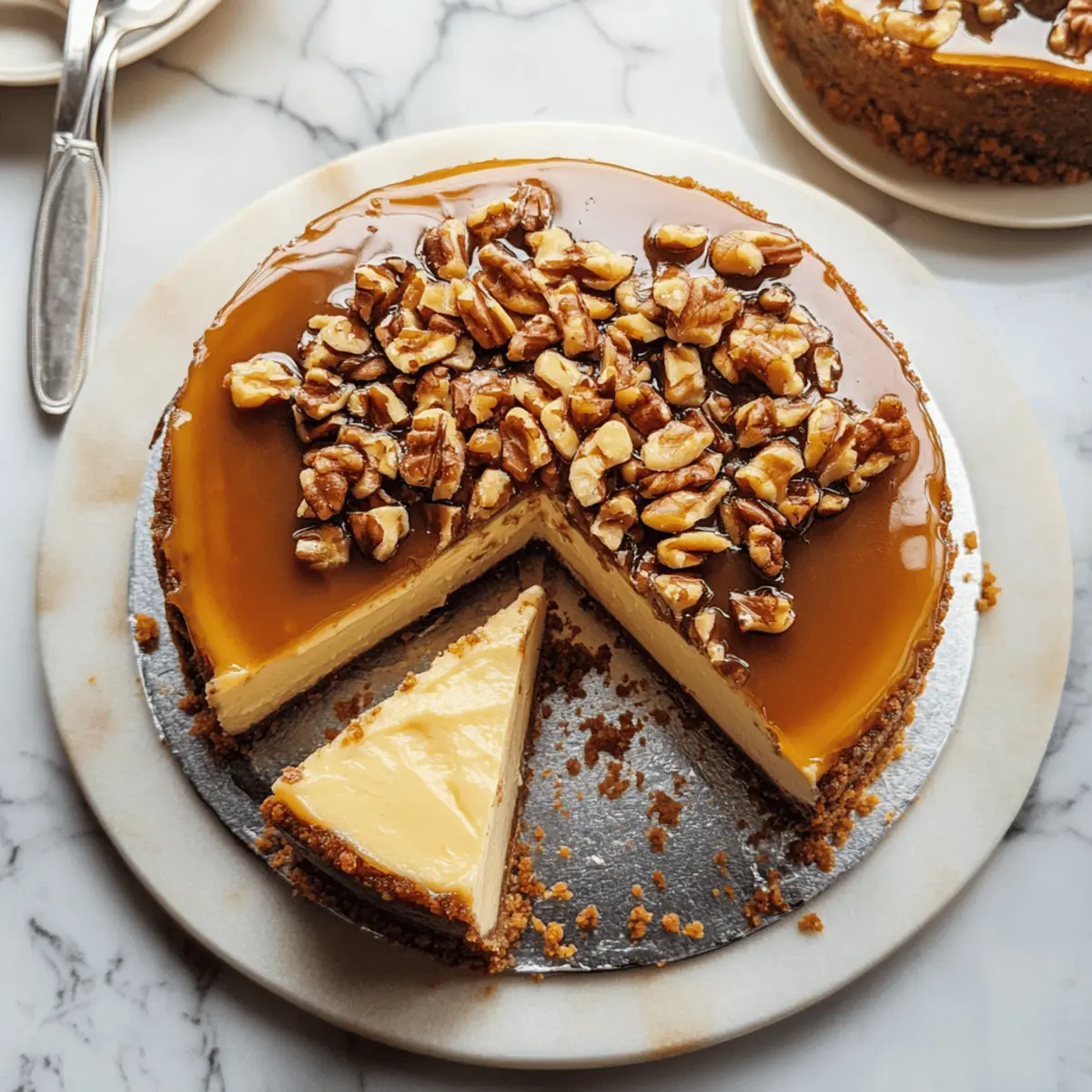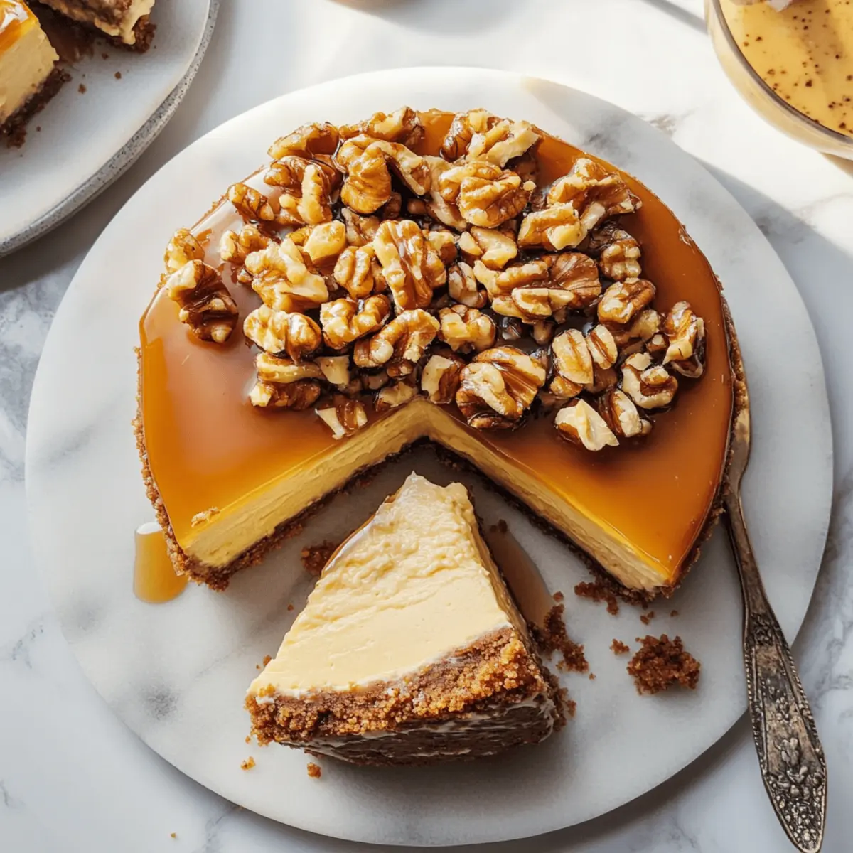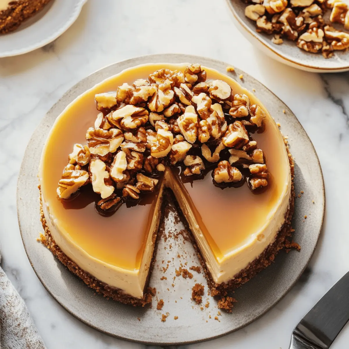 Let the topping cool slightly before pouring it generously over the chilled cheesecake. Slice and serve, making sure each piece has a luscious layer of gooey walnut goodness on top. Your guests will be wowed by this decadent Maple Walnut Cheesecake, perfect for any festive occasion!