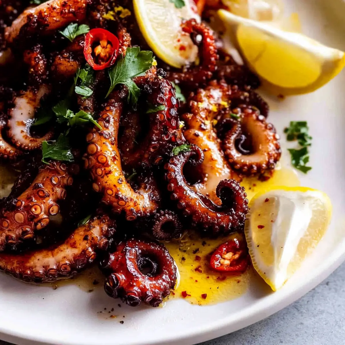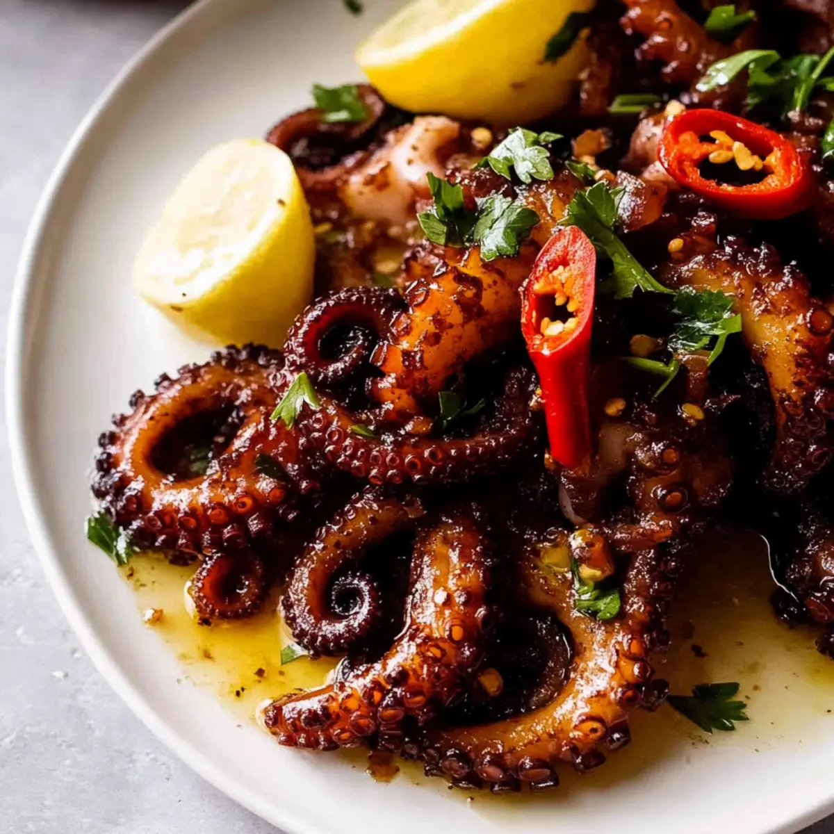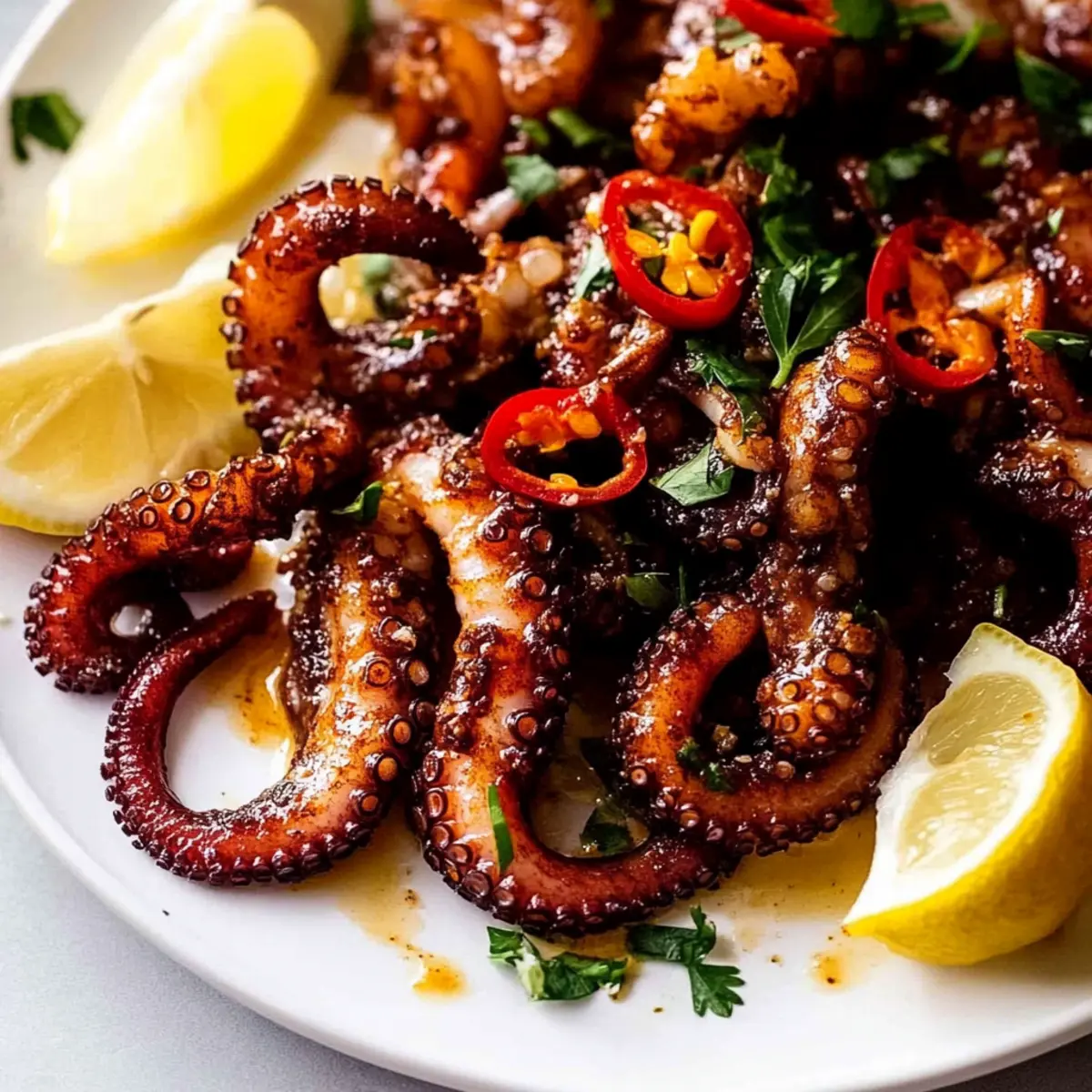 Jump to Recipe Print RecipeAs I stood by the stove, the enticing aroma of garlic and lemon wafted through the air, instantly transporting me to a sun-kissed Mediterranean shore. Today, I’m thrilled to share this simple yet remarkably flavorful recipe for crispy marinated baby octopus. This dish not only showcases the delightful tenderness of octopus but also immerses it in bold Mediterranean flavors that make each bite an adventure. Whether you’re a seasoned home chef or someone eager to elevate your culinary repertoire, this recipe is sure to impress. It’s quick to prepare and perfect for summer gatherings, pairing beautifully with a refreshing Greek salad and crispy bread to soak up those vibrant juices. Ready to transform your dinner table? Let’s dive in! Why make crispy marinated baby octopus? Deliciously Unique: This dish offers a one-of-a-kind twist to your seafood repertoire, bringing the vibrant flavors of the Mediterranean right to your kitchen. Simplicity: With just a few straightforward steps, even novice cooks can create this dish, proving that gourmet meals can be achievable at home. Crowd-Pleasing: Serve this crispy delicacy at your next gathering; it’s sure to wow your guests! Pair with a Greek salad for a complete feast. Flavor Explosion: The marination process allows the octopus to soak up zesty lemon juice and aromatic garlic, delivering an irresistible taste that lingers on your palate. Versatile Pairings: Whether enjoyed as an appetizer or a main course, this octopus dish adapts beautifully to any dining setting, making it an excellent choice for versatile meals! Crispy Marinated Baby Octopus Ingredients For the Braise Baby Octopus – The star of this dish; use fresh or frozen, thawed for best results. Water – Essential for tenderizing; create a braising liquid that infuses flavor. Onion – Halved for added sweetness in the braise; no need to peel! Garlic – Use smashed cloves during cooking for depth, and minced in the marinade for a punch. Black Peppercorns – Offers subtle heat; you can substitute with ground pepper if preferred. Cooking Salt (Kosher) – Key for enhancing the octopus flavor; don’t skip this! Lemon Juice – Brightens the dish; apple cider vinegar can be a great alternative. Parsley Stems – Adds herbal notes during braising; don’t toss away this flavor booster. Bay Leaves – Infuses depth; fresh or dried works beautifully here. For the Marinade Extra Virgin Olive Oil – Richness base for marinating; choose high-quality for best flavor. Lemon Zest – Amplifies the citrus profile, vivifying the overall taste of your marinated baby octopus! Dried Red Chilli Flakes – Optional but brings a delightful heat if you’re feeling adventurous! For Cooking and Serving Canola Oil – Ideal for grilling, giving the octopus that perfect crispy finish. Chopped Parsley & Sliced Red Chilli – Optional garnishes to elevate your dish’s presentation. Lemon Wedges – Serve alongside for an extra burst of tang and freshness. This recipe for Crispy Marinated Baby Octopus is not just a meal, it’s an experience, channeling the sunny vibes of the Mediterranean right to your table. Enjoy your culinary adventure! Step‑by‑Step Instructions for Crispy Marinated Baby Octopus Step 1: Braise the Octopus In a large pot, combine water, halved onion, smashed garlic cloves, black peppercorns, kosher salt, lemon juice, parsley stems, and bay leaves. Bring this mixture to a boil over medium-high heat, then add the baby octopus. After returning to a boil, reduce the heat to low and simmer gently for about 1 hour. Check for tenderness at 45 minutes; the octopus should be tender yet firm. Step 2: Drain and Prepare for Marinade Once the baby octopus is fully cooked, carefully drain it from the pot using a slotted spoon. Discard the aromatic ingredients, transferring the octopus into a bowl. Allow it to cool for a few minutes before proceeding to the next step. This preparation is essential for ensuring the marinade flavors can effectively infuse into your crispy marinated baby octopus. Step 3: Marinate In a separate bowl, whisk together extra virgin olive oil, minced garlic, lemon zest, and dried red chili flakes if using. Pour this marinade over the warm octopus, ensuring each piece is well-coated. Cover with plastic wrap and refrigerate the bowl, allowing the octopus to marinate for at least 12 hours, but preferably 24 hours for maximum flavor infusion. Step 4: Grill the Octopus When ready to cook, preheat your grill or stovetop skillet over medium-high heat. Brush the grill grates or skillet with canola oil to prevent sticking, then add the marinated baby octopus. Grill for about 3-5 minutes, rotating the octopus halfway through to achieve a beautiful golden-brown, crispy exterior. The octopus should be nicely charred and fragrant. Step 5: Serve Once perfectly grilled, transfer the crispy marinated baby octopus to a serving platter. Garnish with chopped parsley and sliced red chili for color, and serve alongside lemon wedges to add a fresh, zesty touch. This delicious dish pairs beautifully with crusty bread or a side of crushed potatoes, allowing you to soak up all the exquisite marinade flavors. Make Ahead Options These crispy marinated baby octopus are perfect for meal prep enthusiasts! You can braise the octopus ahead of time, allowing it to cool before transferring it to the refrigerator for up to 3 days. Once it’s ready, marinate the octopus in a mixture of olive oil, minced garlic, lemon zest, and optional chili flakes for flavor infusion; this can be done 12 to 24 hours before grilling. To maintain quality, store the marinated octopus in an airtight container, which helps keep the flavors vibrant and fresh. When you’re ready to serve, simply grill the octopus for 3-5 minutes until crispy, delivering restaurant-quality results with minimal effort! Variations & Substitutions for Marinated Baby Octopus Feel free to get creative with your prepa