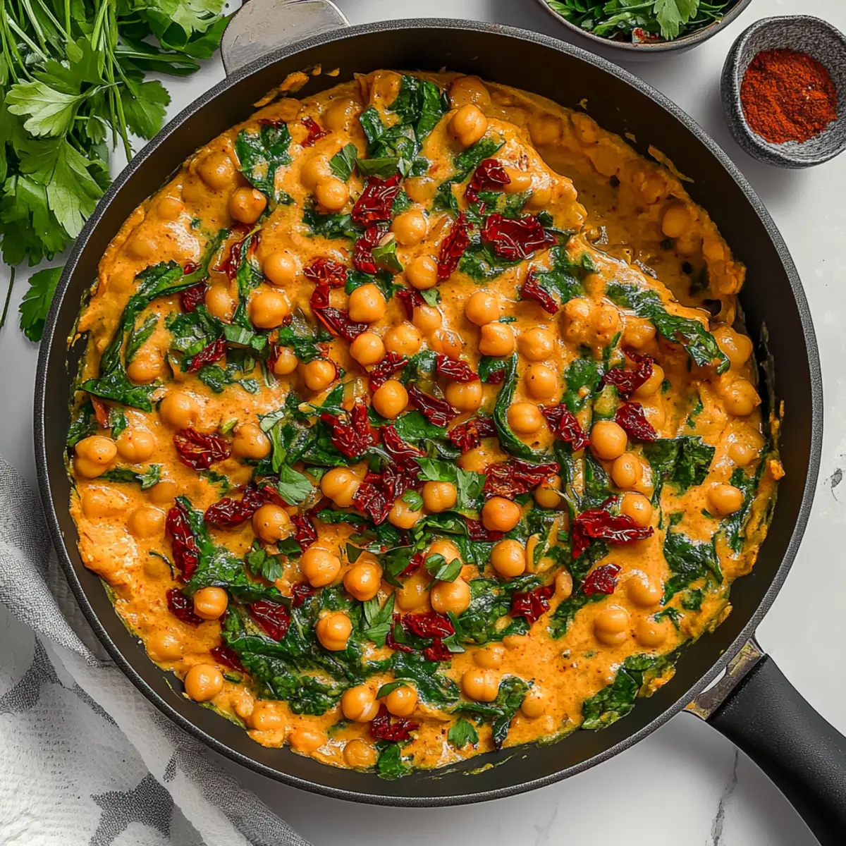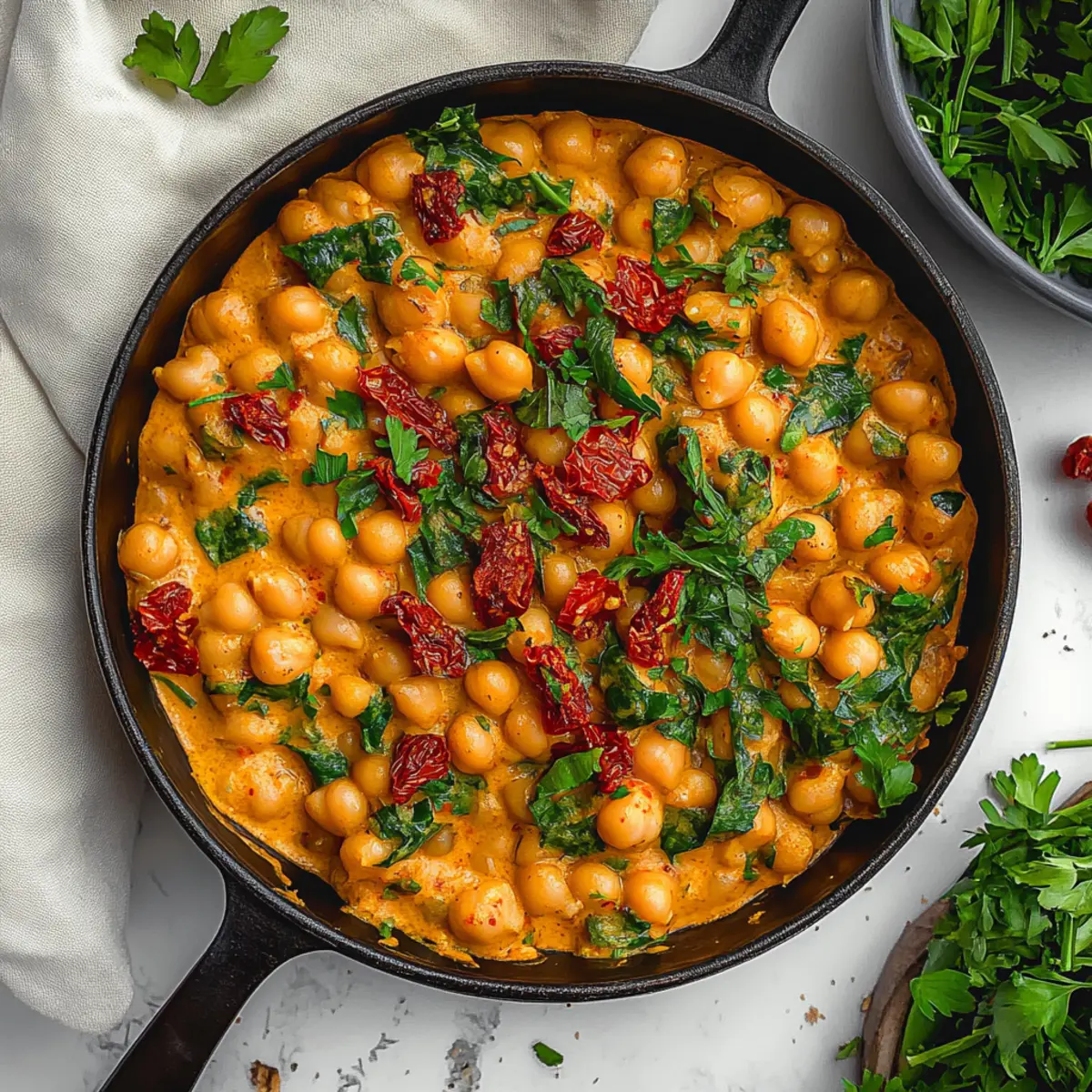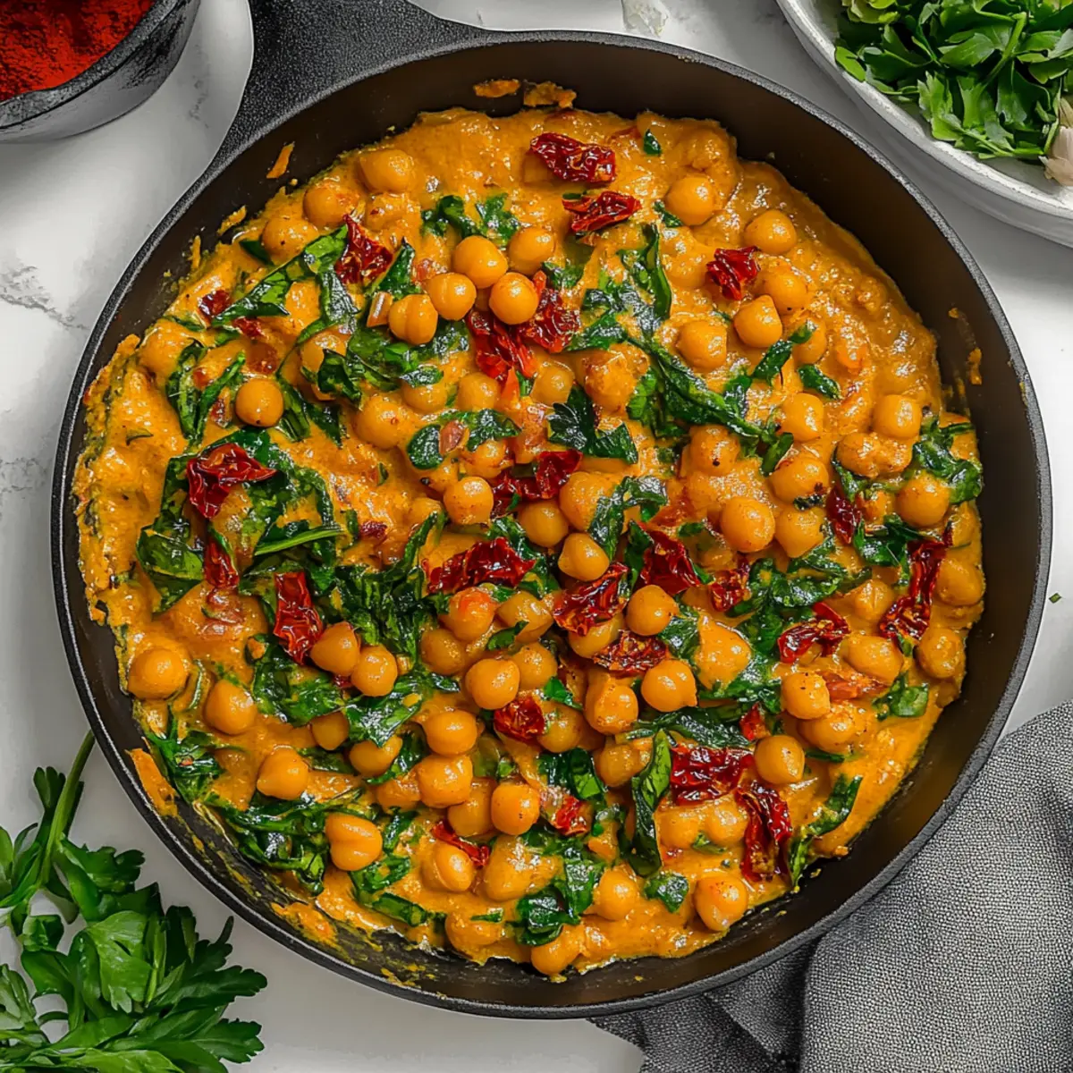 Jump to Recipe Print Recipe“What’s for dinner?” It’s a question that often sends a pang of dread through me, especially after a long day. That’s when I turn to my secret weapon: Marry Me Chickpeas. This creamy, vegan delight is not just a meal; it’s an experience, captivating the senses with its rich coconut milk and tangy sun-dried tomatoes. With minimal prep and cooking time, these chickpeas come together swiftly, making them the perfect option for busy weeknights or unexpected guests. They are vegan, gluten-free, and packed with flavor—guaranteeing that everyone at the table will be reaching for seconds. So, are you ready to embark on a culinary adventure that could quite possibly win hearts? Let’s dive into making this delightful dish! Why Will You Adore Marry Me Chickpeas? Simplicity: This recipe is incredibly user-friendly, requiring only basic ingredients and minimal cooking skills. Creamy Goodness: The luscious coconut milk combined with sun-dried tomatoes creates a rich, velvety sauce that envelopes the chickpeas in flavor. Crowd Pleaser: Perfect for family dinners or unexpected guests, everyone will be begging for the recipe! Quick and Easy: Whip this dish up in under 30 minutes, making it a lifesaver for hectic weeknights. Versatile: Feel free to add your favorite veggies or swap in different beans for a twist—this dish will always shine. Elevate your dinner game with these Marry Me Chickpeas and discover why they’ll quickly become a staple in your home! Marry Me Chickpeas Ingredients • Dive into these Marry Me Chickpeas with this easy-to-follow list of ingredients! For the Sauce Olive Oil – Adds richness and helps sauté vegetables; swap with avocado oil for a higher smoke point. Yellow Onion (small, minced) – Provides sweetness and depth of flavor; substitute with shallots for a milder taste. Garlic (3 cloves, minced) – Enhances aroma and the overall flavor profile; fresh garlic is preferred for the best results. Tomato Paste (1½ tbsp) – Intensifies the tomato flavor in the sauce; can use tomato puree in equal amounts for a smoother texture. Sun-Dried Tomatoes (½ cup) – Adds a tangy sweetness and chewy texture; oil-packed ones provide extra flavor. Italian Seasoning (1 tsp) – Layers herbs for robust Italian flavor; substitute with dried oregano and basil if needed. Red Chili Flakes (½ tsp) – Introduces a mild heat; adjust to taste or omit for a milder dish. Salt (1 tsp) – Enhances all flavors; adjust as necessary based on the broth used. Vegetable Broth (¾ cup) – Forms the base of the sauce; use low-sodium to control saltiness. Coconut Milk (1 cup) – Provides creaminess and richness, making this dish a delightful vegan option; cashew cream can be used for different flavor. For the Filling Canned Chickpeas (30 oz, drained and rinsed) – The main source of protein and the star of this dish; feel free to use pre-cooked chickpeas for convenience. Spinach or Basil (1 handful, torn) – Adds freshness and color; can swap with kale or arugula for a different vibe. Embark on this culinary journey with our delicious Marry Me Chickpeas, and enjoy the delightful flavors that await! Step‑by‑Step Instructions for Marry Me Chickpeas Step 1: Sauté Aromatics In a large pan over medium heat, drizzle in about 2 tablespoons of olive oil. Add the minced yellow onion and garlic; sauté for about 5 minutes until the onion becomes translucent and fragrant. Stir occasionally to prevent burning and ensure even cooking—this forms the flavorful base for your Marry Me Chickpeas. Step 2: Build Flavor Next, stir in the sun-dried tomatoes, tomato paste, Italian seasoning, red chili flakes, and salt. Continue to sauté for an additional 3 minutes, allowing the mixture to caramelize slightly—this intensifies the flavors. You’ll notice a lovely aroma filling the kitchen, setting the stage for a rich, creamy sauce. Step 3: Create the Sauce Pour in ¾ cup of vegetable broth and 1 cup of coconut milk, stirring continuously to blend all the ingredients into a cohesive, creamy sauce. Increase the heat slightly and let it simmer for about 2 minutes; watch for bubbles forming, indicating it’s ready for the chickpeas. This step is crucial to achieve the luxurious texture of your sauce. Step 4: Incorporate the Chickpeas Add in the drained and rinsed chickpeas, gently folding them into the creamy sauce. Cover the pan and let it cook for another 2 to 3 minutes over medium heat. The chickpeas should be heated through, soaking in the flavors as they blend seamlessly with the sauce. You’ll know it’s ready when everything is warmed and fragrant. Step 5: Finish with Greens Finally, stir in a handful of torn spinach or basil, allowing it to wilt gently into the hot mixture. This adds a pop of color and fresh flavor to your Marry Me Chickpeas. Once the greens are just wilted—about 1 minute—you’re ready to plate. Serve warm and enjoy this heartwarming dish with your favorite sides! Make Ahead Options These Marry Me Chickpeas are ideal for meal prep enthusiasts! To save time on busy weeknights, you can sauté the aromatic base (onions, garlic, sun-dried tomatoes, and spices) up to 24 hours in advance and refrigerate it in an airtight container. Additionally, you can rinse and drain the chickpeas, storing them together with your prepped sauté mix. When you’re ready to serve, simply reheat the mixture in a pan, add the coconut milk and vegetable broth, then incorporate the chickpeas. This method ensures that your meal is just as delicious and flavorful, with minimal effort and maximum comfort at dinner time. Expert Tips for Marry Me Chickpeas Minced Ingredients: Ensure onions and garlic are finely minced for even cooking and a beautifully distributed flavor profile in your Marry Me Chickpeas. Taste as You Go: Always taste and adjust seasoning before serving. This ensures the rich flavors shine through, creating a dish that delights every palate. Handle Chick
