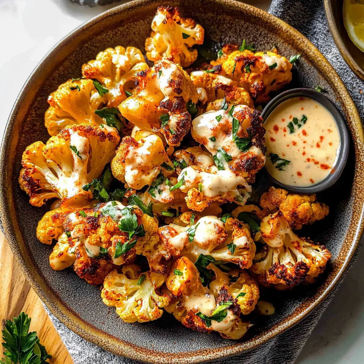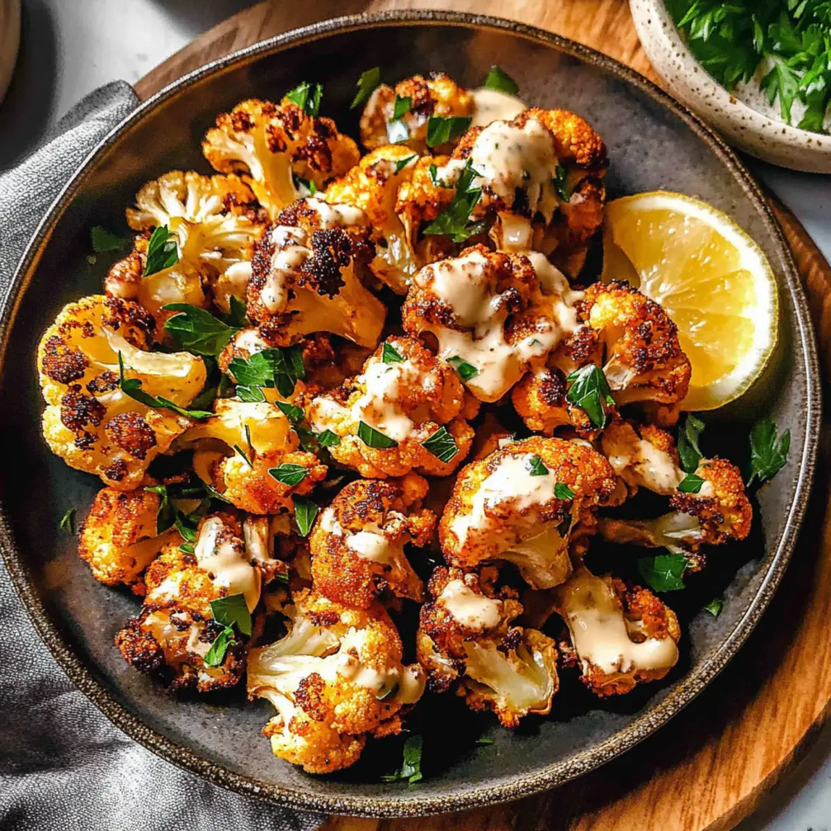 Jump to Recipe Print RecipeWalking through the bustling streets of Marrakech, I stumbled upon a charming little café, alive with the aroma of spices that instantly captured my attention. One dish in particular—a colorful, roasted Moroccan Cauliflower with Tahini-Honey—was a glorious surprise I couldn’t forget. This 5-ingredient vegan side dish harmoniously combines the zest of spicy harissa with the creamy richness of tahini, creating a delightful pairing for any meal. Whether you’re looking to elevate your weeknight dinners or impress guests during the holidays, this nutritious recipe checks all the boxes. Not only is this vibrant dish simple to prepare, but it also caters to a variety of dietary preferences. Ready to turn your kitchen into a Moroccan oasis? Let’s dive in! Why is Moroccan Cauliflower a Must-Try? Simplicity, with just five ingredients, this vegan dish makes for an effortless weeknight meal or show-stopping holiday side. Flavor-packed, the spicy harissa and creamy tahini create a taste sensation that will impress anyone at your table. Versatile, it pairs beautifully with grilled chicken or fish, or can be served solo as a delicious dip. Healthy and wholesome, this gluten-free option is brimming with nutrients without sacrificing taste. And crowd-pleasing, it’s a delightful way to introduce exciting flavors to family and friends. Want more incredible vegan options? Check out my recipes for Ramen Grilled Sauce and Grilled Shrimp Bowl for more inspiring ideas! Moroccan Cauliflower with Tahini-Honey Ingredients For the Cauliflower Cauliflower – The star of the dish, offering a firm texture and can be any color for a unique presentation. Extra-virgin olive oil – Adds richness and helps with roasting; quality makes a difference in flavor. Kosher salt – Enhances the flavor; substitute with sea salt to taste. For the Sauce Tahini – Provides a creamy, nutty flavor; you can swap it with other nut butters but expect a different taste. Honey – Brings sweetness; for a vegan version, use maple syrup or agave nectar. For Garnish Fresh lemon juice – Imparts brightness; always use freshly squeezed for the best flavor. Freshly ground black pepper – Elevates the dish; omit if sensitive to spice. Fresh parsley (optional) – Adds a pop of color and freshness. Get ready to savor the rich flavors of this Moroccan Cauliflower with Tahini-Honey dish that’s sure to impress! Step‑by‑Step Instructions for Moroccan Cauliflower with Tahini-Honey Step 1: Preheat the Oven Begin by preheating your oven to 425°F (220°C). This high temperature will help achieve that beautiful caramelization on the cauliflower. Make sure your oven rack is in the middle position to promote even roasting. Step 2: Prepare the Harissa Mixture In a large mixing bowl, whisk together 2 tablespoons of extra-virgin olive oil, ½ teaspoon of kosher salt, and 2 tablespoons of mild harissa. The mixture should be well combined, creating a vibrant paste. This flavorful blend is essential for giving your Moroccan Cauliflower its signature kick. Step 3: Coat the Cauliflower Cut the cauliflower into evenly sized florets, placing them in the bowl with the harissa mixture. Toss the florets until they are fully coated, ensuring every piece gets that spicy flavor. Spread the coated cauliflower in a single layer on a baking sheet lined with parchment paper for easy cleanup. Step 4: Roast the Cauliflower Roast the cauliflower in the preheated oven for 35 minutes. Halfway through the cooking time, remove the baking sheet and toss the florets gently. They should become tender and start to brown at the edges, enhancing their sweetness and flavor. Step 5: Add Extra Harissa and Caramelize Once the initial roasting is complete, take the baking sheet out and toss the cauliflower with any remaining harissa. Return them to the oven for an additional 5-10 minutes, until they are beautifully caramelized and have a crispy texture on the outside. Step 6: Whisk the Tahini-Honey Sauce While the cauliflower roasts, prepare the tahini-honey sauce. In a separate bowl, whisk together 2 tablespoons of olive oil, tahini, honey, 1 tablespoon of fresh lemon juice, ¼ teaspoon of remaining salt, and freshly ground black pepper. Add water bit by bit until you achieve your desired creamy consistency. Step 7: Final Assembly and Garnish When the Moroccan Cauliflower is perfectly roasted, transfer it to a serving platter. Drizzle your luscious tahini-honey sauce over the top, squeeze any remaining lemon juice for brightness, and finish with a sprinkle of fresh parsley if desired. The result is a stunning centerpiece for any table. Make Ahead Options These Moroccan Cauliflower with Tahini-Honey are fantastic for meal prep, making your weeknight dinners a breeze! You can roast the cauliflower up to 24 hours in advance and store it in the refrigerator in an airtight container. To maintain its delicious crispiness, reheat the florets in the oven for about 10-15 minutes at 375°F. You can also prepare the tahini-honey sauce up to 3 days ahead; simply whisk it together and store it in a separate container in the fridge. When you’re ready to serve, drizzle the sauce over the reheated cauliflower, and voilà! You’ll have a restaurant-quality dish ready with minimal effort, and just as delightful as when freshly made. Expert Tips for Moroccan Cauliflower Uniform Florets: Ensure your cauliflower florets are cut into even sizes. This guarantees uniform roasting and prevents some pieces from being undercooked while others are overdone. Don’t Overcrowd: When spreading cauliflower on the baking sheet, avoid overcrowding. This promotes even caramelization and crispy edges, key to a delicious Moroccan Cauliflower with Tahini-Honey. Adjust Heat Levels: Feel free to customize the spice! If you prefer a milder flavor, start with less harissa and gradually add more until it suits your taste. Fresh Ingredients: Use fresh lemon juice for the sauce instead