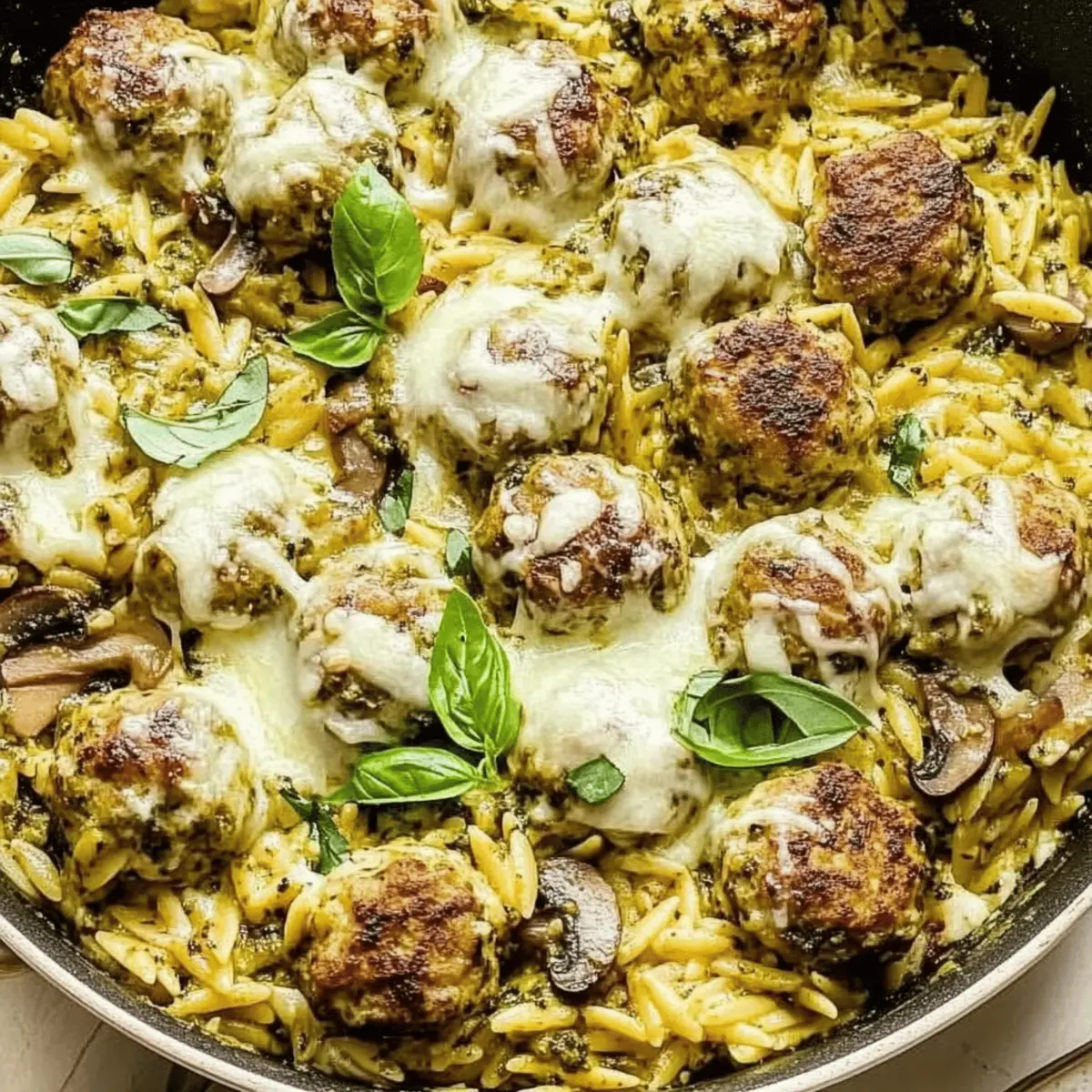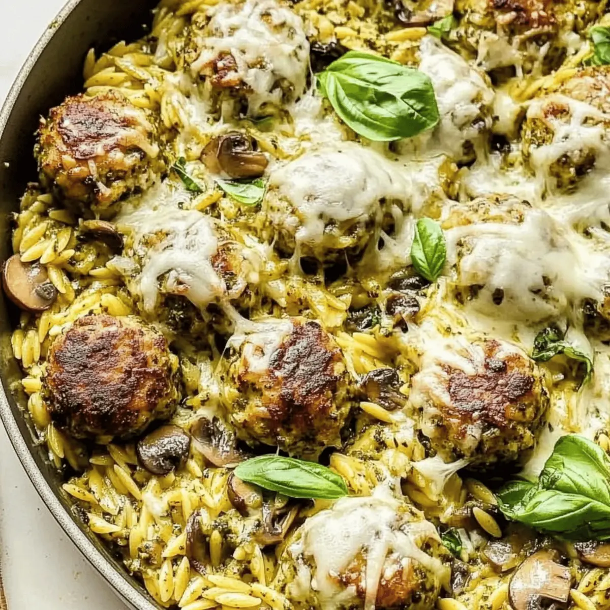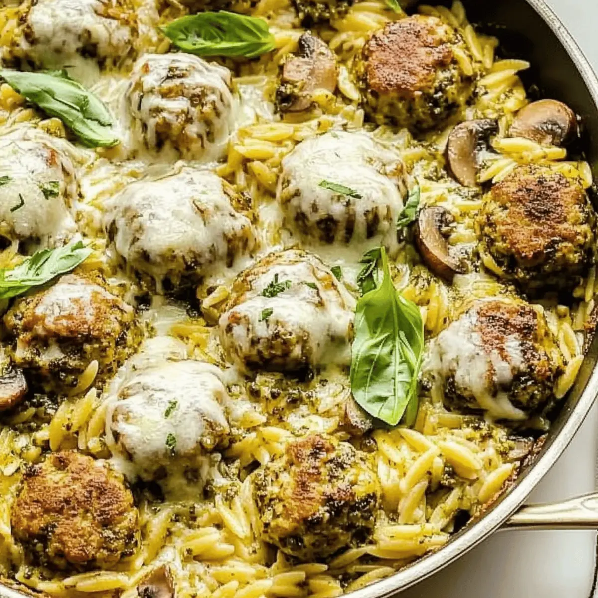 Jump to Recipe Print RecipeAs the rich aroma of basil and garlic fills the kitchen, I can’t help but feel excited about an easy weeknight dinner that truly hits the spot. Introducing my One Pan Baked Pesto Orzo with Chicken Meatballs—a family-friendly meal that marries convenience with mouthwatering flavors! With just one pan to clean up, this recipe not only saves you precious time but also makes room for endless customization, including gluten-free options that everyone will love. Imagine melt-in-your-mouth chicken meatballs infused with delicious basil pesto, paired with creamy orzo and tender sautéed mushrooms. It’s a comforting dish that strikes the perfect balance between nutrition and satisfaction. Are you ready to bring a taste of Italy to your table? Let’s dive into this culinary adventure! Why Is This One Pan Recipe a Must-Try? Simplicity: With everything baked in one pan, you’ll enjoy a hassle-free cooking experience without the fuss of multiple dishes. Customization: This dish is versatile—swap in gluten-free options or your favorite pasta for a tailored meal that fits any dietary need. Flavor Explosion: The combination of chicken meatballs and rich basil pesto creates a delightful symphony of flavors, while tender sautéed mushrooms add a satisfying depth. Time-Saving: Perfect for busy weeknights, this recipe delivers a hearty meal in just about 30 minutes. Family-Friendly: Kids and adults alike will love the creamy orzo and juicy meatballs—making dinner time a breeze! Elevate your meal planning with this comforting dish, and if you need more ideas, check out my Baked Mac Cheese or Baked Beef Chiles. One Pan Baked Pesto Orzo Ingredients For the Chicken Meatballs • Zucchini – Adds moisture and nutrition to the meatballs; shred and remove excess moisture for the best texture. • Ground chicken (or turkey) – A lean protein base; you can substitute turkey for a lighter option. • Panko breadcrumbs – Binds the meatballs for structure; choose gluten-free if desired. • Large egg – Acts as a binder for keeping meatballs together. • Basil pesto – Infuses flavor into both the meatballs and orzo; feel free to use homemade or store-bought for convenience. • Lemon zest – Brightens flavors in the meatballs and orzo. • Italian seasoning, garlic powder, red pepper flakes – Enhance the flavor profiles of the meatballs. • Kosher salt and black pepper – Basic seasonings for an overall flavor boost. For the Orzo • Baby bella mushrooms – Adds rich umami flavor; swap for other kinds if preferred. • Low sodium chicken broth – The cooking liquid for orzo; gives it depth and flavor. • Milk of choice – Adds creaminess to the orzo; whole or 2% is recommended. • Uncooked orzo – Base of the dish; consider gluten-free orzo if needed. • Shredded mozzarella cheese – Optional topping for added creaminess and flavor; can skip for a lighter dish. Dive into the rustic and flavorful world of this One Pan Baked Pesto Orzo with Chicken Meatballs and enjoy a delightful family meal that everyone can appreciate! Step‑by‑Step Instructions for One Pan Baked Pesto Orzo with Chicken Meatballs Step 1: Prep Zucchini Begin by shredding the zucchini using a grater, then place it in a clean kitchen towel to squeeze out excess moisture. This step is crucial to prevent soggy meatballs. Once well-drained, set the zucchini aside to incorporate into your meatball mixture later. Step 2: Make Meatballs In a large mixing bowl, combine the shredded zucchini, ground chicken, panko breadcrumbs, large egg, basil pesto, lemon zest, and your choice of Italian seasoning, garlic powder, red pepper flakes, salt, and pepper. Mix well until all ingredients are fully incorporated. Then, form the mixture into 16 evenly-sized meatballs, setting them aside on a plate for browning. Step 3: Brown Meatballs In an oven-safe skillet, heat a tablespoon of olive oil over medium-high heat. Once hot, carefully add the meatballs to the skillet and brown them for about 6 minutes, turning occasionally for even coloring. They should develop a golden-brown crust on all sides. Once browned, transfer the meatballs to a separate plate. Step 4: Sauté Mushrooms In the same skillet, add the baby bella mushrooms along with a pinch of salt and pepper. Sauté for about 5-8 minutes, stirring occasionally, until the mushrooms are golden brown. This adds depth to your One Pan Baked Pesto Orzo. After they’re browned, stir in minced garlic and cook for an additional minute until fragrant. Step 5: Cook Orzo Now, add low sodium chicken broth, milk, additional basil pesto, lemon zest, and uncooked orzo to the skillet with sautéed mushrooms. Stir gently to combine all ingredients, ensuring the orzo is evenly distributed. Return the browned meatballs to the skillet, then bring the mixture to a simmer. Step 6: Bake the Dish Preheat your oven to 400°F (200°C). Once simmering, transfer the skillet to the preheated oven and bake for 10-12 minutes. Keep an eye on it; the orzo should be tender and have absorbed most of the liquid, while the meatballs remain juicy and fully cooked. Step 7: Add Cheese and Finish After baking, carefully remove the skillet from the oven and sprinkle shredded mozzarella cheese evenly over the top. Return to the oven for an additional 5 minutes, or until the cheese is melted and bubbling. Once done, the One Pan Baked Pesto Orzo with Chicken Meatballs is ready for serving—garnish with fresh basil and enjoy! How to Store and Freeze One Pan Baked Pesto Orzo Fridge: Store leftovers in an airtight container in the fridge for up to 4-5 days. Reheat in the microwave or on the stovetop gently to preserve the orzo’s creaminess. Freezer: For longer storage, freeze servings in airtight containers or freezer bags for up to 3 months. Thaw overnight in the fridge before reheating. Reheating: To reheat, warm the orzo and meatballs in a skillet with a splash of broth or milk to restore moisture, 