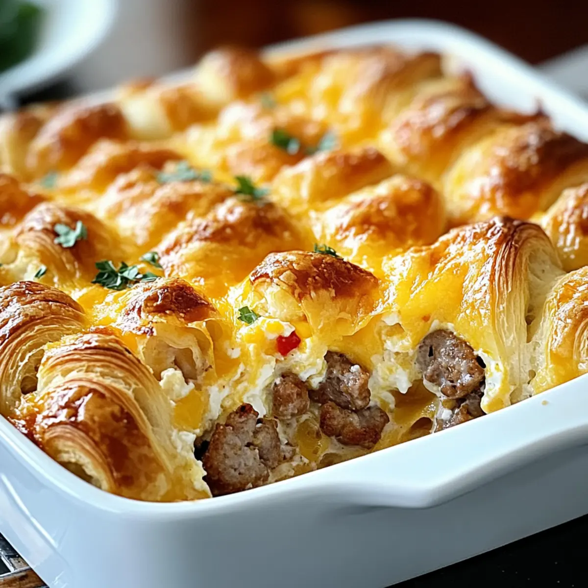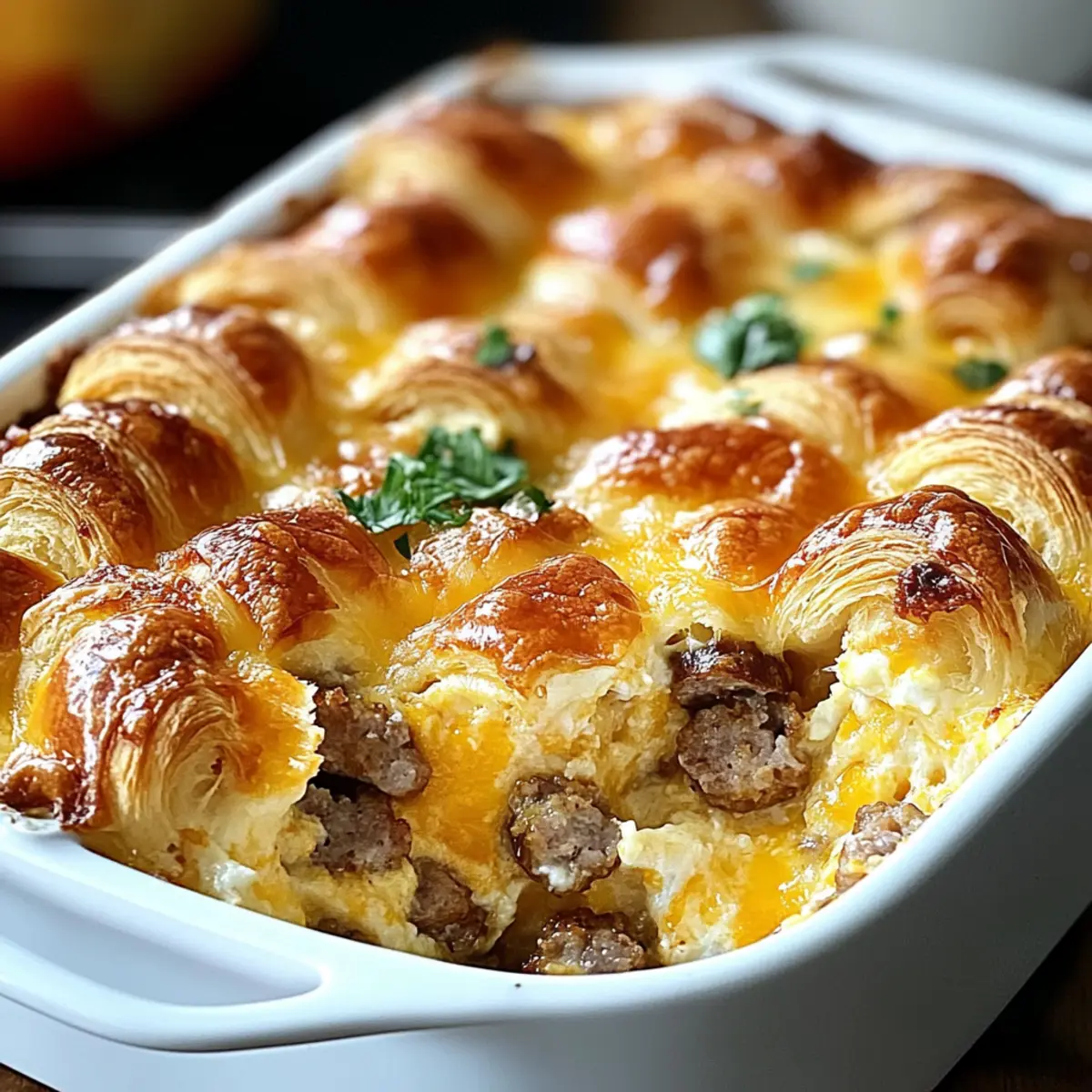 Overnight Croissant Breakfast Casserole is a delightful breakfast experience that combines flaky croissants, savory sausage, creamy eggs, and melty cheese.