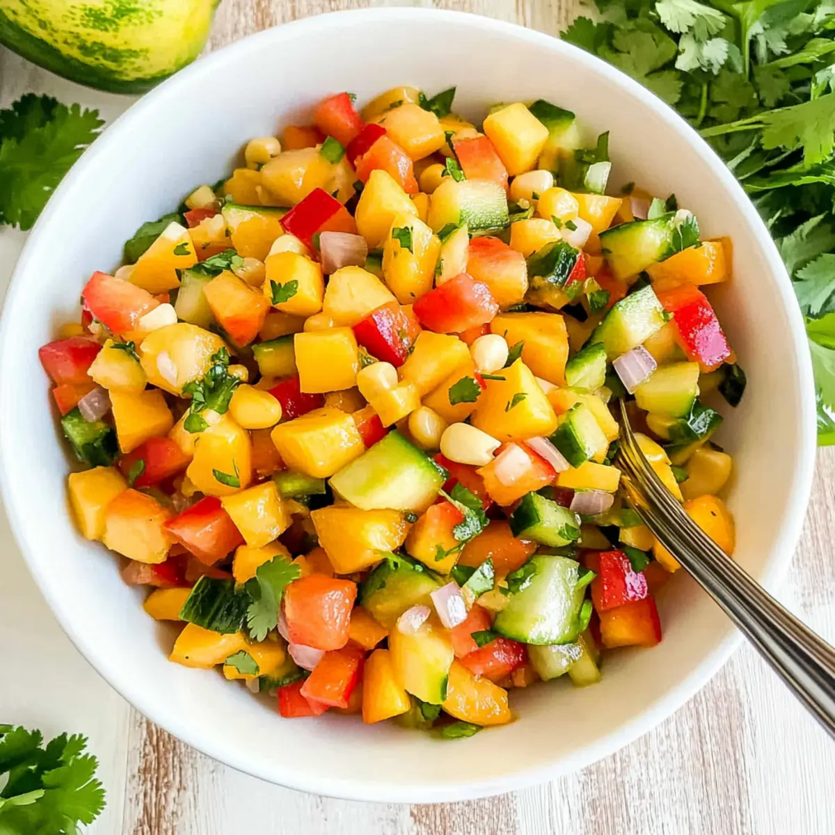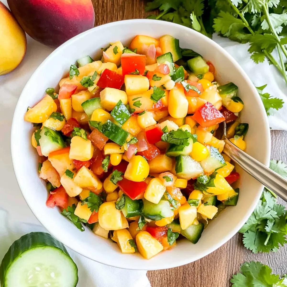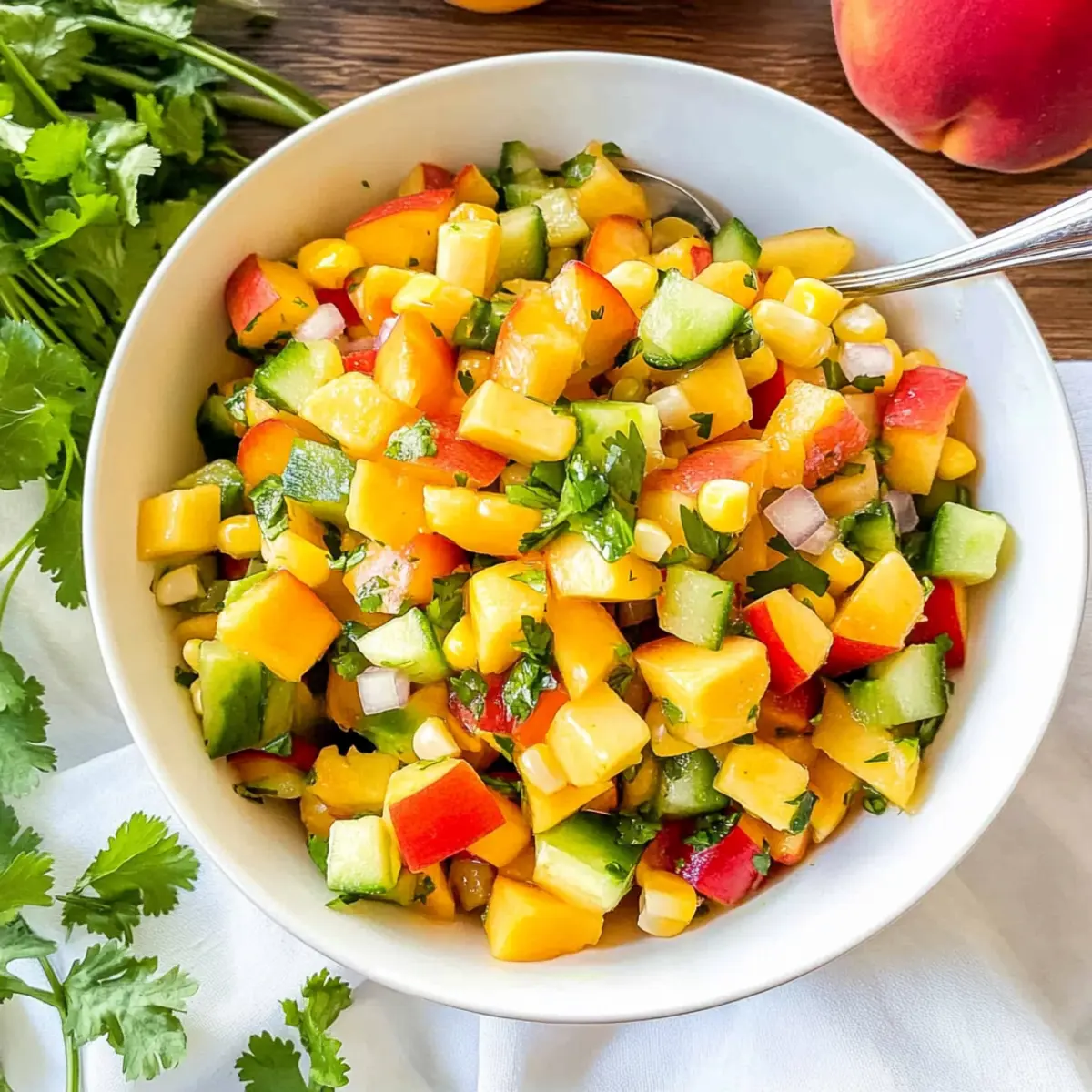 Jump to Recipe Print RecipeAs I stood in my kitchen, the sweet scent of ripe peaches enveloped me like a warm hug, instantly transporting me to sun-drenched summer days. It was the perfect moment to whip up a batch of Peach Corn Salsa, a recipe that not only celebrates fresh ingredients but also takes a mere 10 minutes to prepare. This vibrant salsa is a delightful blend of juicy peaches, crisp vegetables, and fragrant herbs—ideal as a light appetizer or a lively topping for grilled dishes. Plus, it’s vegan, gluten-free, and makes a fantastic addition to summer picnics or BBQ gatherings. Imagine the compliments from friends and family as they savor each bite! Are you ready to dive into this refreshing recipe that captures the essence of summer? Why is Peach Corn Salsa a Must-Try? Freshness at Its Finest: This Peach Corn Salsa bursts with the sweet, juicy flavors of fresh peaches and crisp veggies, making each bite a joyful experience. Quick & Easy: With only 10 minutes needed, it’s perfect for those busy summer days or spontaneous gatherings. You can also enjoy its versatility as a topping on grilled meats or even Cornbread Muffins Moist for a delightful twist. Healthy Indulgence: Vegan, gluten-free, and low in calories, this salsa satisfies cravings without guilt, bringing you a nutritious snack or appetizer. Crowd-Pleasing Appeal: Serve it at your next BBQ, and watch friends and family dive in—they’ll be raving about this vibrant masterpiece! Endless Variations: Feel free to get creative! Swap peaches for nectarines or add a kick with diced jalapeños—personalize it to suit your taste! Get ready to savor the sunshine with this refreshing recipe. Peach Corn Salsa Ingredients For the Salsa Peaches – Sweetness and juiciness. Substitution: Nectarines can be used for a similar flavor. Corn – Adds crunch and sweetness. Substitution: Fresh sweet corn, thawed frozen corn, or canned corn can be used. English Cucumber – Provides a refreshing crunch. Substitution: Any mild cucumber variety works. Red Bell Pepper – Adds color and sweetness. Substitution: Other bell pepper colors or roasted peppers for less crunch. Cilantro – Introduces a fresh, herbal flavor. Note: Use sparingly for low histamine readers; substitute with parsley if necessary. Green Onion – Offers a mild onion flavor. Substitution: Red or white onion can be used, or omit for low histamine. For the Dressing Extra Virgin Olive Oil – Adds richness and helps dress the salsa. Apple Cider Vinegar – Provides tanginess. Substitution: Lime juice or a sweet fruit juice can replace vinegar based on dietary needs. Garlic (optional) – Adds depth of flavor. Omit for low histamine or if sensitive to garlic. Salt & Black Pepper (optional) – Enhances all flavors. Adjust to taste. Step‑by‑Step Instructions for Peach Corn Salsa Step 1: Prepare the Peaches Start by washing your ripe peaches under cool water. Carefully de-stone each peach and dice them into small, uniform pieces, about half an inch. Aim for around 1-2 cups of diced peaches to ensure their sweetness is highlighted. This juicy fruit will serve as the star ingredient in your Peach Corn Salsa. Step 2: Dice Veggies Next, grab a cutting board and chop the English cucumber, red bell pepper, and green onion into small, evenly sized pieces, about the same size as the peaches. Fresh vegetables add a crisp texture and vibrant color to your salsa. Aim for roughly one cup each of cucumber and bell pepper to create a well-balanced mix. Step 3: Chop the Herbs Now, finely chop a handful of cilantro, ensuring that the pieces are small enough to mix seamlessly into the Peach Corn Salsa. If you prefer a low-histamine option, use parsley instead. Fresh herbs bring a delightful, fragrant note that enhances the overall flavor. Set your chopped herbs aside for mixing later. Step 4: Make the Dressing In a small mixing bowl, whisk together three tablespoons of extra virgin olive oil and two tablespoons of apple cider vinegar. If using, add minced garlic for an extra layer of depth. Season with salt and freshly cracked black pepper to taste. This zesty dressing will tie all the fresh ingredients together beautifully, enhancing your salsa. Step 5: Combine Ingredients In a large serving bowl, combine all the diced peaches, veggies, and chopped herbs. Drizzle the prepared dressing over the top and gently toss everything together with a spatula or large spoon. Be careful not to over-mix, as you want to maintain the refreshing textures of the ingredients in your Peach Corn Salsa. Step 6: Let It Rest (Optional) For even more intense flavors, allow your Peach Corn Salsa to rest for about 10 minutes at room temperature. This will give the ingredients a chance to meld together as the juices blend beautifully. Serve immediately or refrigerate for a bit, but remember that it’s best enjoyed fresh to retain that delightful crunch! Expert Tips for Peach Corn Salsa Choose Ripe Peaches: Use peaches that are slightly soft to the touch for optimal sweetness. Unripe peaches can lead to a bland salsa. Uniform Dicing: Cut all ingredients to a similar size to ensure a balanced texture in your Peach Corn Salsa. This prevents big chunks that can disrupt the flavor. Enhance Smokiness: For deeper flavor, grill the corn before adding it to the salsa. This adds a delicious smoky twist! Balance Flavors: Adjust the dressing ingredients to suit your taste preference. If it’s too tangy, add a touch more olive oil. Serve Fresh: While this salsa can be refrigerated for a day, it shines brightest when fresh. Enjoy immediately for the best flavor and crunch! How to Store and Freeze Peach Corn Salsa Fridge: Store in an airtight container for up to 1 day to maintain freshness. The flavors will be more vibrant on the first day, so enjoy it soon after making. Freezer: While not recommended for freezing due to texture changes, if needed, place the salsa in a freezer-safe container for up to 1 month. Thaw in the 