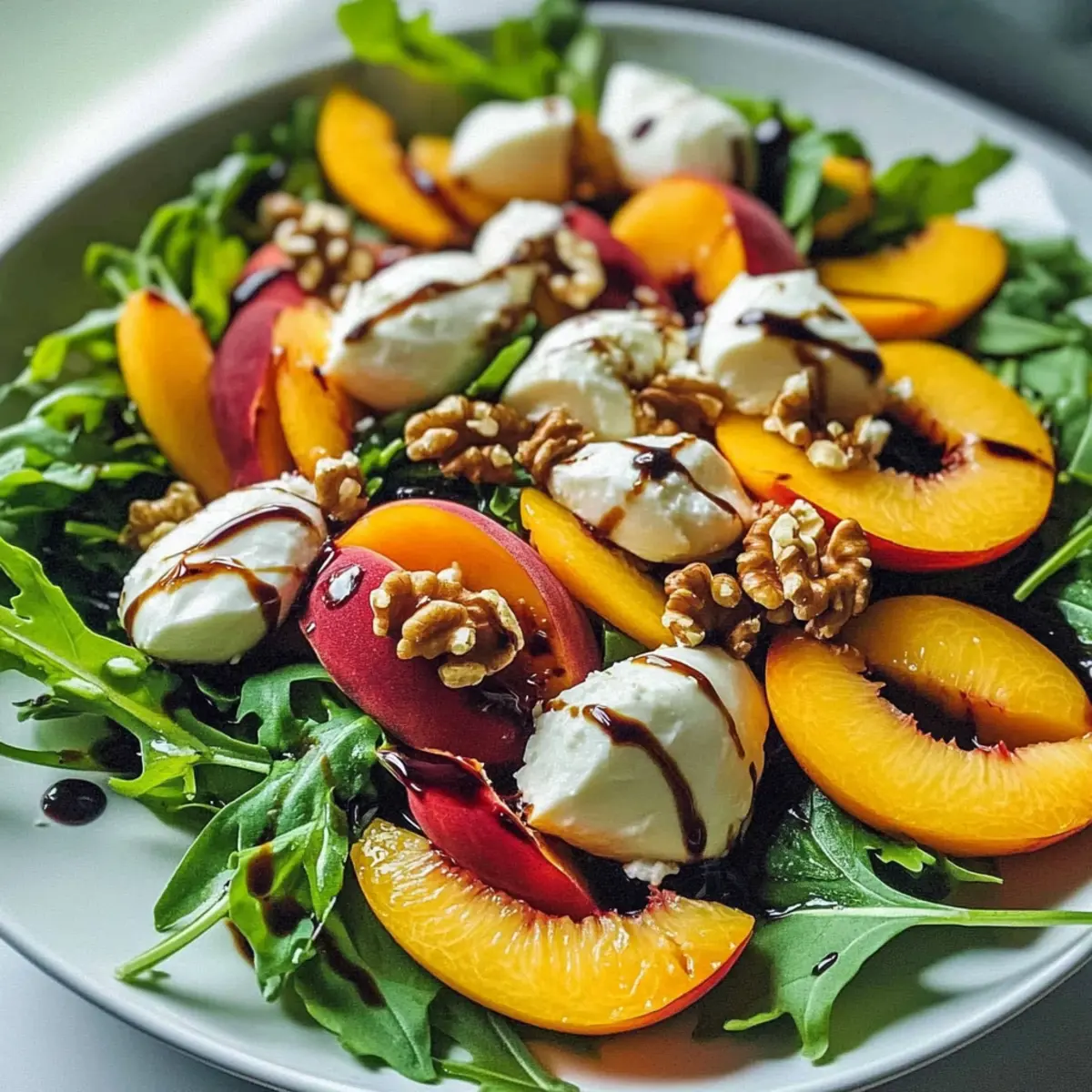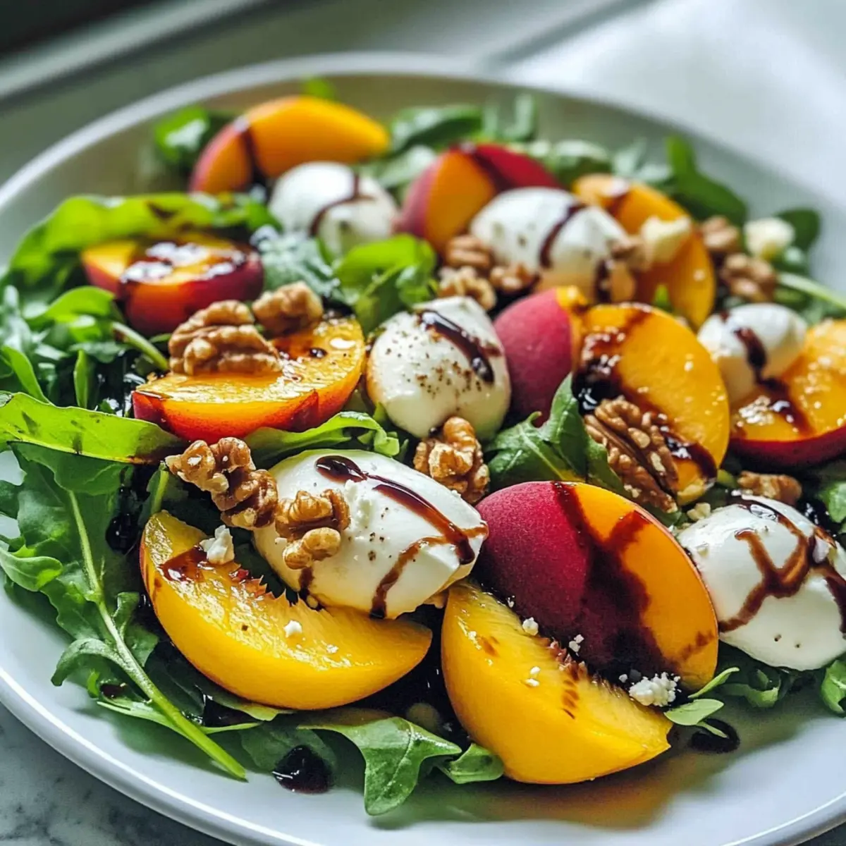 Jump to Recipe Print RecipeThe sun is shining, and that calls for a refreshing escape with a delightful summer treat! My Millionaire Peach Salad is the epitome of warm-weather eating, blending juicy peaches with creamy mozzarella, crunchy walnuts, and fresh basil for a flavor fiesta. Not only is this peach salad a feast for the senses, but it’s also a breeze to prepare—no cooking required! Perfect for those busy summer days, this dish is both light and satisfying, making it an ideal choice for barbecues and lunch gatherings alike. Plus, it celebrates the season’s best produce, letting the natural sweetness of ripe peaches shine. Ready to elevate your salad game and impress your family and friends? Let’s dive into this deliciously refreshing recipe! Why is this Peach Salad a must-try? Bursting with flavor: This Millionaire Peach Salad combines sweet peaches and creamy mozzarella for a taste explosion. No-Cook Solution: Perfect for hot days, this salad requires no cooking—simply chop and combine! Customizable: Experiment with seasonal fruits or nuts for a unique twist; think juicy nectarines or crunchy pecans. Crowd-Pleaser: A stunning presentation and delicious taste make it an instant hit at gatherings. Light and Healthy: At about 250 calories per serving, it’s a guilt-free addition to any meal—pair it with a Broccoli Salad Bacon for a well-rounded feast. Peach Salad Ingredients Elevate your dish with these fresh components! For the Salad Ripe Peaches – Look for peaches that yield slightly to pressure for the best sweetness and juiciness. Fresh Mozzarella Balls – Opt for creamy mozzarella that perfectly complements the sweet flavor of peaches; burrata is a great substitute. Arugula or Mixed Greens – A peppery bite enhances the overall flavor; feel free to swap with spinach for a milder taste. Toasted Walnuts – Add a delightful crunch; pecans or sunflower seeds work well as alternatives. Feta Cheese – This salty contrast elevates the sweetness of the peaches; omit for a vegan version or use plant-based cheese. Fresh Basil Leaves – Their aromatic essence lifts the entire dish; try mint for a fresh twist if you like. Balsamic Glaze – Provides tangy sweetness; adjust to taste, or try a honey dressing for added sweetness. Salt & Pepper – Enhance and balance all flavors; tweak to your personal preference. Step‑by‑Step Instructions for Millionaire Peach Salad Step 1: Prepare the Peaches Begin by washing the ripe peaches under cool running water to remove any dirt. Once clean, cut each peach in half, carefully remove the pit, and slice them into wedges about half an inch thick. Look for peaches that are slightly soft to the touch for optimal sweetness; this is crucial for your refreshing Millionaire Peach Salad. Step 2: Combine the Salad Base In a large salad bowl, start by adding the sliced peaches along with halved mozzarella balls. If you prefer a creamier texture, opt for burrata instead. Next, introduce a generous handful of arugula or your chosen mixed greens. Toss gently to ensure that the peaches and cheese are evenly distributed while maintaining their beautiful shape. Step 3: Add the Crunch and Flavor Sprinkle the toasted walnuts over the salad ingredients. Their nutty flavor provides a delightful crunch that contrasts beautifully with the creamy mozzarella and juicy peaches. Next, crumble feta cheese over the mixture for that perfect salty bite. The combination of textures will elevate your Millionaire Peach Salad to new heights. Step 4: Finish with Fresh Herbs and Dressing Tear fresh basil leaves right over the salad, releasing their aromatic essence into the dish. Drizzle balsamic glaze generously across the salad, ensuring all components are lightly coated for balanced flavor. Season with a pinch of salt and freshly cracked pepper to enhance the overall taste profile of your peach salad. Step 5: Toss Gently Using salad tongs, gently toss all the ingredients together, making sure not to mash the peaches or mozzarella. You want to maintain the integrity and appearance of each ingredient in your Millionaire Peach Salad. This step is key for a beautiful presentation when serving your guests. Step 6: Chill for Best Flavor Once everything is combined, cover the salad bowl with plastic wrap or a lid and place it in the refrigerator. Allow the salad to chill for 10-15 minutes. This resting time helps the flavors meld together, creating a more refreshing and harmonious taste to enjoy when served. Step 7: Serve and Enjoy When you’re ready to serve, you can either plate the salad individually or serve it directly from the bowl. The Millionaire Peach Salad is best enjoyed fresh, highlighting all the delightful textures and flavors of summer. If desired, add a final light drizzle of balsamic glaze before serving to impress your guests. Peach Salad Variations & Substitutions Feel free to get creative with this recipe and customize it to suit your taste and dietary needs! Nectarine Swap: Substitute peaches with juicy nectarines for a similar flavor profile with a slight twist. Berry Burst: Mix in fresh berries like strawberries or blueberries for a lovely pop of color and tangy sweetness. Nutty Alternatives: Use pecans or sunflower seeds instead of walnuts for a different crunch and flavor. Toast them for enhanced taste! Vegan Delight: Omit the feta and mozzarella, swapping in plant-based cheeses to create a vegan-friendly version that still delights. Herb Variations: Try mint leaves in place of basil for a refreshing herbal kick that complements the peaches beautifully. Add Protein: For extra heartiness, toss in some grilled chicken or shrimp, turning this salad into a filling main course. Zesty Dressing: Switch balsamic glaze for a citrus vinaigrette to brighten the flavors and give your salad a zesty twist. Seasonal Changes: During fall, consider adding roasted butternut squash for a warm element that contrasts wonderfully with the fresh ingredients. For mor