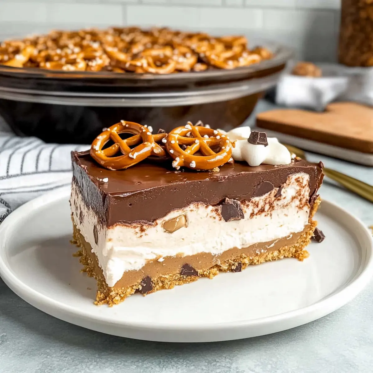 Jump to Recipe Print RecipeAs the sun dips low and the kitchen fills with the aroma of nostalgia, I can’t help but think about my favorite family dessert: the Chocolate Peanut Butter Pretzel Pie. This simple no-bake treat manages to tantalize the taste buds with layers of creamy goodness and that irresistible sweet-and-salty combination we all crave. The buttery pretzel crust adds a delightful crunch, while the peanut butter cheesecake and chocolate pudding layers create bliss in every bite. Perfect for gatherings or a cozy night in, this easy dessert requires minimal prep, making it a quick party star that everyone will adore. So, are you ready to dive into making this delightful pie and see how it transforms your dessert game? Why is this pie a must-try? Decadence at Its Best: The layers of creamy peanut butter cheesecake and rich chocolate pudding create a dessert that feels indulgent yet is surprisingly easy to whip up. Quick Party Pleaser: With no baking required, this pie is your go-to solution for last-minute gatherings or cozy family nights. Sweet and Salty Perfection: The buttery pretzel crust adds a delightful crunch that beautifully contrasts the sweet, creamy layers above. Versatile Options: Feel free to mix things up—try it with almond butter for a nut-free twist, or switch the crust with graham crackers for a different flavor. With endless variations, you’ll never tire of this treat! Dive into the world of decadent desserts with our Biscoff Cookie Butter Cinnamon Rolls or our easy-to-make Garlic Butter Shrimp Scampi Lasagna as well! Crowd Magnet: Whether you’re serving it at a family reunion or just treating yourself, this pie promises smiles with every slice. Peanut Butter Pretzel Pie Ingredients For the Crust Crushed Pretzels – Give the pie a salty crunch that pairs perfectly with the sweet layers above. Unsalted Butter – Adds richness and helps bind the crust together. Powdered Sugar – Balances the saltiness of the crust for a harmonious taste. For the Peanut Butter Layer Cream Cheese – Provides a smooth, creamy texture to the peanut butter filling. Creamy Peanut Butter – The star ingredient that brings a luscious, nutty flavor to the dessert. Vanilla Extract – Enhances the overall flavor profile, making it extra delicious. Whipped Topping – Lightens the filling, adding a fluffy, delightful texture. For the Chocolate Layer Instant Chocolate Pudding – Creates a rich pudding layer without the need for cooking. Milk – Hydrates the pudding mix, ensuring a smooth consistency. For Toppings Additional Whipped Topping – Adds a final layer of creaminess and lightness to the pie. Crushed Pretzels & Chocolate Sauce – Garnish the pie with these for a fun texture and flavor contrast. This Peanut Butter Pretzel Pie is not only easy to make but a sure hit at any gathering! Enjoy every delectable bite! Step‑by‑Step Instructions for Peanut Butter Pretzel Pie Step 1: Preheat and Prepare Preheat your oven to 400°F (200°C). While it’s warming up, take a 13×9 baking dish and line it with parchment paper for easy removal later. This will also help prevent the crust from sticking, ensuring your Peanut Butter Pretzel Pie comes out perfectly every time. Step 2: Make the Pretzel Crust In a saucepan over medium heat, melt the unsalted butter until fully liquid. Once melted, add in the crushed pretzels and a dash of powdered sugar, stirring until well combined. Press this mixture firmly into the bottom of your prepared dish, creating a solid crust. Bake for 5 minutes and then let it cool completely on the counter. Step 3: Prepare the Peanut Butter Layer In a large mixing bowl, beat together the cream cheese, creamy peanut butter, powdered sugar, and vanilla extract until the mixture is smooth and creamy—this should take about 3-5 minutes. Once combined, gently fold in 1 cup of whipped topping until fully incorporated. Spread this luscious peanut butter mixture evenly over your cooled crust for a decadent layer. Step 4: Chill the Peanut Butter Layer Cover the dish with plastic wrap and chill in the refrigerator for at least 30 minutes. This helps the peanut butter layer set up and enhances the flavors as they meld beautifully together. You’ll want this layer to be firm yet creamy, creating the perfect base for the next chocolate layer. Step 5: Make the Chocolate Pudding Layer In a mixing bowl, combine the instant chocolate pudding mix with the required milk, whisking it together until fully blended—this should take about 2 minutes. The mixture will thicken quickly, so make sure to pour it over the chilled peanut butter layer in your baking dish before it sets completely, ensuring a smooth, even layer. Step 6: Chill the Pie Again Return the dish to the refrigerator and let the pie chill for an additional 30 minutes. This allows the chocolate pudding layer to firm up nicely, preparing it for the final creamy topping. The smell of chocolate and peanut butter will start filling your kitchen, making it hard to resist! Step 7: Add the Final Topping Once the chocolate pudding layer is set, spread the remaining whipped topping evenly over the top. This creates a light and fluffy finish that complements the rich flavors below. Make sure it looks smooth and inviting, setting the stage for the delicious garnishes to come. Step 8: Garnish and Serve Before serving, sprinkle some crushed pretzels over the whipped topping for a delightful crunch and drizzle with chocolate sauce for an extra touch of sweetness. For best results, chill your Peanut Butter Pretzel Pie for at least 3 hours or even overnight to let the flavors meld, ensuring a truly indulgent dessert experience. Make Ahead Options These Peanut Butter Pretzel Pie layers are ideal for meal prep, making your life simpler! You can prepare the pretzel crust and the peanut butter cheesecake layer up to 24 hours in advance. Simply cool and store them, covered, in the refrigerator to maintain their texture. To ensure
