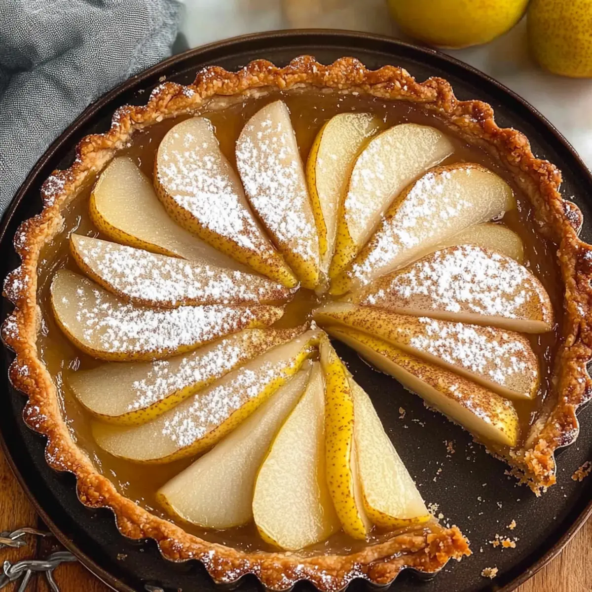 Jump to Recipe Print RecipeAs I stood in my kitchen, the sweet scent of cinnamon and vanilla wafted through the air, instantly transporting me to a quaint French patisserie. It was time to create something truly special: a Pear Almond Frangipane Tart. This dessert combines the lusciousness of poached spiced pears with a rich almond filling, nestled in a buttery crust that’s surprisingly easy to make. Not only does this tart evoke the charm and elegance of French cuisine, but it’s also a delightful way to embrace seasonal ingredients. Perfect for impressing guests or simply enjoying a cozy night in, this tart brings the warmth of home-cooked goodness to your table. Are you ready to elevate your dessert game? Let’s delve into this delicious journey together! Why is this tart a must-try? Decadent, the Pear Almond Frangipane Tart is rich yet approachable, bringing a touch of French elegance to your home kitchen. Aromatic spices like cinnamon and cloves dance through the air, making it a feast for the senses. Versatile enough to adapt with different fruits, you can easily swap pears for apples or peaches—perfect for different seasons! Effortlessly impressive, this tart is sure to wow guests at dinner parties or family gatherings. If you love comforting desserts, this recipe is a delightful treat that evokes the charm of a French patisserie right in your own home. Looking for more inspiration? Try pairing it with a refreshing Broccoli Salad for a balanced meal! Pear Almond Frangipane Tart Ingredients For the Pastry Unsalted Butter – Adds richness and depth in both the pastry and frangipane filling. Icing Sugar – Sweetens the pastry while providing a delicate, melt-in-the-mouth texture. Egg – Binds the ingredients and helps to create a tender pastry. Plain Flour – Forms the structure of the pastry, providing a sturdy base. For the Frangipane Filling Granulated Sugar – Enhances the overall flavor of the frangipane. Almond Meal – The star ingredient, giving the filling its rich, nutty flavor. Vanilla Extract – Elevates the taste with a hint of warm aroma. Ground Cloves – Adds a warming spice that complements the sweetness of the pears. For the Poached Pears Ripe Pears – The highlight ingredient offering sweetness and a juicy texture; Packham or Bosc varieties work best. Water – Essential for poaching the pears until perfectly tender. Granulated Sugar (Poaching Syrup) – Sweetens and thickens the poaching liquid to create a delicious syrup. Cinnamon Sticks & Whole Cloves – Infuse the poaching liquid with aromatic spices, enhancing the tart’s overall flavor. This Pear Almond Frangipane Tart is not just a treat for the taste buds; it’s a beautiful way to showcase seasonal ingredients and bring a slice of French elegance into your home! Step‑by‑Step Instructions for Pear Almond Frangipane Tart Step 1: Prepare the Pastry In a mixing bowl, cream together softened unsalted butter and icing sugar until smooth and fluffy, about 3-4 minutes. Beat in one egg until well incorporated, then gradually mix in plain flour until the dough begins to clump together. Shape the pastry into a disc, wrap it in plastic, and chill in the refrigerator for at least 2 hours until firm. Step 2: Pre-Bake Tart Shell Preheat your oven to 350°F (175°C). Roll out the chilled pastry on a lightly floured surface to fit your tart pan. Carefully transfer the pastry to the pan, pressing into the edges. Line it with parchment paper and fill with pie weights or dried beans. Blind bake for 20 minutes, then remove the paper and weights and bake for an additional 5-10 minutes until lightly golden. Step 3: Poach Pears Peel, halve, and core the ripe pears, ensuring even halves for a beautiful presentation. In a saucepan, combine water, granulated sugar, cinnamon sticks, and whole cloves, bringing to a gentle simmer. Add the pear halves and poach for approximately 15-20 minutes, or until soft but not falling apart. Remove the pears and simmer the poaching liquid until thickened, creating a lovely syrup. Step 4: Make Frangipane Filling In a large bowl, beat together granulated sugar and softened unsalted butter until creamy and light. Incorporate eggs, one at a time, followed by vanilla extract and ground cloves, mixing thoroughly. Gradually fold in almond meal and a touch of flour until combined. The filling should have a smooth consistency, ready to envelop the poached pears in the tart. Step 5: Assemble Tart Spread a generous layer of frangipane filling into the pre-baked tart shell, smoothing it to the edges. Slice the poached pear halves and arrange them artfully on top of the filling, fanning them for an elegant look. Brush the pears lightly with the spiced syrup to enhance their flavor and shine. Step 6: Bake and Cool Bake the assembled Pear Almond Frangipane Tart in the preheated oven for 60-70 minutes, or until the frangipane is golden brown and a toothpick inserted in the center comes out clean. Allow the tart to cool in the pan for about 15 minutes before transferring it to a wire rack to cool completely, ensuring it holds its shape beautifully. Pear Almond Frangipane Tart Variations Feel free to get creative with this delightful tart and make it your own! Apple Swap: Substitute pears with tart apples for a bright flavor twist. This will give your tart an exciting crunch and a slightly tangy profile. It’s a fabulous option for those cooler months! Peachy Keen: Replace the pears with ripe peaches, adding a juicy sweetness. The lovely aroma of peaches paired with the almond filling will remind you of a warm summer day! Nutty Flour Twist: Swap almond meal with hazelnut flour for a unique nutty flavor. This change adds dimension and richness, perfect for hazelnut lovers looking for something special. Vegan Variation: Use coconut oil instead of butter and flax eggs to create a plant-based version. You won’t lose any of that luscious flavor, and it’s perfect for those following a vegan lifesty