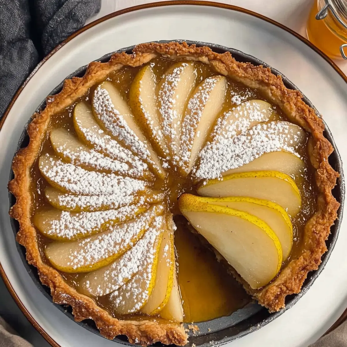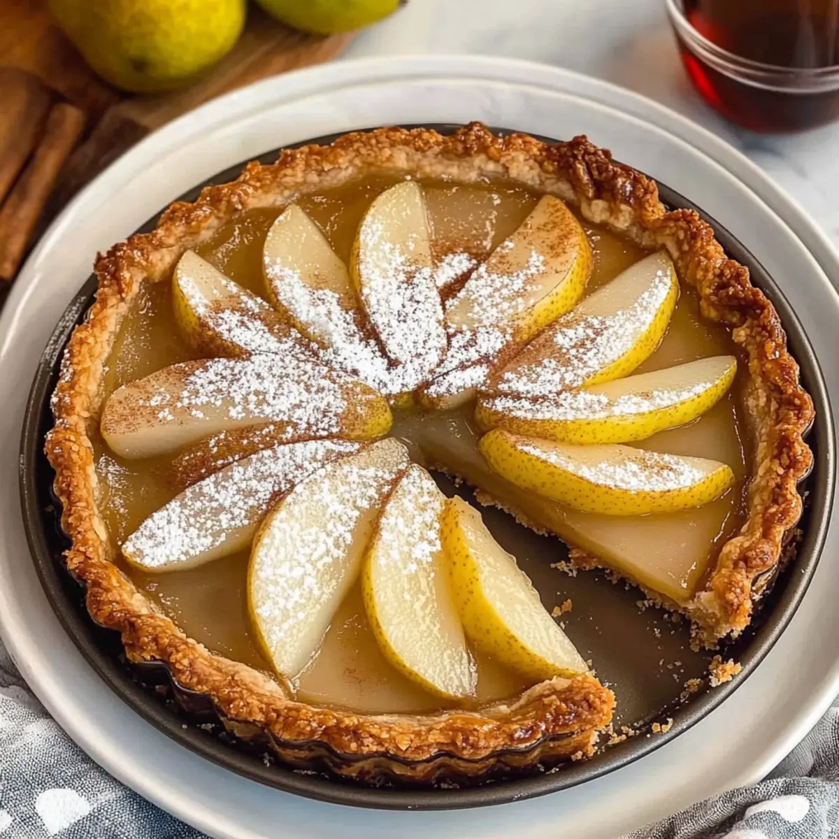 Jump to Recipe Print RecipeAs I pulled my newly baked Pear Almond Frangipane Tart from the oven, the warm, spicy aroma of poached pears wafted through my kitchen, instantly enchanting everyone nearby. This charming French dessert is a delightful blend of moist almond sponge and sweet, tender pears, all tucked into a flaky, buttery crust. What’s truly magical about this Pear Almond Frangipane Tart is that it’s surprisingly easy to create, proving that elegance doesn’t always require hours in the kitchen. Plus, it’s a perfect dish for cozy gatherings, delivering both comfort and style. Are you ready to indulge in a slice that feels like a warm hug? Why is this tart a must-try? Simplicity: Crafting this Pear Almond Frangipane Tart is a breeze, allowing you to impress your guests without hours of effort. Irresistible Flavor: The addition of spiced, poached pears elevates the tart, blending warm flavors that evoke comfort during cooler months. Versatile Delight: Perfect for any occasion, whether it’s a cozy family gathering or a sophisticated dinner party, this tart delivers crowd-pleasing appeal. Nutty Goodness: With almond meal in the filling, you’re treated to a rich, nutty flavor that beautifully complements the sweet pears. Step-by-Step Success: The clear instructions make it easy for both novice cooks and experienced bakers to achieve a stunning dessert, much like one you’d find at a French café. Pair it with a dollop of freshly whipped cream or a scoop of vanilla ice cream, and you’re ready for a delicious experience! For a fresh twist on flavors, don’t miss our Broccoli Salad Bacon for something vibrant on the side. Pear Almond Frangipane Tart Ingredients For the Pastry • Unsalted Butter – Essential for a rich, flaky texture; can be replaced with margarine if needed. • Icing Sugar (Powdered Sugar) – Provides sweetness for the pastry; granulated sugar works but mixes less smoothly. • Large Egg – Binds the pastry ingredients; substitute with a flax egg for a vegan alternative. • Plain Flour (All-Purpose Flour) – Creates the structure of the tart shell; a gluten-free blend is a suitable alternative. For the Frangipane Filling • White Granulated Sugar – Sweetens the frangipane; swap for coconut sugar for a healthier option. • Vanilla Extract – Enhances flavor in the frangipane; almond extract can offer a stronger taste. • Almond Meal (Ground Almonds) – The primary flavor of the frangipane; ground hazelnuts can be used for variation. • Ground Cloves – Adds a warm, spiced note to the filling; consider cinnamon for a different twist. For the Poached Pears • Ripe Pears – The star ingredients, providing moisture and sweetness; Bosc or Anjou varieties work best. • Cinnamon Sticks – Infuse the poaching liquid with flavor; ground cinnamon serves as a handy substitute. • Whole Cloves – Contributes depth to the poaching syrup; omit if you don’t have them on hand. This Pear Almond Frangipane Tart comes together beautifully and makes for a delightful dessert that everyone will love! Step‑by‑Step Instructions for Pear Almond Frangipane Tart Step 1: Prepare the Pastry Begin by creaming 100g of unsalted butter and 50g of icing sugar in a mixing bowl until the mixture is light and fluffy, which takes about 3–5 minutes. Add in one large egg and mix until fully incorporated, then gradually add 200g of plain flour. Combine until a dough forms, wrap it in cling film, and chill in the refrigerator for at least 30 minutes. Step 2: Pre-bake Tart Shell Preheat your oven to 180°C (356°F). Roll out the chilled pastry on a lightly floured surface until it’s about 3mm thick. Carefully fit the rolled pastry into a 23cm tart pan, trimming any excess. Use a fork to dock the base to prevent puffing, and weigh it down with baking beans. Bake for 15 minutes or until lightly golden, then remove the weights and bake for an additional 5 minutes. Step 3: Poach Pears While the tart shell is baking, prepare the poaching syrup. In a saucepan, combine 200g of sugar, 500ml of water, 2 cinnamon sticks, and 4 whole cloves. Bring to a simmer. Peel and core 2 ripe pears, then add them to the syrup. Let the pears simmer gently for 15-20 minutes until tender. Remove the pears and set them aside to cool, reserving the syrup for drizzling later. Step 4: Make Frangipane Filling In a clean bowl, cream together 100g of unsalted butter and 100g of white granulated sugar until light and fluffy. Beat in 2 large eggs, followed by 1 teaspoon of vanilla extract. Gradually fold in 100g of almond meal and 30g of plain flour until just combined. The frangipane should be smooth and airy, ready to fill the tart. Step 5: Assemble Tart Spread the frangipane filling evenly into the pre-baked tart shell, smoothing it out with a spatula. Slice the poached pears thinly and arrange them artfully on top of the frangipane. Brush the tops of the pears with the reserved poaching syrup to give them a beautiful sheen and added flavor. Step 6: Bake Tart Lower the oven temperature to 170°C (338°F) and bake the assembled Pear Almond Frangipane Tart for 30-35 minutes, or until the frangipane is golden brown and set. You’ll know it’s ready when a toothpick inserted in the center comes out clean. Let it cool on a wire rack for at least 20 minutes before serving to allow the flavors to meld beautifully. Make Ahead Options These Pear Almond Frangipane Tarts are a dream for meal prep, allowing you to enjoy homemade elegance with minimal last-minute effort! You can prepare the tart shell and frangipane filling up to 24 hours in advance. For the shell, bake it as directed, then allow it to cool completely before wrapping it tightly in plastic wrap; this keeps it fresh and crisp. The frangipane can be made and stored in the refrigerator in an airtight container. When you’re ready to serve, simply layer the poached pears and bake as instructed; they’ll turn out just as delicious! This way, you 