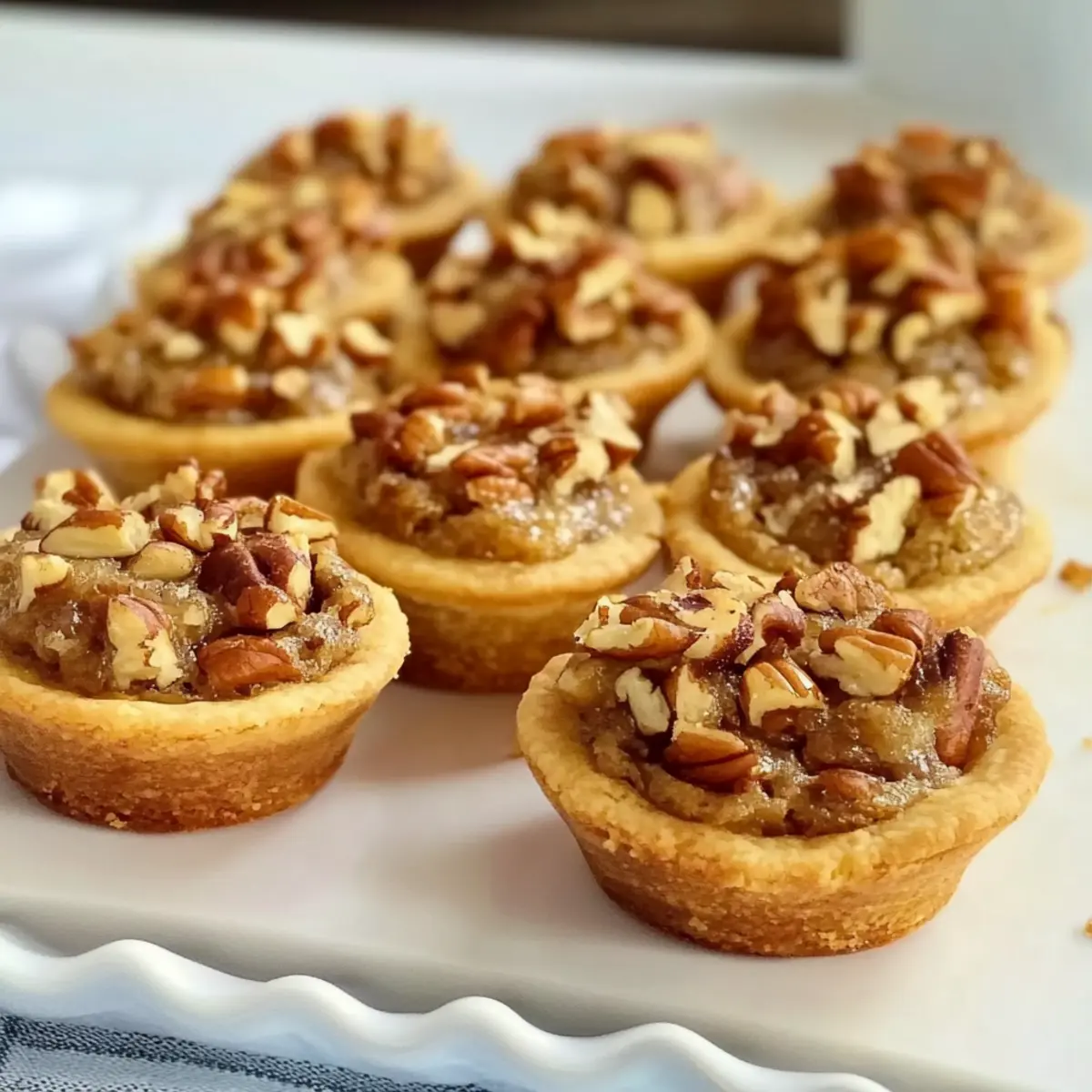 Jump to Recipe Print RecipeEvery holiday gathering seems to cry out for something sweet, and that’s where these delightful Pecan Tassies come in! They’re not just your average mini pecan pies; with a buttery, melt-in-your-mouth crust and a rich, sticky filling, they offer a perfect combination of textures and flavors. What I love most about this easy recipe is its versatility—these little gems are a crowd-pleaser, ideal for parties or cozy family evenings. Plus, they come together quickly, letting you spend more time enjoying the company around you and less time slaving in the kitchen. Just think about how charming a plate of these would be at your next gathering! Ready to impress your guests? Let’s dive into making these delightful treats together! Why Are Pecan Tassies So Irresistible? Deliciously Unique: Pecan Tassies bring a delightful twist to classic pecan pie, making them a unique dessert that guests will love. Quick Prep Time: With an easy-to-follow recipe, you can whip up these treats in no time—perfect for last-minute holiday baking! Flavor Explosion: The combination of buttery crust and sweet, nutty filling creates an irresistible taste that keeps everyone coming back for more. Perfect for Sharing: These bite-sized desserts are ideal for parties, holiday gatherings, or just enjoying at home with loved ones. Versatility Awaits: Feel free to customize with different nuts or flavors; the possibilities are endless! To learn more about adapting this recipe, check out our variation ideas. Pecan Tassies Ingredients For the Crust • Unsalted Butter – Adds richness and moisture to the crust; ensure it is softened for easy mixing. • Cream Cheese – Contributes to the tenderness and flakiness of the crust; use full-fat cream cheese for the best flavor. • All-Purpose Flour – Provides structure to the crust; no substitutions are recommended for optimal texture. • Salt – Enhances flavor and balances the sweetness of the filling. For the Filling • Large Egg – Acts as a binder in the filling, adding richness to the Pecan Tassies. • Light Brown Sugar – Imparts caramel-like sweetness; pack tightly for accurate measurement. • Vanilla Extract – Adds depth of flavor; use pure vanilla for the best results. • Melted Unsalted Butter – Enhances richness in the filling, creating a delectable taste. • Kosher Salt – A small amount balances sweetness; can be substituted with regular table salt if necessary. • Finely Chopped Pecans – Provides texture and nutty flavor; opt for finely chopped pieces to avoid large chunks in the small tarts. Step‑by‑Step Instructions for Pecan Tassies Step 1: Dough Preparation In a stand mixer, beat 1/2 cup of softened unsalted butter and 3 ounces of cream cheese on medium speed until the mixture is smooth and creamy, about 2-3 minutes. Gradually add in 1 cup of all-purpose flour and a pinch of salt, mixing until a dough forms. Once combined, wrap the dough in plastic wrap and refrigerate for at least 1 hour to achieve a flaky texture. Step 2: Muffin Pan Prep Preheat your oven to 350°F (175°C) while the dough chills. Generously grease a mini muffin pan with non-stick cooking spray to prevent sticking. Ensure every cup is well coated, as this will help the Pecan Tassies release easily after baking, allowing them to maintain their lovely shape and texture. Step 3: Form Crusts Once chilled, remove the dough from the refrigerator. Pinch off small portions and roll them into 3/4-inch balls. Place each ball into a greased mini muffin cup and use your fingers to press the dough evenly into the bottom and up the sides, creating a small shell to hold the sweet filling. Step 4: Make Filling In a medium mixing bowl, whisk together 1 large beaten egg, 1 cup of packed light brown sugar, 1 teaspoon of vanilla extract, 1/4 cup of melted unsalted butter, and a pinch of kosher salt until the mixture is well combined and smooth. This rich filling will elevate your Pecan Tassies and make them irresistibly delicious. Step 5: Fill Tarts Carefully spoon the pecan filling into each formed crust, filling them about three-quarters full. To add a delightful crunch and flavor, sprinkle the tops with finely chopped pecans. This will give each Pecan Tassie a gorgeous finish and a perfect balance of textures. Step 6: Bake Place the filled muffin pan in the preheated oven and bake for 20-23 minutes or until the filling is puffy and the crust is lightly browned. Keep an eye on them towards the end of baking to ensure they don’t overbrown, as you’ll want that beautiful golden color for your Pecan Tassies. Step 7: Cool Once baked, remove the mini muffin pan from the oven and allow the Pecan Tassies to cool in the pan for about 15 minutes. Afterward, gently use a knife to loosen the edges before transferring them to a wire rack to cool completely. Letting them cool will ensure they set perfectly without losing shape. Pecan Tassies: Delicious Customizations Await! Feel free to make these Pecan Tassies your own with these variations that add delightful twists to your treats! Nut Alternatives: Swap pecans for walnuts, almonds, or hazelnuts for a unique flavor and texture experience. Each nut brings its own charm to the table! Chocolate Delight: Add mini chocolate chips to the filling for a rich, sweet surprise. The chocolate melts beautifully, creating an indulgent combination with the pecans. Fruit Infusion: Mix in dried cranberries or raisins for a fruity contrast. This adds a chewy texture that beautifully complements the crunchy pecans and sweet filling. Spicy Kick: Sprinkle in a pinch of cinnamon or nutmeg to the filling for a warm, cozy twist. These spices enhance the flavor profile, making your tassies even more inviting during the holidays. Zesty Upgrade: For a citrusy note, add a splash of orange or lemon zest to the filling. This brightens the flavors and adds a refreshing bite. Sweetener Swap: Use maple syrup instead of brown sugar for a more ro