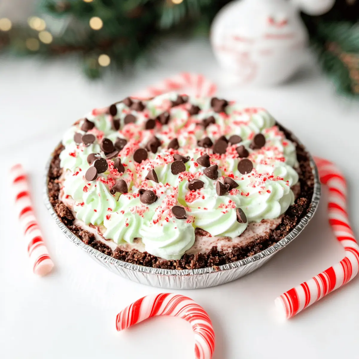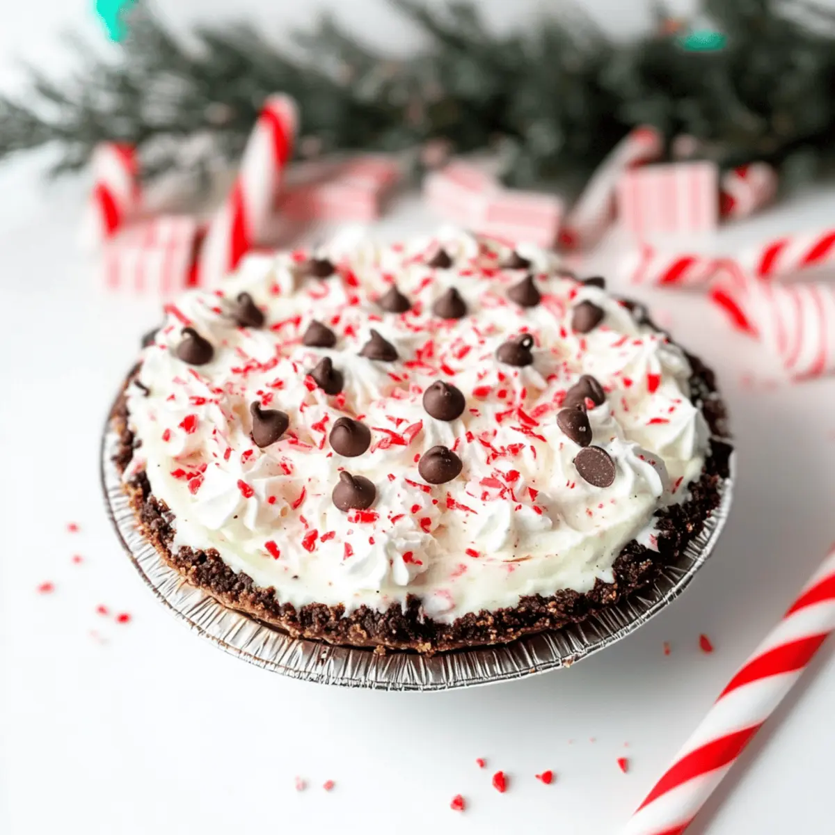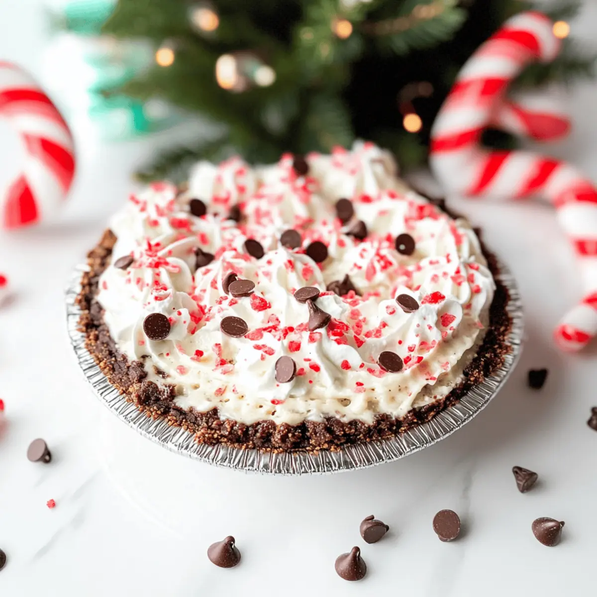 Sprinkle crushed peppermint and mini chocolate chips over the top of the pie for a festive touch. Once garnished, cover the pie with plastic wrap and refrigerate for at least 2 hours. This chilling time allows the flavors to meld and the pie to set properly, ensuring it can be sliced beautifully.