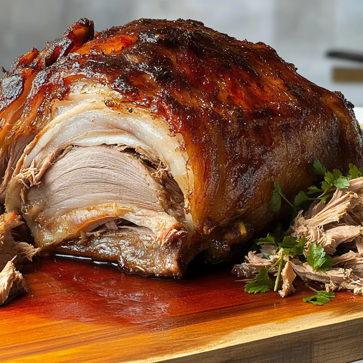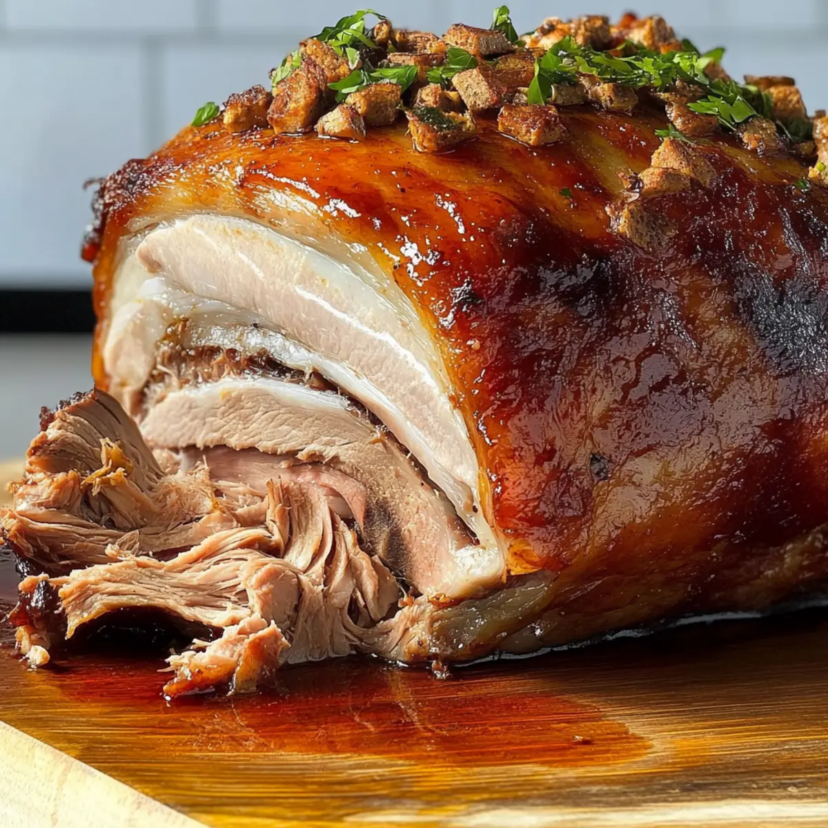 Jump to Recipe Print RecipeThere’s nothing quite like the aroma of Pernil wafting through the house, especially during festive occasions. This Puerto Rican roast pork is more than just a dish; it’s a beloved symbol of celebration and family gatherings. With its marinated, slow-cooked pork shoulder boasting tender meat and irresistibly crispy skin, it’s a guaranteed crowd-pleaser that will transform your holiday table. The best part? It’s surprisingly easy to prepare with just a bit of planning—marinating overnight for the juiciest flavor that penetrates every bite. In this recipe, I’ll guide you through achieving that perfect balance of succulent tenderness and delightful crunch. Are you ready to impress your loved ones with a comforting dish that speaks to the heart and soul of Puerto Rican cuisine? Let’s dive in! Why is Pernil the Ultimate Comfort Food? Flavor Explosion: The marinated pork shoulder infuses every bite with a medley of rich, zesty flavors that transport you straight to the heart of Puerto Rican cuisine. Crispy Skin Delight: Achieving that coveted crackling skin is easier than you think, providing an irresistible texture that makes this dish truly unforgettable. Festive Centerpiece: Ideal for gatherings, pernil transforms any meal into a celebration, allowing you to showcase your culinary skills to friends and family. Time-Saving Ease: With a simple overnight marinade, you’ll have a juicy, tender roast that practically cooks itself. Pair it effortlessly with classic sides like arroz con gandules for a complete feast. Versatile Variation: Feel free to mix up the marinade with different spices and citrus juices, making each roast a unique exploration of flavor. Ready to impress? You’ll love serving this stunning dish at your next gathering! Pernil Ingredients For the Marinade • Pork Shoulder – Tender, flavorful meat; bone-in and skin-on ensures moisture and crispy perfection. • Garlic – Aromatic base for seasoning; roughly chop for easy blending into the marinade. • Kosher Salt – Enhances flavor while maintaining moisture; be sure to divide its use for optimal seasoning. • Fresh Orange Juice – Offers a balance of acidity and sweetness; substitute with lemon juice if necessary. • Chopped Fresh Oregano – Adds bright, herbaceous notes; dried oregano can be used, but fresh is preferred for flavor. • Fresh Lime Juice – Provides a zesty tang; swap in more orange juice for added sweetness if desired. • Dry Adobo Seasoning – Vital for flavor depth; can be store-bought or homemade for a personalized touch. • Freshly Ground Black Pepper – Delivers heat and complexity; for the best flavor, always use freshly ground. • Extra-Virgin Olive Oil – Moisture booster that helps create that signature crispy skin; can substitute with other oils if needed. For Roasting • Vegetable Broth – Adds moisture during roasting; consider using chicken or beef broth for a deeper flavor. • Fresh Herbs – Optional garnish for presentation; parsley or more oregano enhances the serving appeal. Enjoy crafting your Pernil with these essential ingredients, ensuring that each component plays a role in achieving that delicious, mouthwatering dish perfect for any festive occasion! Step‑by‑Step Instructions for Pernil Step 1: Prepare Marinade Begin by making the marinade for your pernil. In a blender, combine roughly chopped garlic, kosher salt, fresh orange juice, chopped oregano, fresh lime juice, dry adobo seasoning, freshly ground black pepper, and extra-virgin olive oil. Blend until smooth, creating a vibrant wet adobo that infuses flavors thoroughly. This blend is essential for achieving the rich, savory taste of your roast pork. Step 2: Marinate Pork Take the pork shoulder and pierce it all over with a sharp knife to allow the marinade to penetrate deeply. Generously rub the prepared marinade over the entire surface of the pork, ensuring to get it in every crevice. Once coated, cover the pork and refrigerate it for at least 2 hours, but ideally overnight. This crucial step helps develop maximum flavor for your pernil. Step 3: Preheat Oven When you’re ready to cook, preheat your oven to 450°F (230°C). This high temperature is key for achieving that desired crispy skin on the pernil. As the oven heats, prepare your roasting pan by placing it on the countertop, ready to receive the marinated pork once you are set. Step 4: Roast Uncovered Remove the marinated pork from the fridge and place it skin-side up in the roasting pan. Roast uncovered for about 6 to 8 hours, allowing the skin to crisp and the seasonings to permeate the meat. You’ll start to smell the delicious aroma wafting through your kitchen, indicating that the pernil is developing its signature flavor. Step 5: Finish on High Heat After several hours of roasting, increase the oven temperature to 500°F (260°C) to further crisp the skin. Continue to roast for an additional 30 minutes, keeping a close eye on it. The skin should become golden and crackling, and you can lightly tap it with a wooden spoon to check for that satisfying “knock” sound, indicating it’s wonderfully done. Step 6: Rest and Serve Once fully roasted, remove the pernil from the oven and allow it to rest for at least 20 to 30 minutes. This resting period is essential to let the juices redistribute throughout the meat, ensuring that every slice remains juicy and tender. When carving, slice the crispy skin separately to ensure everyone gets that delectable crunchy part of the pernil. Expert Tips for Perfect Pernil Flavor Infusion: Ensure deep marination by piercing the pork shoulder at regular intervals; this allows the flavorful marinade to penetrate thoroughly. Crispy Skin Success: Avoid covering the roast with foil during cooking. This helps maintain the skin’s crispiness, which is vital to a delicious pernil. Temperature Check: Monitor the internal temperature closely; aim for approximately 190°F for opti