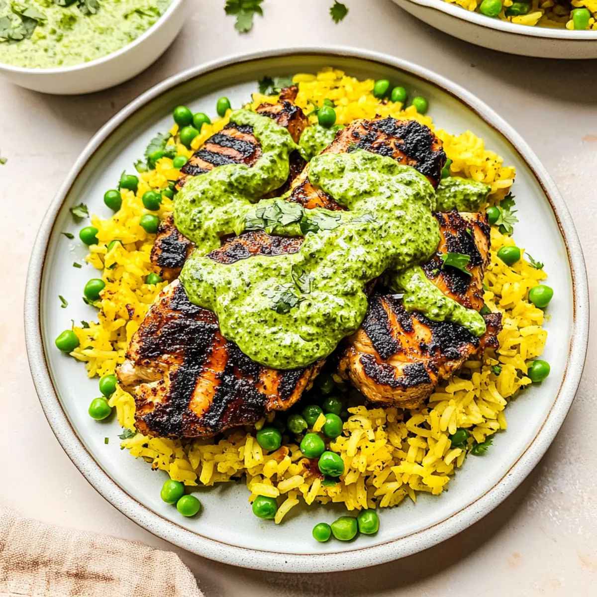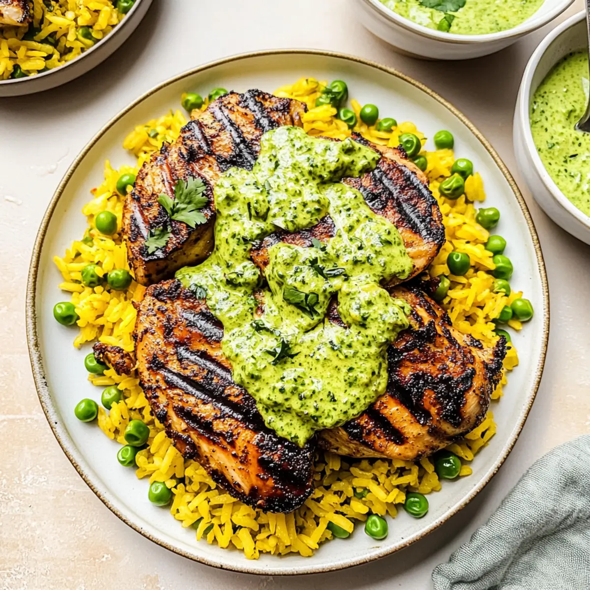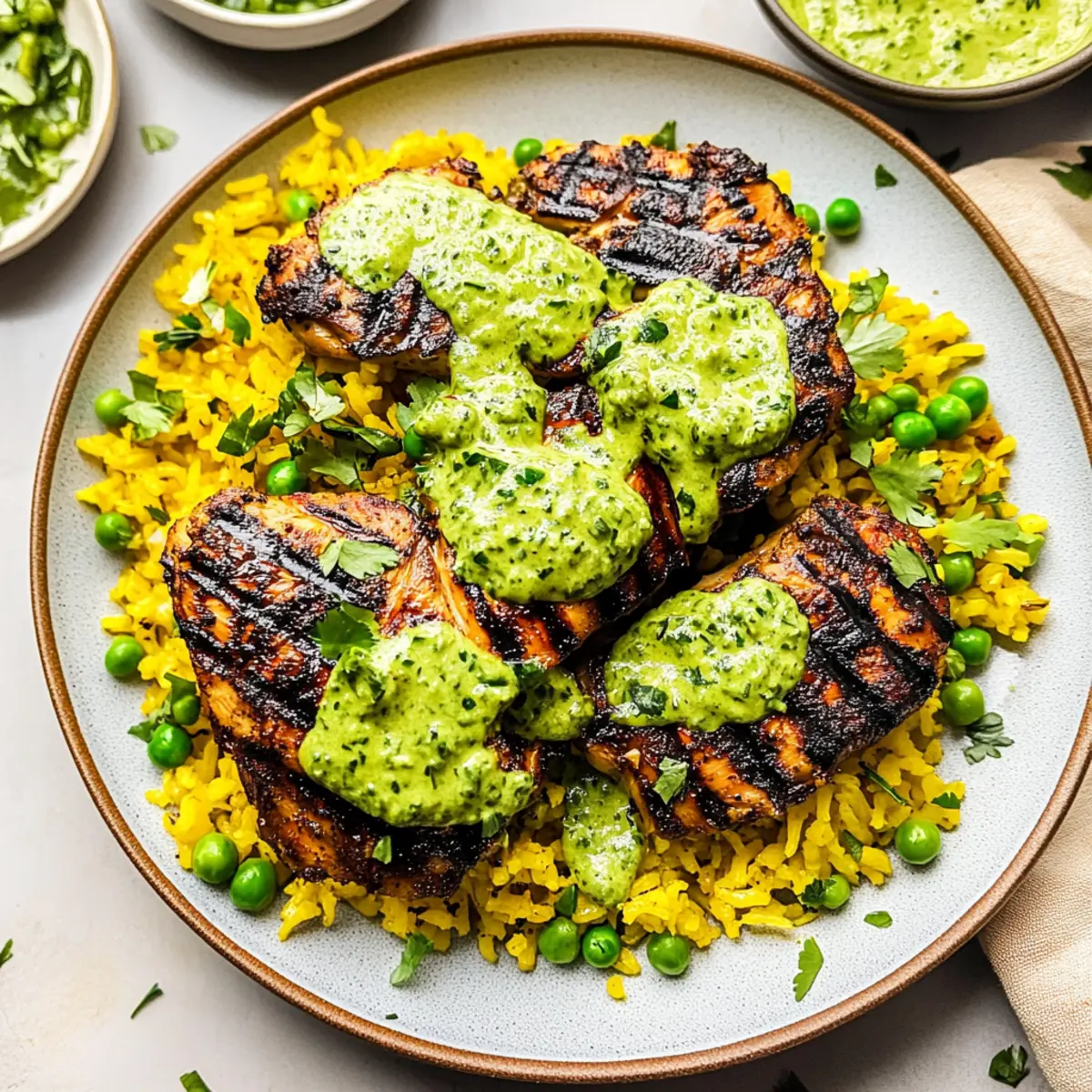 Jump to Recipe Print RecipeThe aroma of marinated chicken sizzling on the grill fills the air, coaxing everyone to the kitchen with irresistible anticipation. My take on Peruvian Chicken and Rice with Green Sauce is a vibrant dish that transforms any ordinary dinner into a culinary adventure. Juicy, tender chicken, whether grilled or baked, rests atop a bed of perfectly seasoned Peruvian yellow rice, all drizzled with a creamy, zesty ají verde that packs a flavorful punch. The best part? This recipe is not only quick to prepare, making it ideal for busy weeknights, but it also impresses with its comforting yet gourmet feel, perfect for entertaining guests. Are you ready to elevate your dinner experience and impress your loved ones with this delicious dish? Why is this recipe a must-try? Flavor Explosion: Each bite of this Peruvian Chicken and Rice offers a delightful mix of juicy chicken and fluffy, aromatic rice, enhanced by the vibrant, creamy ají verde sauce. Customizable Ingredients: You can use various chicken cuts and swap in quinoa or veggies, making this dish adaptable to your preferences. Quick & Easy: With a simple marinade and straightforward cooking steps, preparing this dish takes minimal time but delivers maximum satisfaction. Crowd-Pleasing Delight: Impress your family or guests with its striking presentation and robust flavors, making it a fantastic choice for gatherings. Healthy Twist: Gluten-free and nutritious, this recipe keeps your meals wholesome without sacrificing taste—perfect for those needing a break from fast food! Consider pairing it with a refreshing side salad or roasted veggies for a complete meal. Peruvian Chicken & Rice Ingredients • Dive into the vibrant flavors of Peruvian Chicken and Rice with Green Sauce with these essential ingredients. For the Chicken Marinade Chicken (1.5-2 pounds) – Main protein; versatile cuts like thighs or breasts ensure juiciness. Garlic (2-3 cloves, minced) – Infuses aromatic flavor into the chicken. Lime Juice (2 tablespoons) – Tenderizes chicken and adds a zingy tang; white vinegar can work in a pinch. Oil (2 tablespoons, choice) – Adds moisture and flavor; both olive or vegetable oil are great options. Ground Cumin (1 tablespoon) – This earthy spice enhances the overall flavor profile. Smoked Paprika (1 teaspoon) – Adds a smoky depth to your chicken. Kosher Salt (1 teaspoon) – Essential for a well-seasoned dish. Black Pepper (½ teaspoon) – Elevates the flavors further. For the Green Sauce Cilantro Leaves (1 cup) – A fresh herbal touch; parsley works for those who aren’t fond of cilantro. Mayonnaise (½ cup) – Creates a creamy base for the sauce. Sour Cream (¼ cup) – Offers tangy creaminess that balances well with heat. Jalapeño Chiles (2 whole, chopped) – Bring in the heat; adjust based on your spice preference. Garlic (2 cloves) – Complements the existing flavors. Olive Oil (1 tablespoon) – Adds richness to your green sauce. Lemon or Lime Juice (1 tablespoon) – Brightens the flavors beautifully. Kosher Salt and Pepper – Season to taste for a well-rounded sauce. For the Peruvian Yellow Rice Jasmine Rice (1 cup) – The main carbohydrate that soaks up all those flavors. Butter/Oil (1 tablespoon) – Used for sautéing; adds richness. Onion (¼ cup, diced) – Brings sweetness and depth to the dish. Garlic (2-3 cloves, minced) – Enhances the aromatic base of the rice. Turmeric (1 teaspoon) – Provides a stunning yellow hue and distinct flavor. Cumin, Onion Powder, Salt, Pepper (¼ teaspoon each) – A balanced seasoning blend for flavor. Chicken Stock (2 cups) – Infuses the rice with flavor as it cooks. Frozen Peas (1 cup) – Adds a pop of color and nutrition; feel free to swap with other veggies. Gather these ingredients to create a memorable meal that dances on your palate – perfect for any occasion! Step‑by‑Step Instructions for Peruvian Chicken & Rice with Green Sauce Step 1: Marinate the Chicken In a mixing bowl, combine minced garlic, lime juice, oil, ground cumin, smoked paprika, kosher salt, and black pepper to create a flavorful marinade. Coat your chicken thoroughly with this mixture, ensuring every piece is well-covered. Cover the bowl with plastic wrap and refrigerate for at least 1 hour, or overnight for optimal flavor. Step 2: Prepare the Rice Rinse 1 cup of jasmine rice under cold water until the water runs clear to remove excess starch. Soak the rice for 10–15 minutes, then drain. In a medium saucepan, melt butter or heat oil over medium heat, sautéing diced onion and minced garlic until softened, about 3 minutes. Add the drained rice, turmeric, cumin, onion powder, salt, and pepper, stirring for 1–2 minutes until fragrant. Step 3: Cook the Rice Pour in 2 cups of chicken stock to the rice mixture, increasing the heat to bring it to a boil. Once boiling, reduce the heat to low, cover the pot, and let it simmer gently for 15 minutes. After cooking, stir in 1 cup of frozen peas, cover again, and allow the rice to rest for another 5 minutes off the heat to ensure it’s fluffy and flavorful. Step 4: Cook the Chicken Preheat your grill to medium-high heat or your oven to 450°F. If grilling, place the marinated chicken on the grill, cooking for 5–7 minutes per side, or until it reaches an internal temperature of 165°F. For baking, arrange the chicken on a baking sheet and bake for about 30 minutes. Brush with reserved marinade halfway through to enhance the flavor. Step 5: Make the Green Sauce In a blender, combine 1 cup of cilantro leaves, mayonnaise, sour cream, chopped jalapeños, minced garlic, olive oil, and lemon or lime juice. Blend until the mixture is smooth and creamy. Taste and season with additional kosher salt and fresh pepper as desired. The green sauce adds a vibrant kick to your Peruvian Chicken & Rice. Step 6: Serve the Dish On a large plate, mound a serving of the aromatic yellow rice, then place a juicy piece of chicken on top. Driz