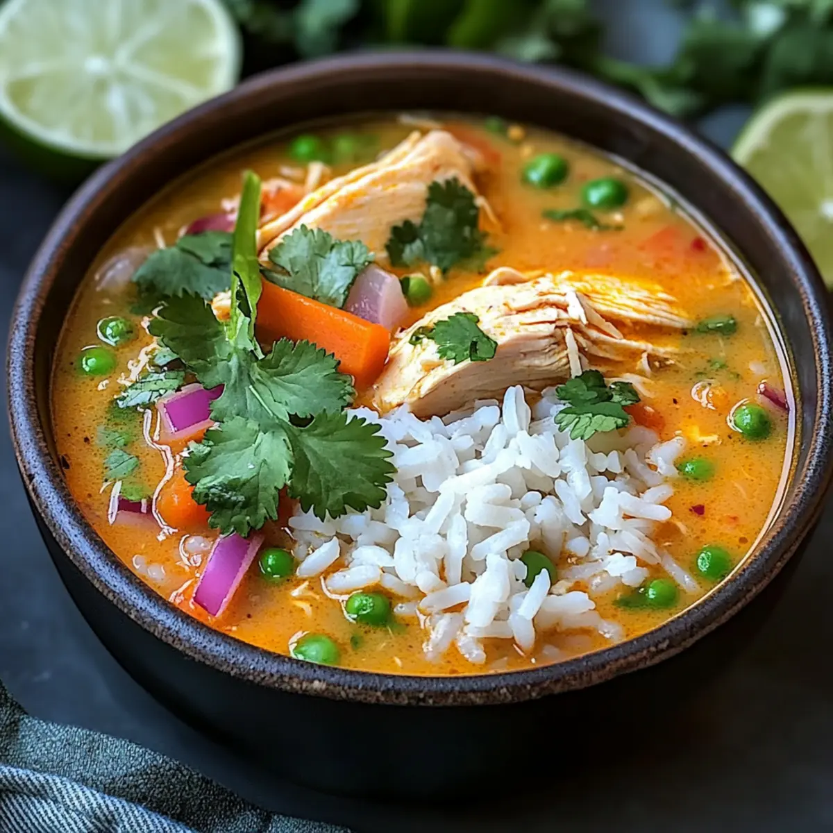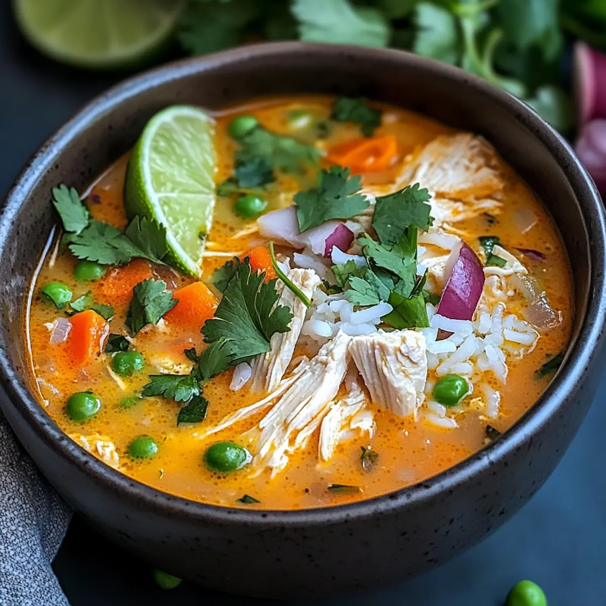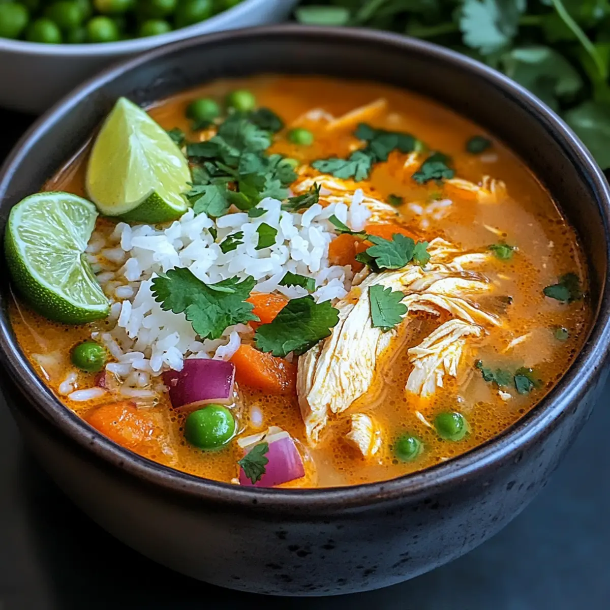Jump to Recipe Print RecipeFamiliar scents waft through my kitchen, transporting me straight to the bustling streets of Peru. Aguadito de Pollo, or Peruvian Chicken Soup, is more than just a dish; it’s a warm embrace in a bowl that speaks to the heart. This traditional recipe combines tender chicken, hearty rice, and vibrant vegetables, providing not just nourishment but a comforting experience that’s perfect for chilly evenings or family gatherings. One of the best perks? It’s straightforward to whip up on a busy weeknight, yet satisfying enough to impress guests. Plus, it’s easily customizable, allowing your creative flair to shine through with seasonal veggies or a spicy twist. Ready to warm your soul with every spoonful? Let’s dive into this delightful recipe! Why is Aguadito de Pollo a Must-Try? Comforting and Hearty: This Peruvian Chicken Soup wraps you in warmth, with a rich broth infused with traditional spices that speak of home-cooked love. Nutrient-Packed: A delicious blend of chicken, rice, and colorful vegetables makes it a wholesome meal, perfect for family dinners or cozy gatherings. Quick and Easy: With straightforward instructions, this recipe is perfect for busy weeknights yet impressive enough for special occasions—just like my Cheesy Garlic Chicken! Versatile Flavor: Customize the veggies to match the season or your pantry stock; frozen options provide convenience without compromising taste. Soul-Satisfying Aroma: Your kitchen will be filled with enticing scents, making it a true comfort-food experience that draws everyone to the table! Peruvian Chicken Soup Ingredients • Discover the essential components for crafting this heartwarming dish. For the Soup Chicken – Provides the main protein and flavor base; use chicken thighs for added juiciness. Rice – Acts as a filling agent to make the soup hearty; opt for short-grain rice for better texture. Cilantro – Adds freshness and brightness; substitute with parsley for a milder flavor if needed. Lime – Enhances the overall flavor with acidity; fresh lime juice is preferable for the best taste. Vegetables (carrots, corn, peas) – Contributes to nutrition and texture; frozen vegetables can be a time-saving option. Peruvian Spices (cumin, paprika) – Adds depth and traditional flavor; adjust according to your taste preference. For Serving Extra Cilantro – For garnish and a burst of freshness just before serving. Lime Wedges – Adding a squeeze of fresh lime brings a delightful zing to each bowl of soup. Step‑by‑Step Instructions for Hearty Peruvian Chicken Soup Step 1: Prep the Chicken Start by seasoning about 1 pound of chicken thighs with cumin, paprika, salt, and pepper. In a large pot over medium-high heat, add a tablespoon of oil and lightly sauté the seasoned chicken for about 5-7 minutes until it’s golden brown. This step enhances the flavor and creates a beautiful base for your Aguadito de Pollo. Step 2: Cook Vegetables Next, add chopped onions, carrots, and any other preferred vegetables to the pot. Sauté these vibrant veggies for around 4-5 minutes until they soften and release their delightful aromas. This will build a rich flavor profile for the traditional Peruvian Chicken Soup as they begin to caramelize. Step 3: Add Rice and Broth Stir in 1 cup of short-grain rice, allowing it to mix with the chicken and vegetables for about a minute. Then, pour in 6 cups of chicken broth, raising the heat to bring the mixture to a rolling boil. This step is crucial, as it ensures that the rice absorbs all the flavors while cooking. Step 4: Simmer Reduce the heat to medium-low, cover the pot, and let the Aguadito de Pollo simmer for approximately 20-25 minutes. During this time, the rice will become tender, and the chicken will finish cooking through. Keep an eye on it and stir occasionally to prevent sticking, and enjoy the comforting aroma wafting through your kitchen. Step 5: Finish the Soup Once the rice is tender, remove the pot from the heat and stir in a generous handful of chopped fresh cilantro and the juice of one lime. Let the soup sit for another 5 minutes to meld the flavors. Season to taste with additional salt and pepper if needed, ensuring your Peruvian Chicken Soup is full of life and flavor. What to Serve with Hearty Peruvian Chicken Soup The rich and warm flavors of this chicken soup are just the beginning of a delightful meal experience. Crispy Plantains: The sweet crunch of plantains offers a delicious contrast, bringing a Caribbean flair that pairs beautifully with the soup’s warm spices. Arugula Salad: A fresh salad with peppery arugula, cherry tomatoes, and a zesty lime vinaigrette adds a refreshing balance to your meal. Cornbread Muffins: Soft, slightly sweet cornbread muffins provide a comforting side that’s perfect for soaking up that hearty broth. Garlic Bread: Golden, buttery garlic bread is a wonderful option for mopping up the soup, adding a satisfying crunch to each bite. Avocado Slices: Creamy avocado slices add richness and a nice texture contrast, enhancing the soup’s flavors and making each spoonful even more enjoyable. Sparkling Water with Lime: A light, bubbly drink refreshes your palate, while the hint of lime complements the soup’s citrus notes perfectly. Flan for Dessert: This classic Peruvian dessert brings a creamy, sweet finish to your meal, leaving everyone with a lasting taste of delight. Each pairing enhances the comforting experience of your Aguadito de Pollo, creating an unforgettable meal full of vibrant flavors. Expert Tips for Peruvian Chicken Soup Use Thighs for Juiciness: Opt for chicken thighs instead of breasts to keep your soup rich and flavorful, ensuring every bite is succulent. Don’t Rush Simmering: Allow the soup to simmer gently for 20-25 minutes; this step deepens flavors and ensures that the rice becomes perfectly tender. Watch Your Rice: Keep an eye on the rice while cooking; overcooking can lead to a mushy texture, ruin