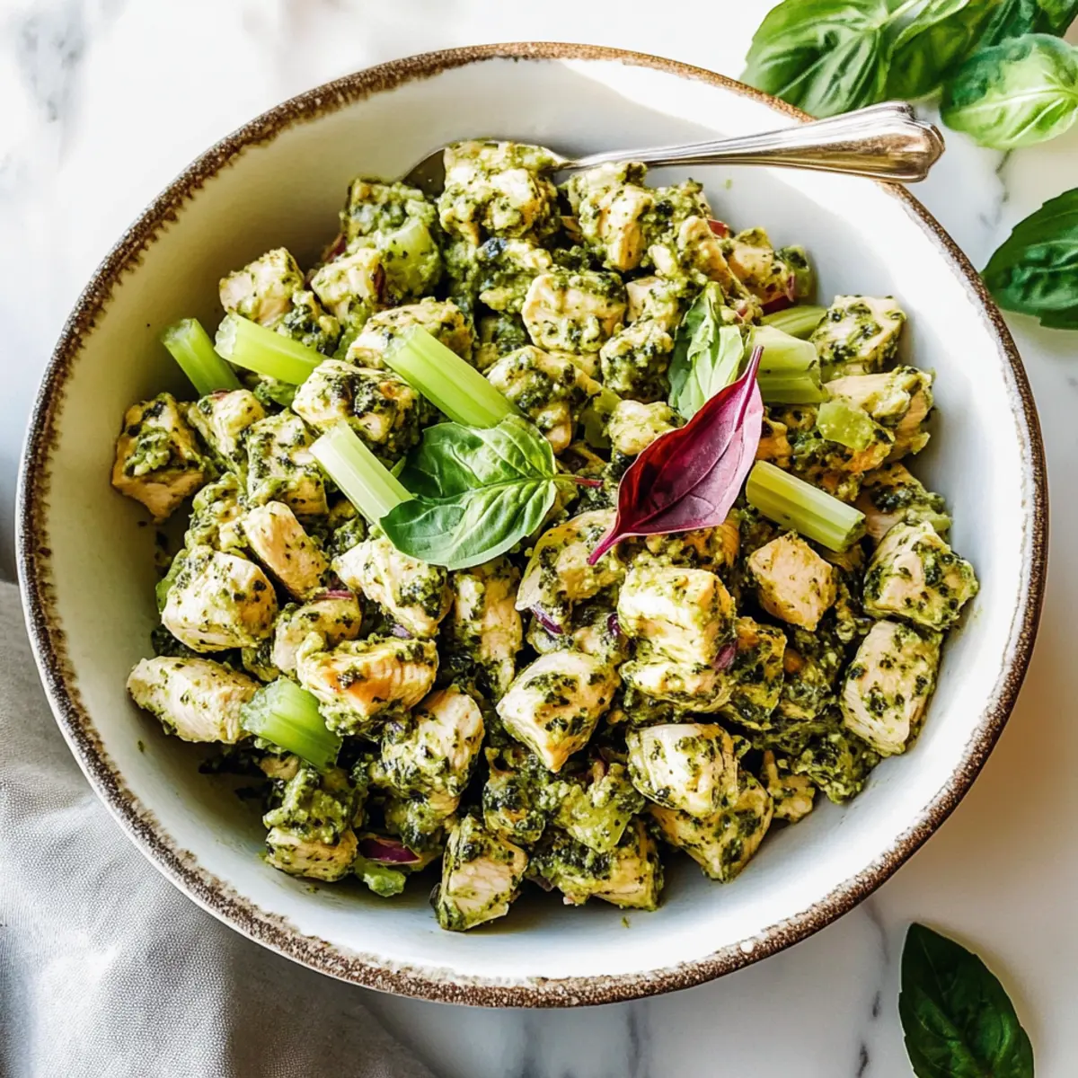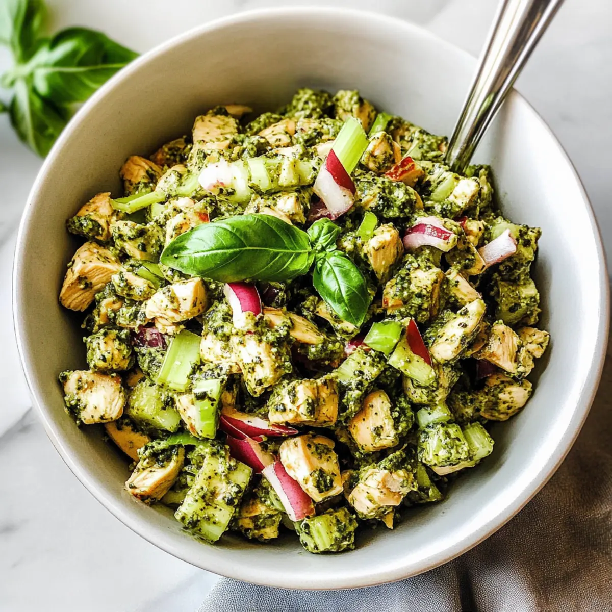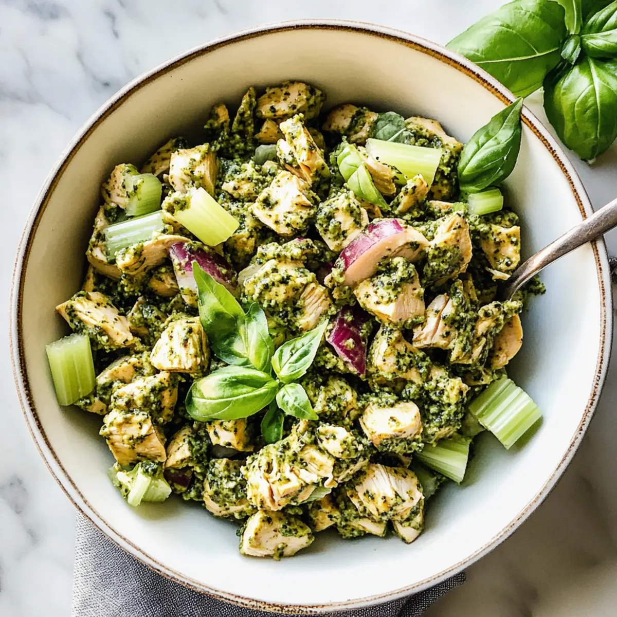 Jump to Recipe Print RecipeAs the sun warms up the backyard and the scent of summer fills the air, nothing satisfies quite like a fresh, vibrant salad. Enter my Pesto Chicken Salad, a brilliant twist on a classic favorite that’s perfect for sunny days or any time you’re craving something light yet filling. This recipe is not only a crowd-pleaser but also a meal-prep dream, allowing you to savor its rich flavors throughout the week. Imagine succulent chicken mingling with crisp veggies all coated in a creamy homemade basil pesto, elevating your meal game to a whole new level. Whether you’re hosting a summer get-together or just wanting a nutritious lunch, this gluten-free delight is sure to please. So, ready to whip up a dish that’s as colorful as the season? Let’s get started! Why is Pesto Chicken Salad a Must-Try? Vibrant flavor explosion: This Pesto Chicken Salad brings together juicy chicken and crunchy vegetables, all enveloped in a rich, homemade basil pesto that dances on your palate. Meal prep perfection: Not only is it delicious, but it also stores beautifully in the fridge, making it a fantastic option for weekday lunches or quick dinners. Gluten-free goodness: Enjoy this salad without the worry, as it’s entirely gluten-free, perfect for everyone at the table. Quick and simple: With easy assembly, you’re just a few minutes away from a refreshing meal ideal for summer barbecues or picnics. Adding a twist? You can easily substitute chicken with chickpeas for a hearty vegetarian alternative! Pair it with a side of Broccoli Salad Bacon for a complete spread that’s sure to impress. Pesto Chicken Salad Ingredients • To create your delightful Pesto Chicken Salad, gather these fresh ingredients! For the Chicken Base Diced Chicken – 3 cups – Main protein source; use cooked or shredded chicken for convenience. Kosher Salt – ½ teaspoon – Seasoning to enhance flavors; adjust to personal taste. Black Pepper – ¼ teaspoon – Adds a hint of spiciness; freshly ground is recommended for best flavor. For the Creamy Pesto Dressing Basil Pesto – ½ cup – Provides flavor and creaminess; homemade or store-bought pesto can be used. Mayonnaise – ¼ cup – Adds creaminess to the dressing; can be replaced with Greek yogurt for a lighter option. For the Crunch Celery – 2 ribs, diced – Adds crunch and freshness; substitute with radish or zucchini if preferred. Red Onion – ¼ cup, diced – Contributes sharpness and texture; use green onions or shallots as alternatives. Toasted Pine Nuts – ¼ cup – Enhances flavor with a nutty taste; almonds can be substituted if necessary. Optional Additions Freshly Grated Parmesan – For an extra burst of richness and umami; omit for a dairy-free version. Cherry Tomatoes or Cucumbers – Adds freshness and color, perfect for an extra crunchy twist! Now that you’ve gathered all these wonderful ingredients, your Pesto Chicken Salad will be bursting with vibrant flavors, perfect for any occasion! Step‑by‑Step Instructions for Pesto Chicken Salad Step 1: Prepare the Ingredients Begin by gathering all your ingredients for the Pesto Chicken Salad. Measure out 3 cups of diced chicken, 2 ribs of diced celery, and ¼ cup each of mayonnaise and diced red onion. Set these aside along with ½ cup of basil pesto and ¼ cup of toasted pine nuts, ensuring everything is ready for mixing. Step 2: Mix the Base In a large mixing bowl, combine the diced chicken, celery, and red onion. Pour in the luscious ½ cup of basil pesto and ¼ cup of mayonnaise. Using a spatula, gently fold these ingredients together for about 2-3 minutes until everything is well coated and visually combined, with each bite guaranteed to be bursting with flavor. Step 3: Add Crunch and Flavor Now, toss in the toasted pine nuts to add a delightful crunch to your Pesto Chicken Salad. Stir the mixture again for another minute, ensuring that the nuts are evenly distributed throughout the salad. The nuttiness combined with the creamy pesto creates a delicious contrast that enhances the overall texture of the dish. Step 4: Season to Perfection Next, sprinkle in ½ teaspoon of kosher salt and ¼ teaspoon of freshly ground black pepper. Mix thoroughly for about a minute, allowing the seasoning to permeate the salad. Take a moment to taste your creation; adjust the seasoning if needed, making your Pesto Chicken Salad as flavorful as you desire. Step 5: Serve or Store Your Pesto Chicken Salad is now ready! You can serve it immediately in salad bowls or wrap it up in lettuce leaves for a fresh presentation. If you choose to make it ahead, transfer your salad into an airtight container and refrigerate. It will keep well for up to 4-5 days, allowing you to enjoy this vibrant dish throughout the week. Make Ahead Options These Pesto Chicken Salad make-ahead tips are a lifesaver for busy weeknights! You can prepare the chicken and pesto dressing up to 3 days in advance, making it easy to throw everything together when you need a quick meal. Simply cook and dice your chicken ahead of time, then store it in an airtight container in the fridge. Also, mix the basil pesto with mayonnaise and seasonings so it’s ready when you are. To maintain the salad’s crunch, add diced celery and toasted pine nuts just before serving. When you’re ready to enjoy, combine everything in a bowl, and you’ll have a delicious, fresh meal with minimal effort! Pesto Chicken Salad Variations Feel free to let your creativity shine as you tweak this refreshing salad to fit your tastes and preferences! Vegetarian Delight: Substitute diced chicken with chickpeas for a hearty, vegetarian-friendly option that’s still packed with protein. It creates a satisfying base while allowing the pesto flavors to shine. Nut-Free Twist: Replace pine nuts with sunflower seeds to keep your salad nut-free. This swap doesn’t compromise on flavor; sunflower seeds add a pleasant crunch and slight earthiness. Creamy Yogurt S